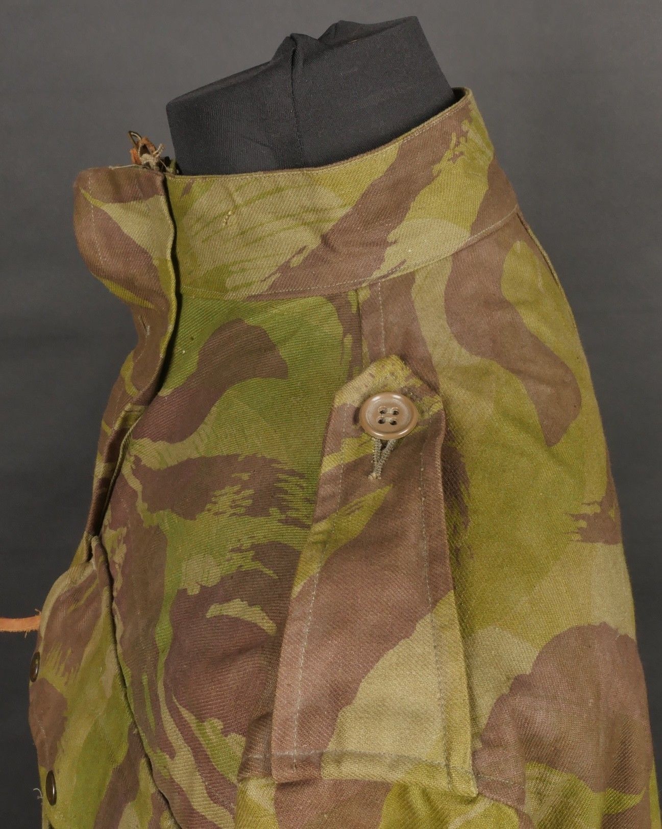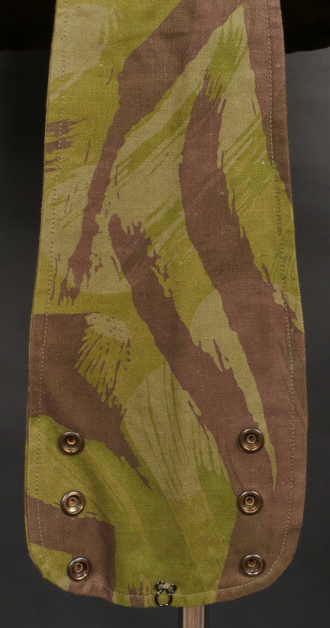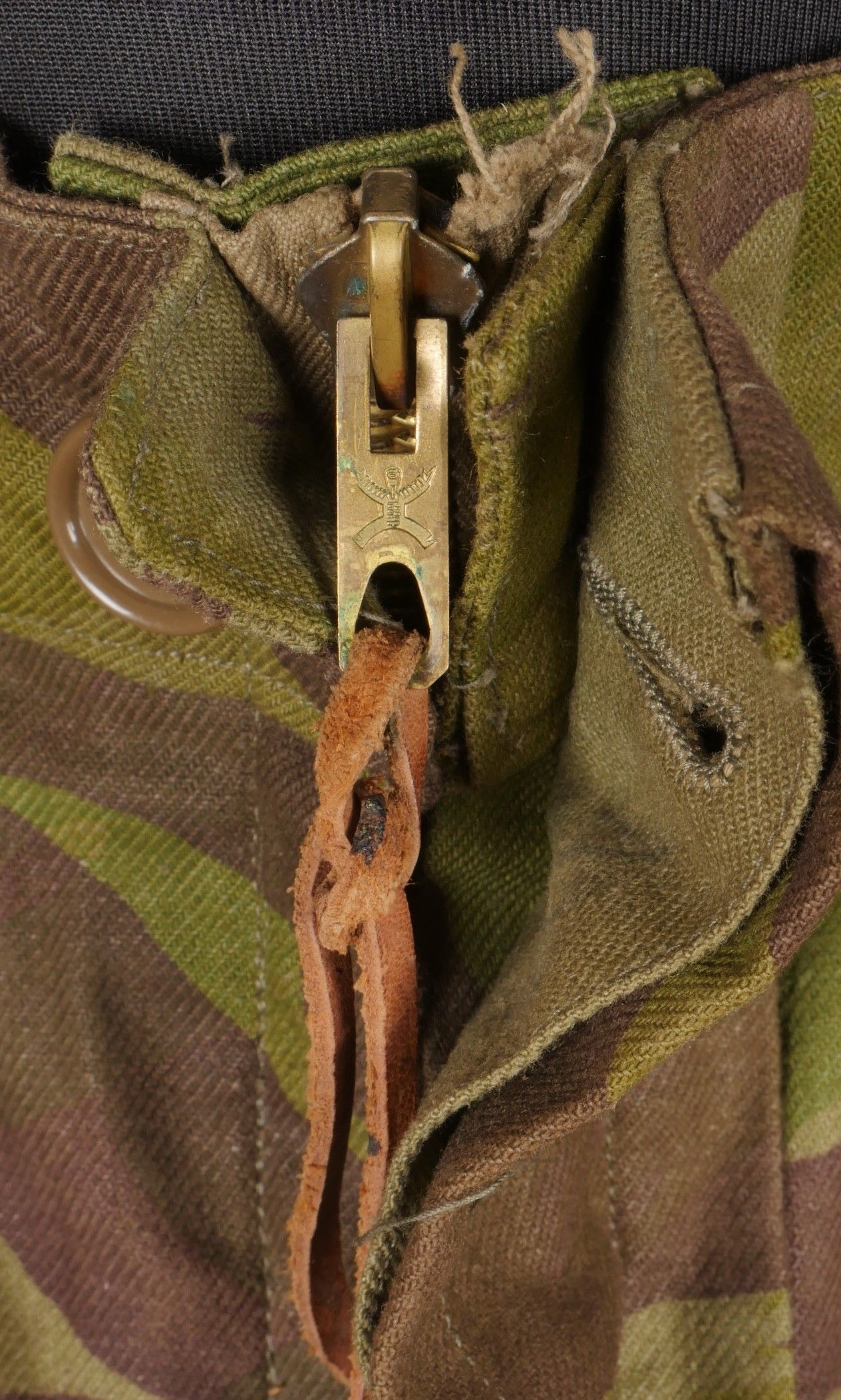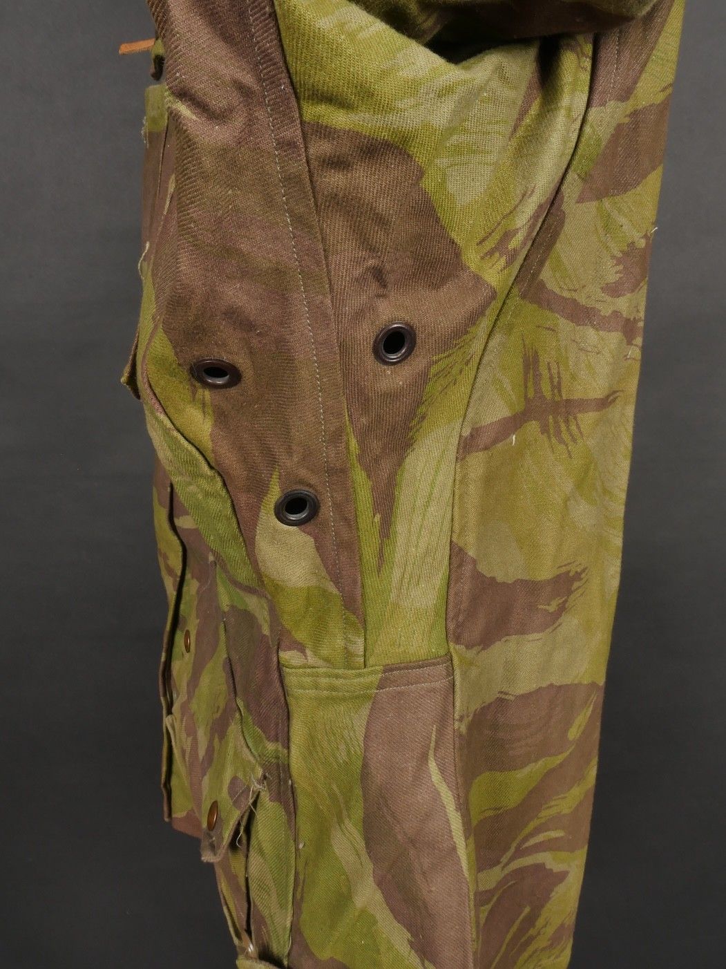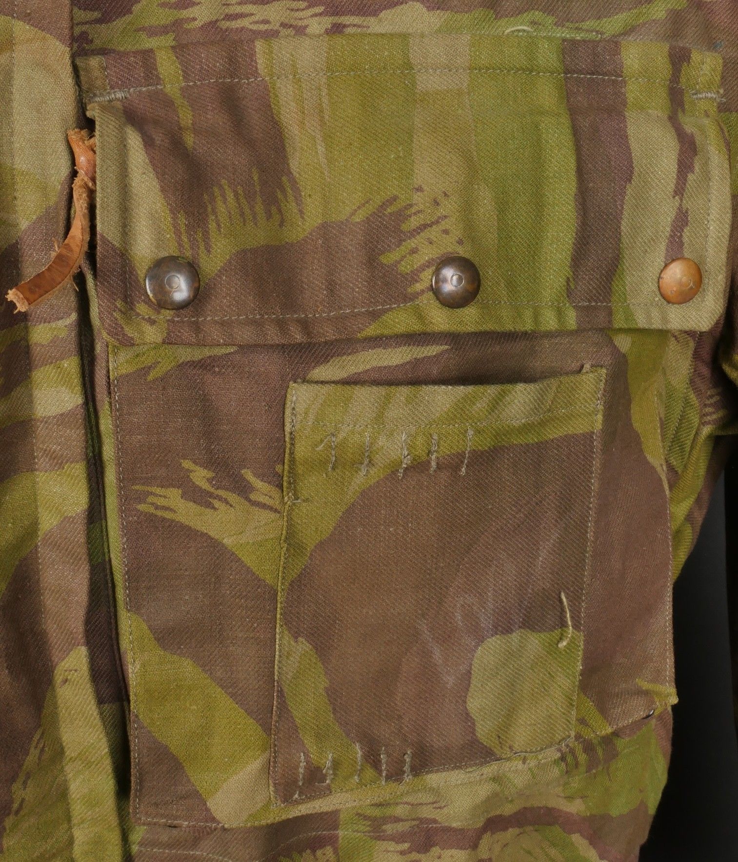 TAP 4752 camouflage jacket. Jacket made entirely from 4752 camouflage fabric, functional press studs, functional zips, underarm eyelets, original stitched beavertail. Original bronzed buckles at the bottom of each sleeve. Manufacturer's stamp Davenière Paris Calais, as well as size stamp E 1M. Jacket in mint condition, never worn, superb colours. Camouflage TAP 47 52 jacket. Made entirely in 47 52 camouflage cloth. Snaps working. Zippers working. Underarm ventilation eyelets. Beaver tail sewn on at the factory. Tightening buckles at the ends of both sleeves with original bluing. Maker stamp Davenière Paris Calais and size stamp E 1M. Mint unissued jacket with superb colours.