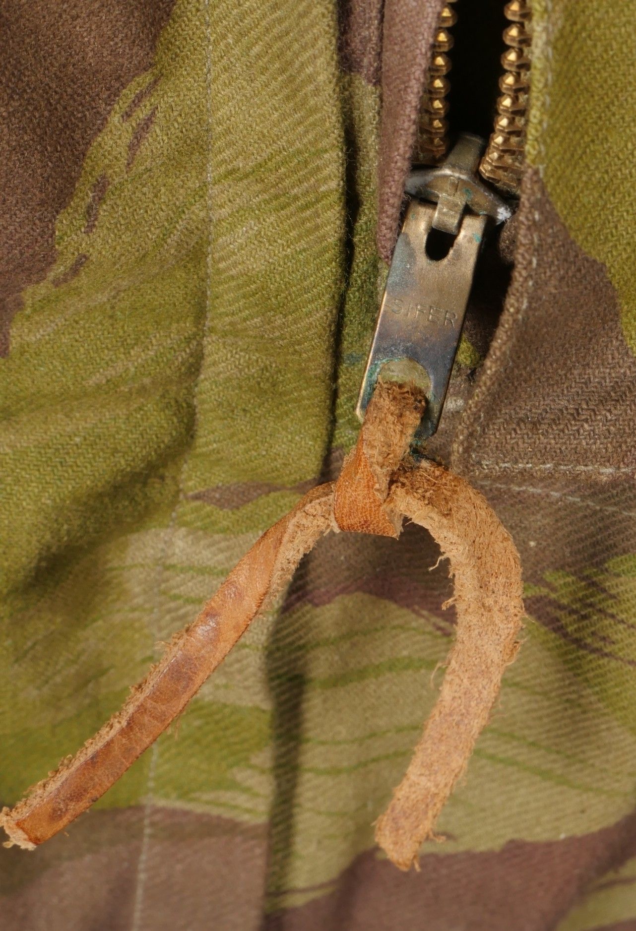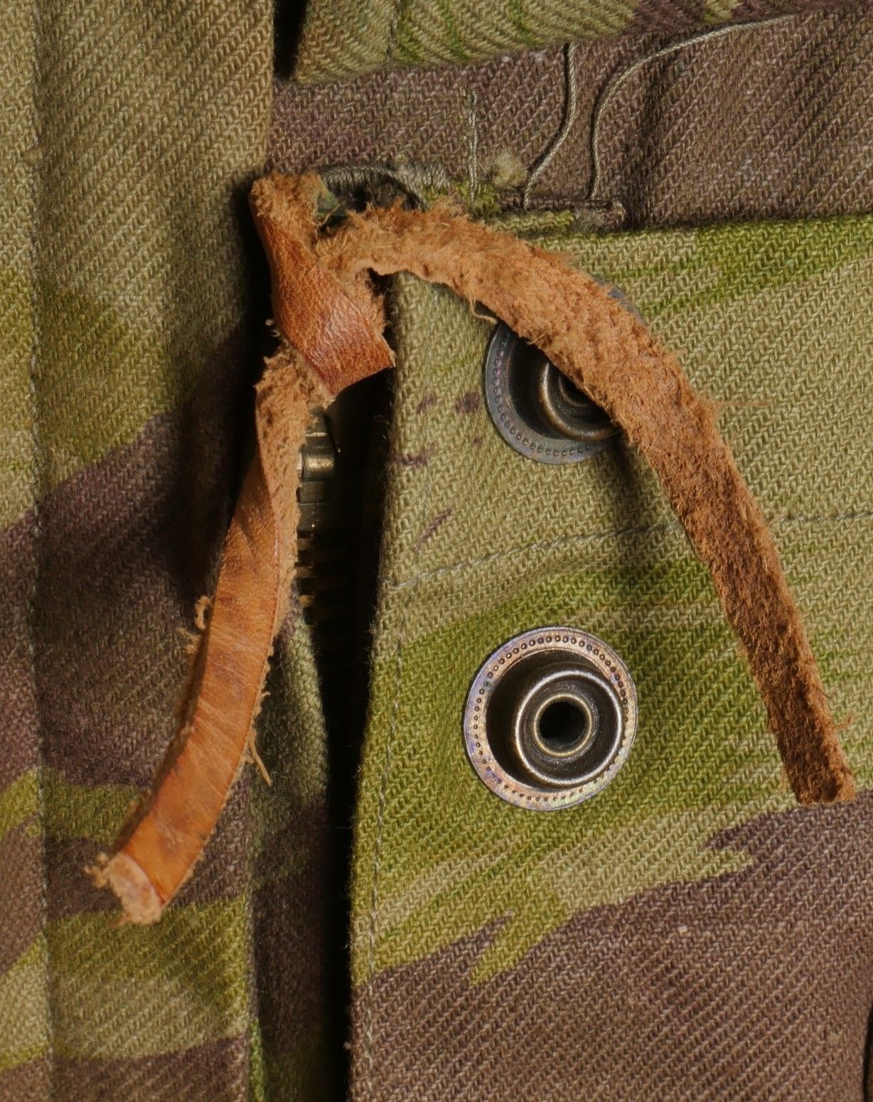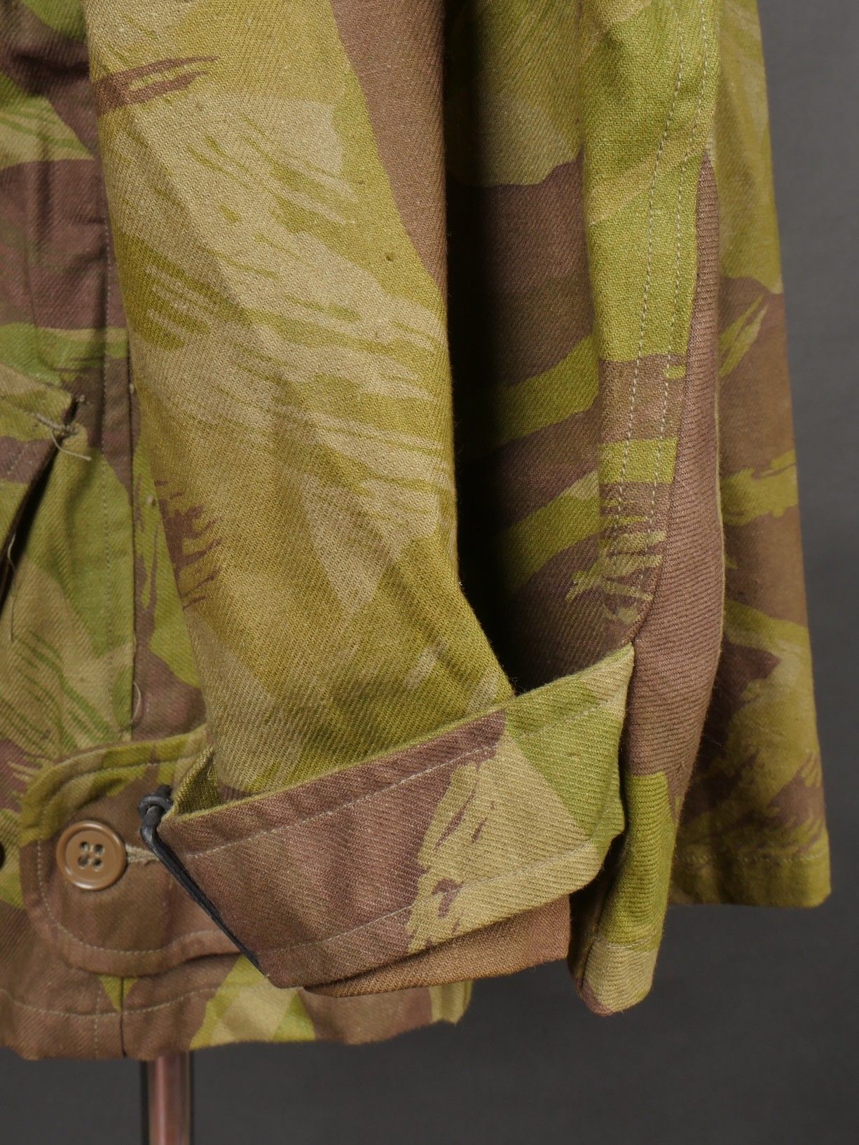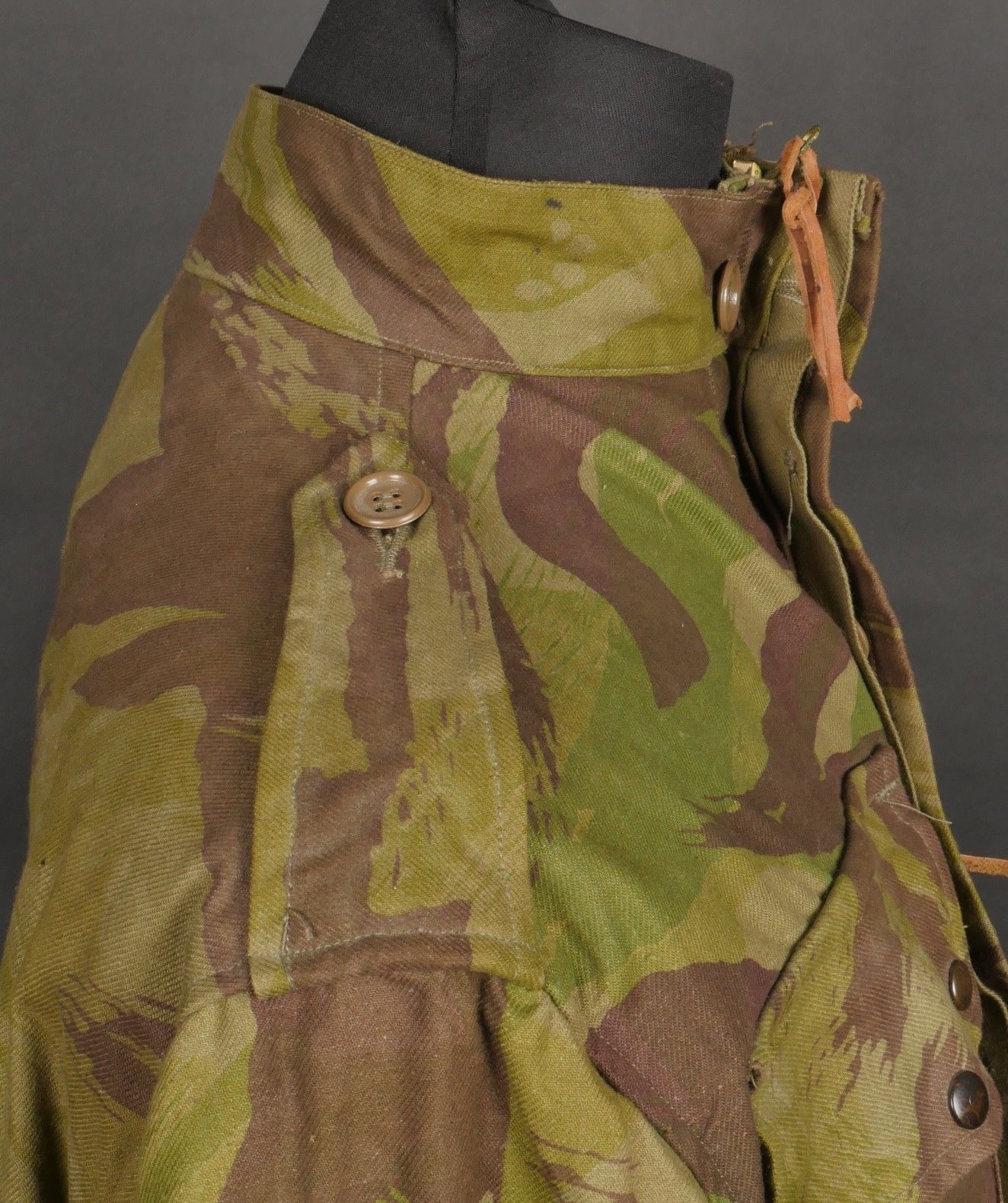 TAP 4752 camouflage jacket. Jacket made entirely from 4752 camouflage fabric, functional press studs, functional zips, underarm eyelets, original stitched beavertail. Original bronzed buckles at the bottom of each sleeve. Manufacturer's stamp Davenière Paris Calais, as well as size stamp E 1M. Jacket in mint condition, never worn, superb colours. Camouflage TAP 47 52 jacket. Made entirely in 47 52 camouflage cloth. Snaps working. Zippers working. Underarm ventilation eyelets. Beaver tail sewn on at the factory. Tightening buckles at the ends of both sleeves with original bluing. Maker stamp Davenière Paris Calais and size stamp E 1M. Mint unissued jacket with superb colours.