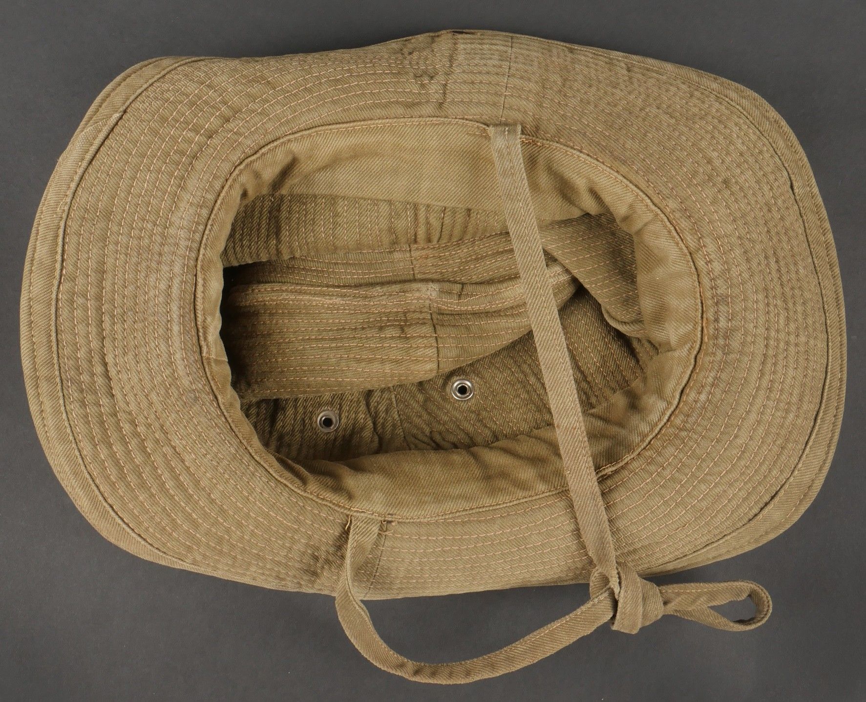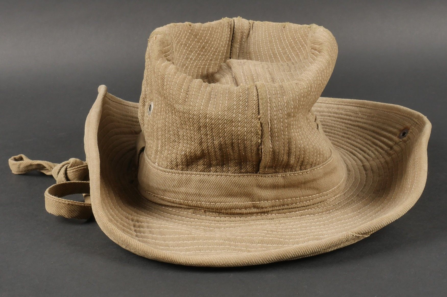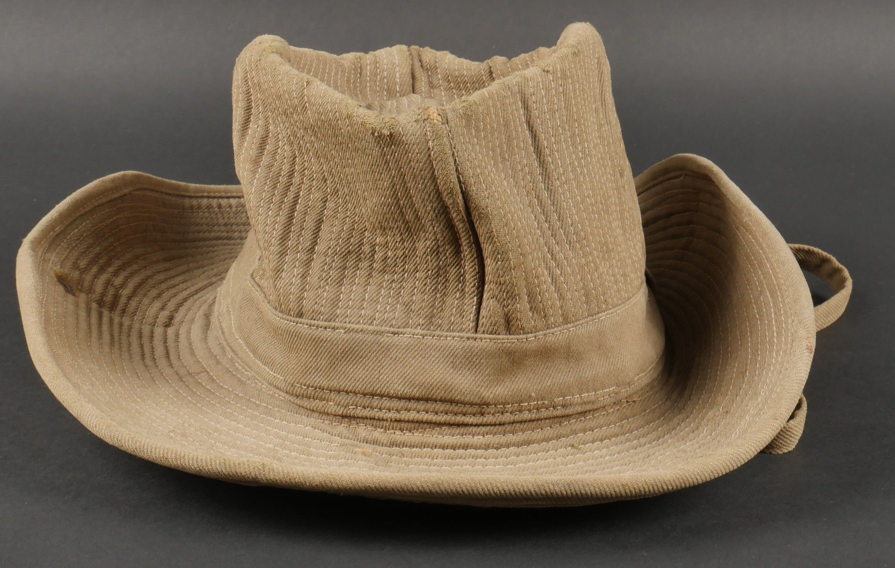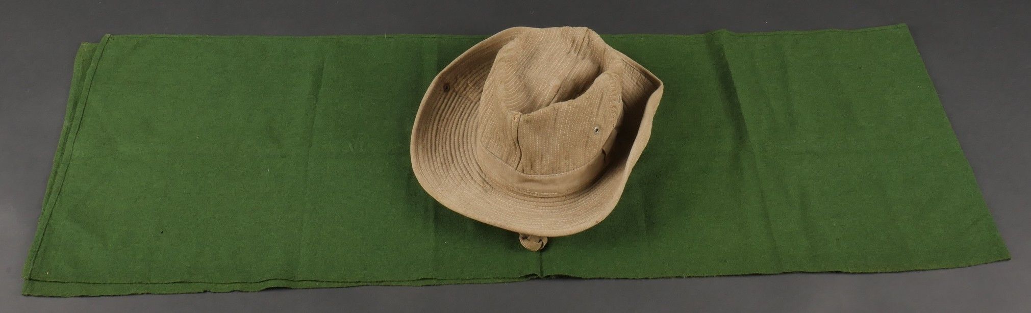 2nd Muong outfit. This set belonged to Chief Szymanski of the 2nd Muong Battalion and includes his locally made Far East bush hat, small snap model, made of strong khaki canvas, complete with chinstrap. Traditional Muong belt in its original length in green woollen cloth. 2nd Muong set. Set belonging to Chief Szymanski of the 2nd Muong Battalion including his locally made Far East bush hat small press stud type in strong khaki canvas complete with chinstrap and his traditional Muong belt of original length in green wool cloth.