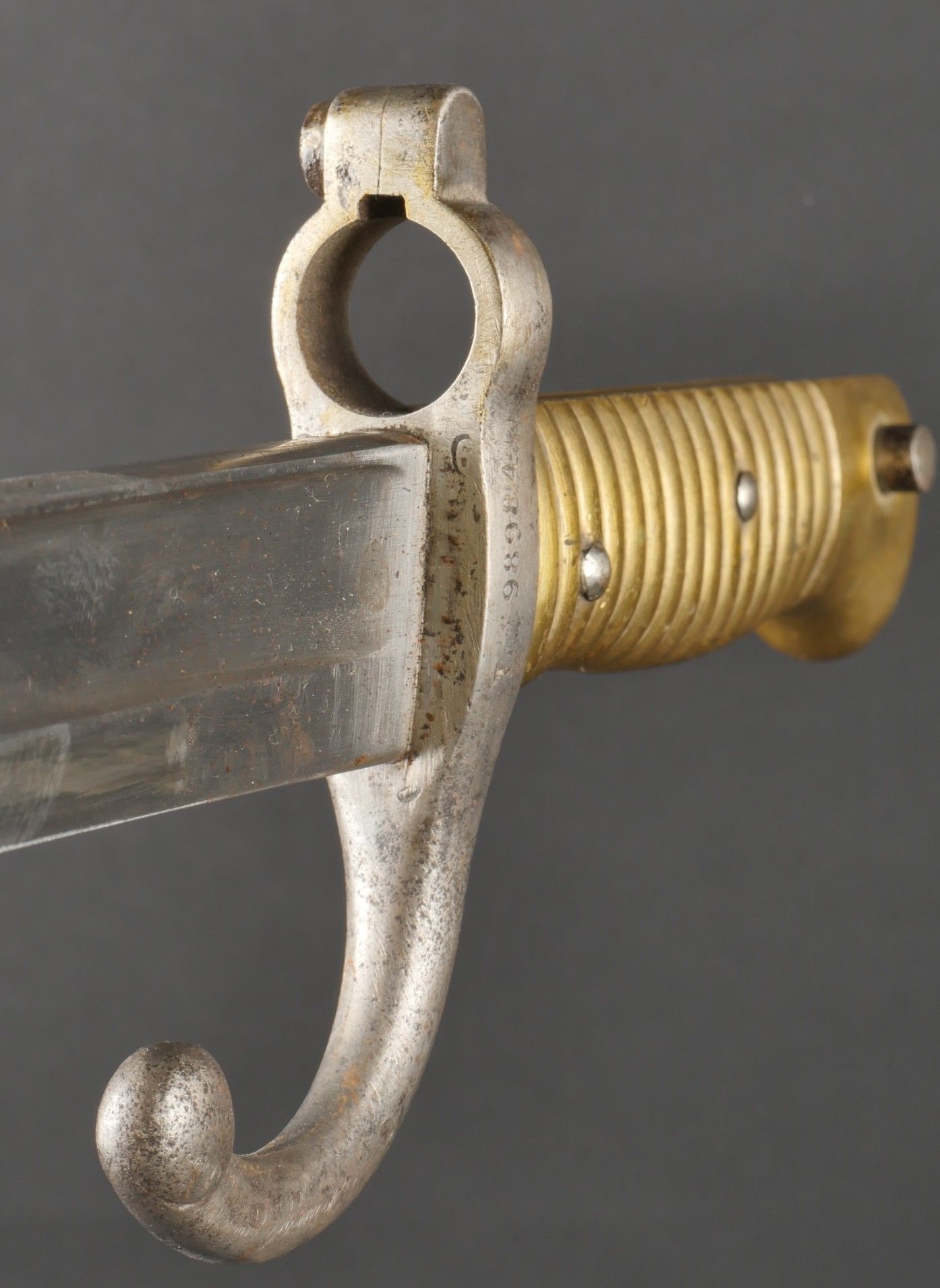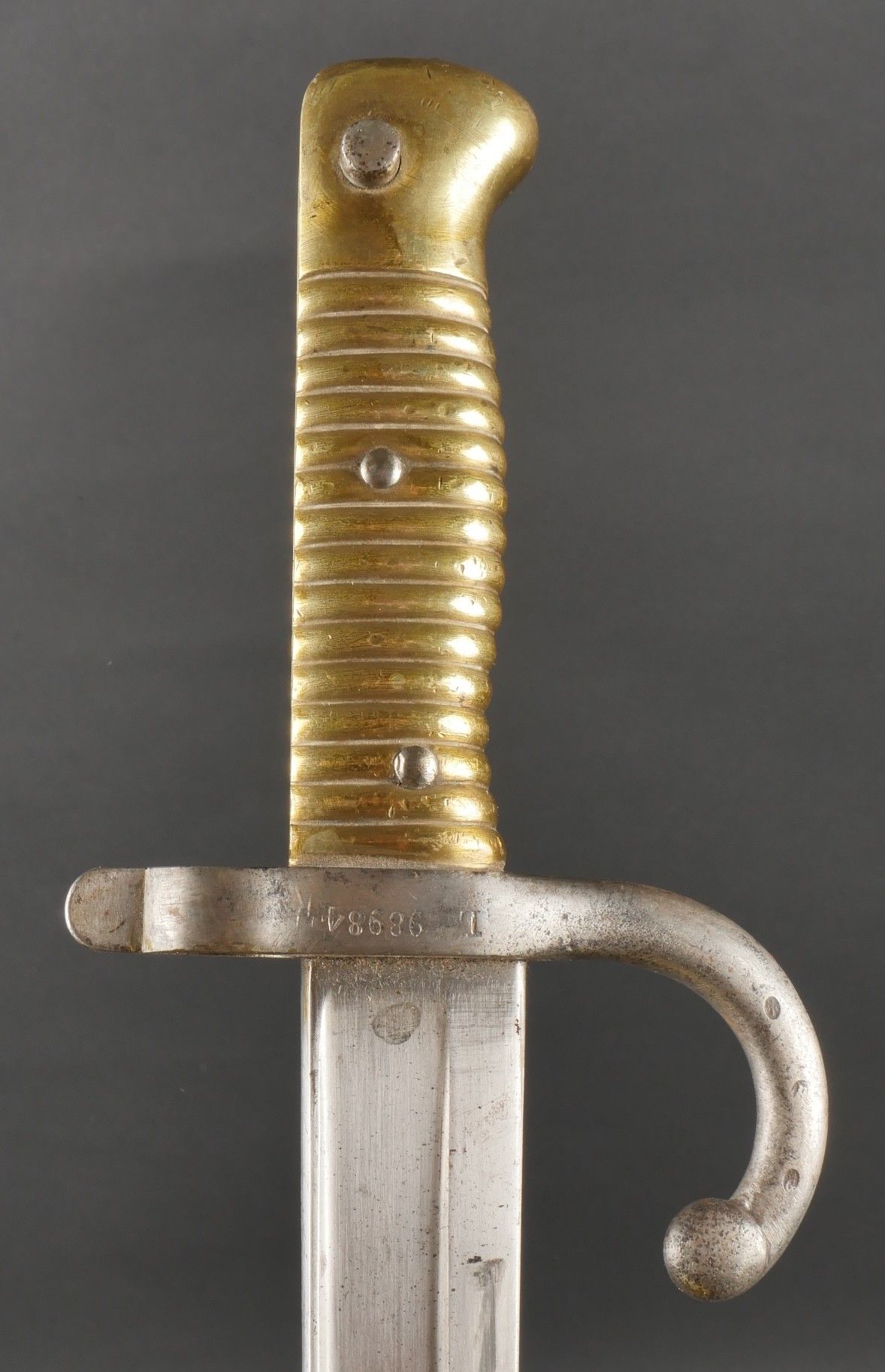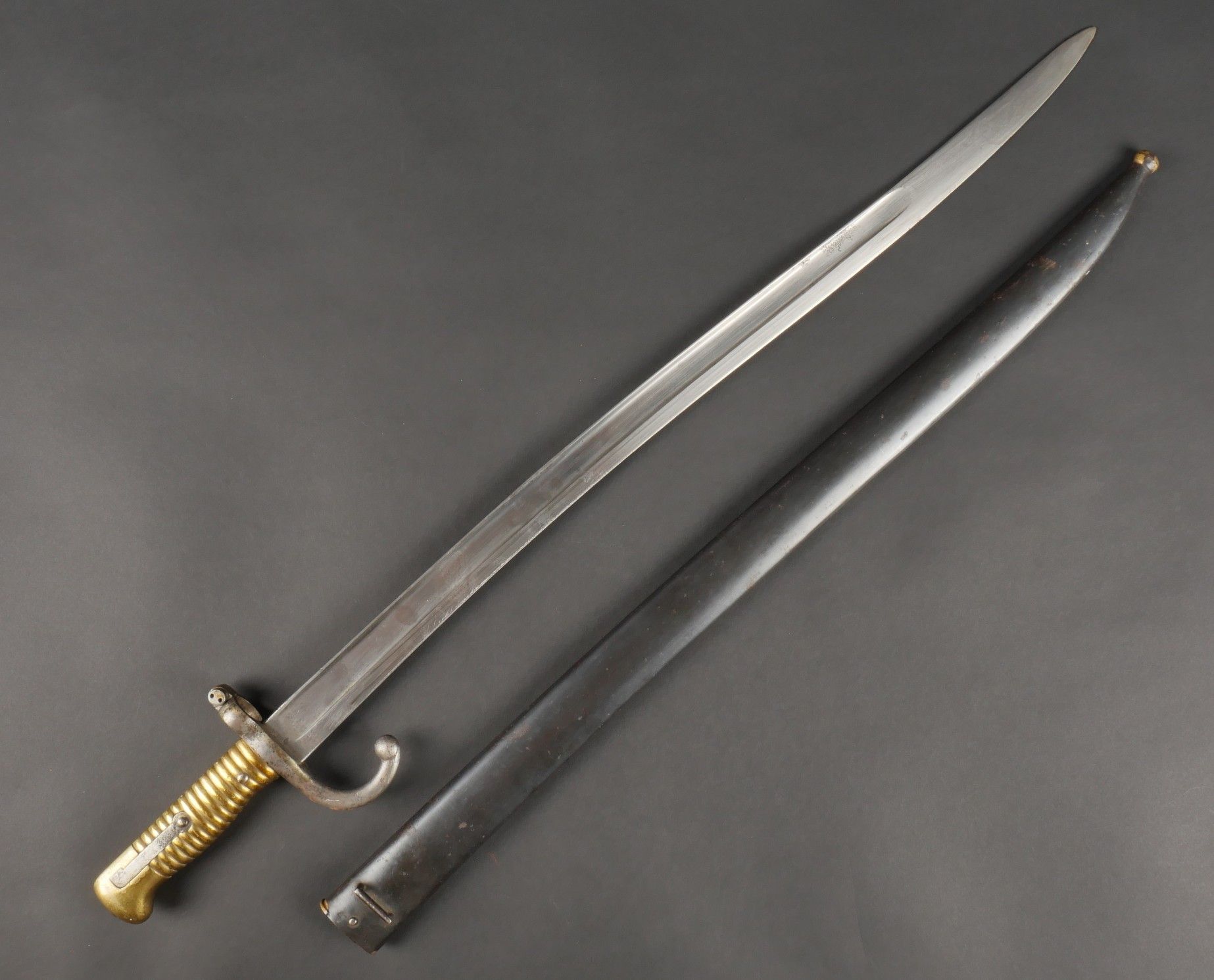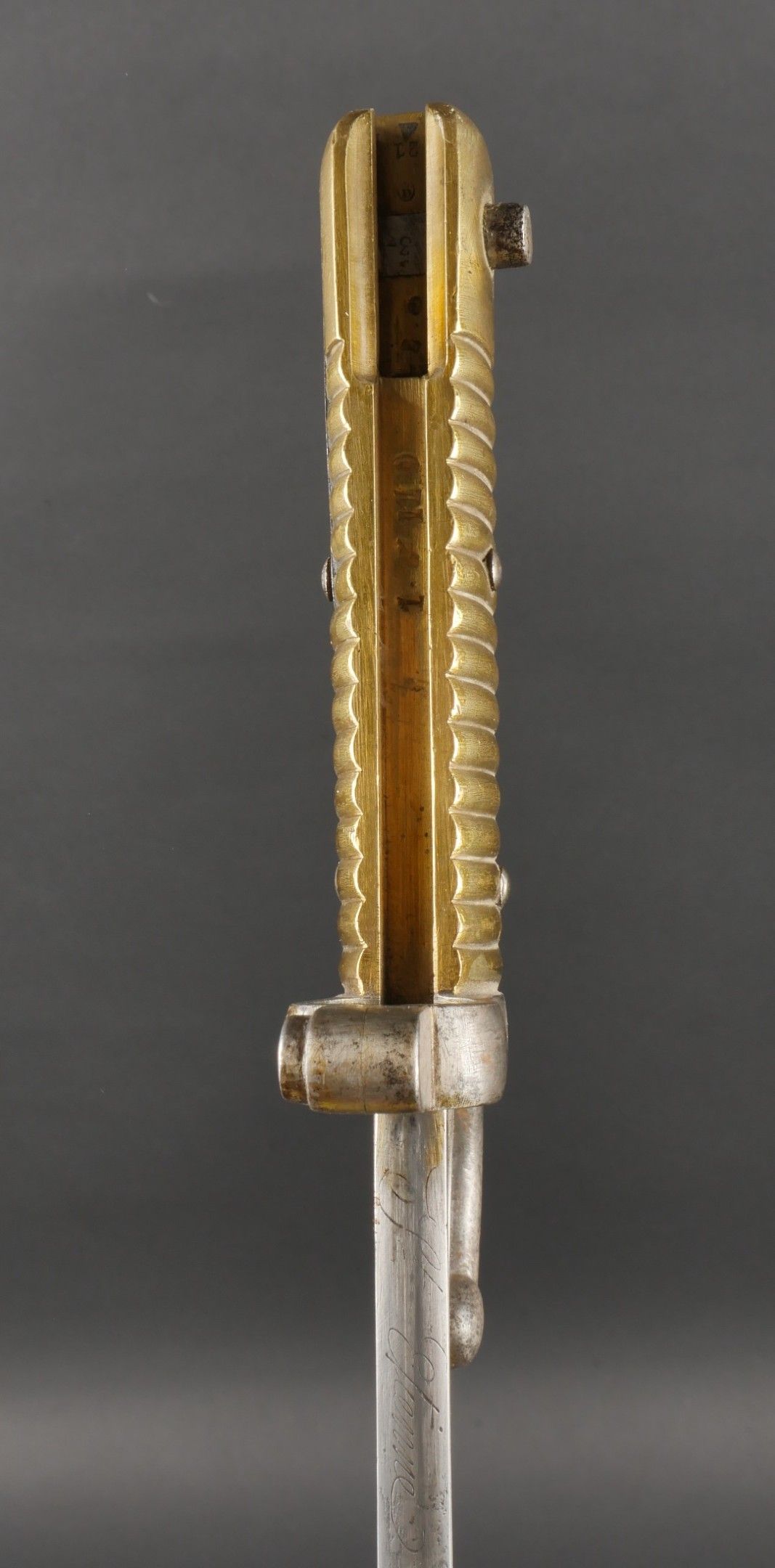 Indochinese tirailleur Chassepot bayonet. Chassepot model 1866 bayonet, blade well marked on the back Saint Etienne juillet 1871, the guard bears the number 98984 as well as various hallmarks on the brass handle. The scabbard has the number 86393, enhanced with an Indochinese motto over its entire length in gold paint. According to the seller's information, this piece came from the estate of Governor George Catroux, and is believed to have been a parting gift. Chassepot bayonet Indochinese rifleman. Chassepot model 1866 bayonet blade spine marked Saint Etienne July 1871. Guard numbered 98984 with various proof marks on brass hilt. Scabbard numbered 86393 enhanced with an Indochinese motto painted in gold along its length. According to the seller this piece came from the estate of Governor George Catroux and was a departure gift.