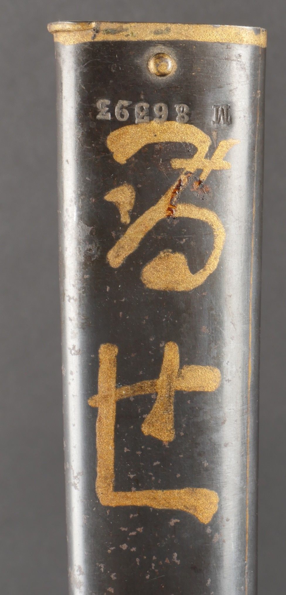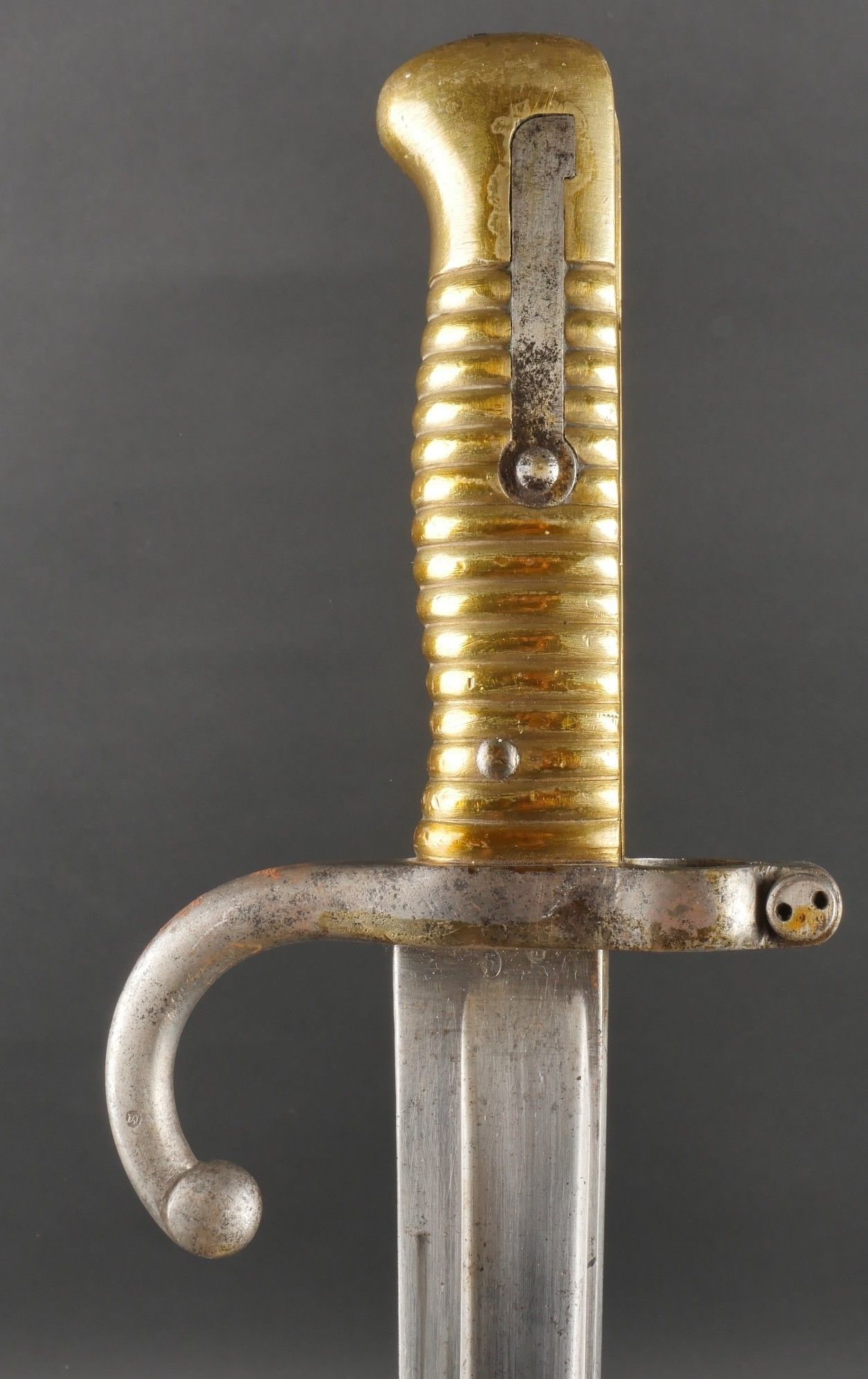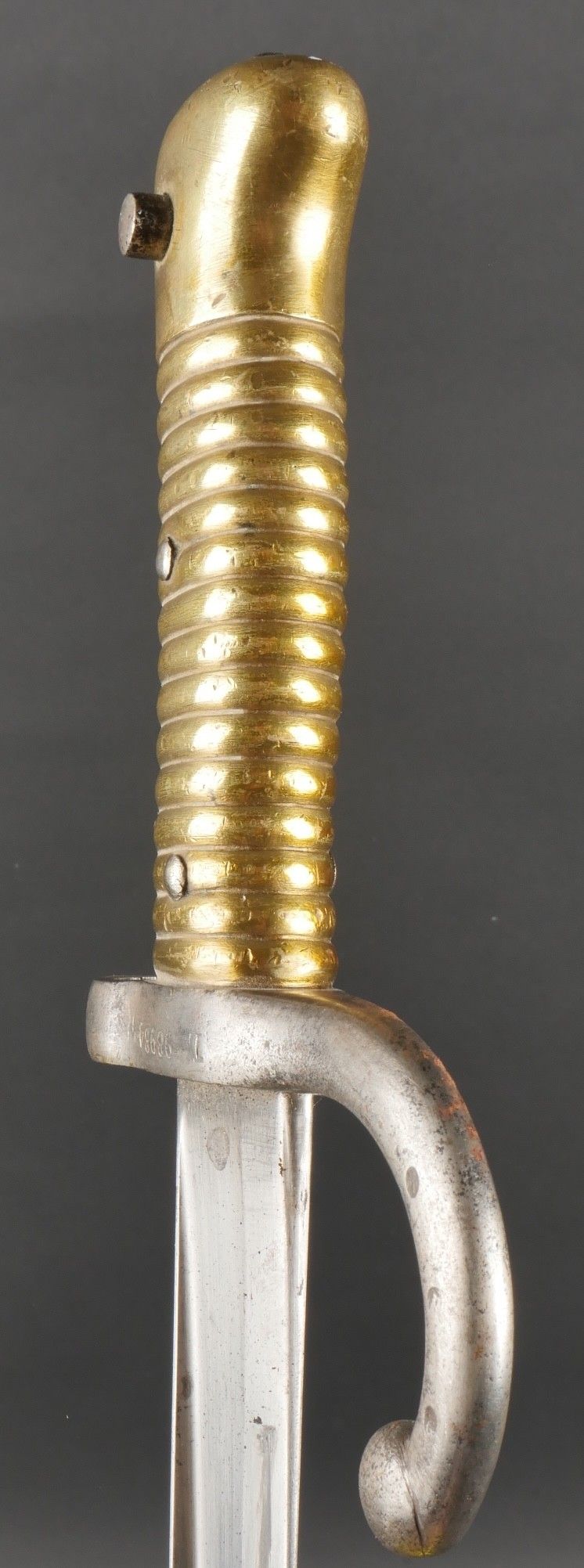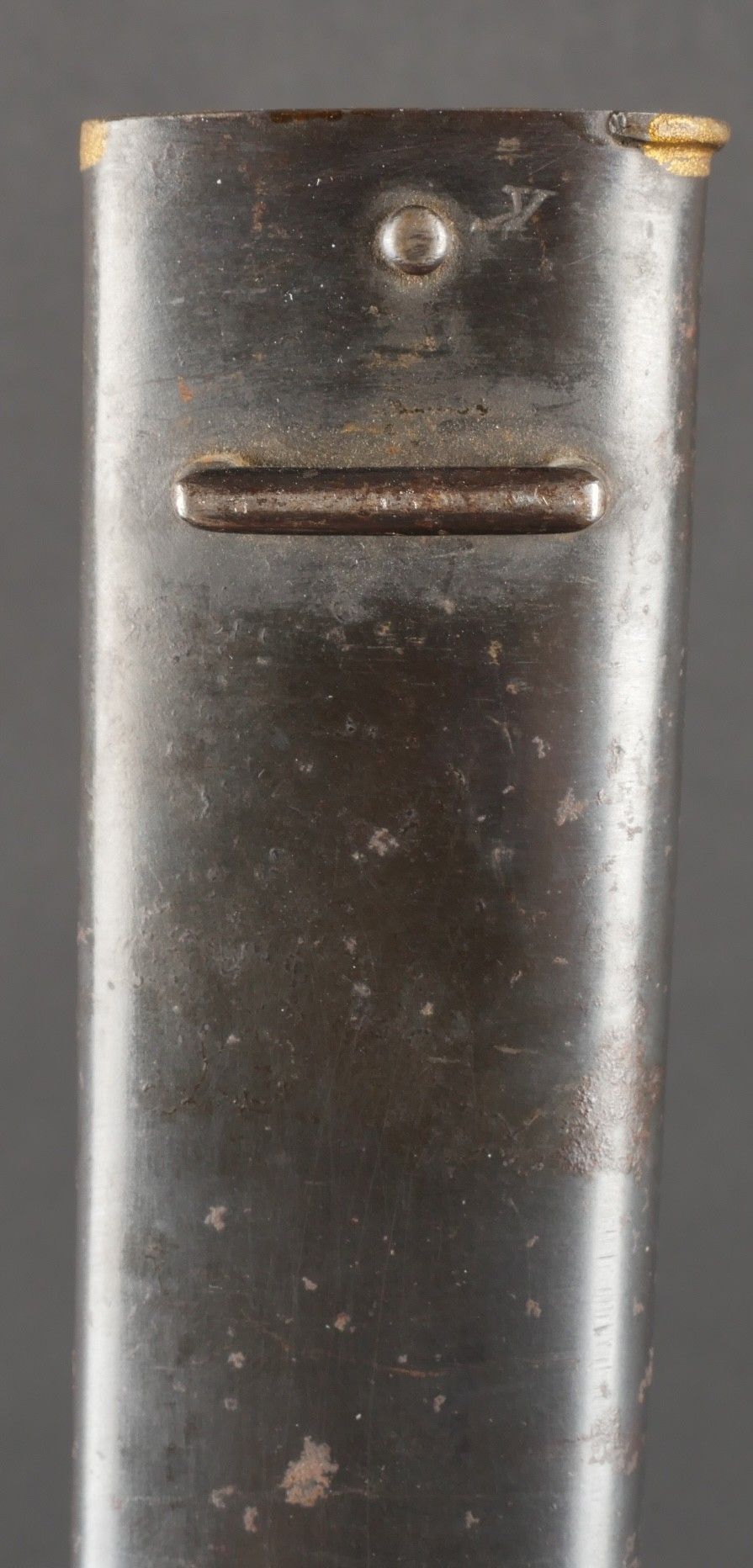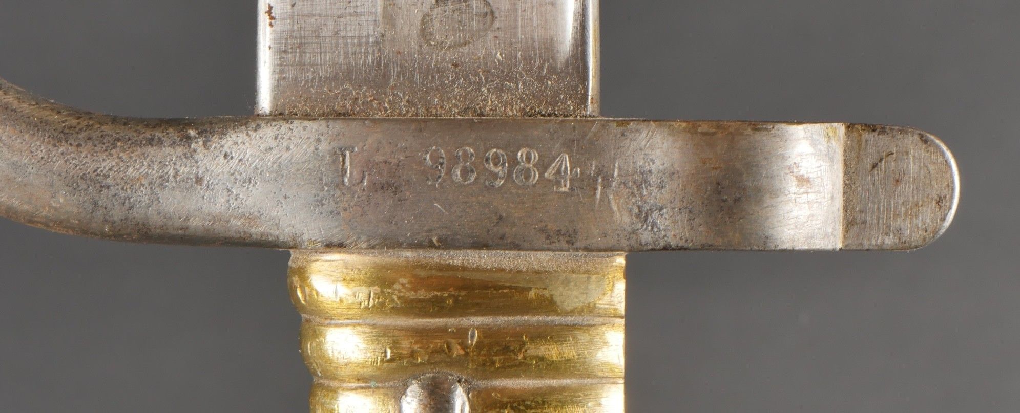 Indochinese tirailleur Chassepot bayonet. Chassepot model 1866 bayonet, blade well marked on the back Saint Etienne juillet 1871, the guard bears the number 98984 as well as various hallmarks on the brass handle. The scabbard has the number 86393, enhanced with an Indochinese motto over its entire length in gold paint. According to the seller's information, this piece came from the estate of Governor George Catroux, and is believed to have been a parting gift. Chassepot bayonet Indochinese rifleman. Chassepot model 1866 bayonet blade spine marked Saint Etienne July 1871. Guard numbered 98984 with various proof marks on brass hilt. Scabbard numbered 86393 enhanced with an Indochinese motto painted in gold along its length. According to the seller this piece came from the estate of Governor George Catroux and was a departure gift.