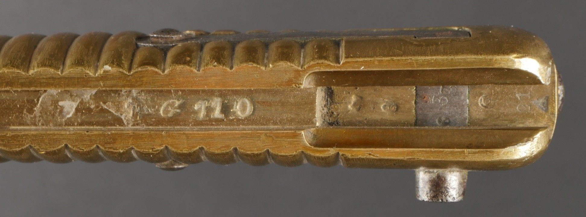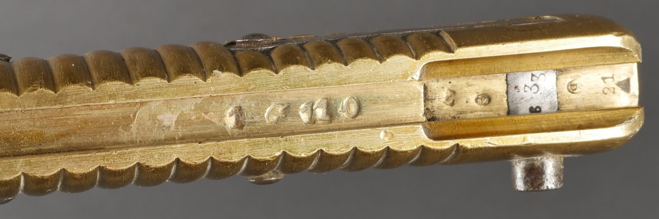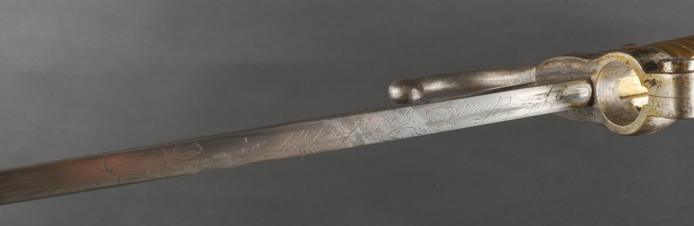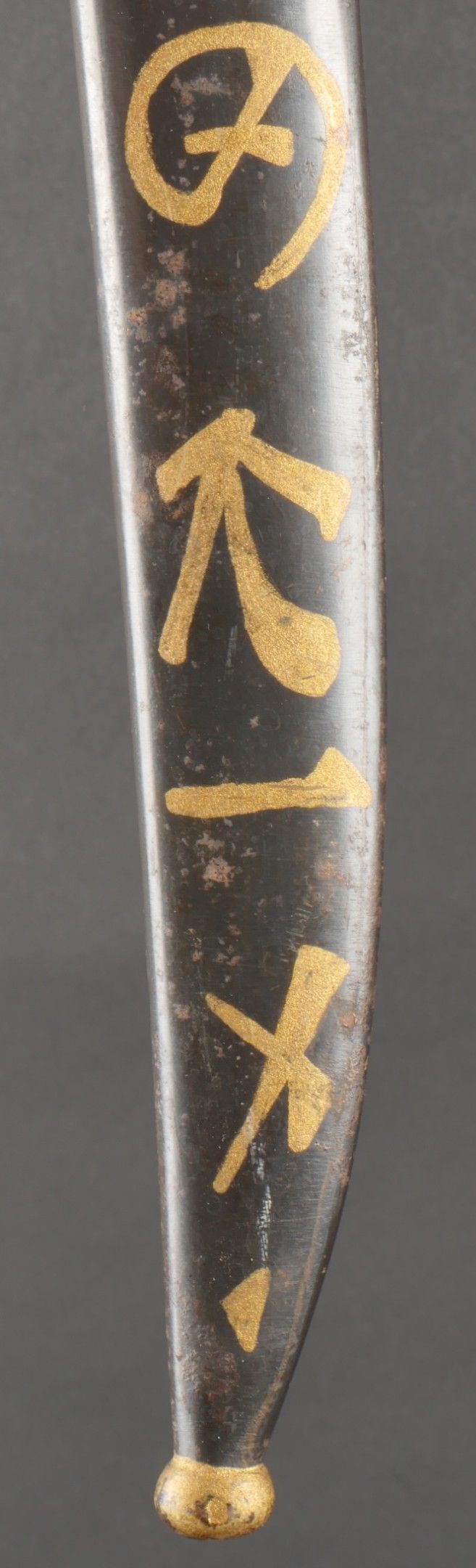 Indochinese tirailleur Chassepot bayonet. Chassepot model 1866 bayonet, blade well marked on the back Saint Etienne juillet 1871, the guard bears the number 98984 as well as various hallmarks on the brass handle. The scabbard has the number 86393, enhanced with an Indochinese motto over its entire length in gold paint. According to the seller's information, this piece came from the estate of Governor George Catroux, and is believed to have been a parting gift. Chassepot bayonet Indochinese rifleman. Chassepot model 1866 bayonet blade spine marked Saint Etienne July 1871. Guard numbered 98984 with various proof marks on brass hilt. Scabbard numbered 86393 enhanced with an Indochinese motto painted in gold along its length. According to the seller this piece came from the estate of Governor George Catroux and was a departure gift.