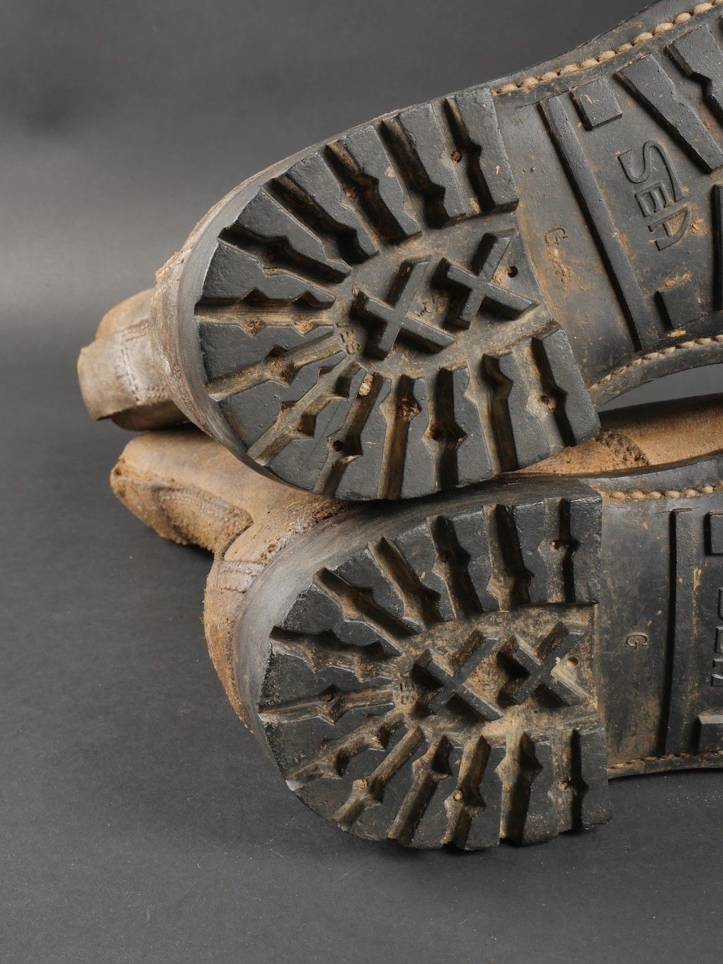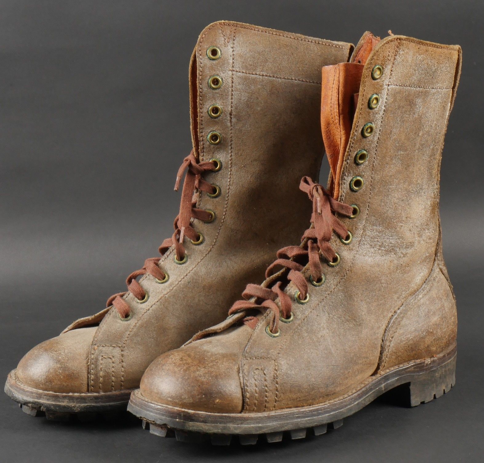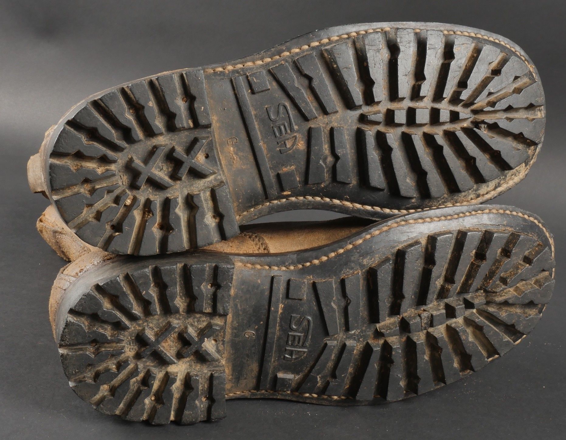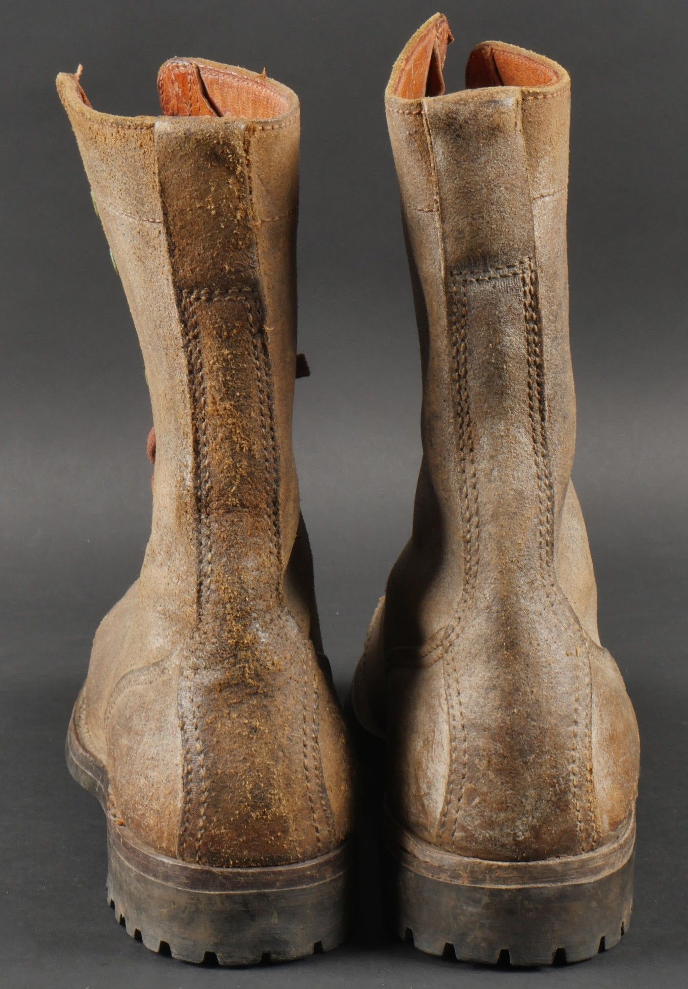 Pair of TAP 50 jump boots dated 1954. Belledonne SEA sewn rubber soles. Stamps on inner sole indicate size 264 and date 154. All eyelets are present. Pair never worn as new from stock. Pair of TAP 50 jump boots dated 1954. Rubber sole stitched marked Belledonne SEA. Insole stamps size 26 4 and date 1 54. Numerous inspection stamps inside both boots. All eyelets present. Unworn mint stock pair.