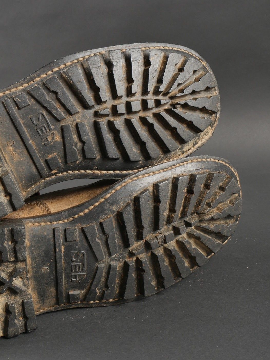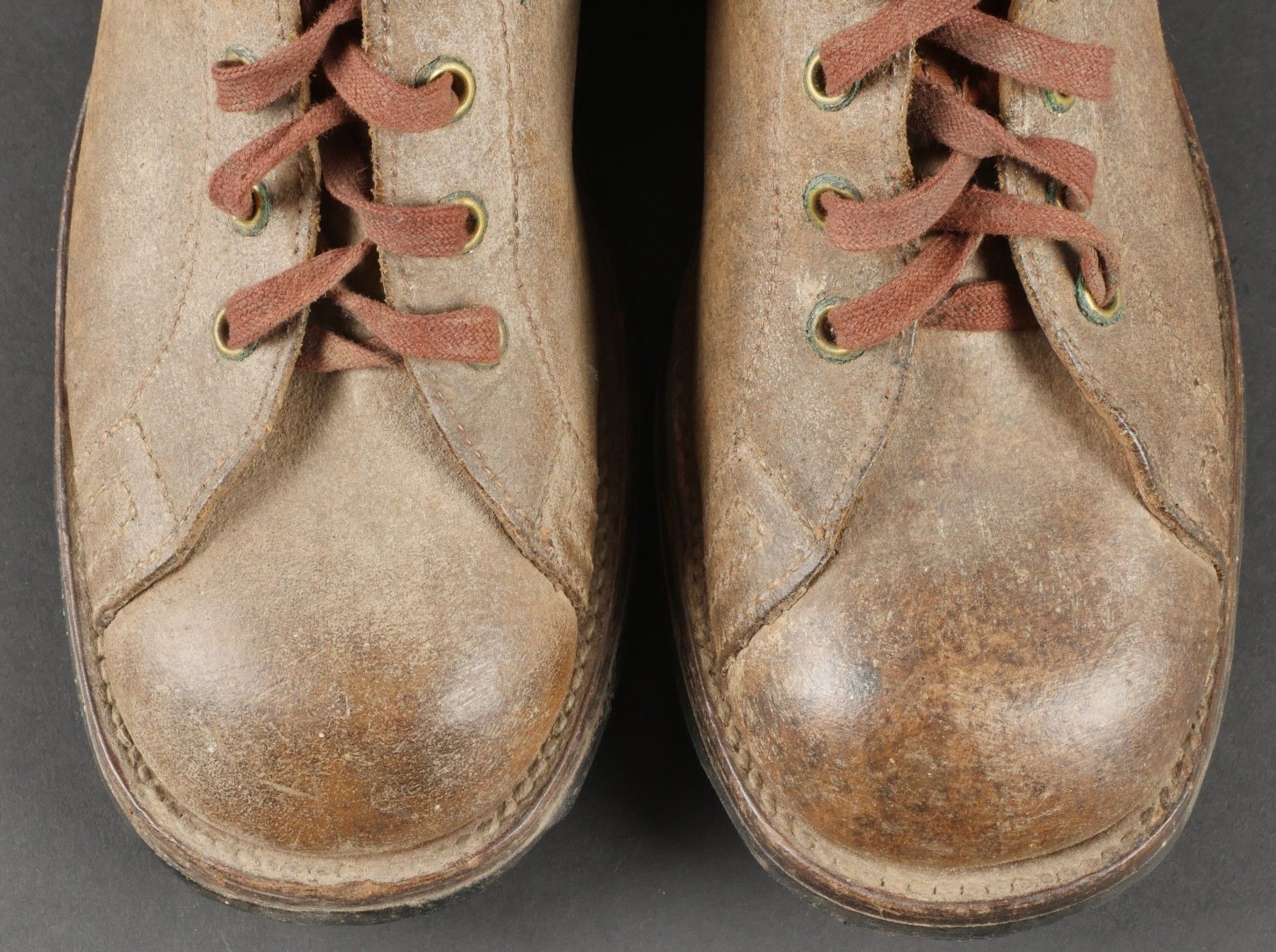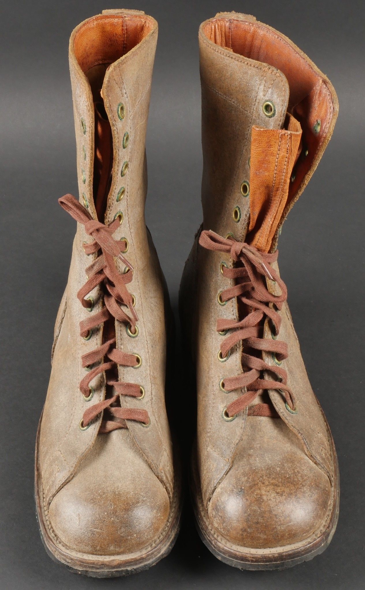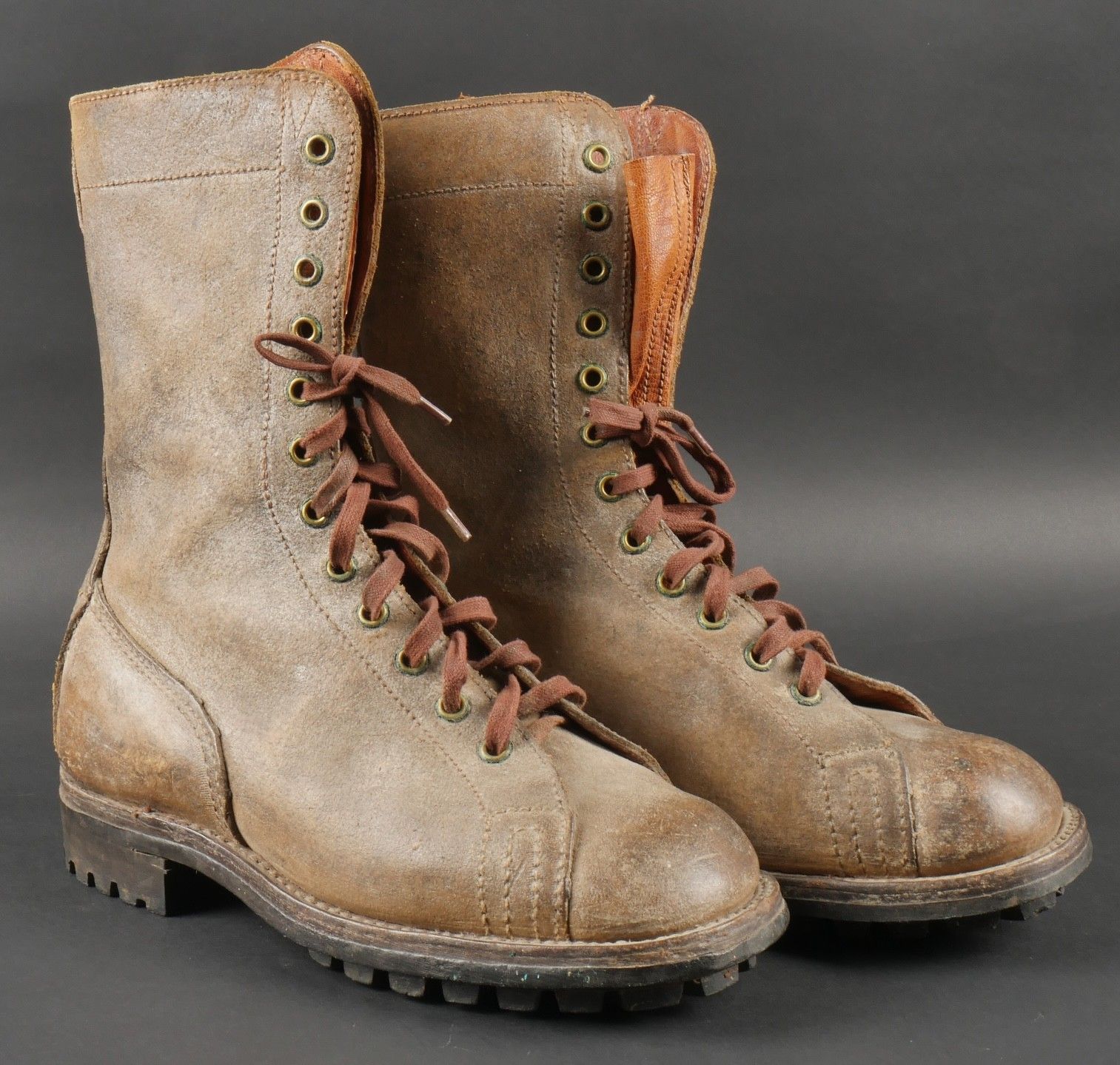 Pair of TAP 50 jump boots dated 1954. Belledonne SEA sewn rubber soles. Stamps on inner sole indicate size 264 and date 154. All eyelets are present. Pair never worn as new from stock. Pair of TAP 50 jump boots dated 1954. Rubber sole stitched marked Belledonne SEA. Insole stamps size 26 4 and date 1 54. Numerous inspection stamps inside both boots. All eyelets present. Unworn mint stock pair.
