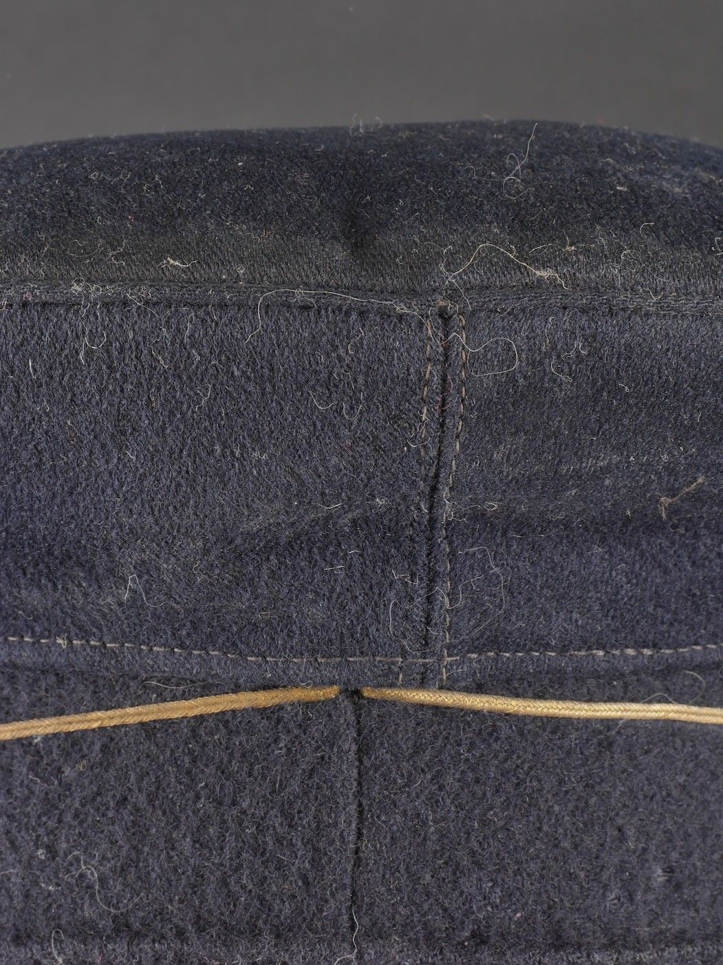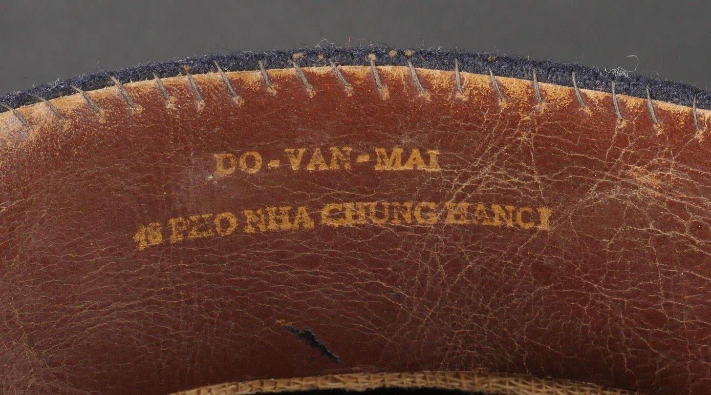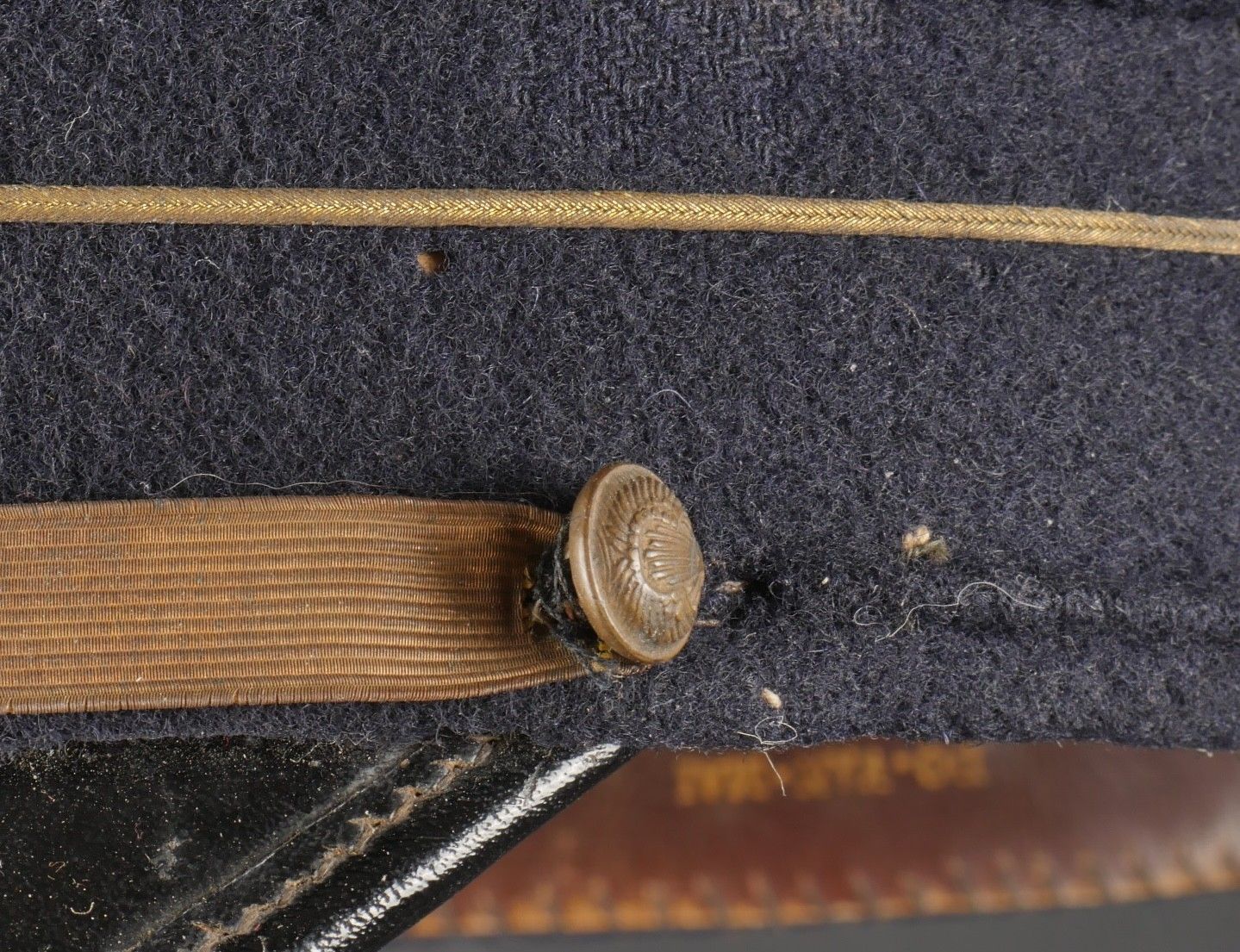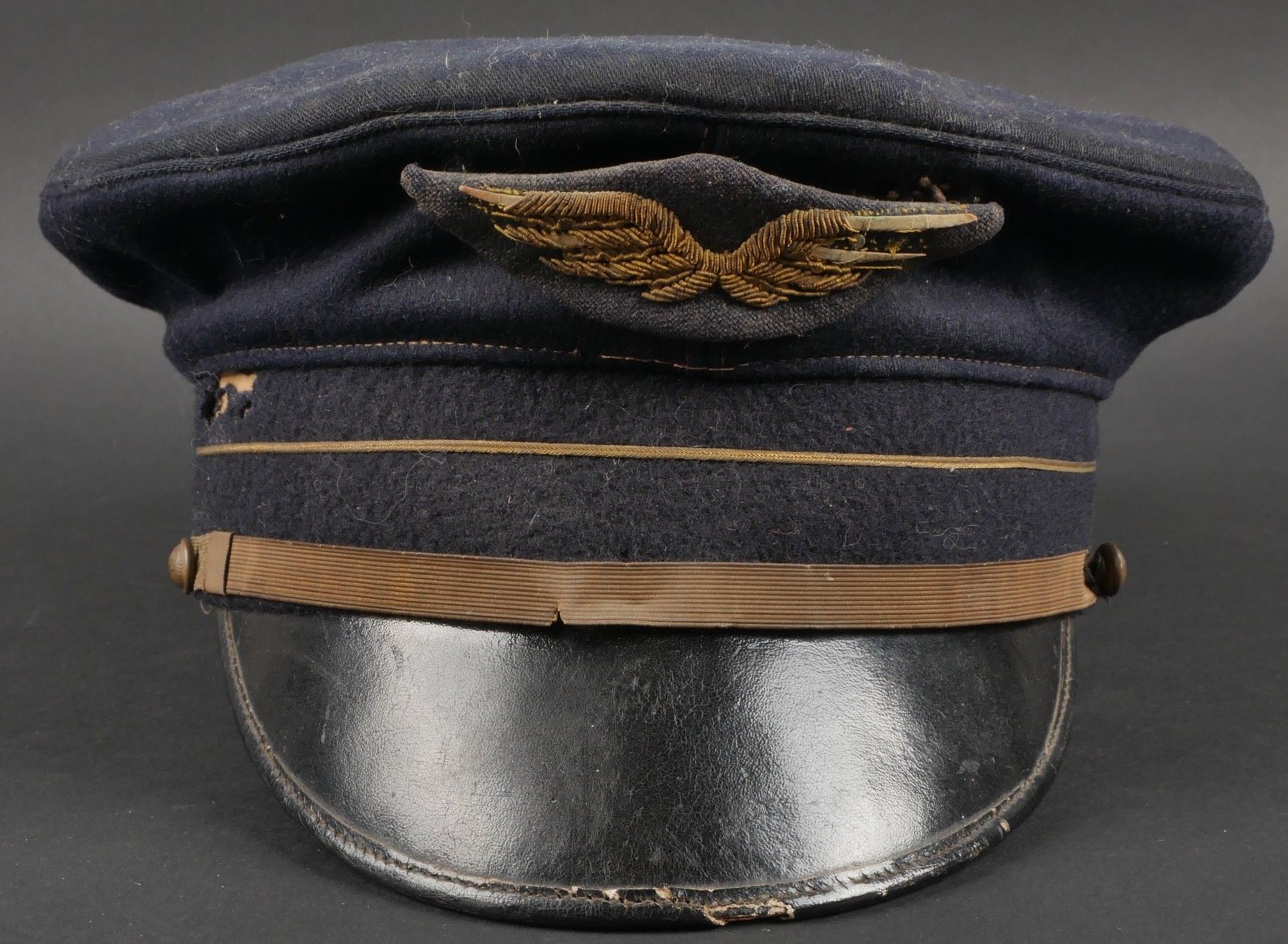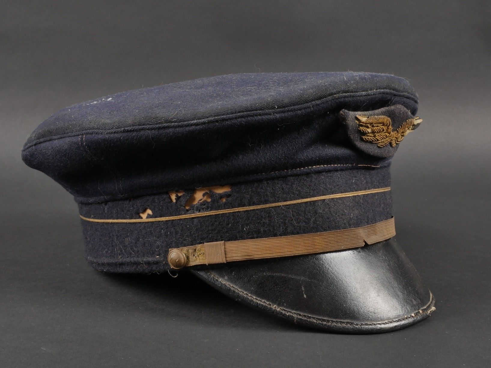 Air Force cap, made by a master tailor in Indochina. Entirely made from fine navy blue woollen cloth, with a black cloth headband, a front attribute held in place by two small hooks and embroidered with cannetille, and a gold false chinstrap held in place by two small buttons decorated with the wings of the Armée de l'Air. Leather visor with fine leather trim. Fine tan leather headband with tailor's markings DO VAN MAI 18 PHO NHA CHUNG HANOI. Some moth damage. Air Force cap made by a master tailor in Indochina. Fine dark blue wool body black cloth band front badge embroidered in bullion held by two small hooks gilt chinstrap held by two small buttons with Air Force wings. Leather visor with fine edge. Light brown leather sweatband marked by tailor DO VAN MAI 18 PHO NHA CHUNG HANOI. Minor moth damage.