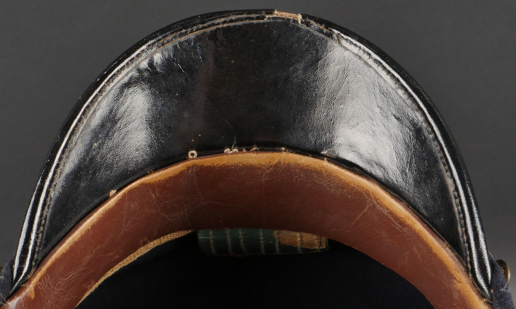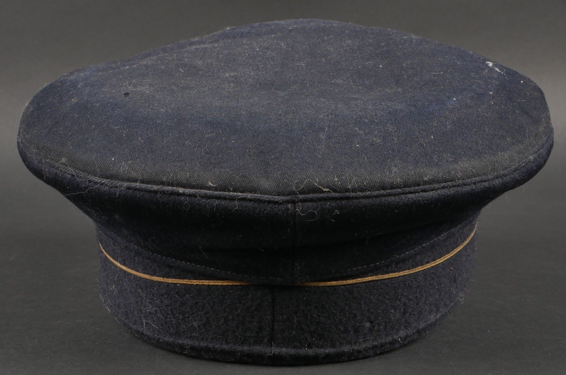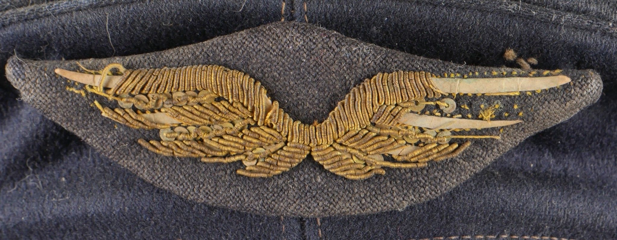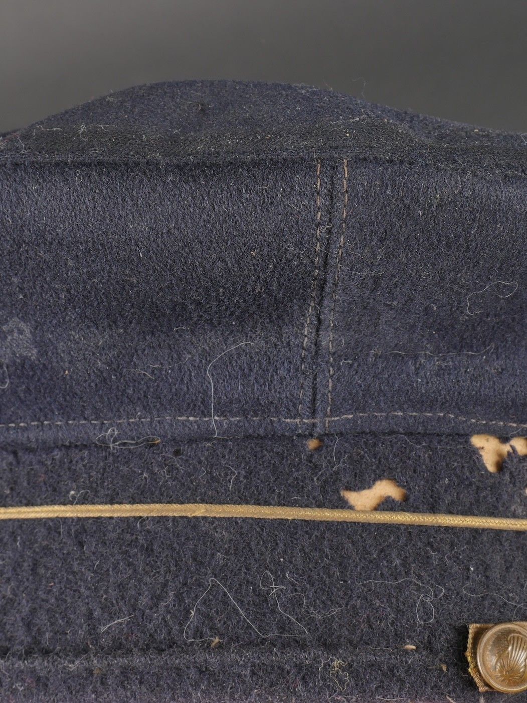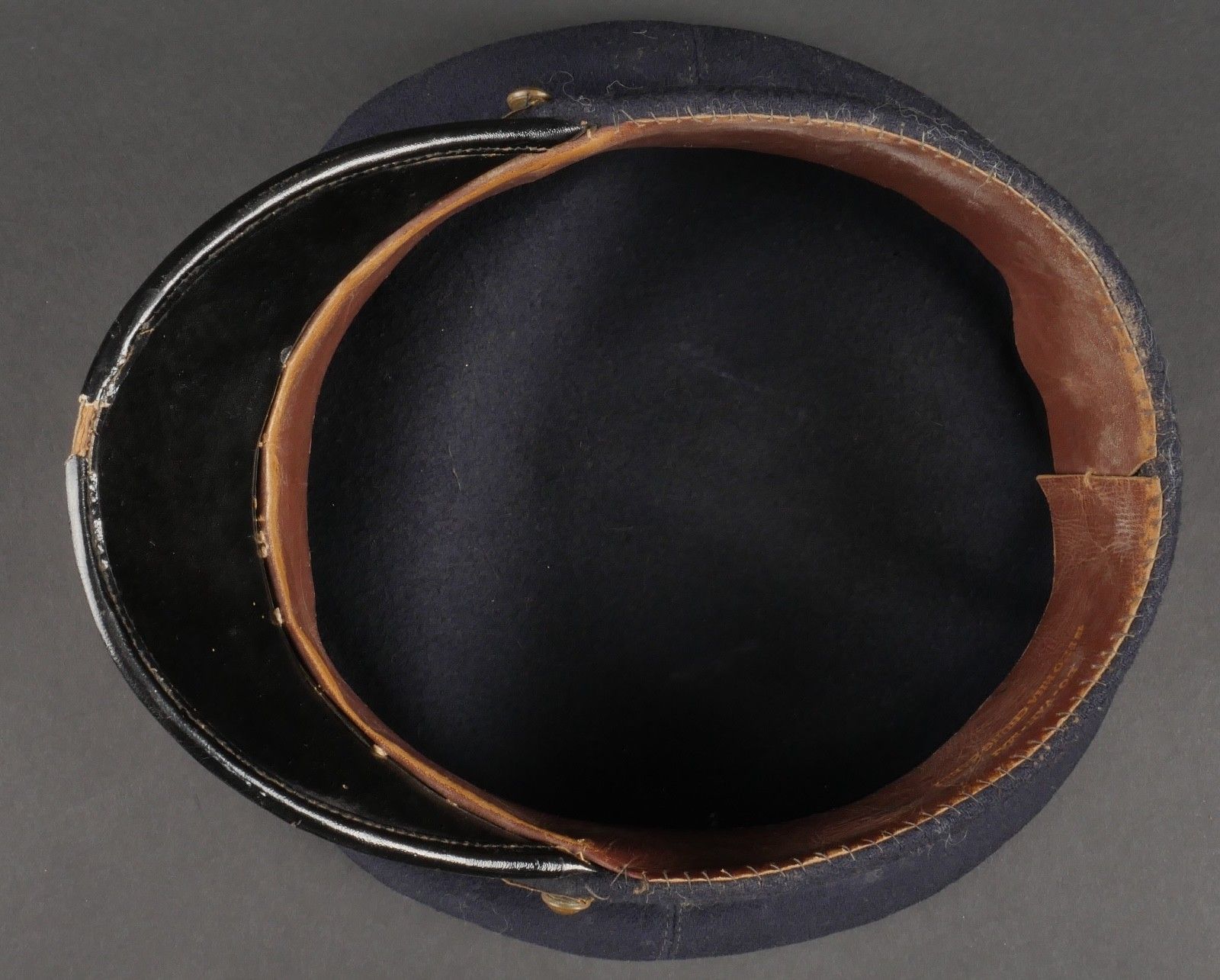 Air Force cap, made by a master tailor in Indochina. Entirely made from fine navy blue woollen cloth, with a black cloth headband, a front attribute held in place by two small hooks and embroidered with cannetille, and a gold false chinstrap held in place by two small buttons decorated with the wings of the Armée de l'Air. Leather visor with fine leather trim. Fine tan leather headband with tailor's markings DO VAN MAI 18 PHO NHA CHUNG HANOI. Some moth damage. Air Force cap made by a master tailor in Indochina. Fine dark blue wool body black cloth band front badge embroidered in bullion held by two small hooks gilt chinstrap held by two small buttons with Air Force wings. Leather visor with fine edge. Light brown leather sweatband marked by tailor DO VAN MAI 18 PHO NHA CHUNG HANOI. Minor moth damage.