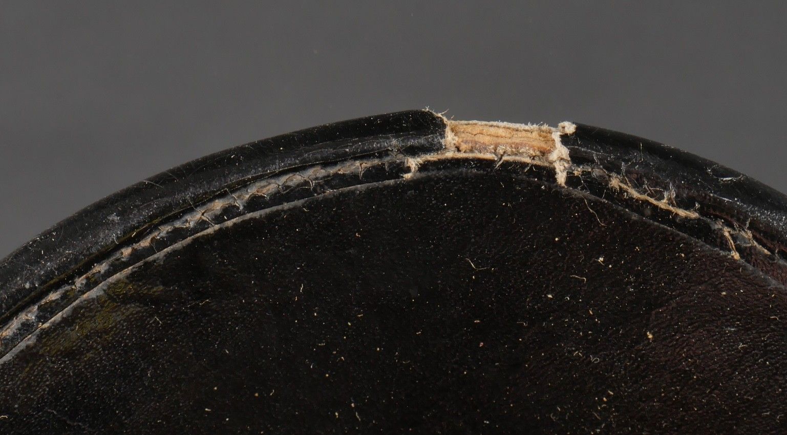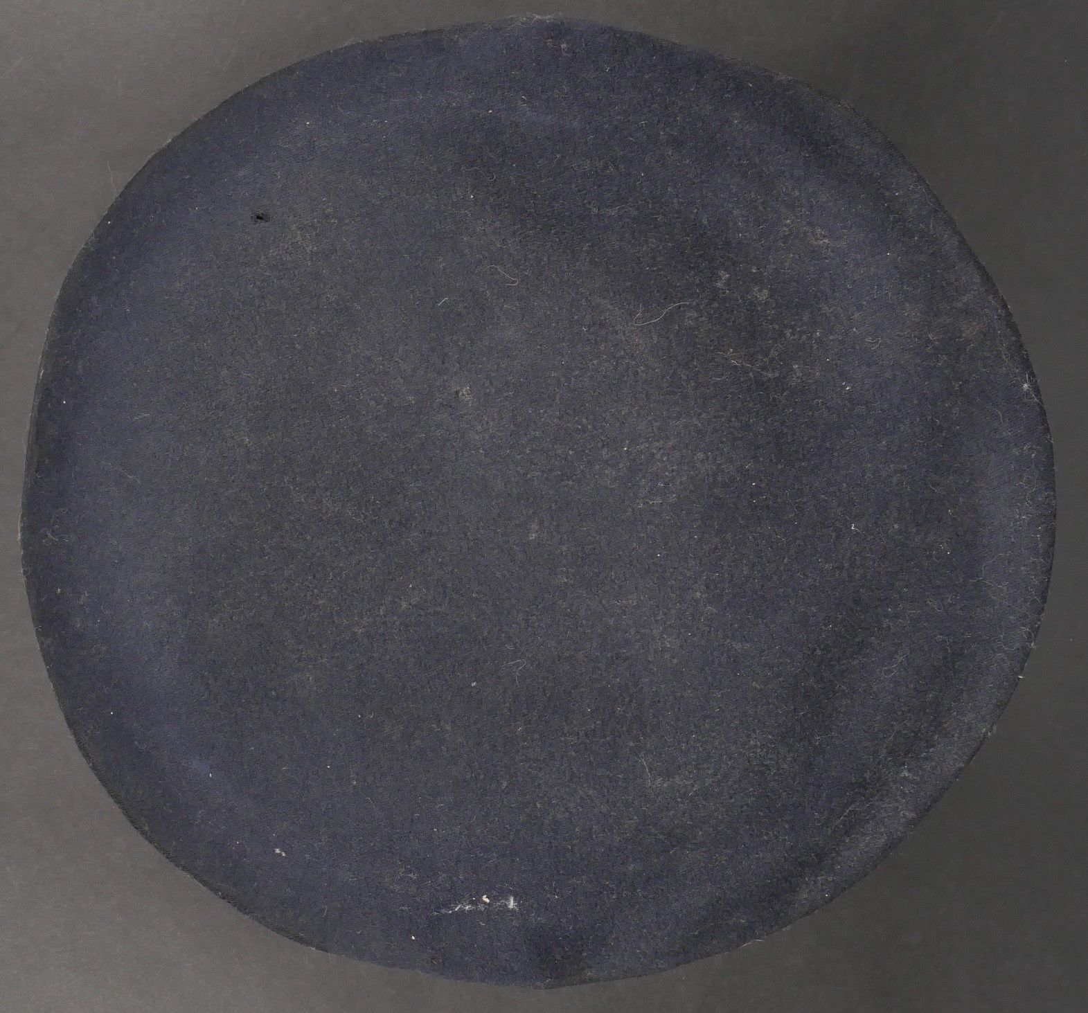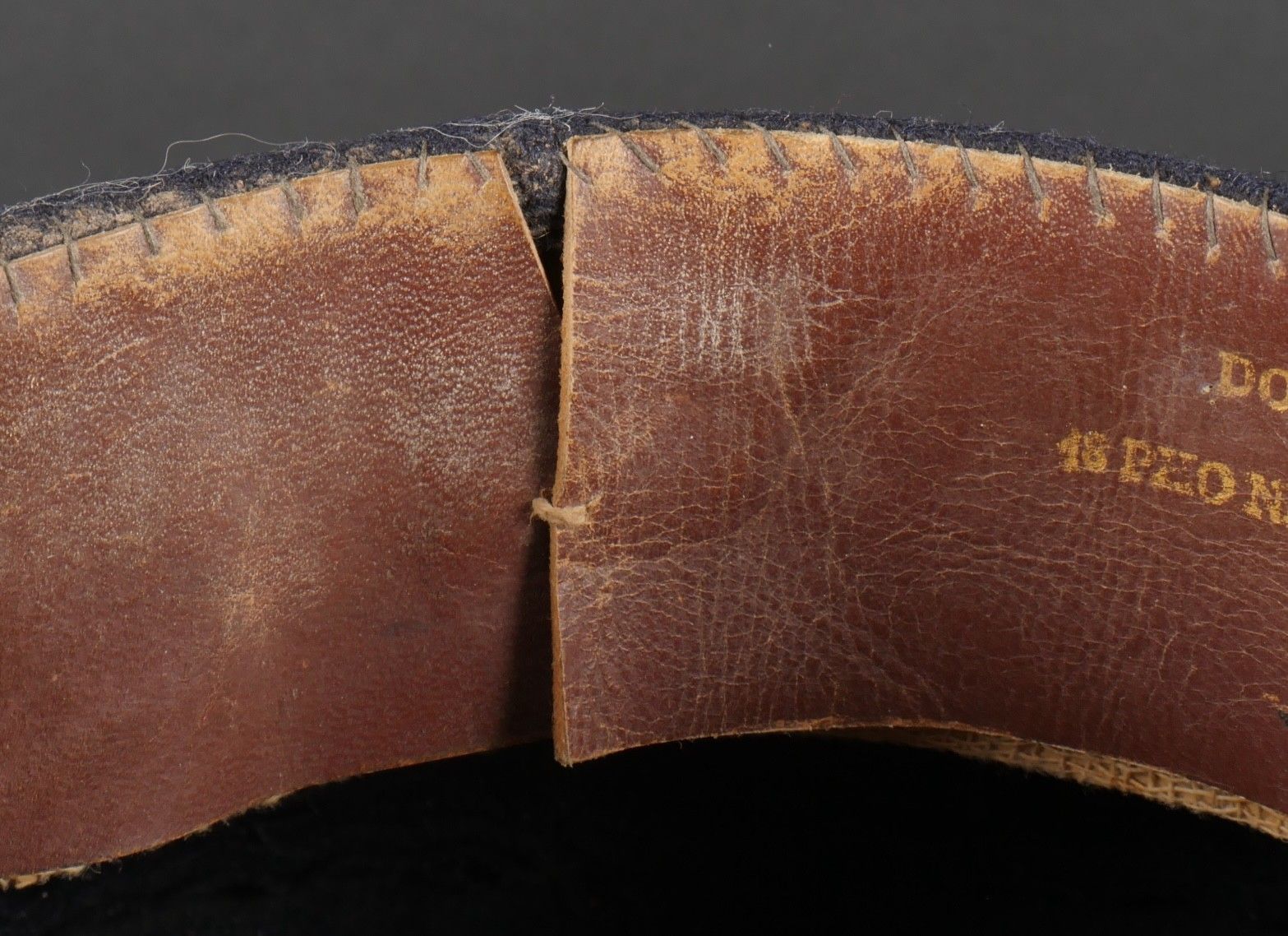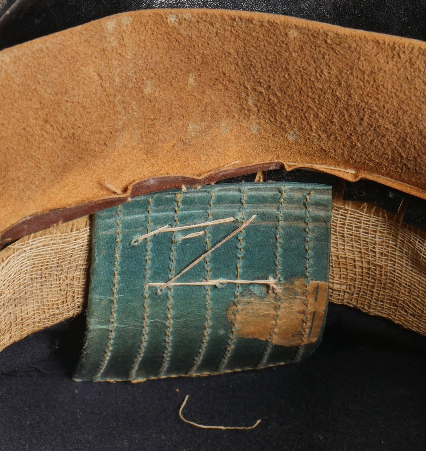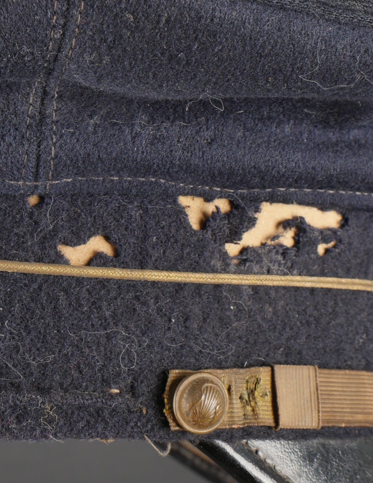 Air Force cap, made by a master tailor in Indochina. Entirely made from fine navy blue woollen cloth, with a black cloth headband, a front attribute held in place by two small hooks and embroidered with cannetille, and a gold false chinstrap held in place by two small buttons decorated with the wings of the Armée de l'Air. Leather visor with fine leather trim. Fine tan leather headband with tailor's markings DO VAN MAI 18 PHO NHA CHUNG HANOI. Some moth damage. Air Force cap made by a master tailor in Indochina. Fine dark blue wool body black cloth band front badge embroidered in bullion held by two small hooks gilt chinstrap held by two small buttons with Air Force wings. Leather visor with fine edge. Light brown leather sweatband marked by tailor DO VAN MAI 18 PHO NHA CHUNG HANOI. Minor moth damage.