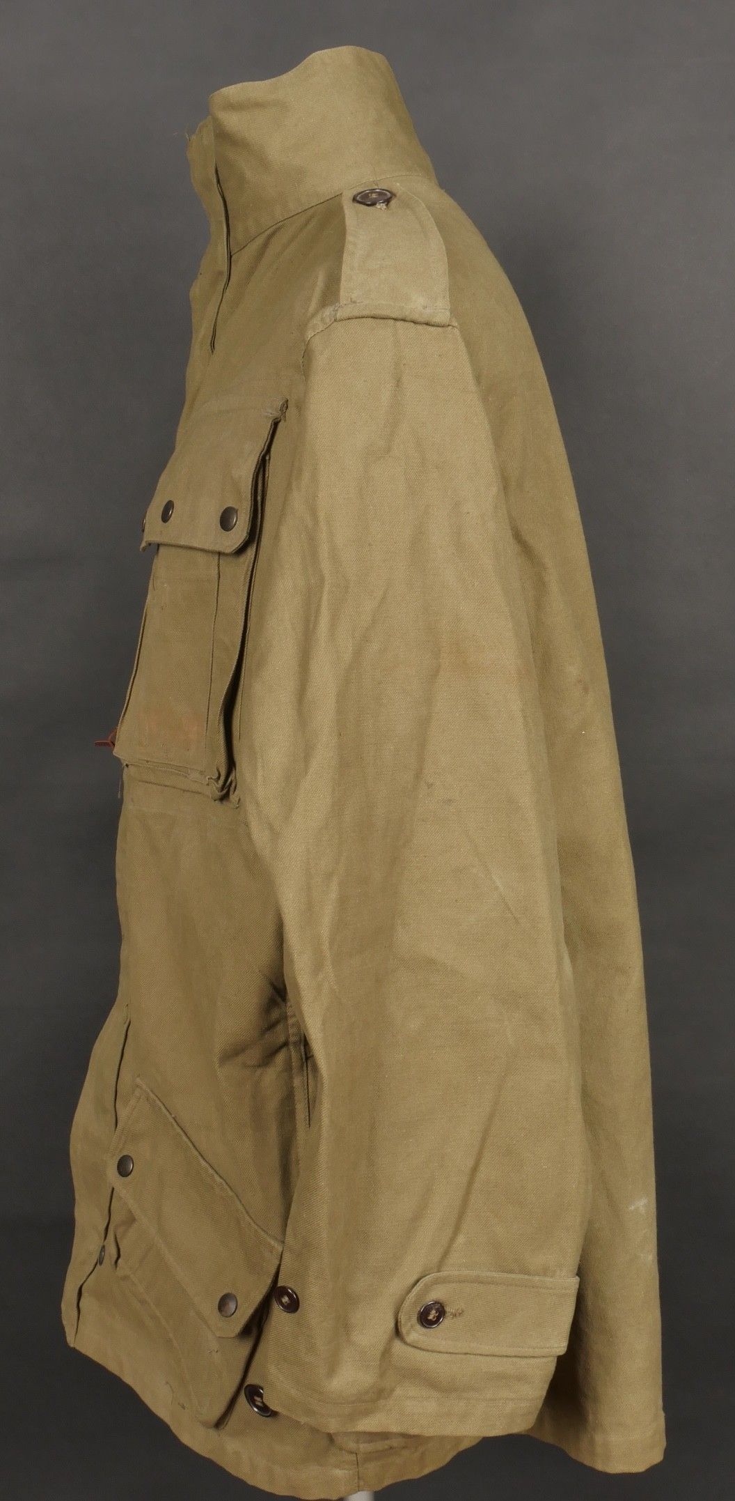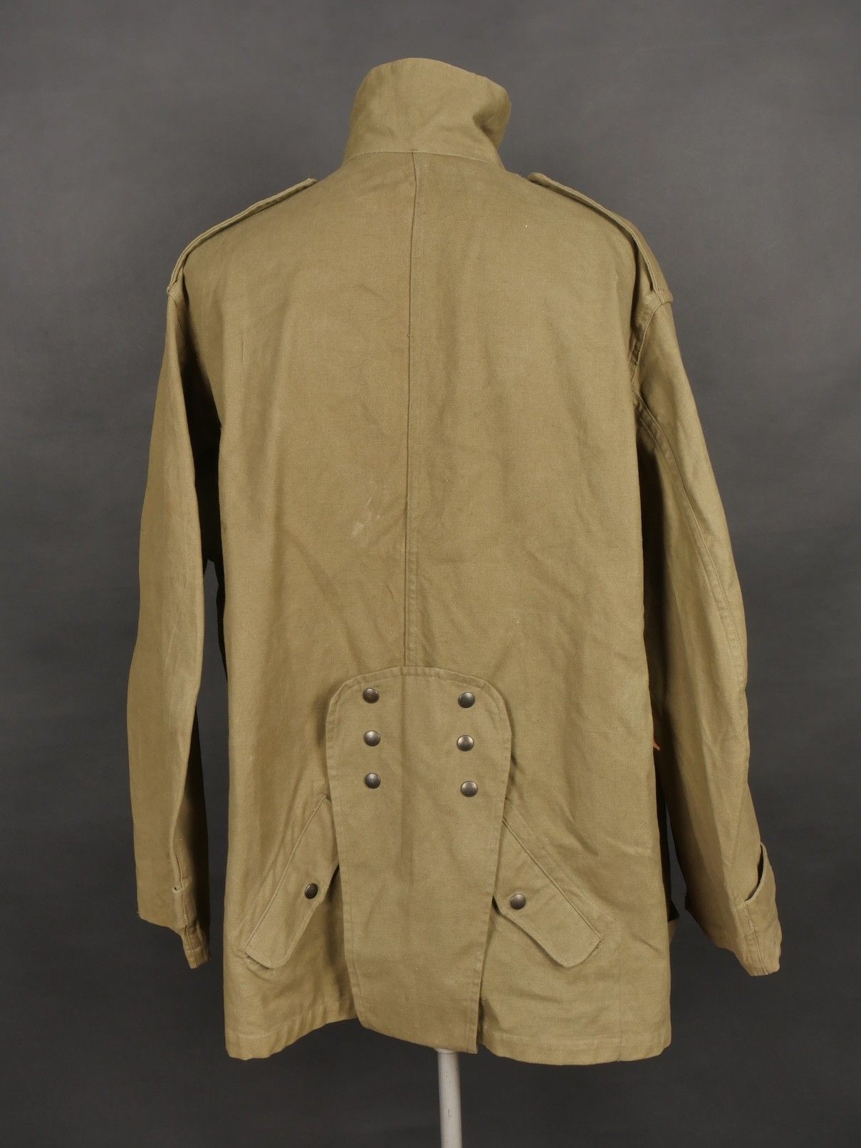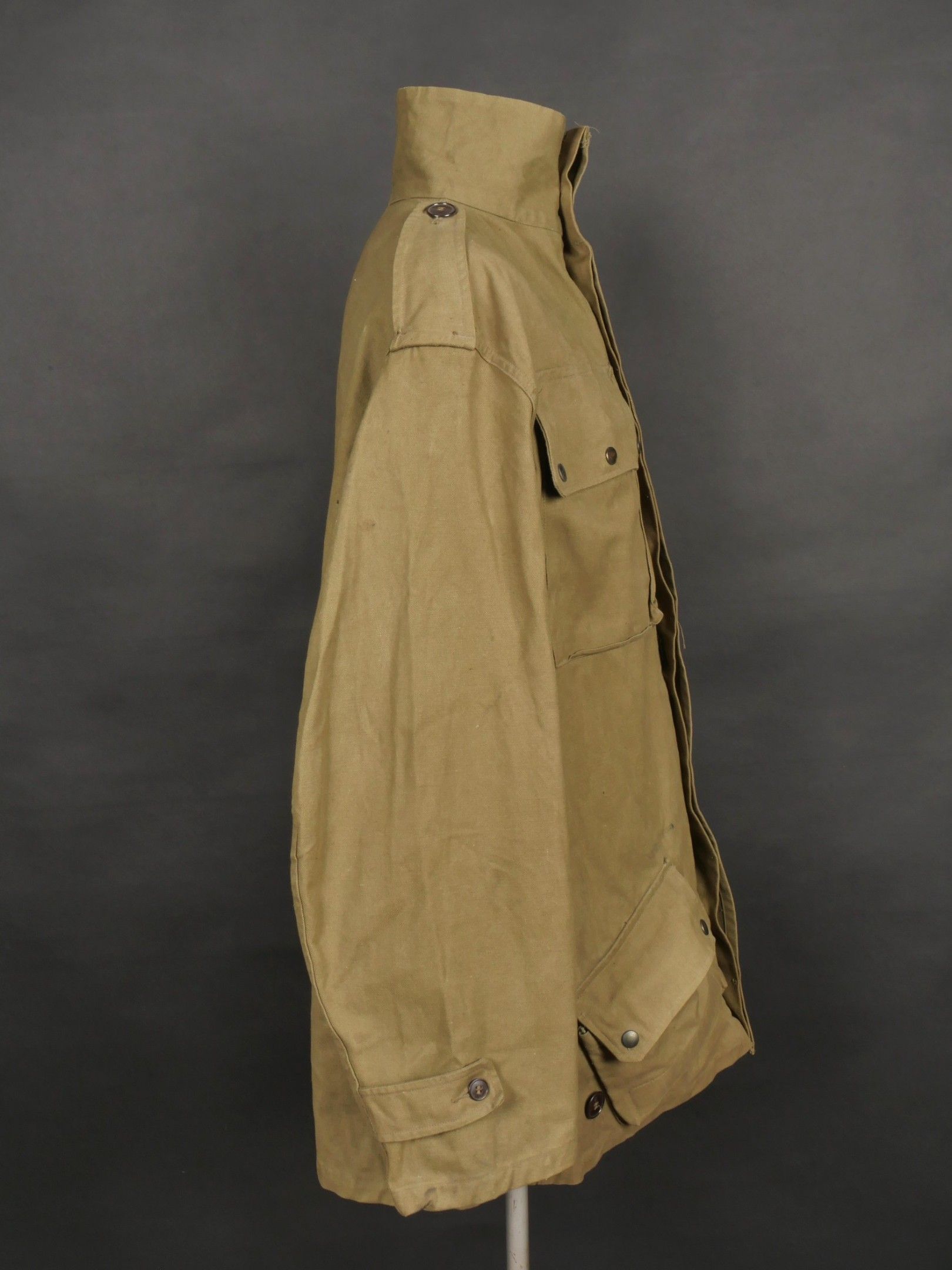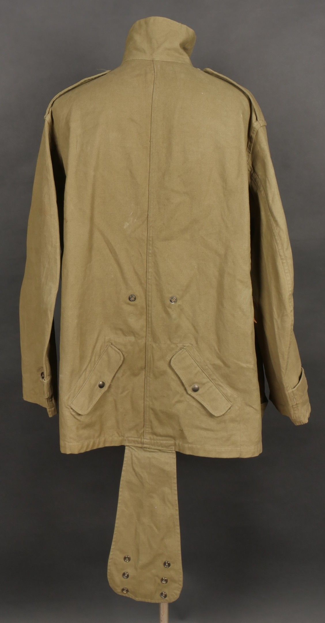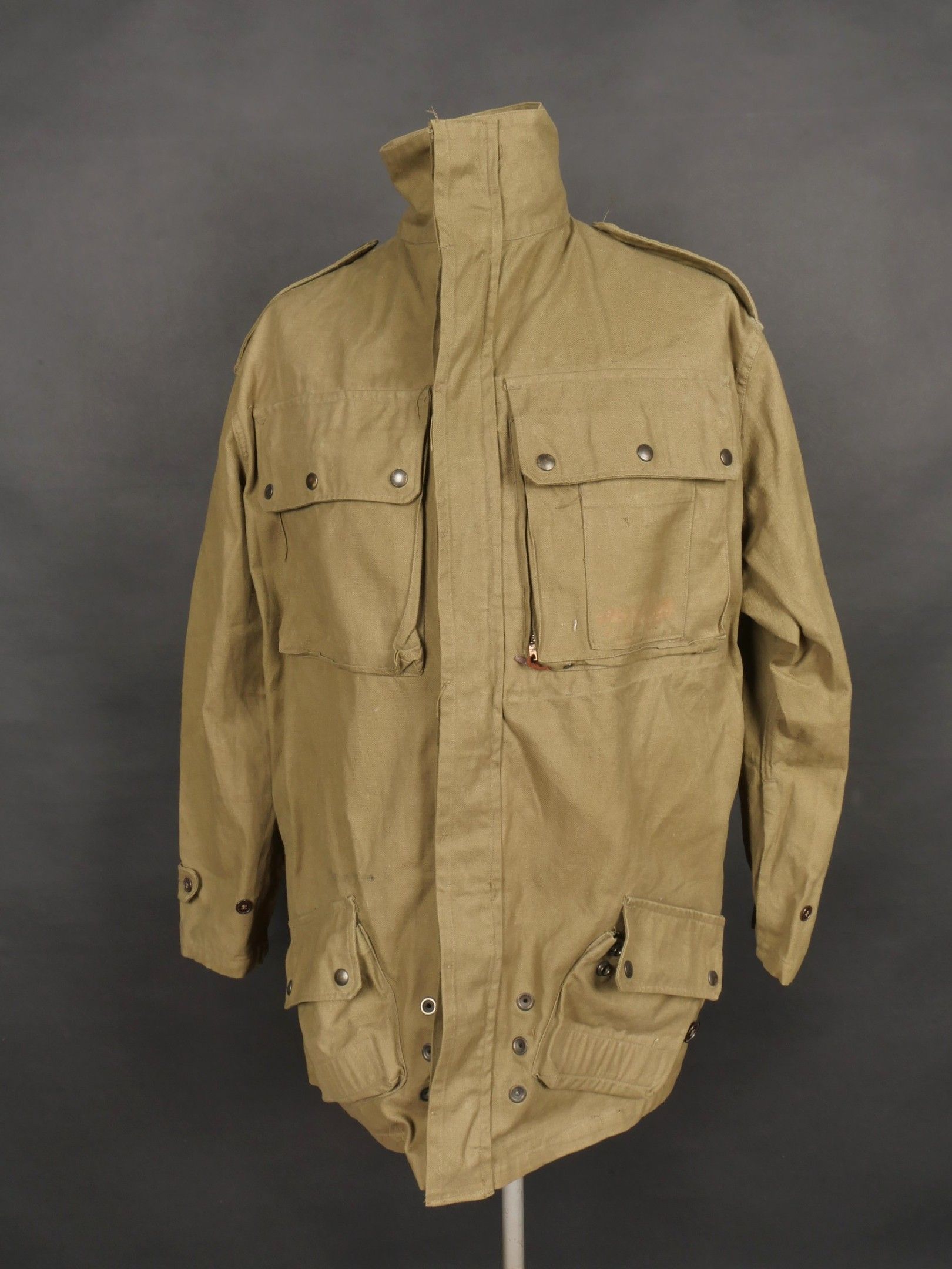 TAP 4751 khaki jacket. Khaki cotton jacket with eight buttons, one with a chip, functional zips, press studs and no original paint. All buttons are present as well as the original stitched beavertail. Size 1L and manufacturer stamp Scdtc, army stamp indicating year 1951 and received in 52. Khaki TAP 47 51 jacket. Cotton jacket closing with eight buttons one chipped functional zippers working original painted snaps all buttons present with original beaver tail. Size 1L maker Scdtc army stamp dated 1951 and accepted 1952.