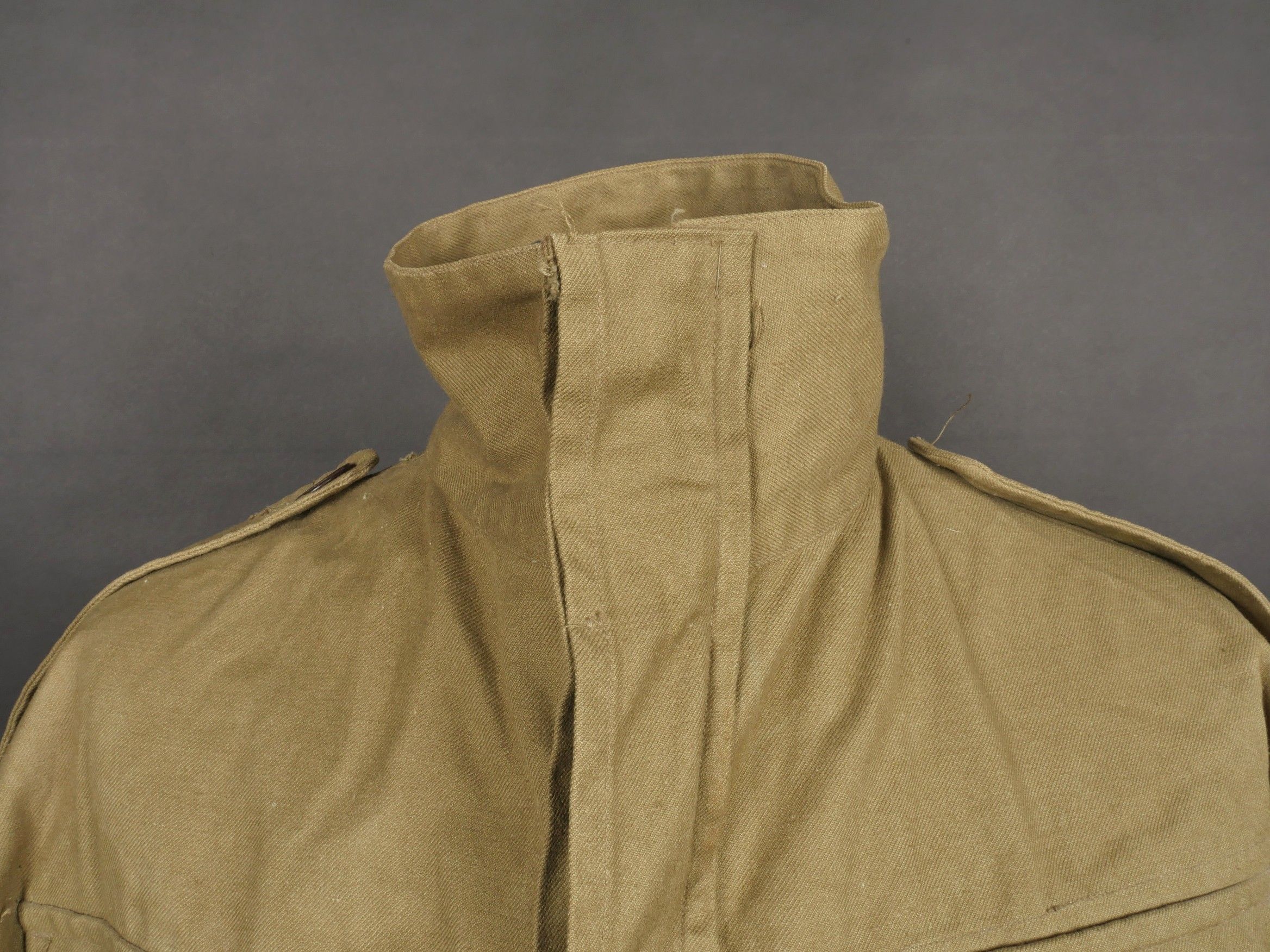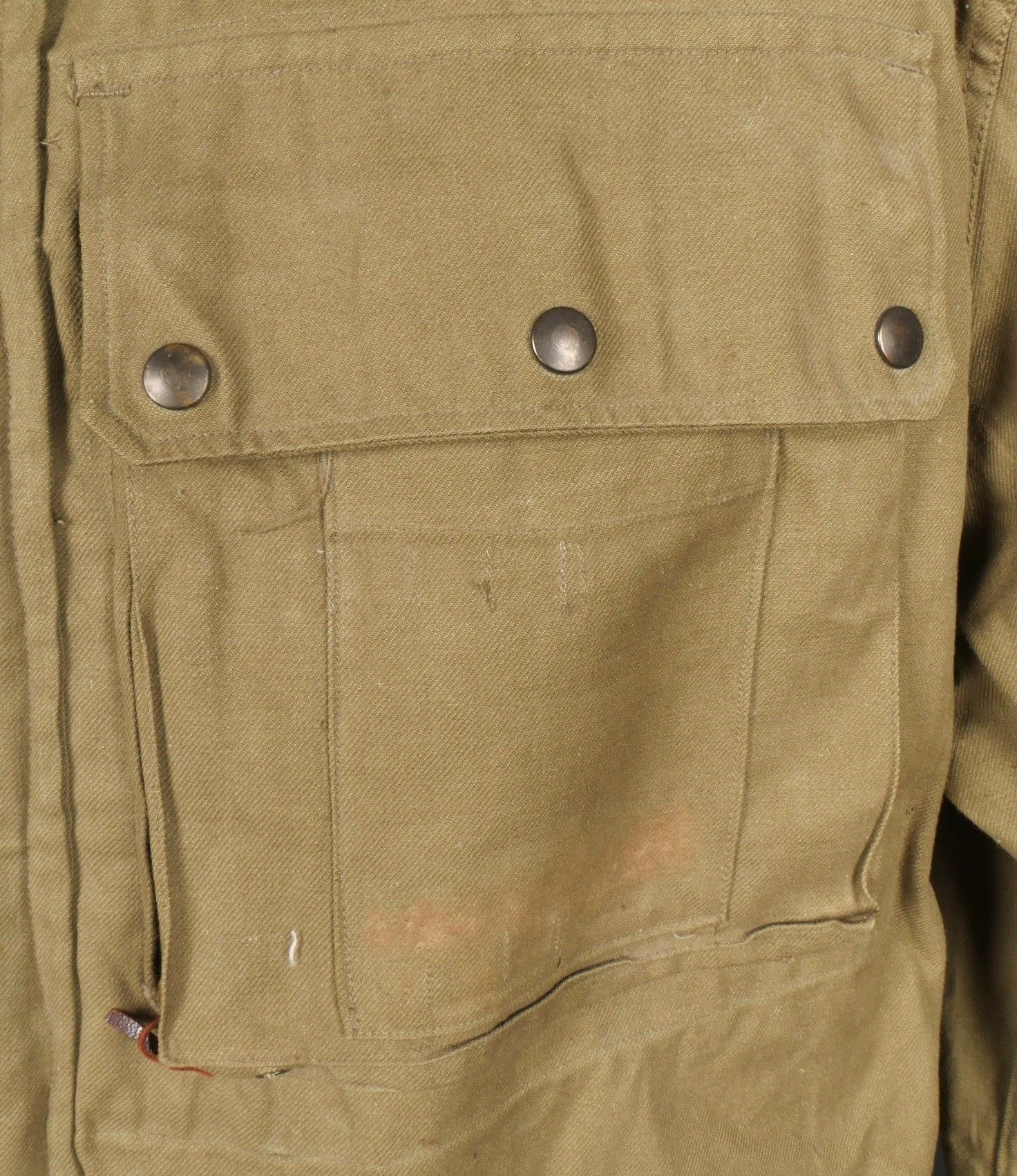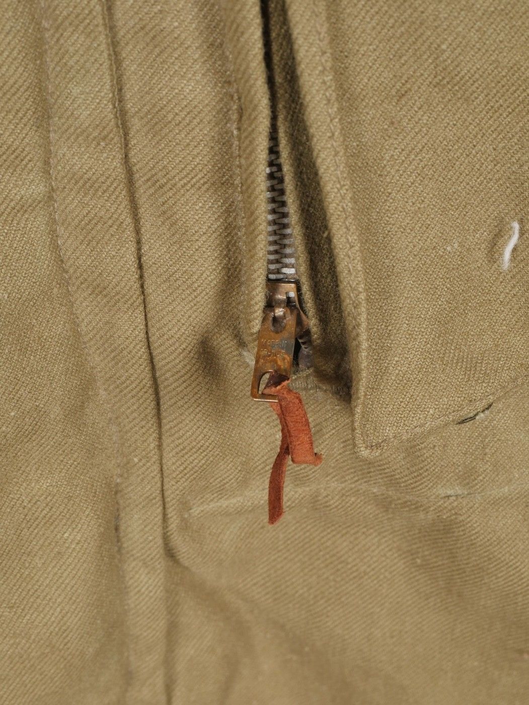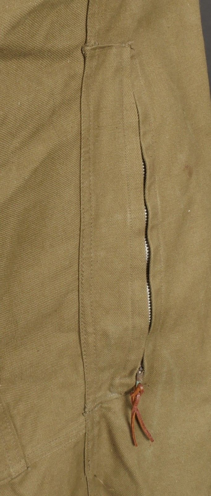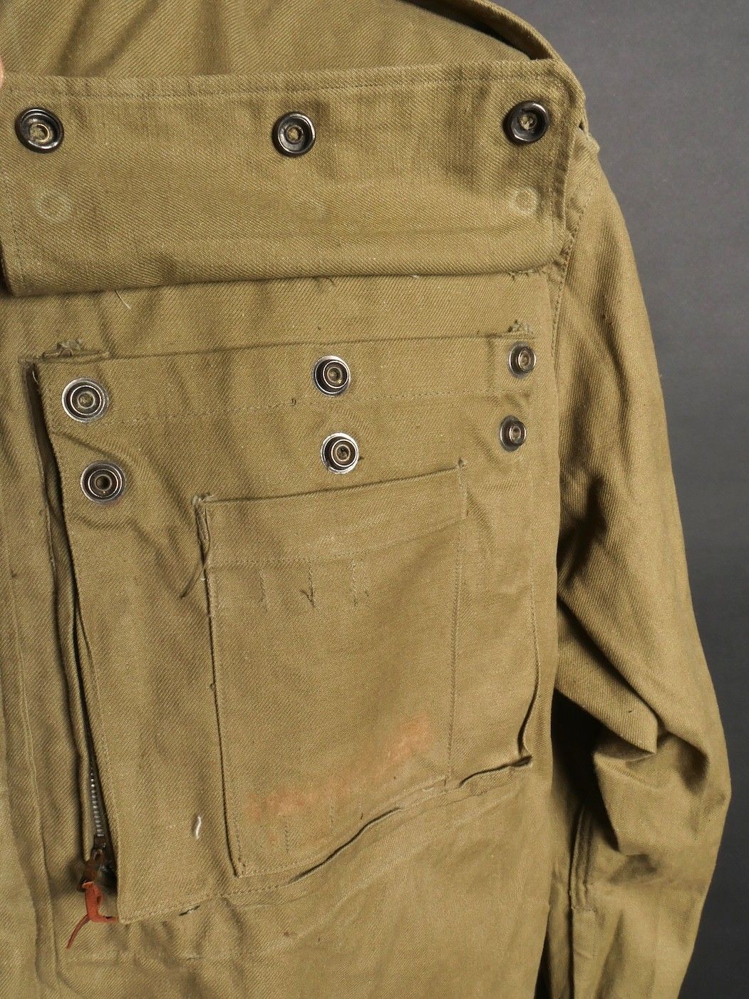 TAP 4751 khaki jacket. Khaki cotton jacket with eight buttons, one with a chip, functional zips, press studs and no original paint. All buttons are present as well as the original stitched beavertail. Size 1L and manufacturer stamp Scdtc, army stamp indicating year 1951 and received in 52. Khaki TAP 47 51 jacket. Cotton jacket closing with eight buttons one chipped functional zippers working original painted snaps all buttons present with original beaver tail. Size 1L maker Scdtc army stamp dated 1951 and accepted 1952.
