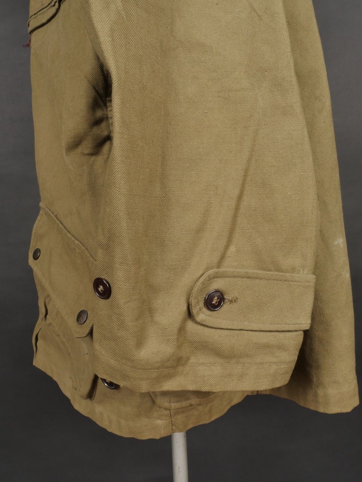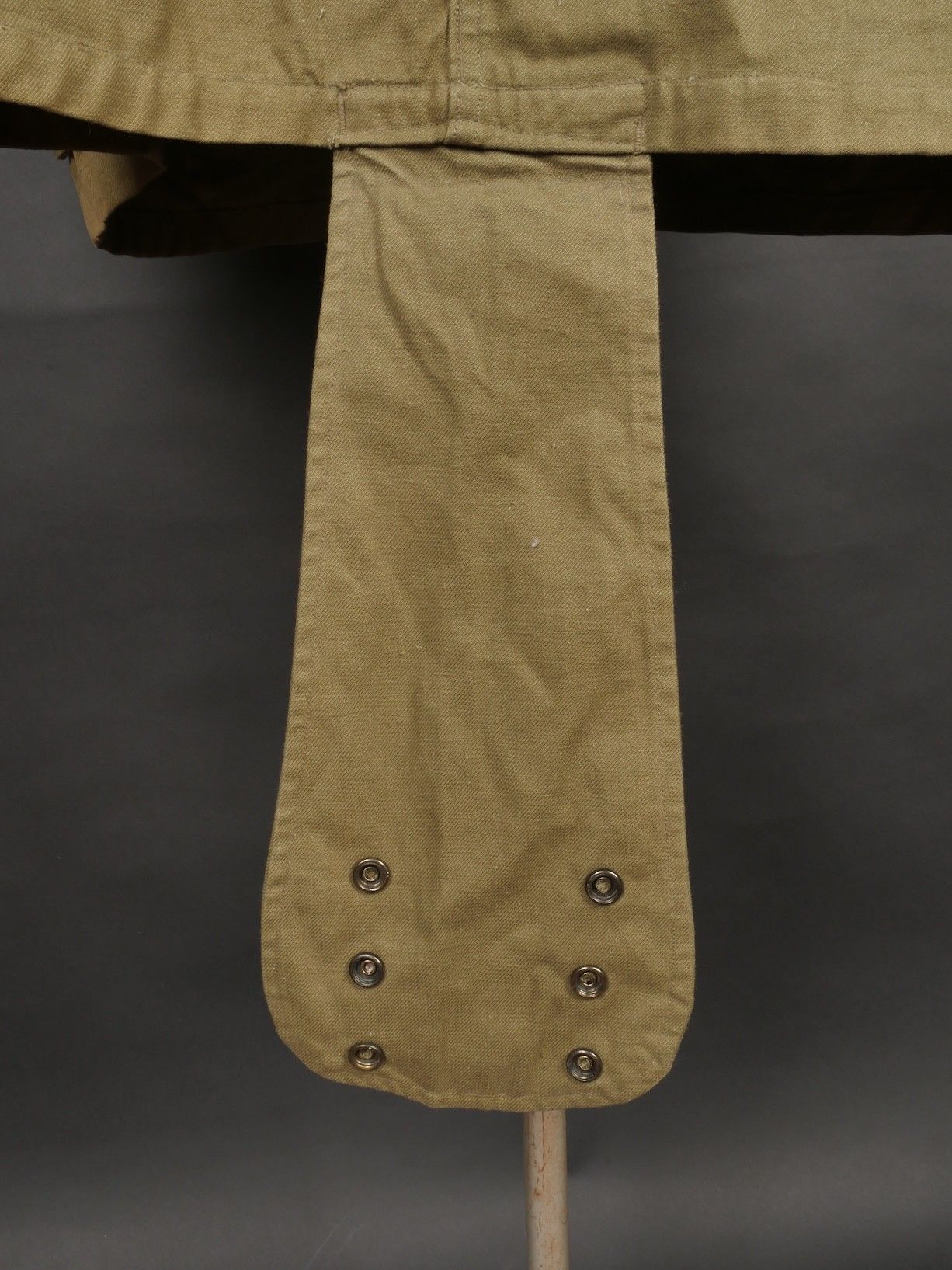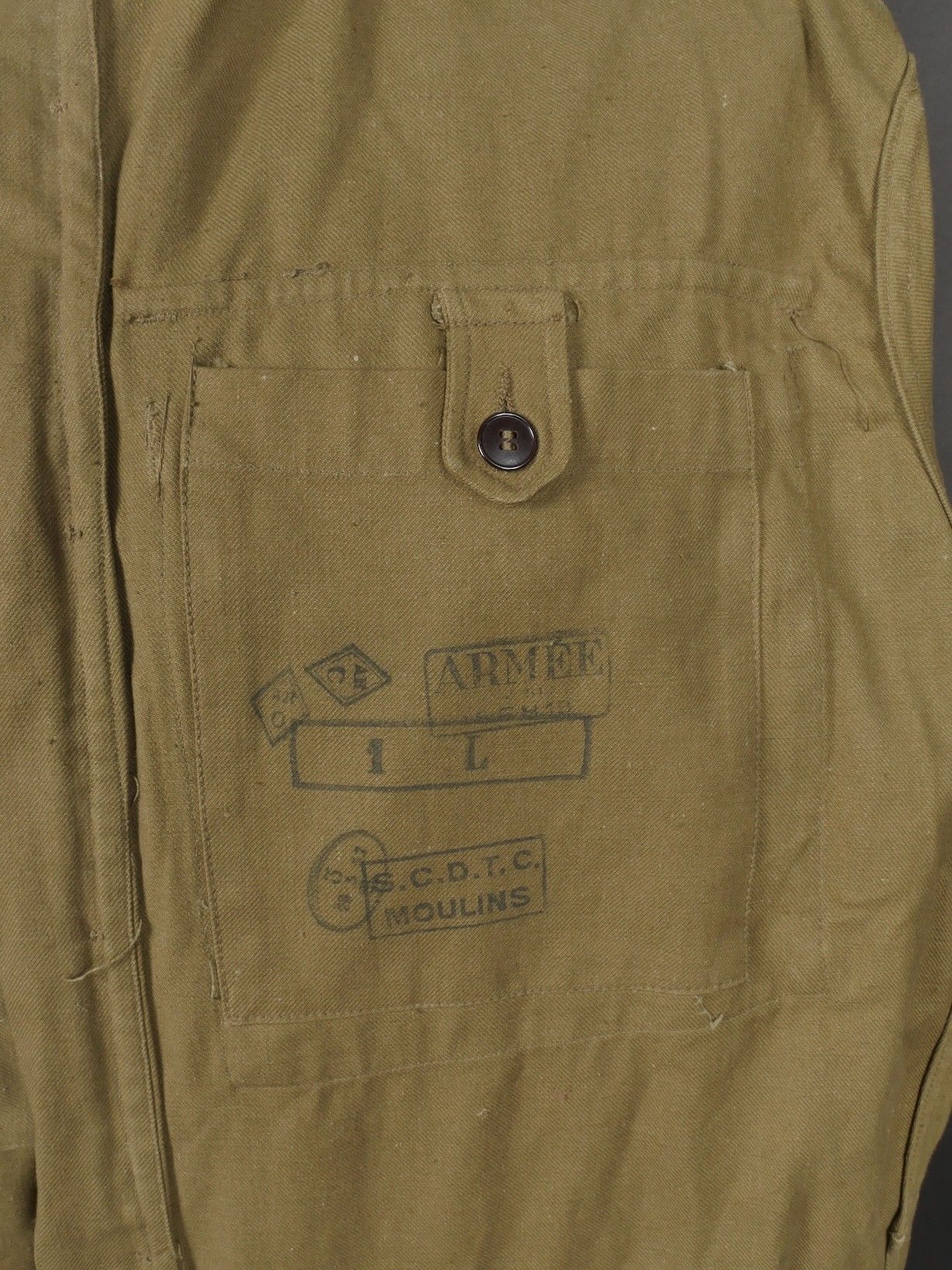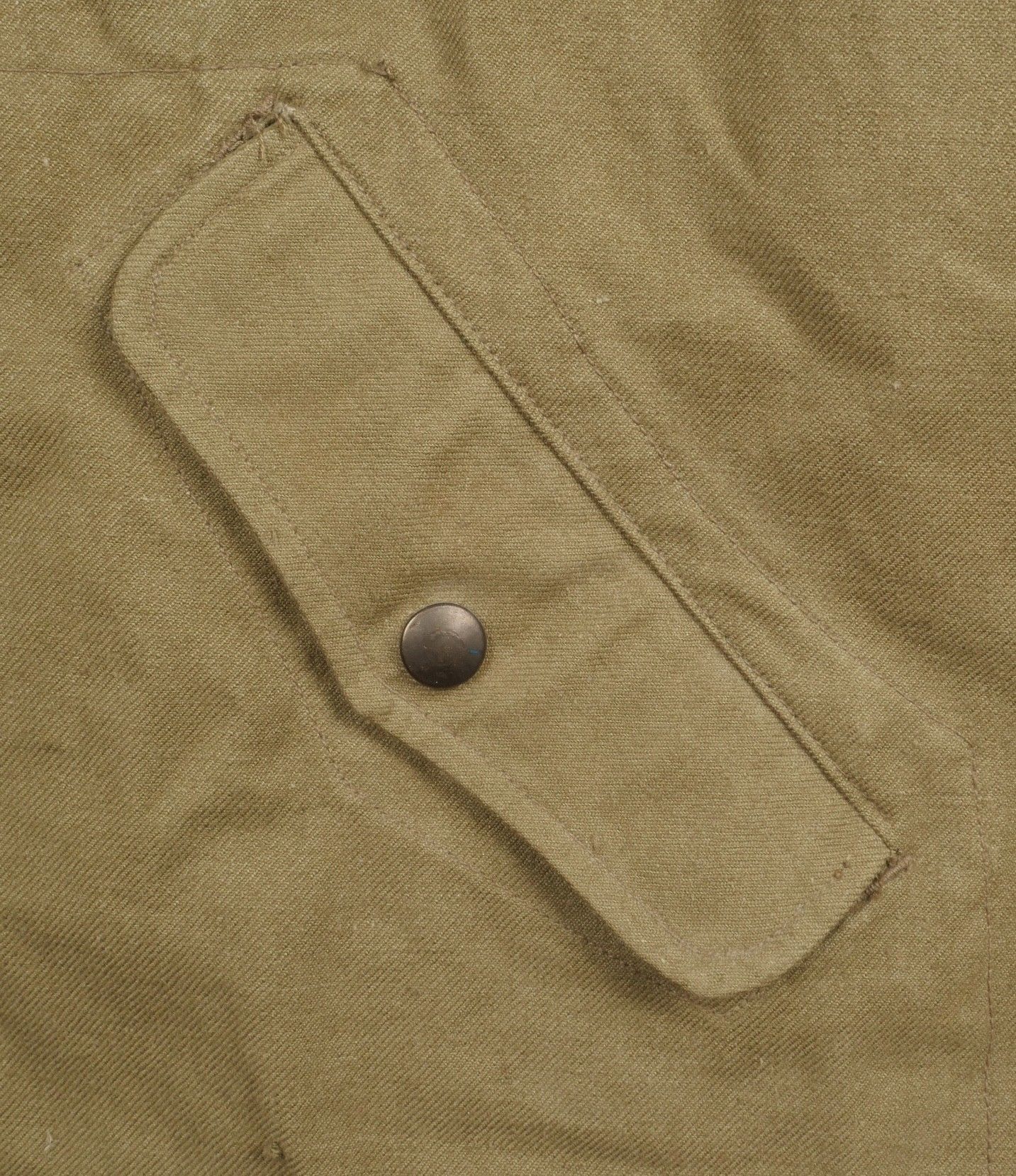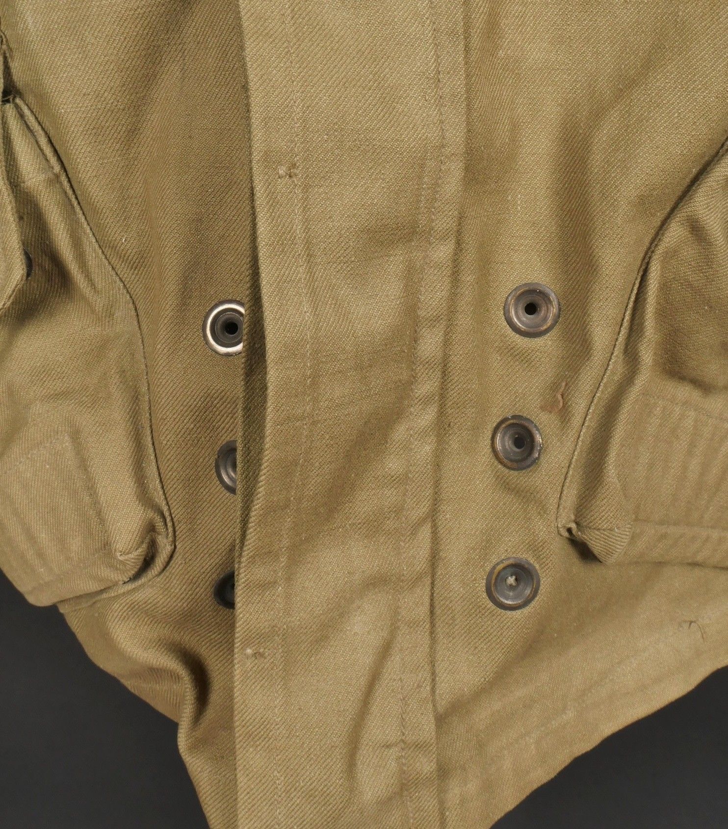TAP 4751 khaki jacket. Khaki cotton jacket with eight buttons, one with a chip, functional zips, press studs and no original paint. All buttons are present as well as the original stitched beavertail. Size 1L and manufacturer stamp Scdtc, army stamp indicating year 1951 and received in 52. Khaki TAP 47 51 jacket. Cotton jacket closing with eight buttons one chipped functional zippers working original painted snaps all buttons present with original beaver tail. Size 1L maker Scdtc army stamp dated 1951 and accepted 1952.