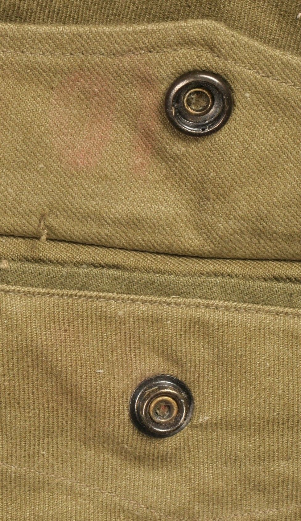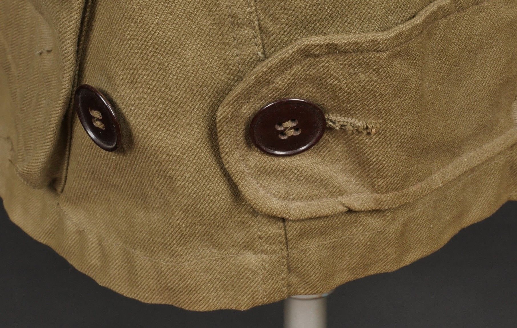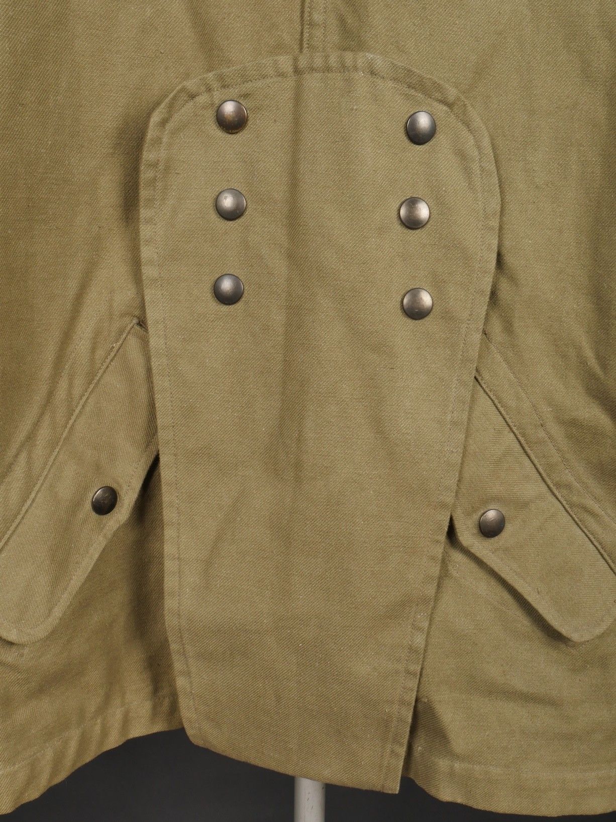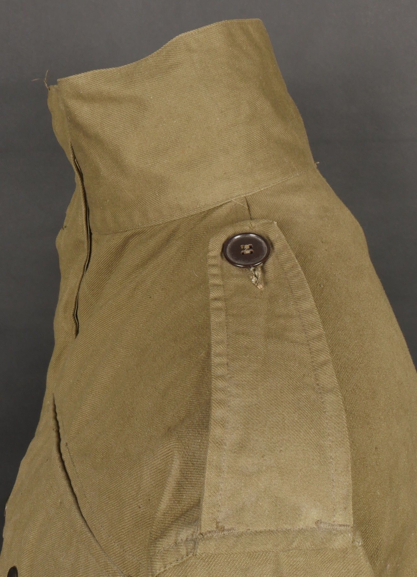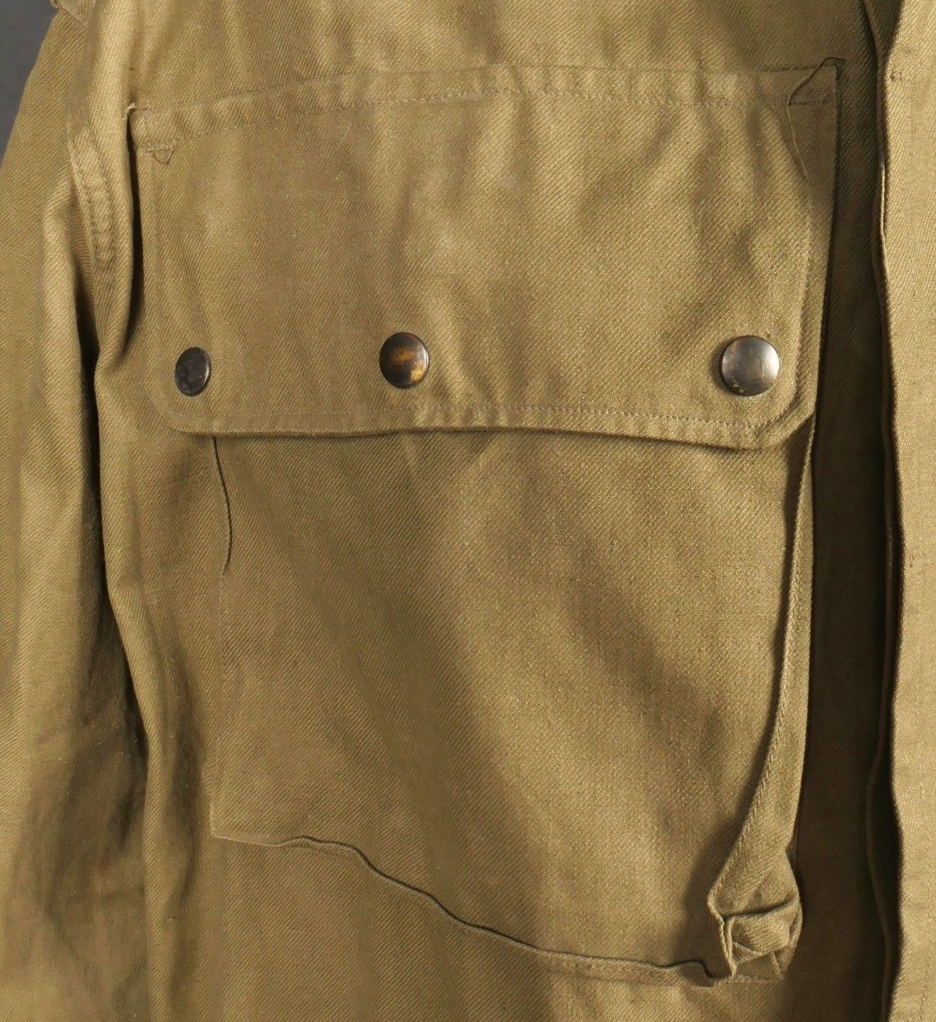 TAP 4751 khaki jacket. Khaki cotton jacket with eight buttons, one with a chip, functional zips, press studs and no original paint. All buttons are present as well as the original stitched beavertail. Size 1L and manufacturer stamp Scdtc, army stamp indicating year 1951 and received in 52. Khaki TAP 47 51 jacket. Cotton jacket closing with eight buttons one chipped functional zippers working original painted snaps all buttons present with original beaver tail. Size 1L maker Scdtc army stamp dated 1951 and accepted 1952.