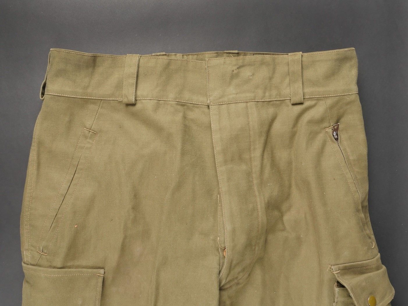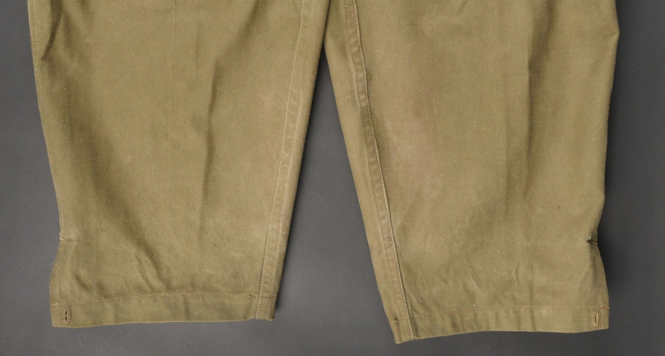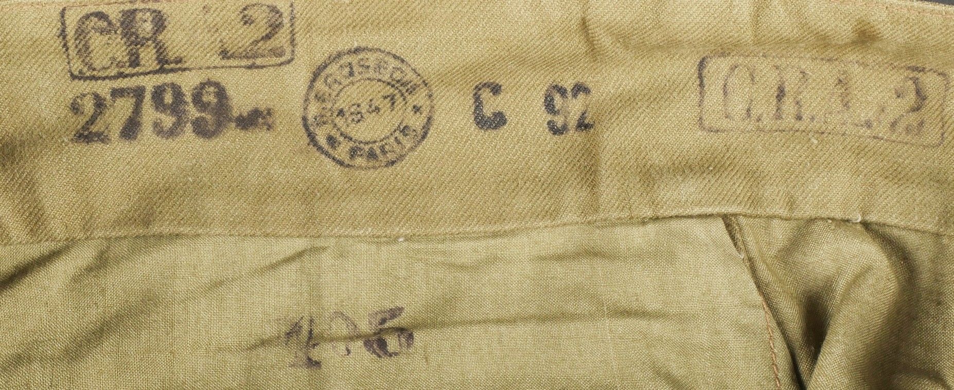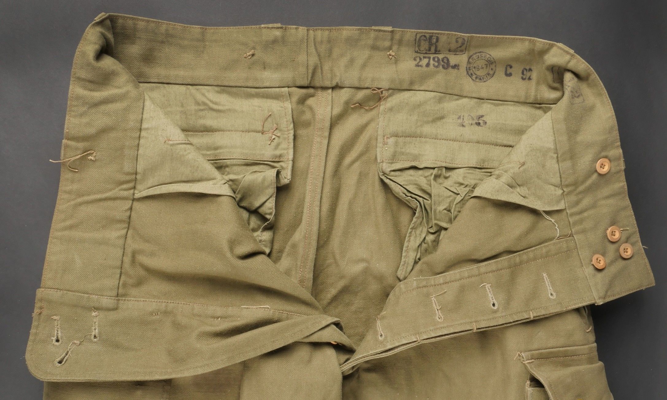 Nice pair of TAP 47 trousers made in khaki canvas, small model press studs functional, in original paint, zip branded Eclair. Stamps of a Parisian manufacturer as well as the date 1947. Stamp of unit of the CRA 2 2nd Company of Supply by Air. Size stamp C92. All original buttons are present except for one on the fly. Laces at the bottom of the legs are missing. Very little wear. Fine TAP 47 trousers khaki canvas small model snaps functional with original paint Eclair zipper Parisian maker stamp dated 1947. Unit stamp CRA 2 2nd Air Supply Company. Size stamp C92. All original buttons present except one on fly. Ankle drawcords missing. Very lightly worn example.