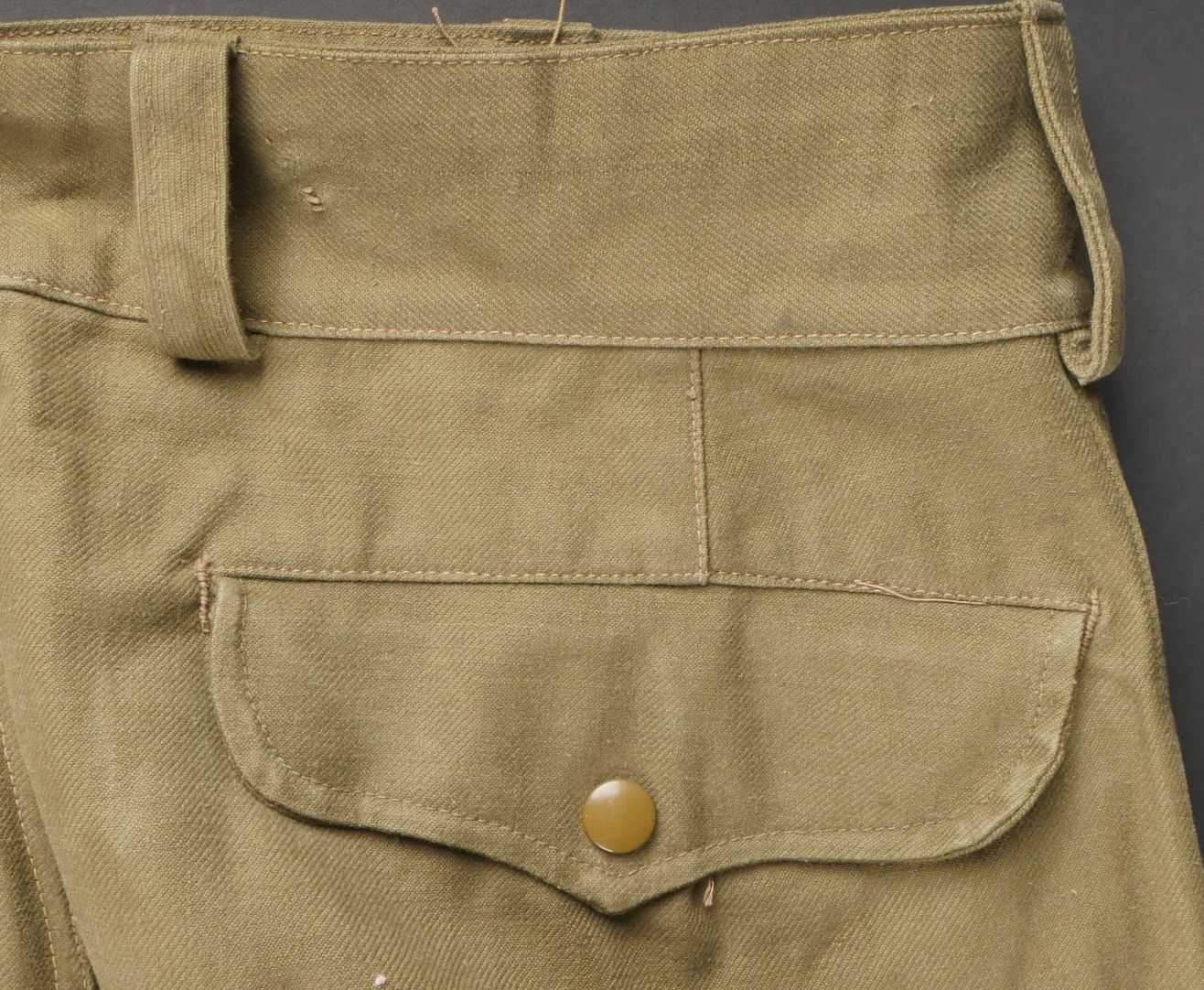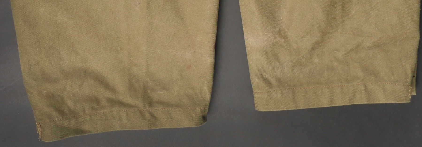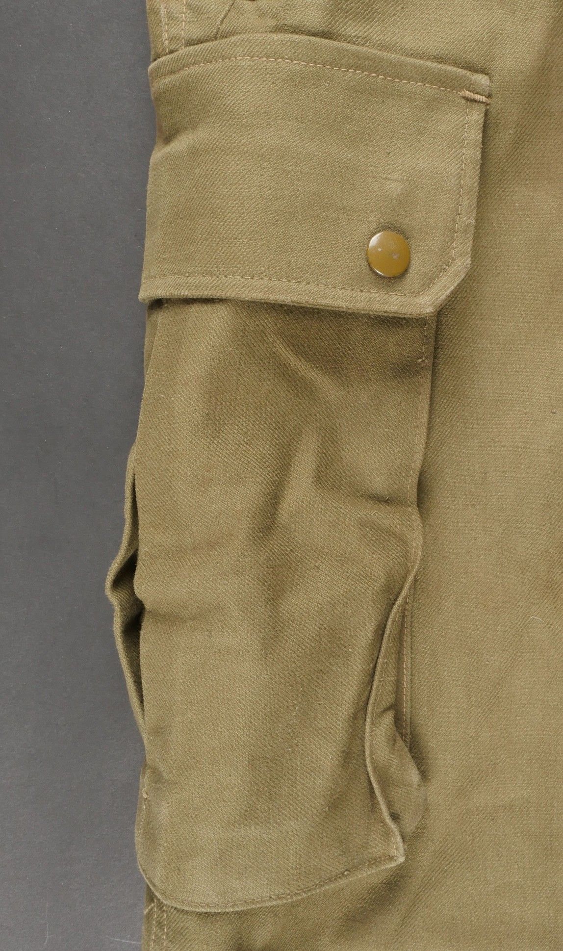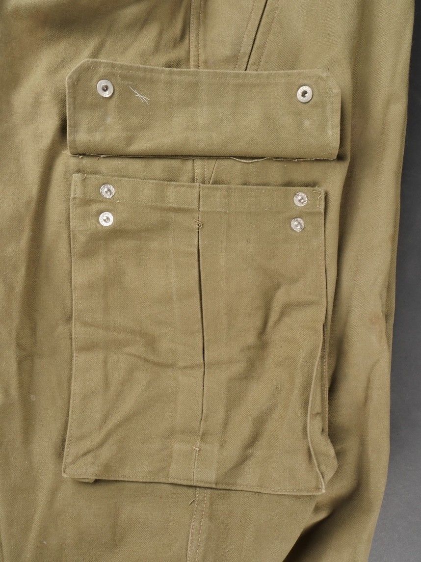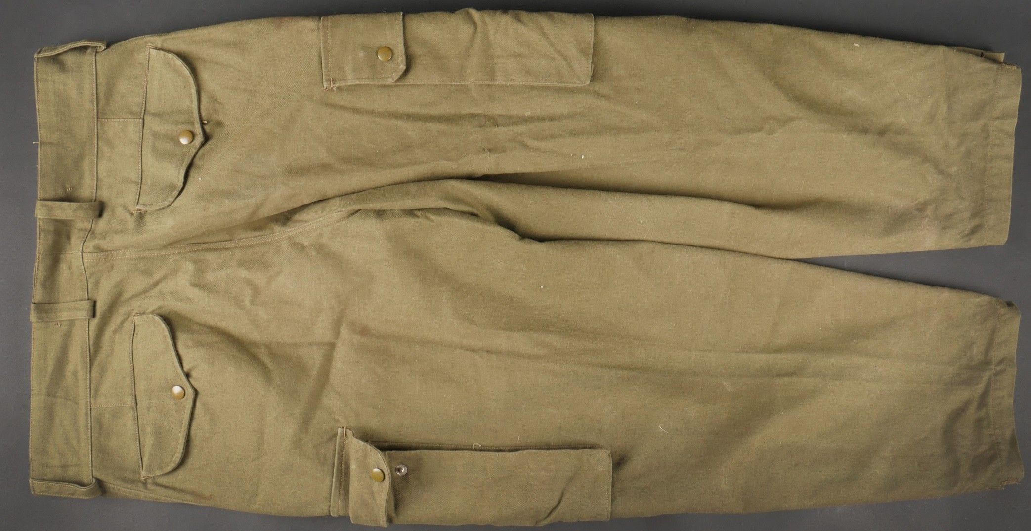 Nice pair of TAP 47 trousers made in khaki canvas, small model press studs functional, in original paint, zip branded Eclair. Stamps of a Parisian manufacturer as well as the date 1947. Stamp of unit of the CRA 2 2nd Company of Supply by Air. Size stamp C92. All original buttons are present except for one on the fly. Laces at the bottom of the legs are missing. Very little wear. Fine TAP 47 trousers khaki canvas small model snaps functional with original paint Eclair zipper Parisian maker stamp dated 1947. Unit stamp CRA 2 2nd Air Supply Company. Size stamp C92. All original buttons present except one on fly. Ankle drawcords missing. Very lightly worn example.