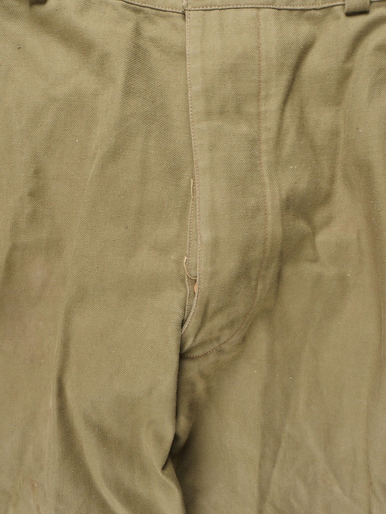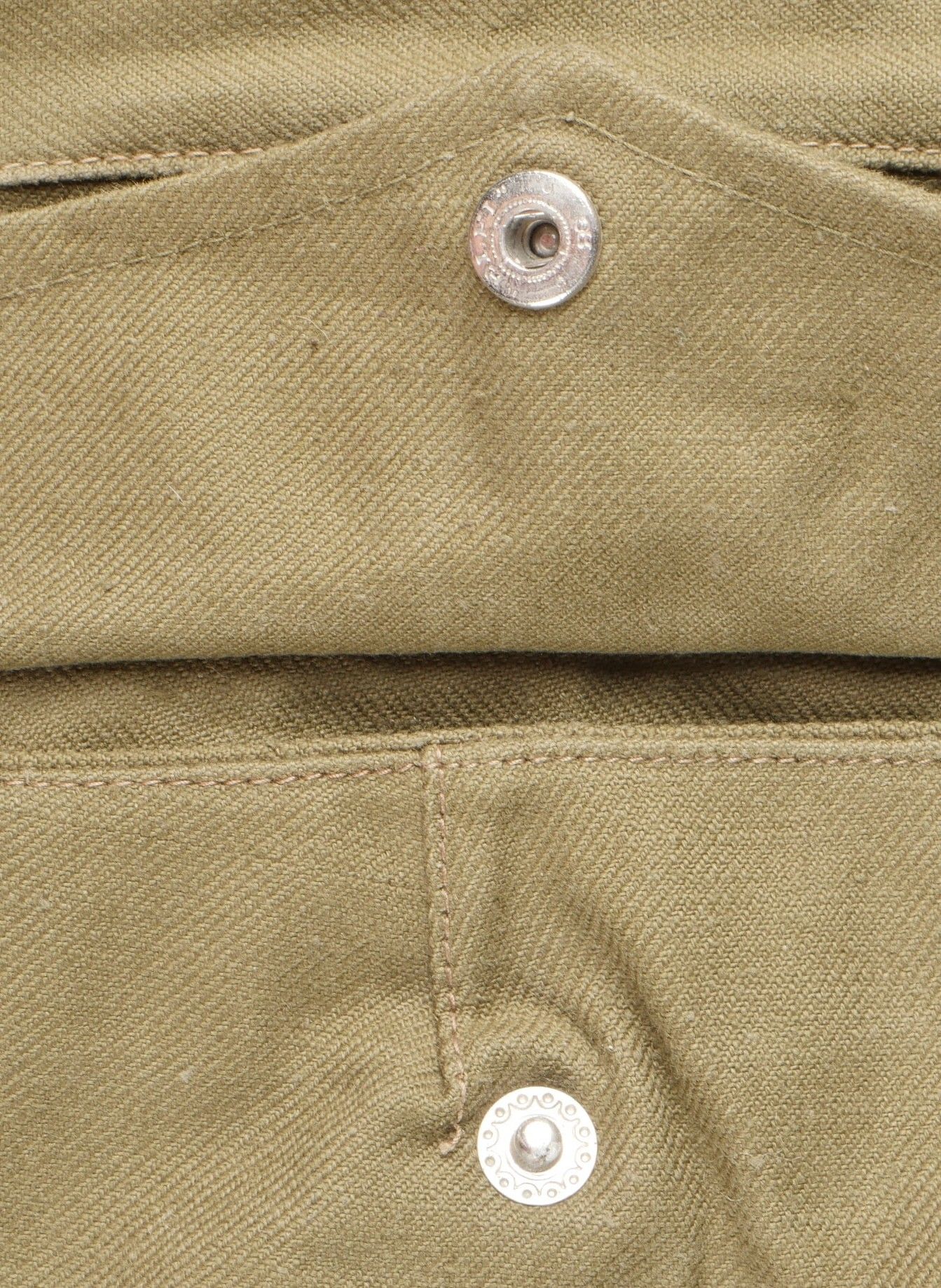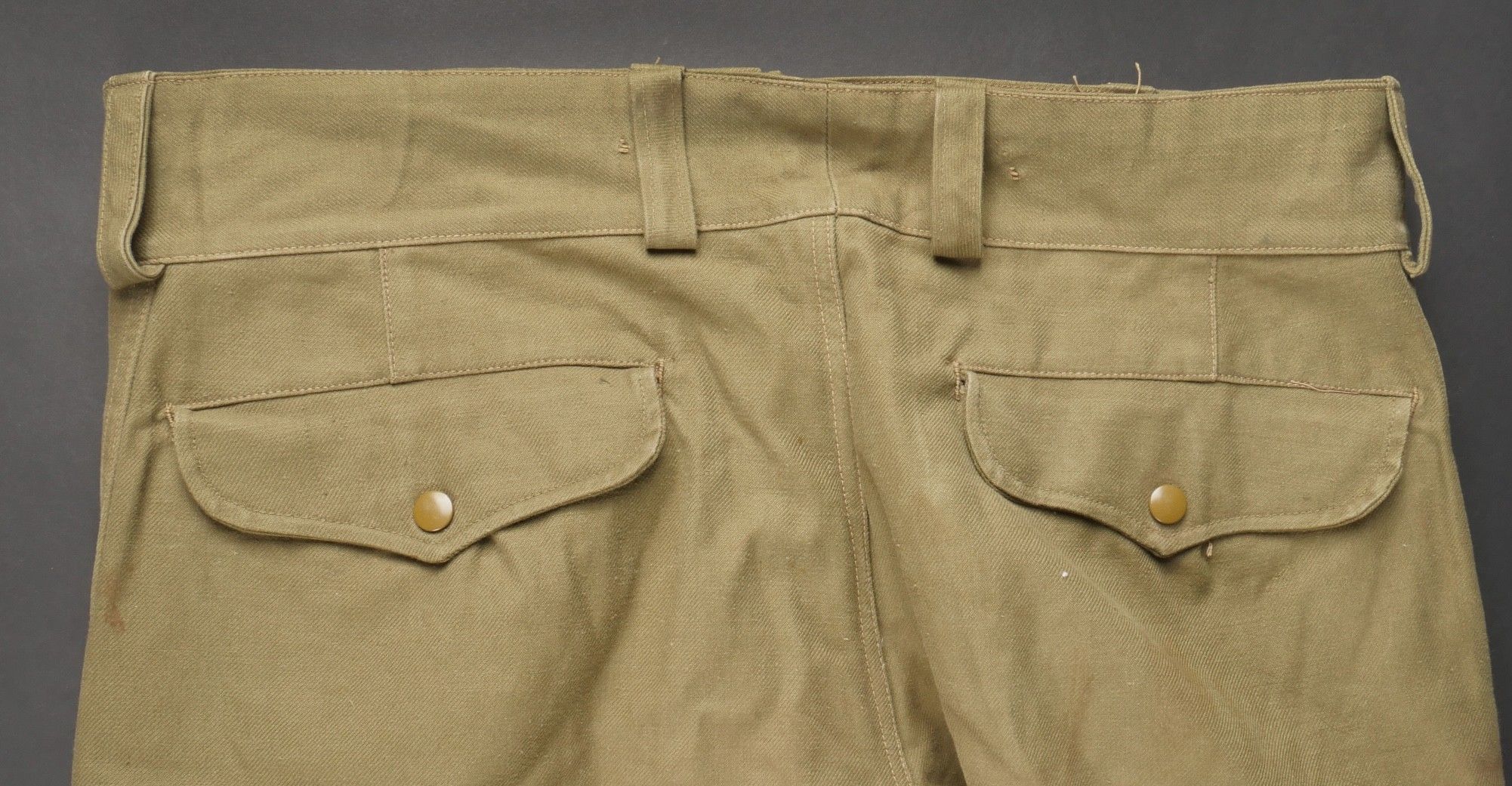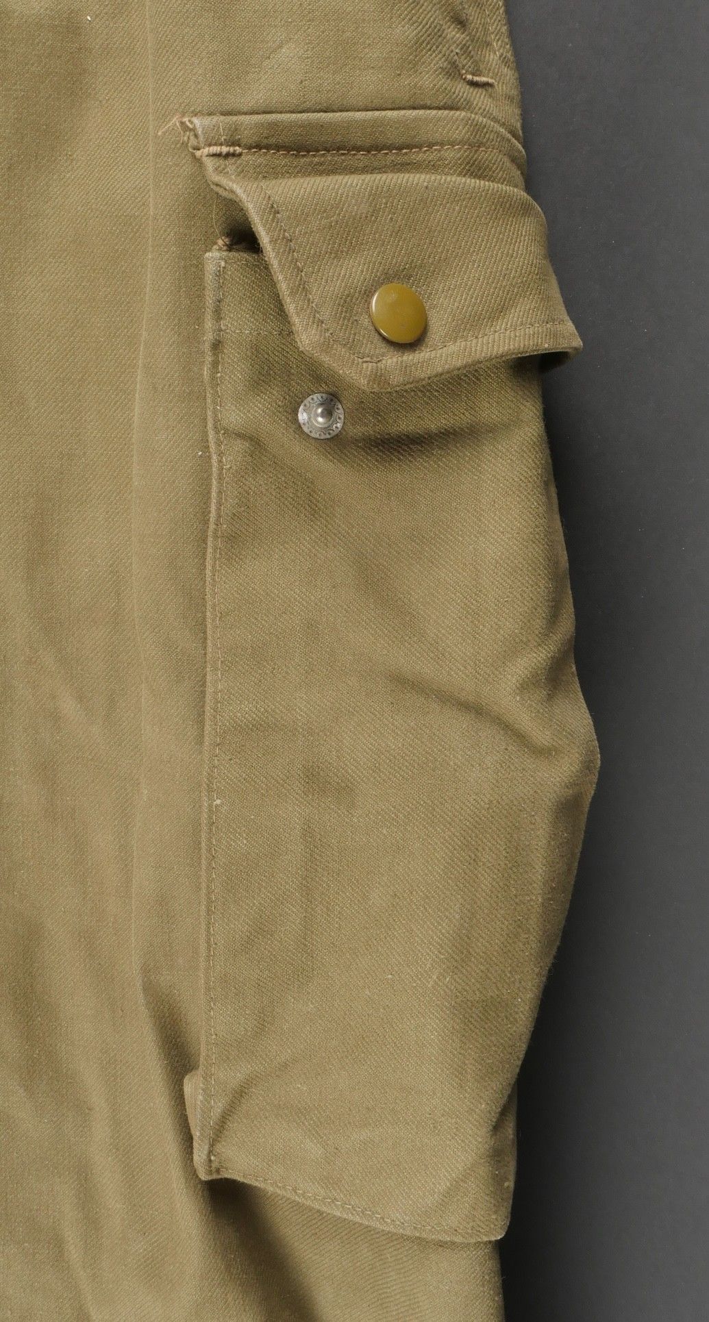 Nice pair of TAP 47 trousers made in khaki canvas, small model press studs functional, in original paint, zip branded Eclair. Stamps of a Parisian manufacturer as well as the date 1947. Stamp of unit of the CRA 2 2nd Company of Supply by Air. Size stamp C92. All original buttons are present except for one on the fly. Laces at the bottom of the legs are missing. Very little wear. Fine TAP 47 trousers khaki canvas small model snaps functional with original paint Eclair zipper Parisian maker stamp dated 1947. Unit stamp CRA 2 2nd Air Supply Company. Size stamp C92. All original buttons present except one on fly. Ankle drawcords missing. Very lightly worn example.