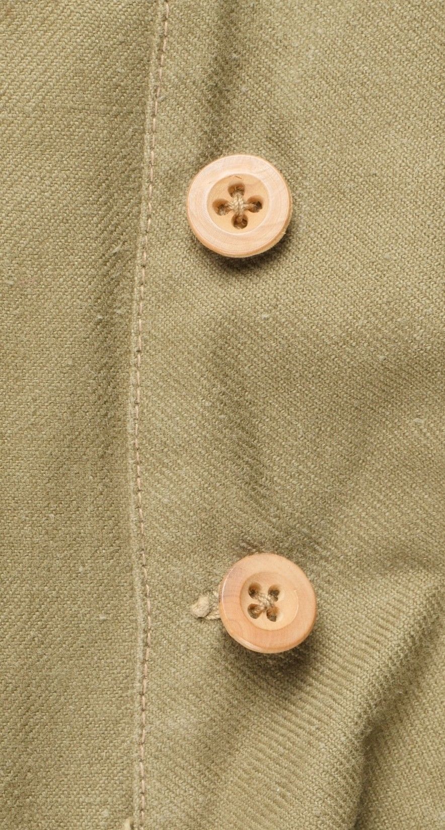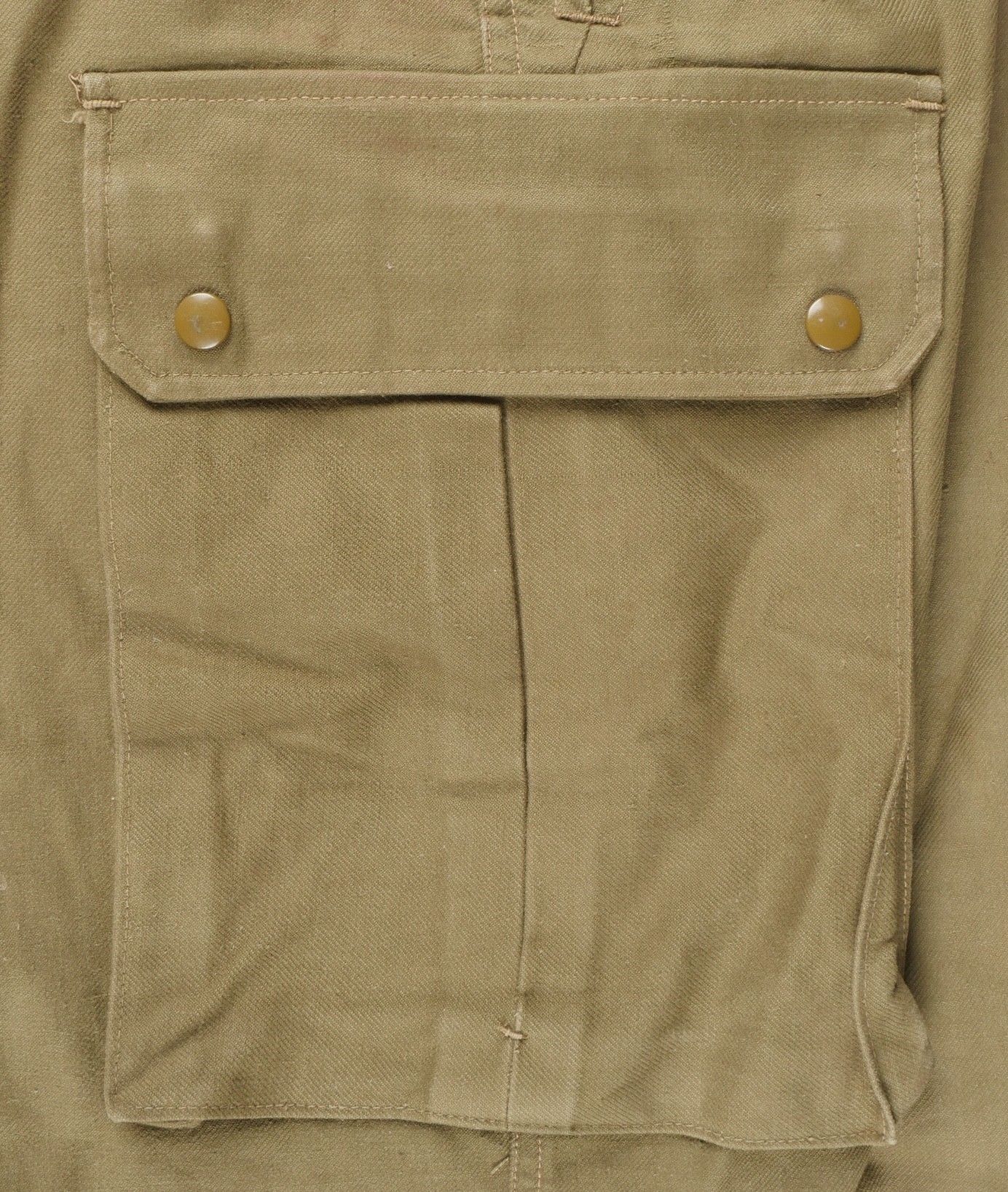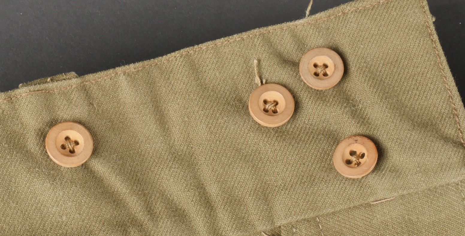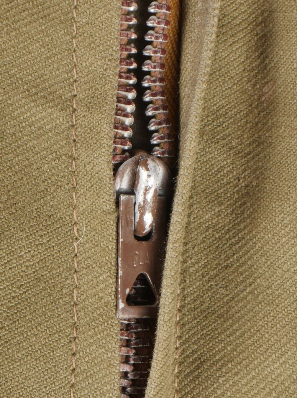 Nice pair of TAP 47 trousers made in khaki canvas, small model press studs functional, in original paint, zip branded Eclair. Stamps of a Parisian manufacturer as well as the date 1947. Stamp of unit of the CRA 2 2nd Company of Supply by Air. Size stamp C92. All original buttons are present except for one on the fly. Laces at the bottom of the legs are missing. Very little wear. Fine TAP 47 trousers khaki canvas small model snaps functional with original paint Eclair zipper Parisian maker stamp dated 1947. Unit stamp CRA 2 2nd Air Supply Company. Size stamp C92. All original buttons present except one on fly. Ankle drawcords missing. Very lightly worn example.