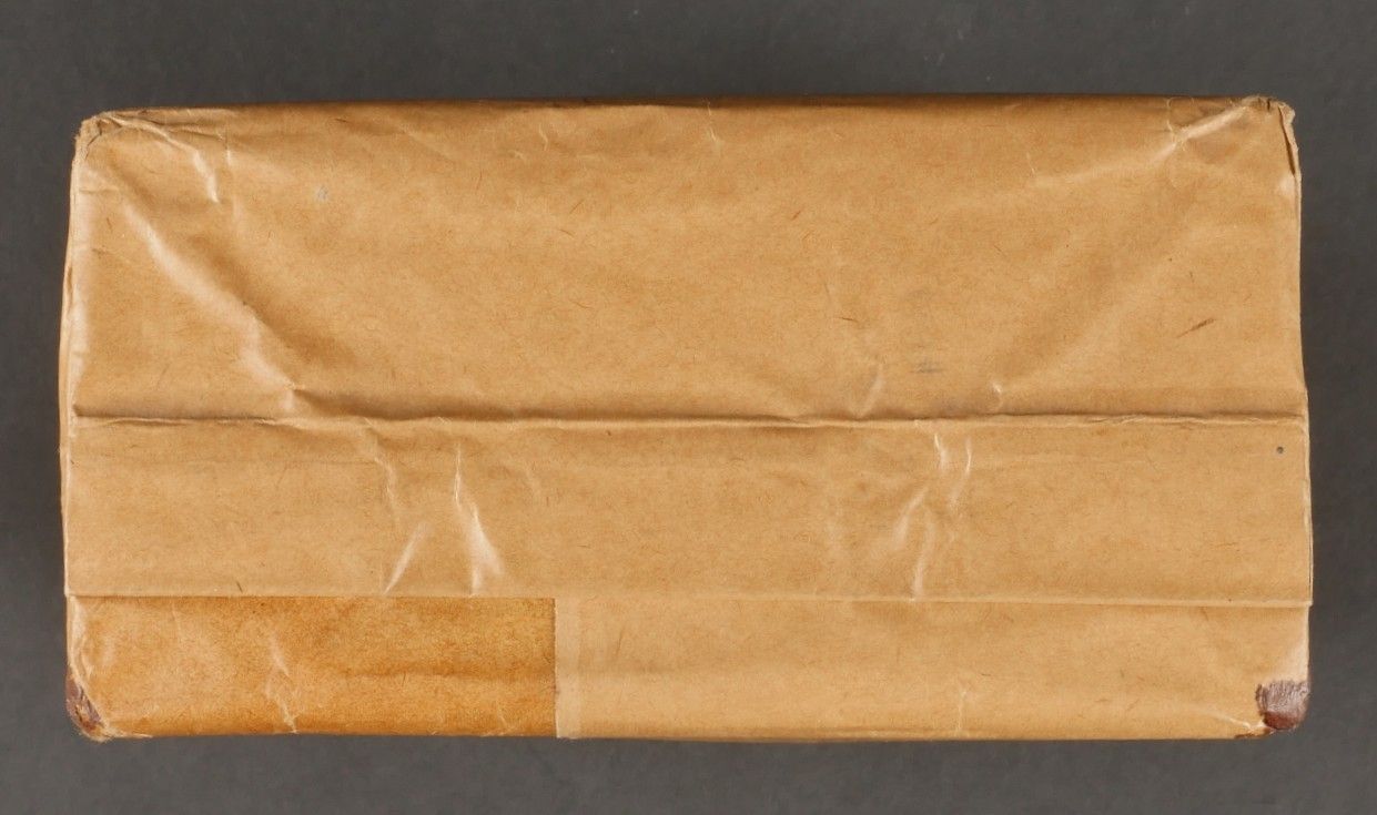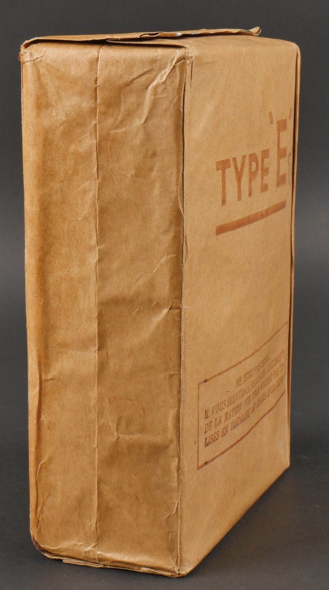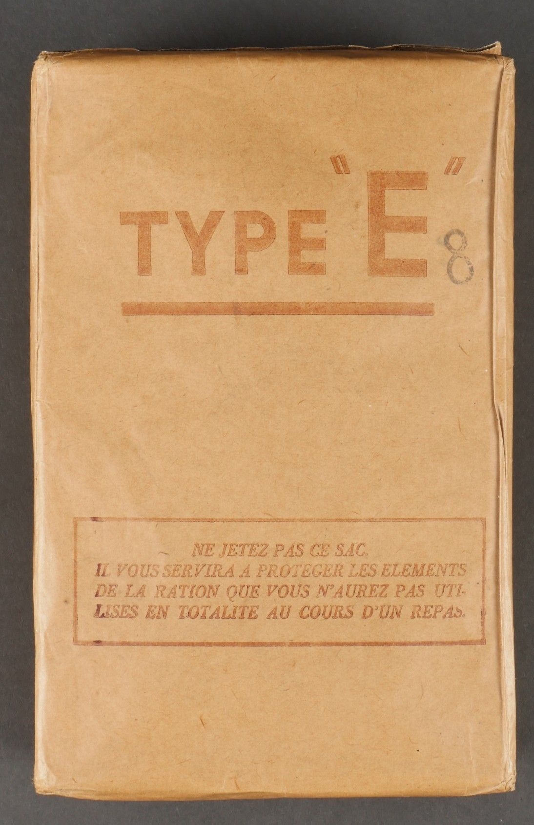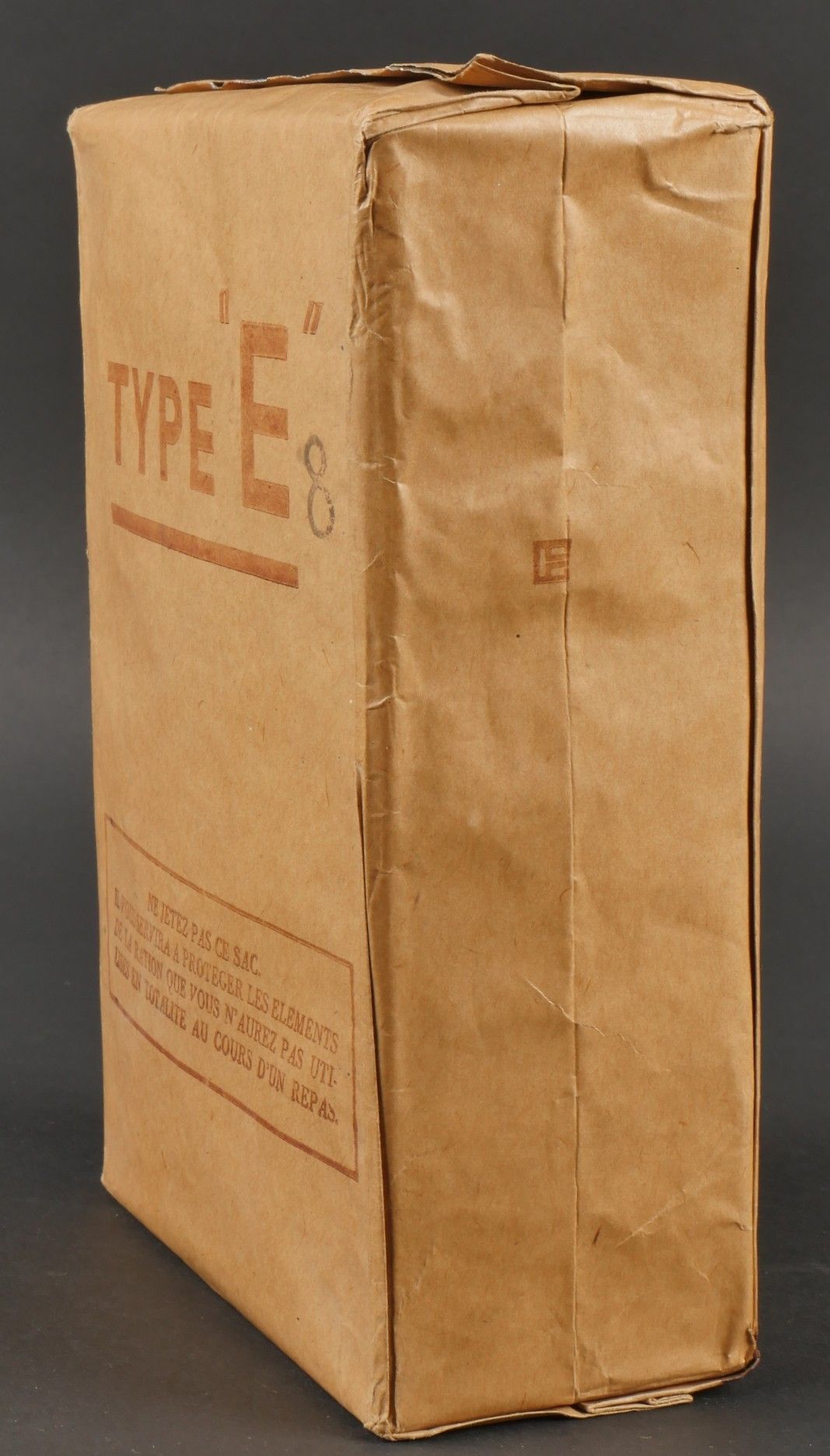 Full type E ration. European troop ration in its original cardboard packaging. On one side there is a note indicating that the bag should not be thrown away in order to protect the food consumed. Full type E ration. European troop ration with original cardboard box. One side bears instruction not to discard the bag to protect the food inside.