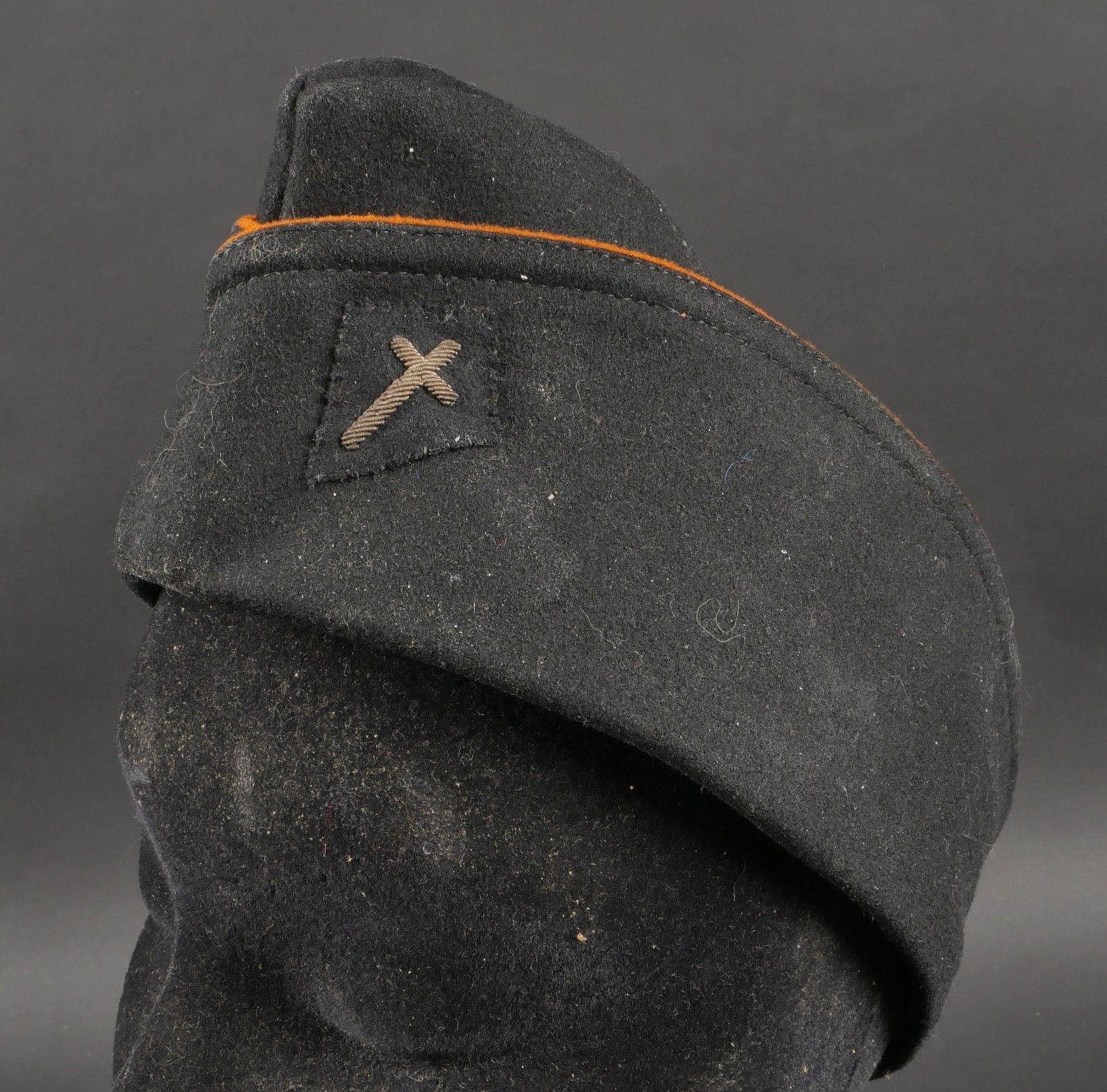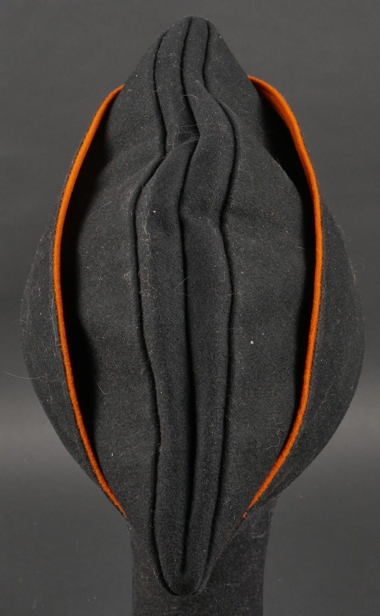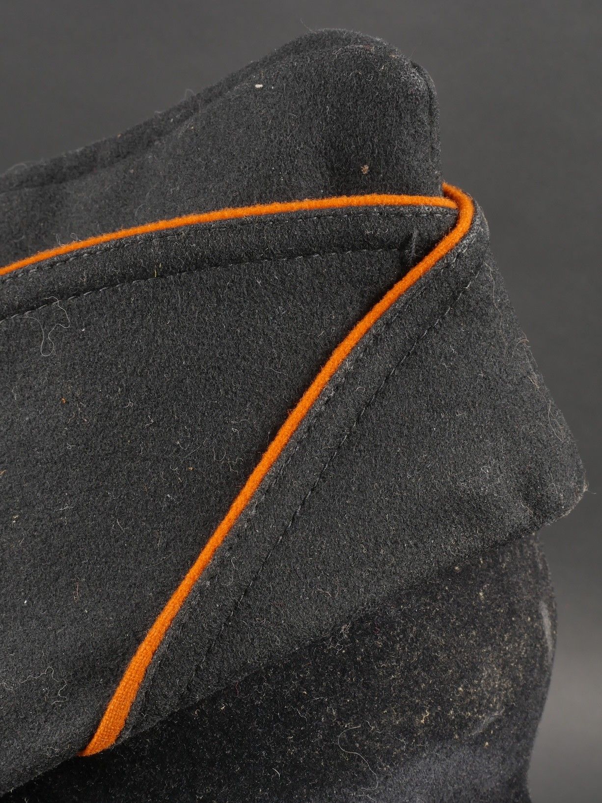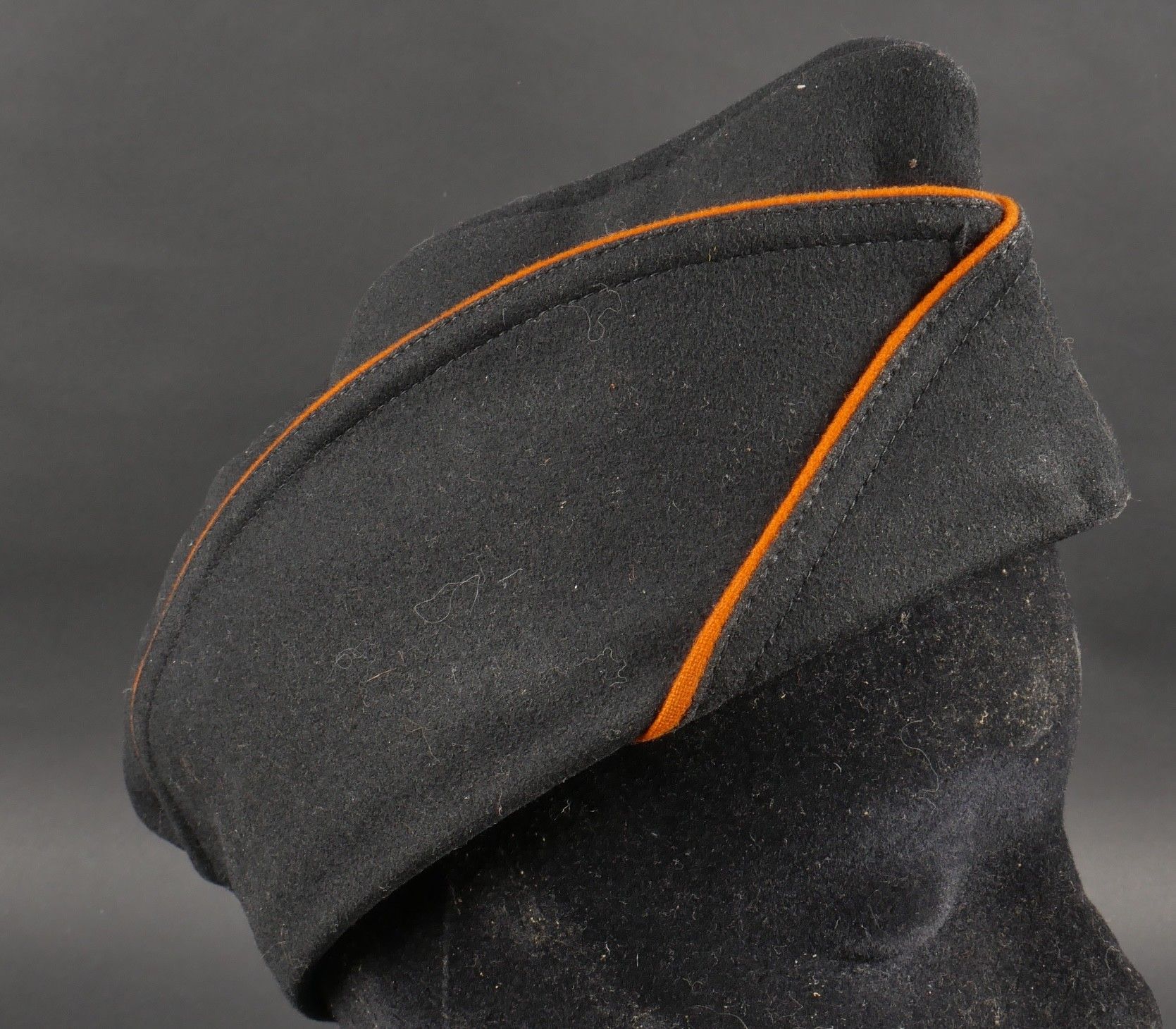 Police cap specific to military chaplains, made of black woollen cloth with orange piping. Inner band in fine black leather. Catholic cross embroidered in canetille on a lozenge of black cloth. This Police cap can be seen on page 124 in the book La tenue des Aumôniers de l'Armée de Terre de 1854 à 1964. Side cap specific to military chaplains made of black wool cloth with orange piping. Inner band in fine black leather. Catholic cross embroidered in gold bullion on a black cloth diamond patch. This side cap is illustrated on page 124 of La tenue des Aumôniers de l'Armée de Terre de 1854 à 1964.
