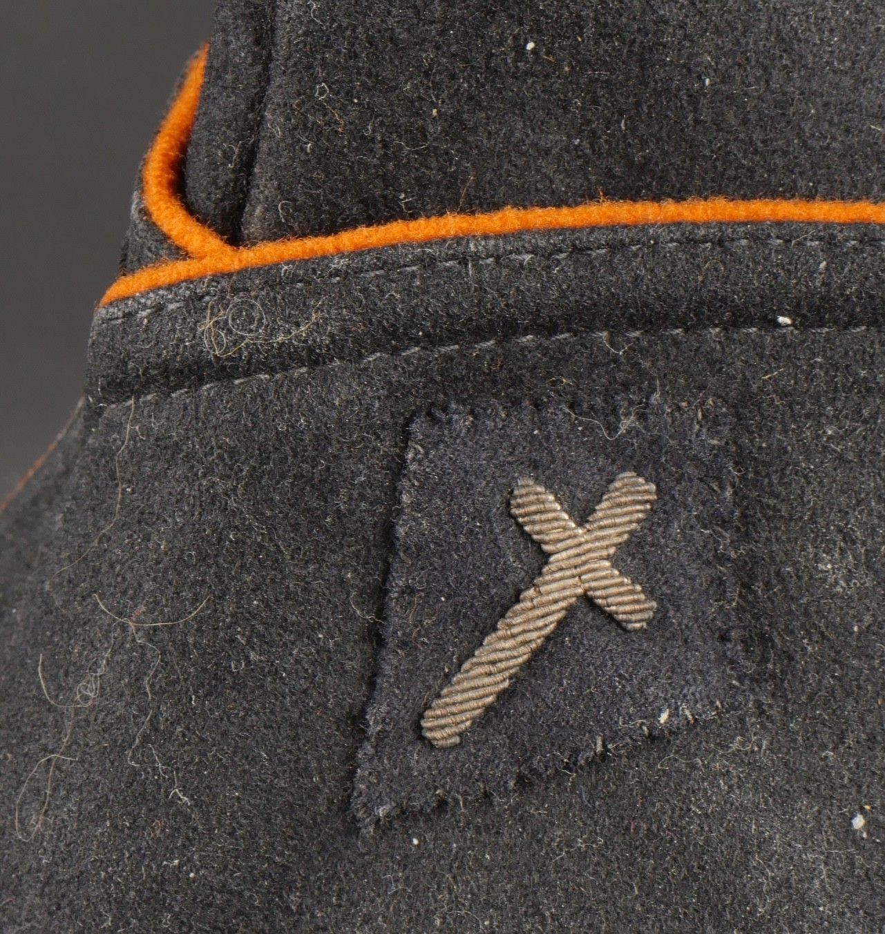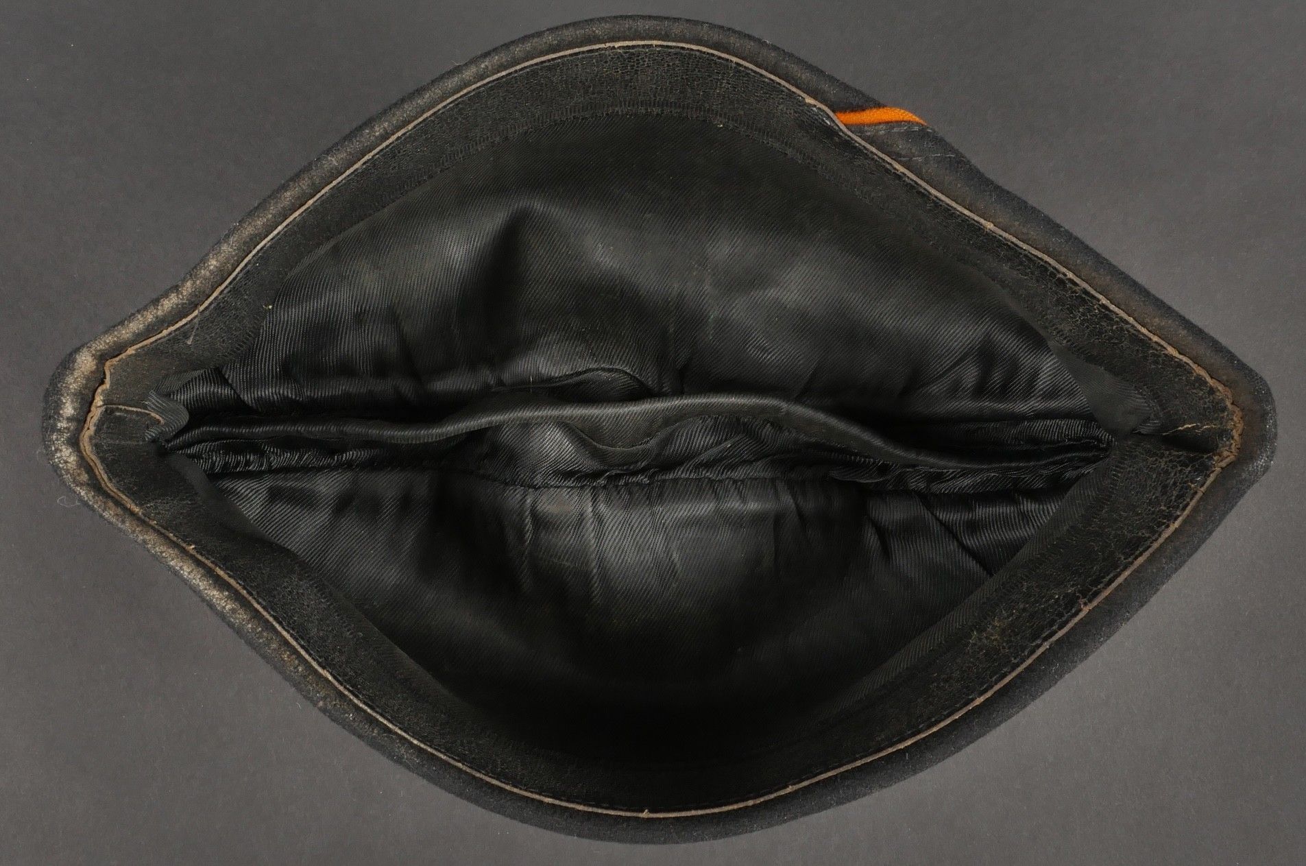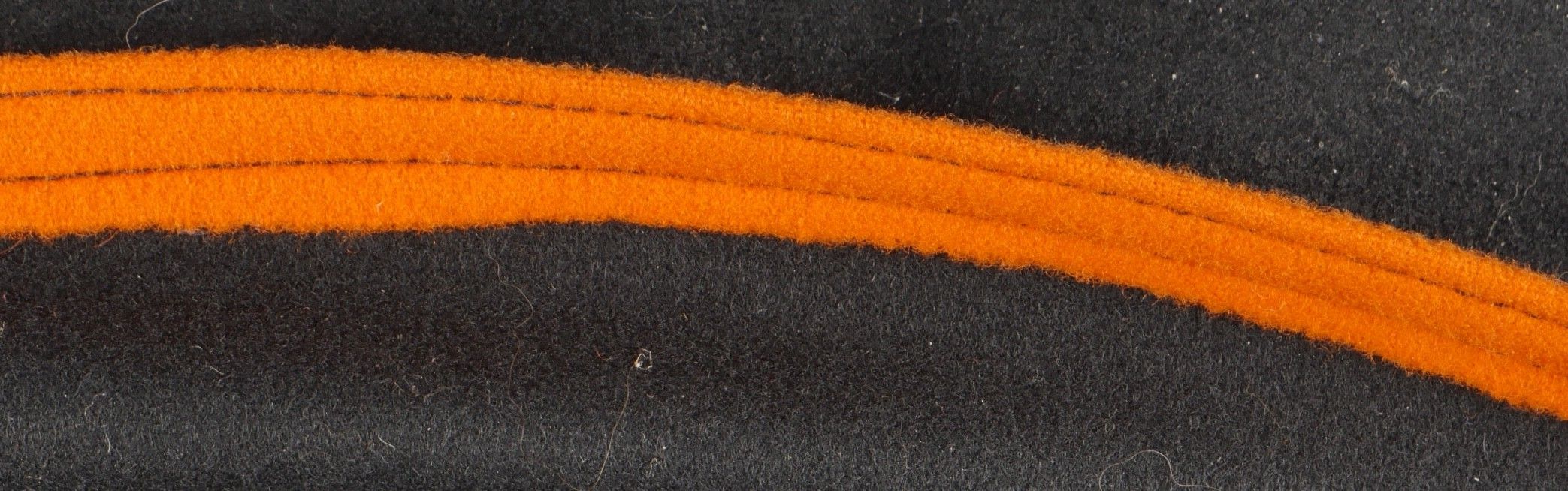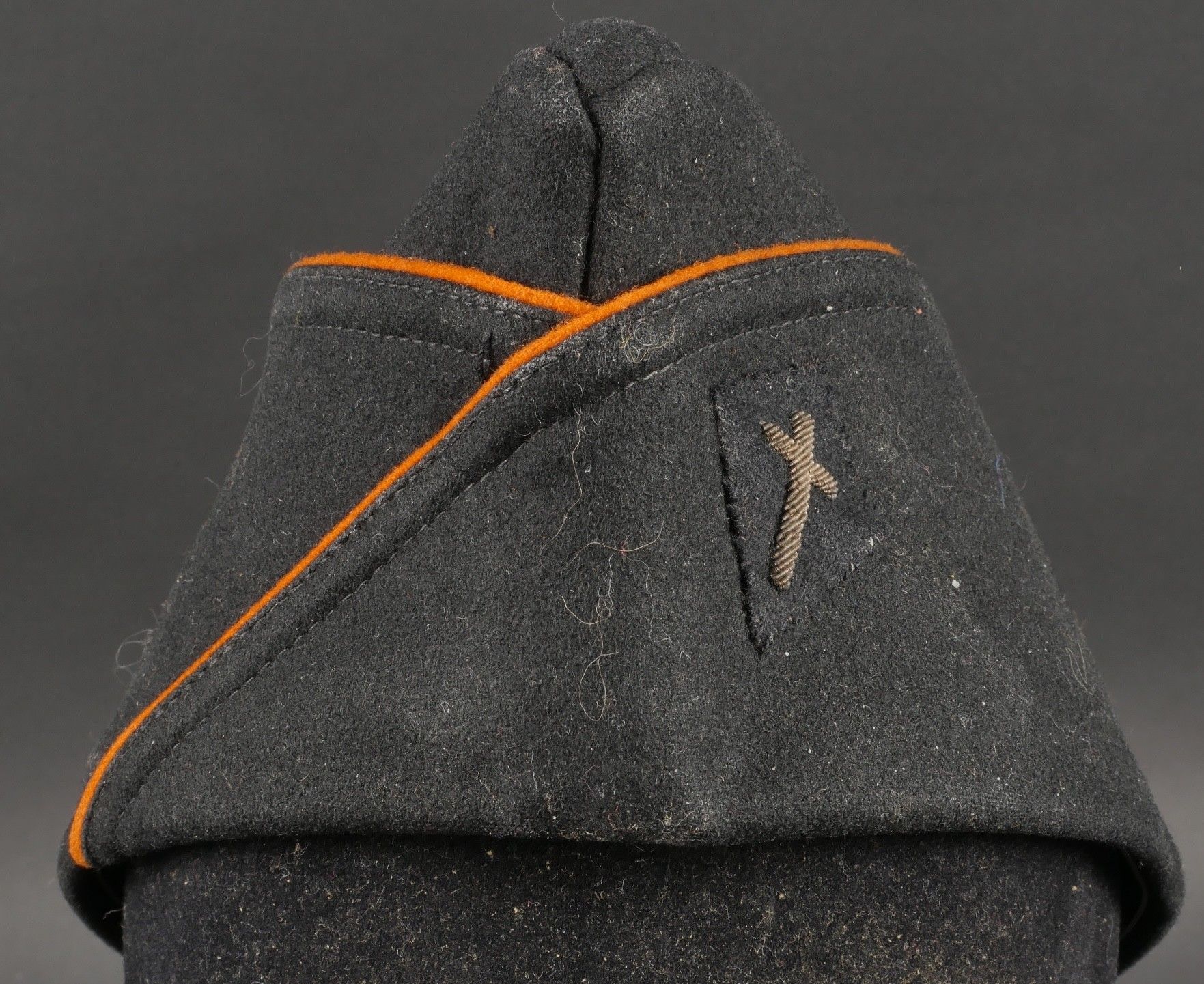 Police cap specific to military chaplains, made of black woollen cloth with orange piping. Inner band in fine black leather. Catholic cross embroidered in canetille on a lozenge of black cloth. This Police cap can be seen on page 124 in the book La tenue des Aumôniers de l'Armée de Terre de 1854 à 1964. Side cap specific to military chaplains made of black wool cloth with orange piping. Inner band in fine black leather. Catholic cross embroidered in gold bullion on a black cloth diamond patch. This side cap is illustrated on page 124 of La tenue des Aumôniers de l'Armée de Terre de 1854 à 1964.