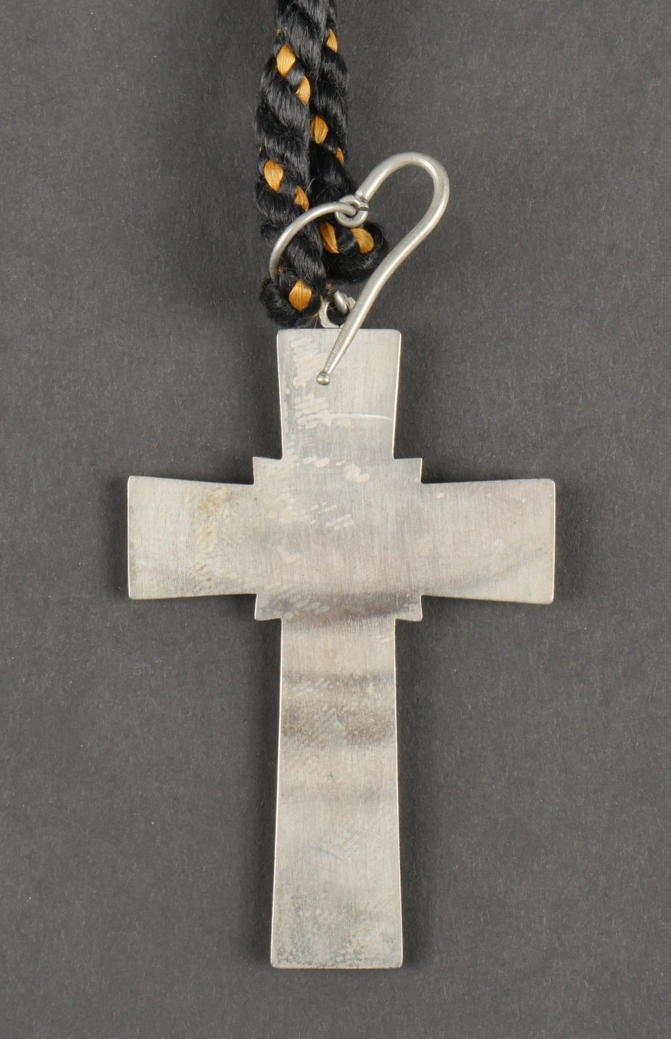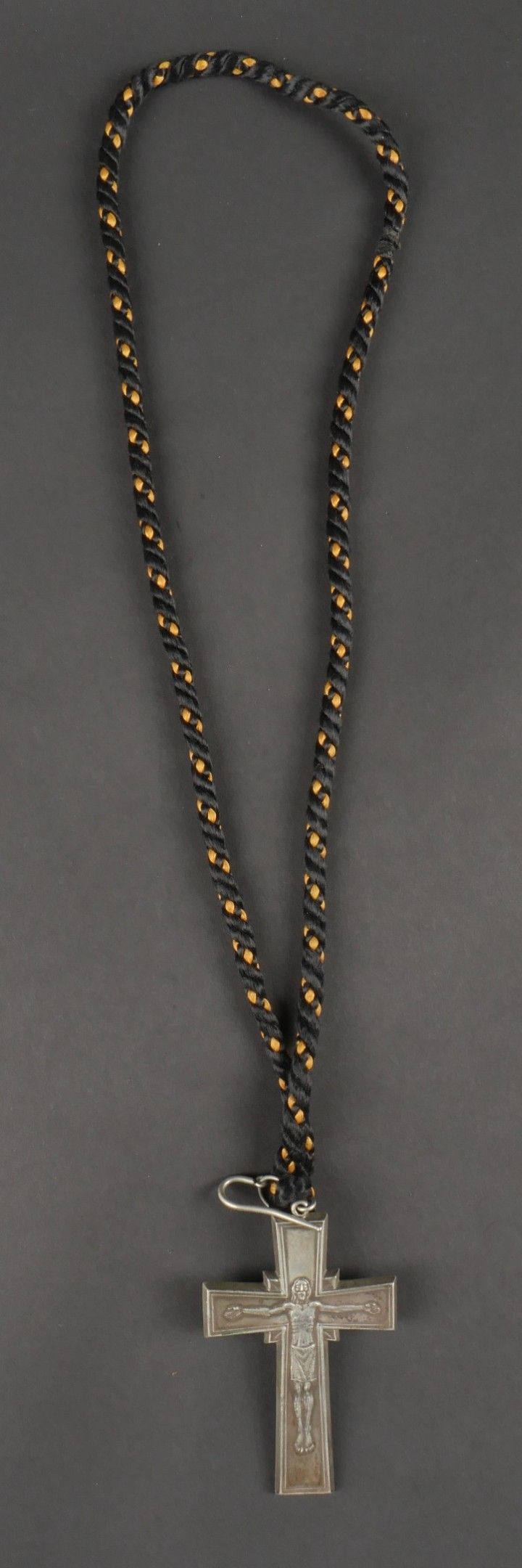 Catholic military chaplain's pectoral cross, model 1953, made of white nickel silver, original ring and buttonhole hook. Cornucopia and Mchort hallmarks for nickel silver. Black and orange cotton braided cord. Pectoral cross for Catholic military chaplain model 1953 made of white nickel silver with original ring and buttonhole hook. Hallmarks on reverse with cornucopia and Mchort for maillechort. Braided cotton cord in black and orange.