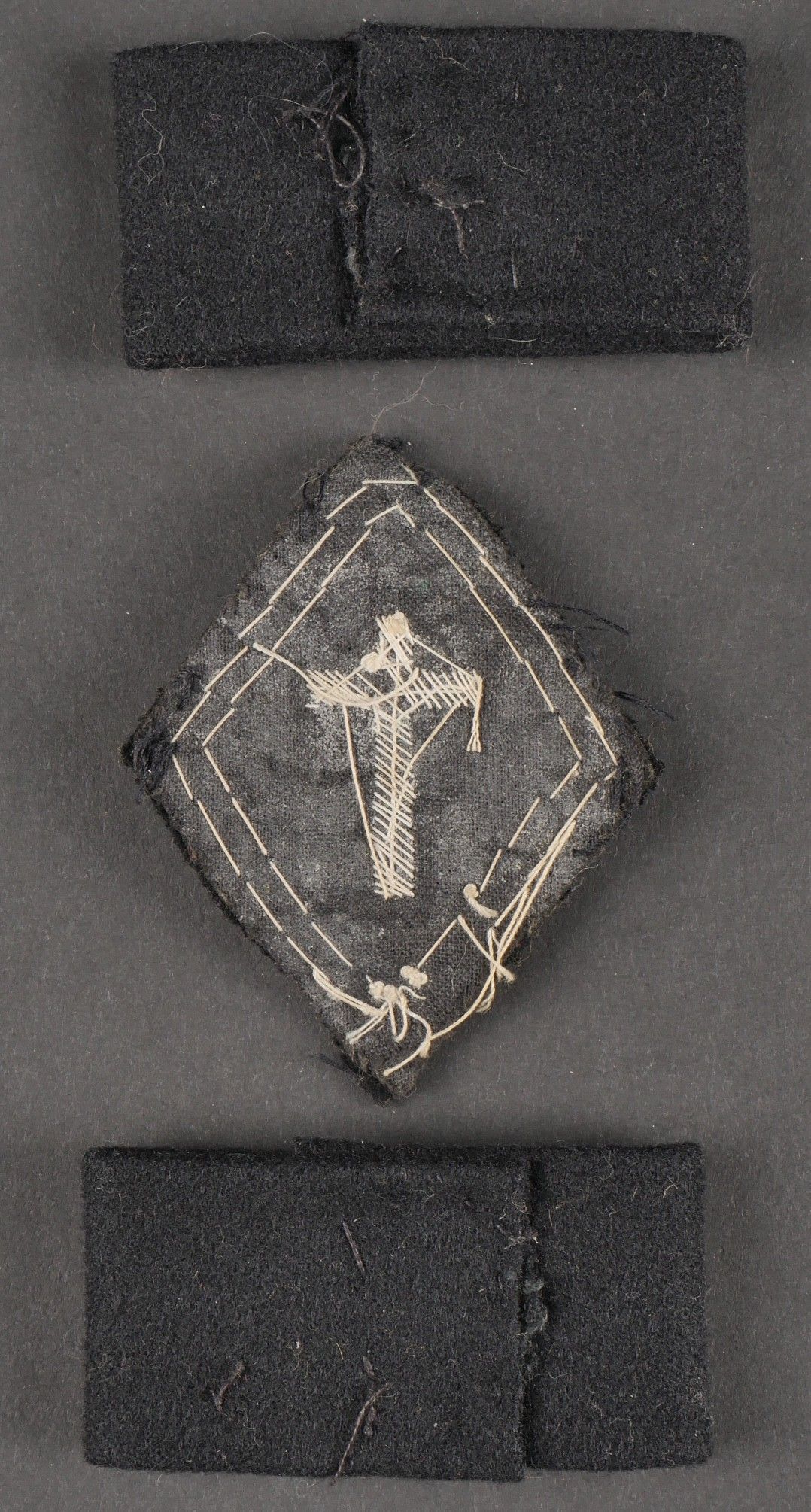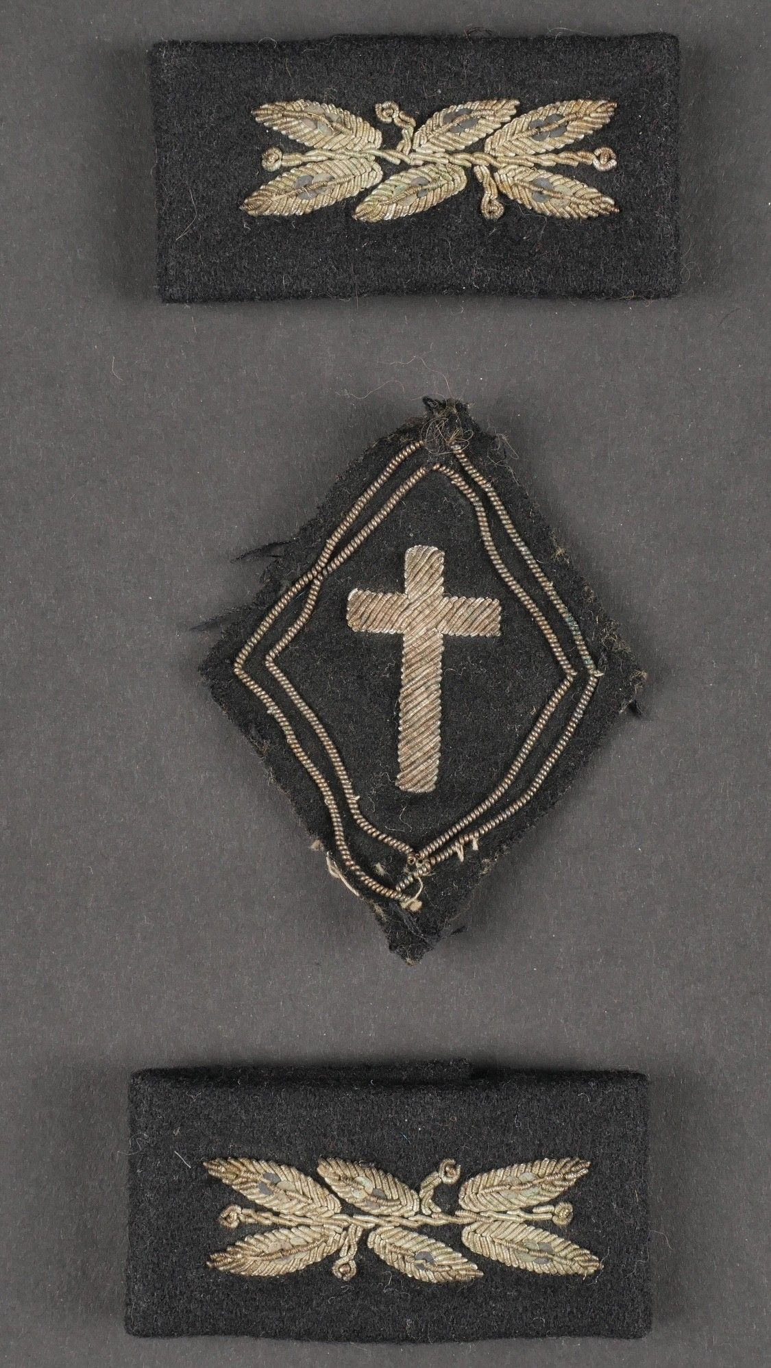 Set consisting of a pair of black cloth duty badges with shoulder loops for Auxiliary military chaplains and local territorial chaplains, embroidered in silver cannetille, without guipé. Also included is a Catholic Chaplain arm patch consisting of a black cloth lozenge with an embroidered Catholic cross in gold canetille and two gold canetille soutaches. Set including a pair of black cloth function insignia shoulder straps for auxiliary or local chaplains with silver bullion embroidery unpiped. Includes a Catholic chaplain arm badge consisting of a black cloth diamond with a gold bullion cross and two gold bullion soutache stripes.
