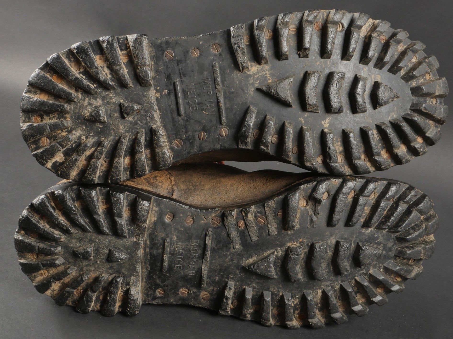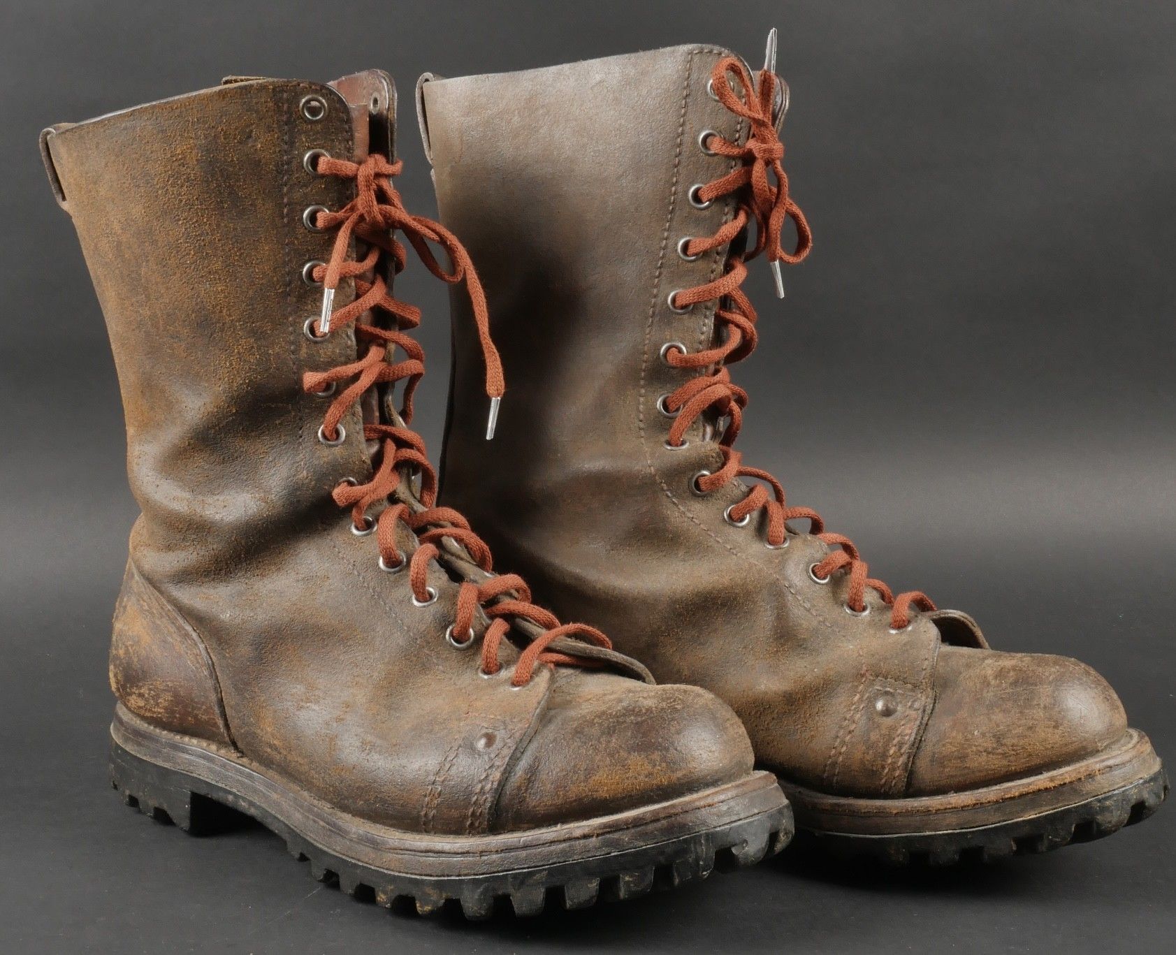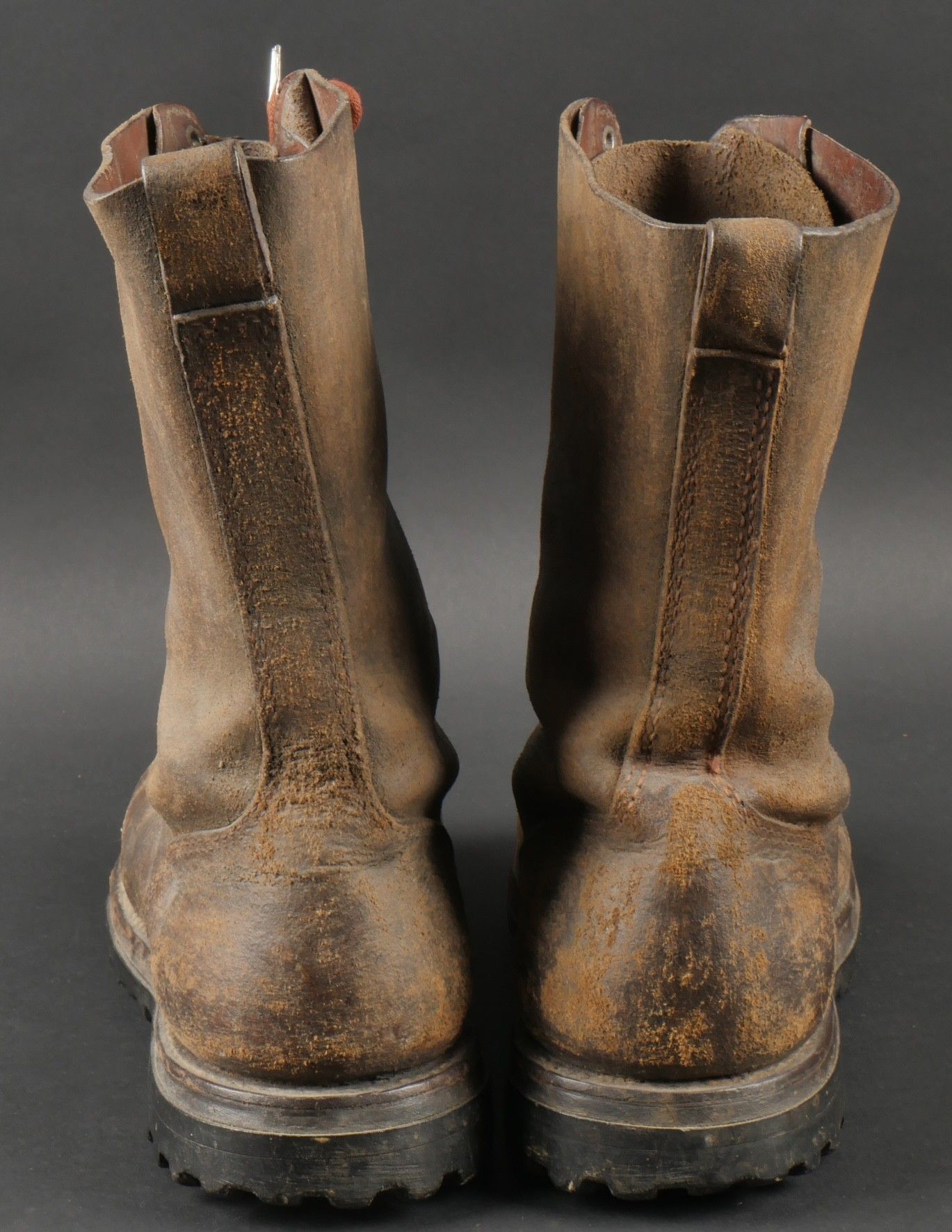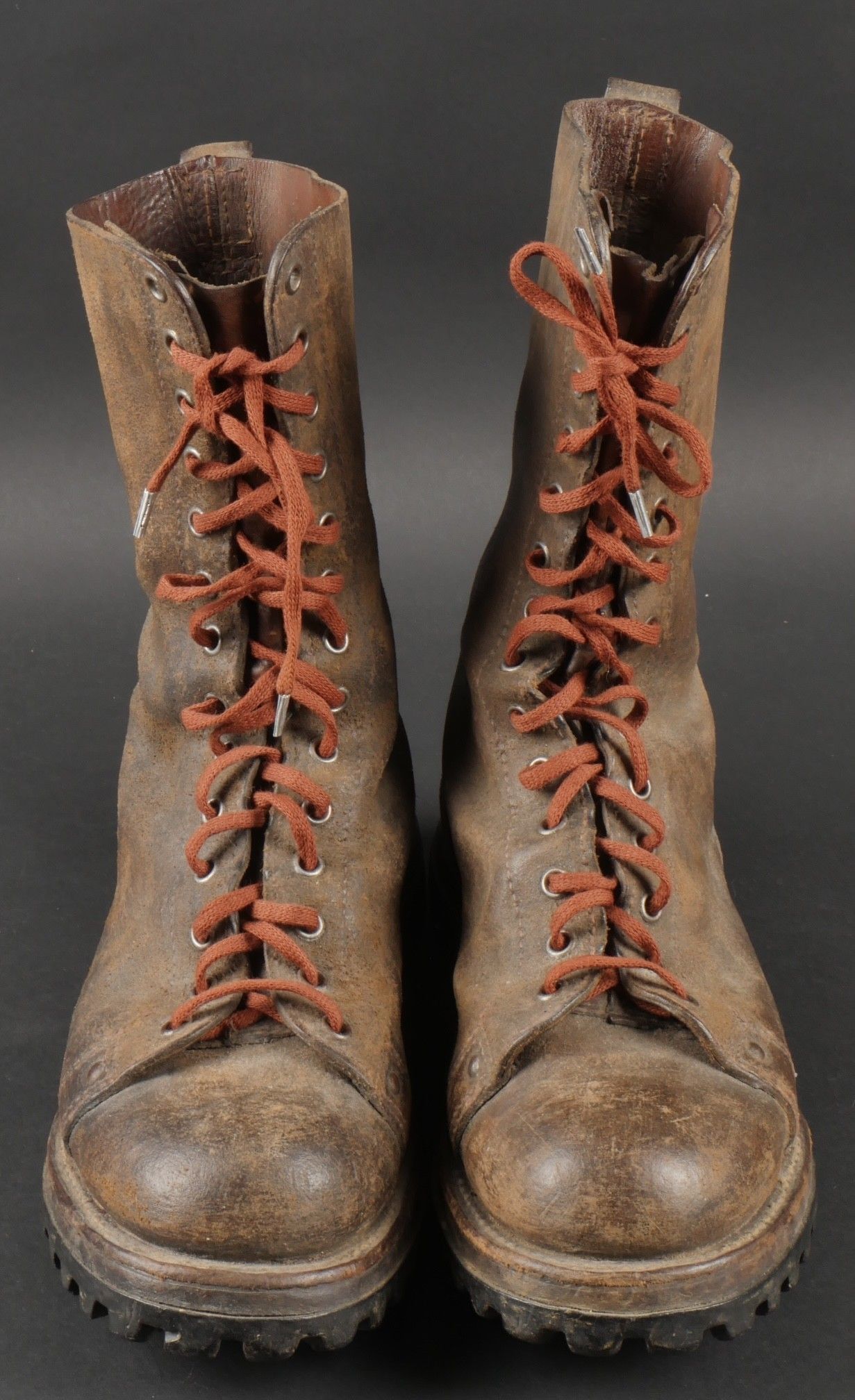 Rare pre-production model of the regulation jump boot for the TAPs known as model 49. One-piece leather shaft and counter. Characteristic reinforcing rivet at the quarter vamp junction. All eyelets are present. MORVAN Neige screwed rubber sole. A stamp from the manufacturer Clerget in La Tour du Pin on the insole also indicating the date 449. Lightly worn pair in very good condition, supple leather. Size 44 approx. Rare preseries model of the regulation jump boot for TAP model 49. Single piece leather vamp and counter with characteristic reinforcing rivet at quarter and vamp junction. All eyelets present. Rubber screwed sole brand Morvan Neige. Maker stamp Clerget La Tour du Pin inside sole dated 4 49. Slightly worn pair in very good supple condition size about 44.