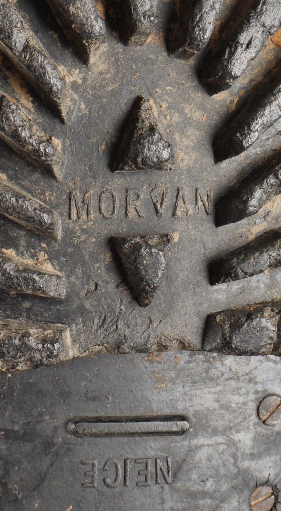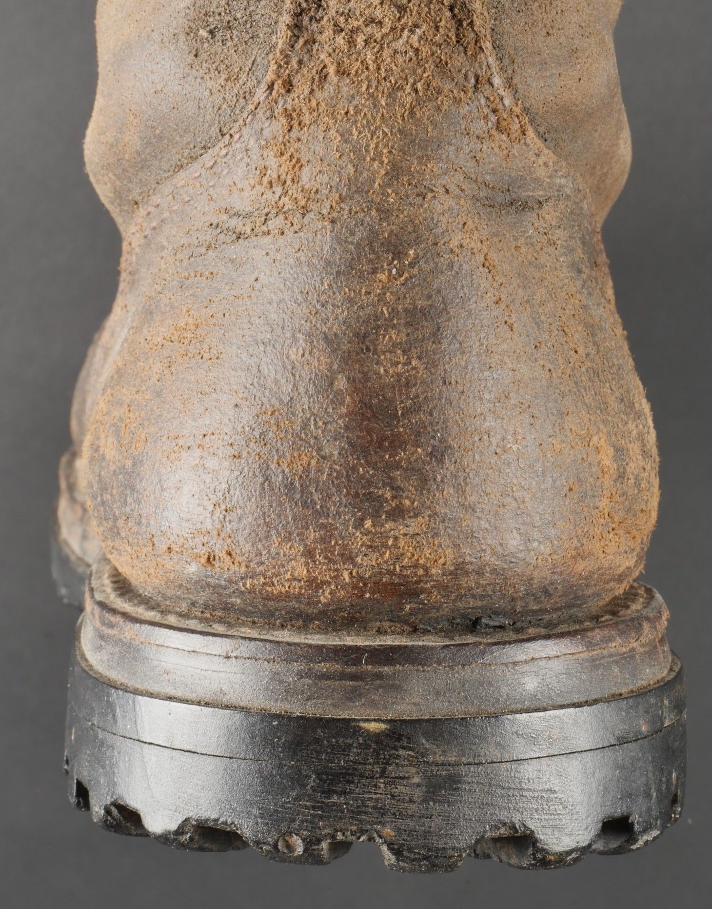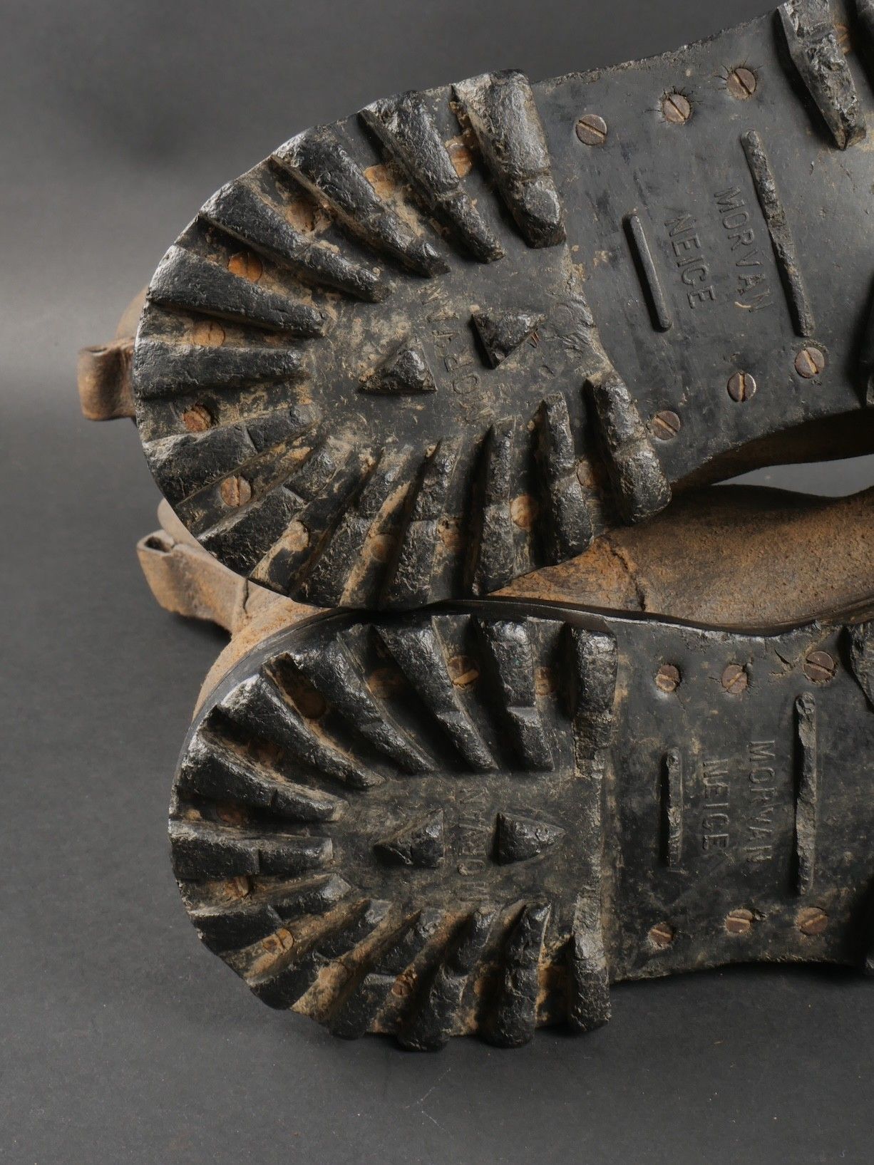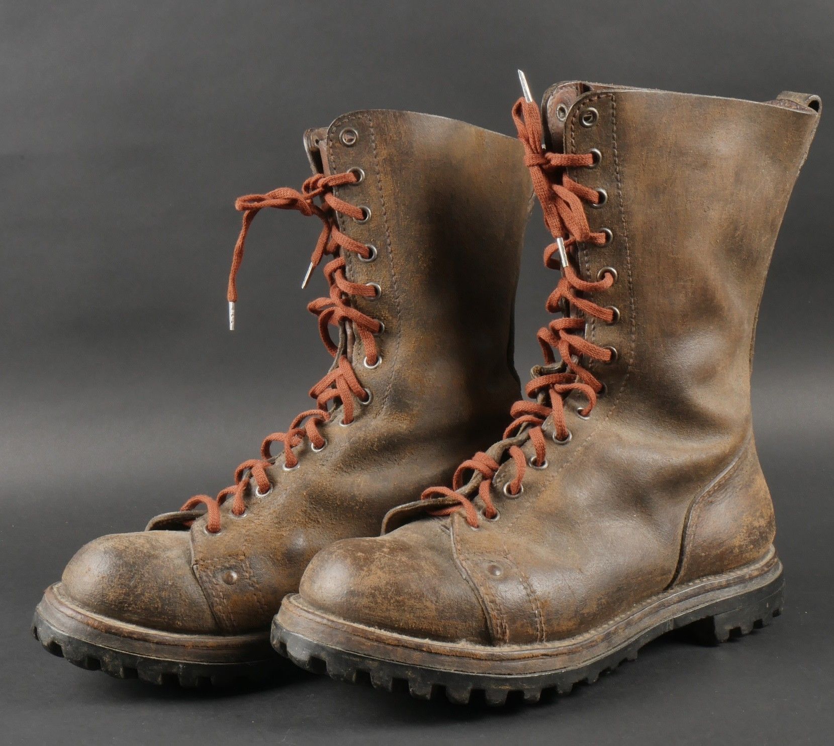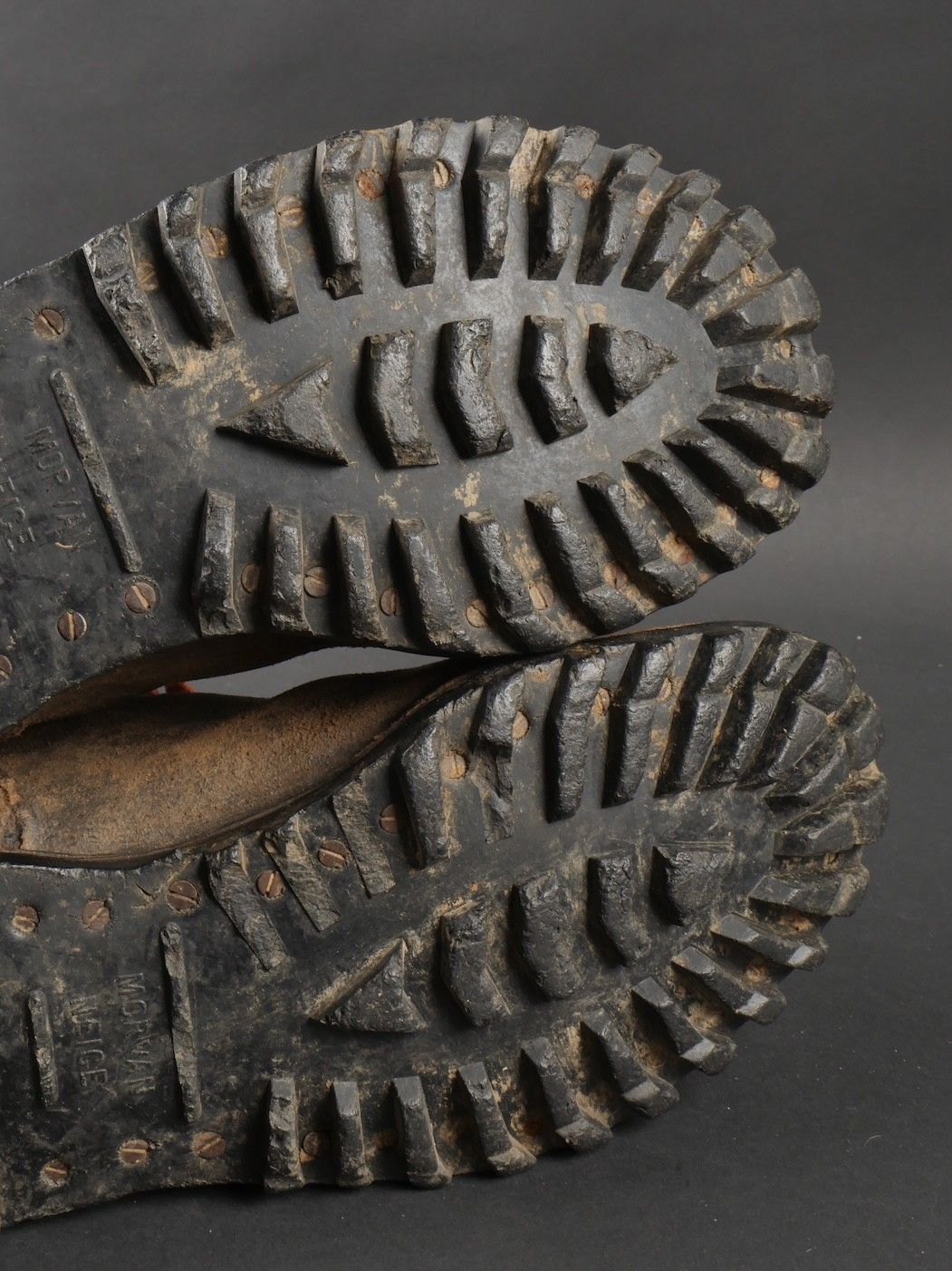Rare pre-production model of the regulation jump boot for the TAPs known as model 49. One-piece leather shaft and counter. Characteristic reinforcing rivet at the quarter vamp junction. All eyelets are present. MORVAN Neige screwed rubber sole. A stamp from the manufacturer Clerget in La Tour du Pin on the insole also indicating the date 449. Lightly worn pair in very good condition, supple leather. Size 44 approx. Rare preseries model of the regulation jump boot for TAP model 49. Single piece leather vamp and counter with characteristic reinforcing rivet at quarter and vamp junction. All eyelets present. Rubber screwed sole brand Morvan Neige. Maker stamp Clerget La Tour du Pin inside sole dated 4 49. Slightly worn pair in very good supple condition size about 44.