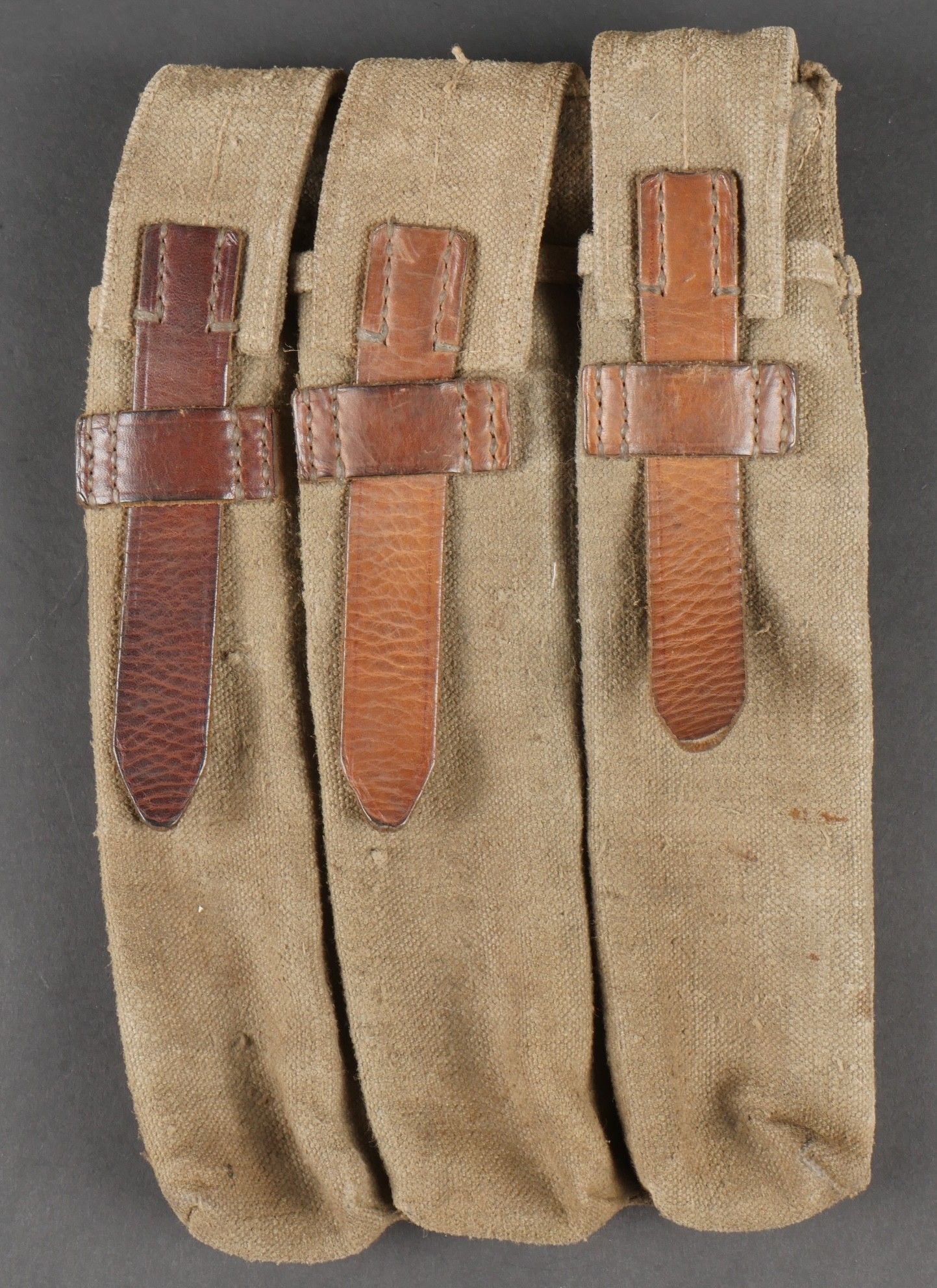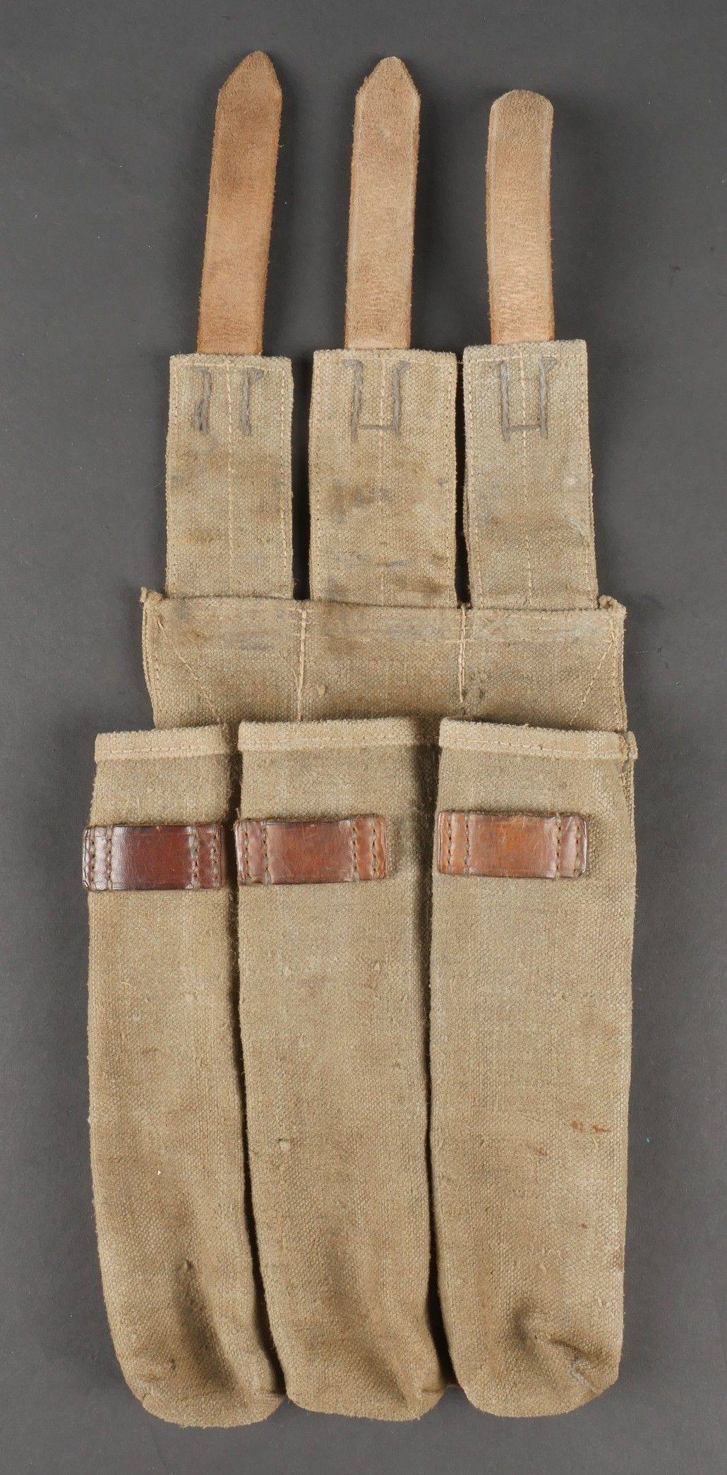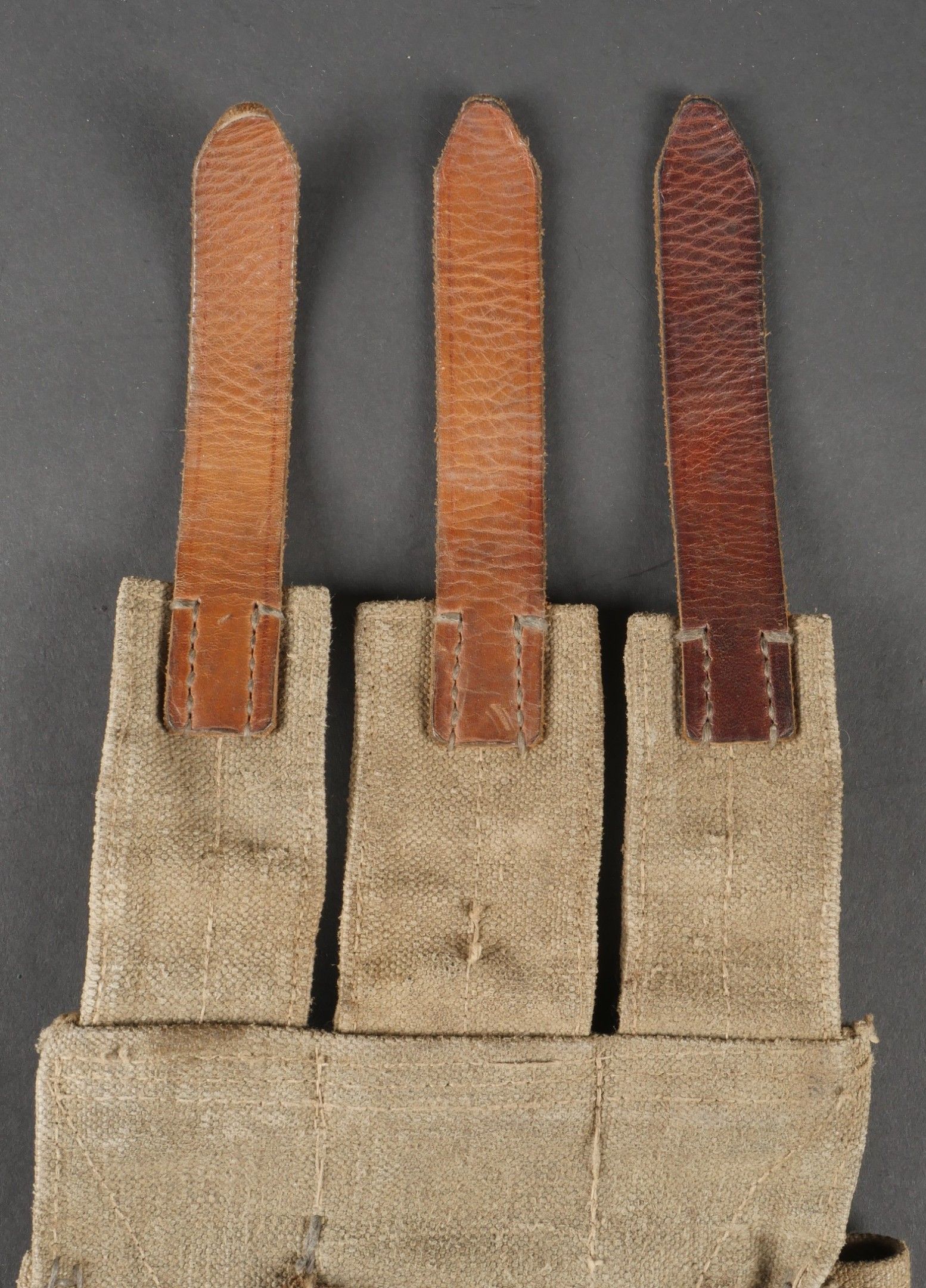 Beautiful magazine holder for machine pistols copied from the German 3840 model but manufactured by the French army and used in Indochina in particular. Entirely made from strong khaki canvas, with tan leather loops and tabs. Very well made and unusual model. Fine magazine pouch for submachine gun patterned on the German 38 40 model but made by the French Army also used in Indochina. All in strong khaki canvas with tan leather loops and straps. Well made and uncommon model.