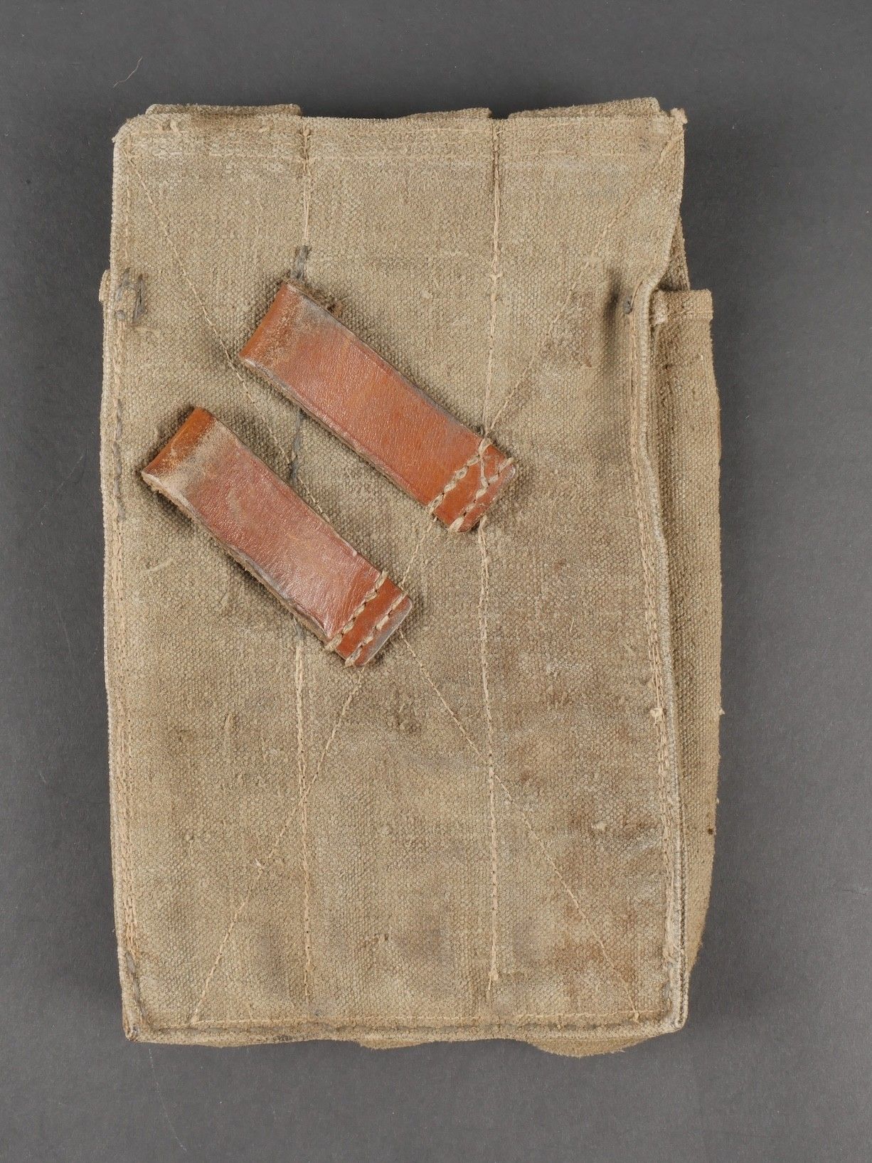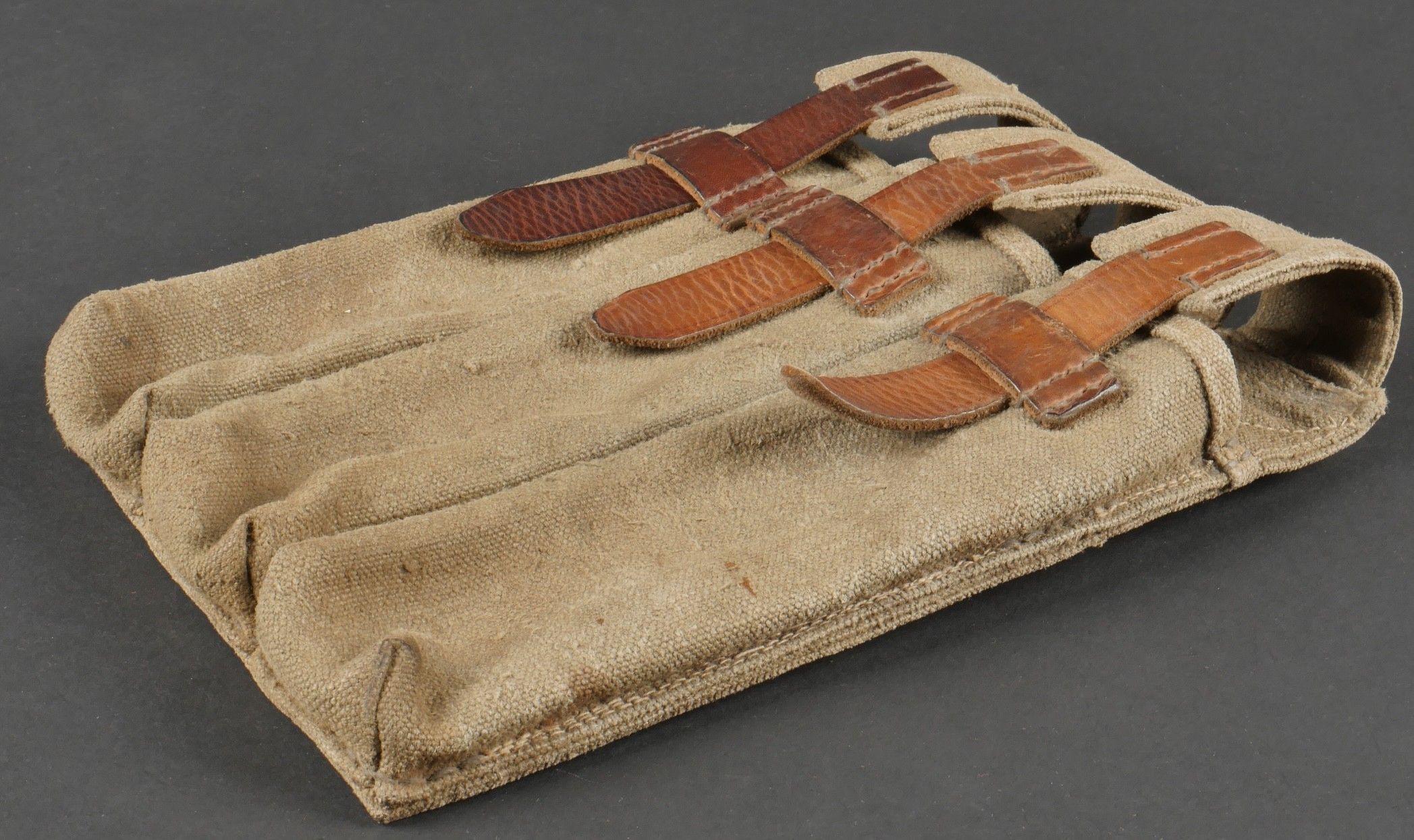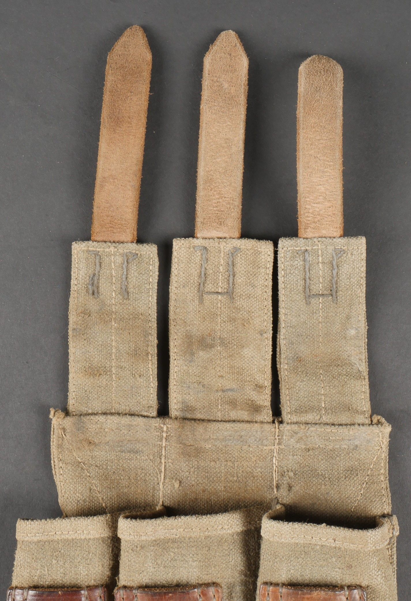 Beautiful magazine holder for machine pistols copied from the German 3840 model but manufactured by the French army and used in Indochina in particular. Entirely made from strong khaki canvas, with tan leather loops and tabs. Very well made and unusual model. Fine magazine pouch for submachine gun patterned on the German 38 40 model but made by the French Army also used in Indochina. All in strong khaki canvas with tan leather loops and straps. Well made and uncommon model.