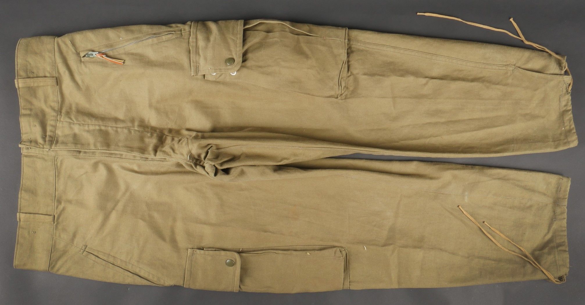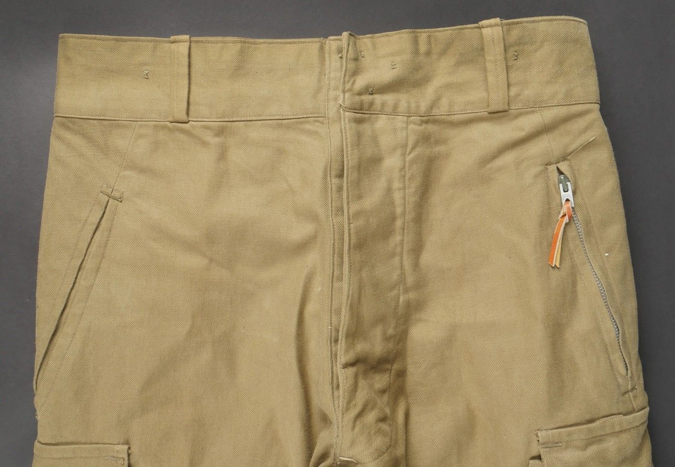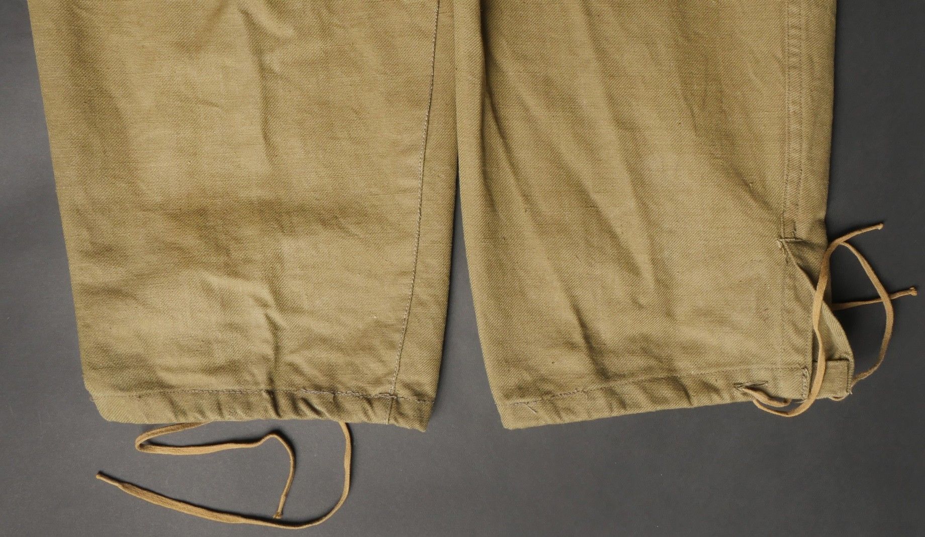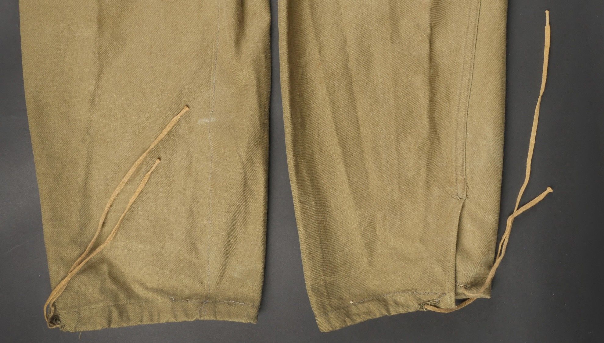 Nice pair of TAP 47 trousers in khaki canvas, small model press studs in original paint and functional, Eclair brand zipper in original khaki paint. Manufacturer's stamps and Army stamps present and indicating the year 1953. Size stamp indicating 15. All original buttons and drawstrings are present. Like new, never worn with some signs of storage. Fine TAP 47 trousers made of khaki canvas with functional small model snaps retaining original paint Eclair zipper with original khaki paint. Maker and army stamps present dated 1953. Size stamp 15. All original buttons and drawstrings present. Unworn example with minor storage marks.