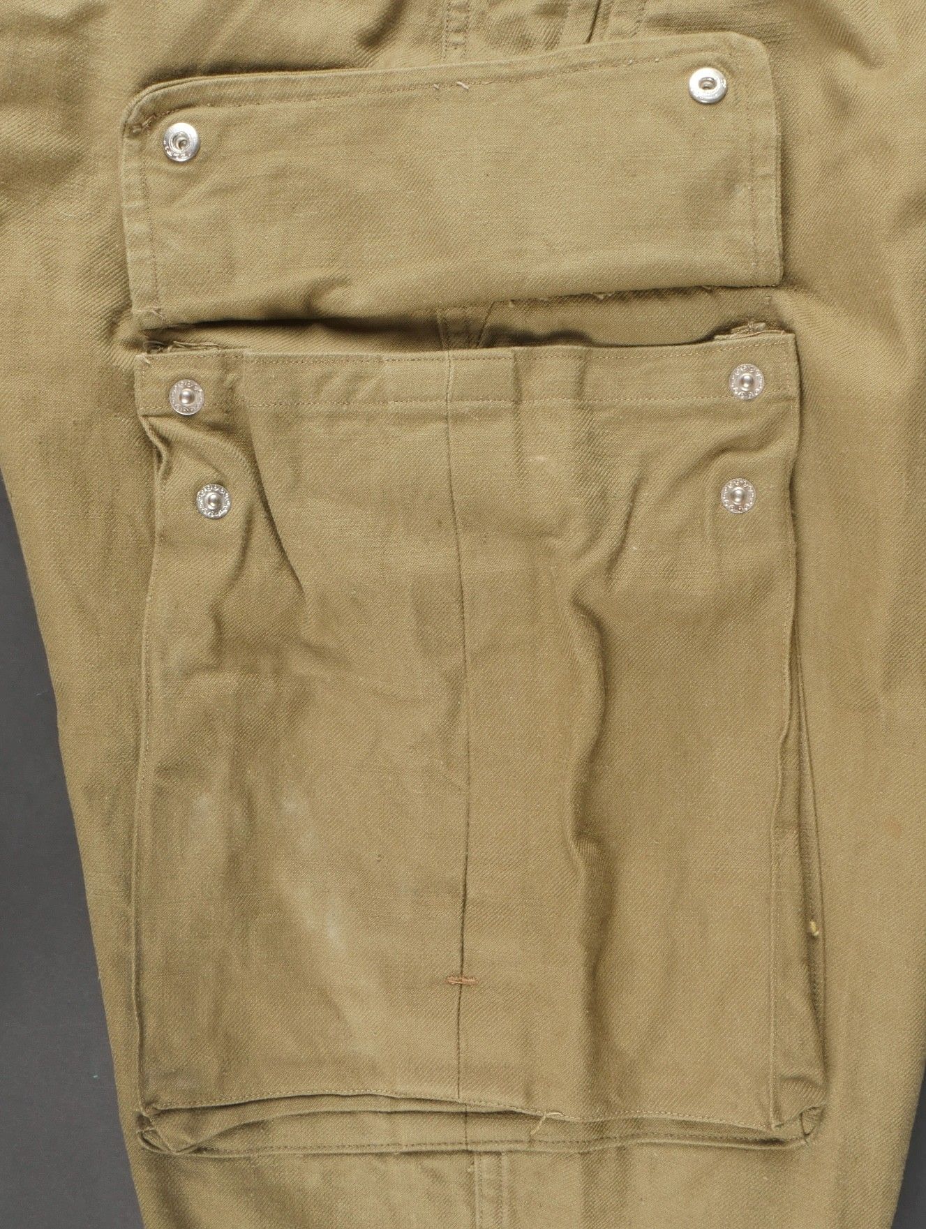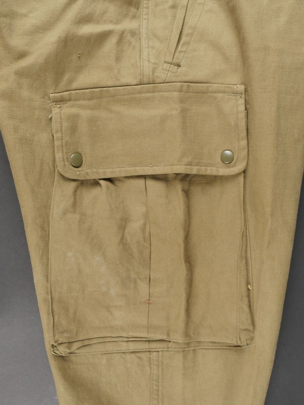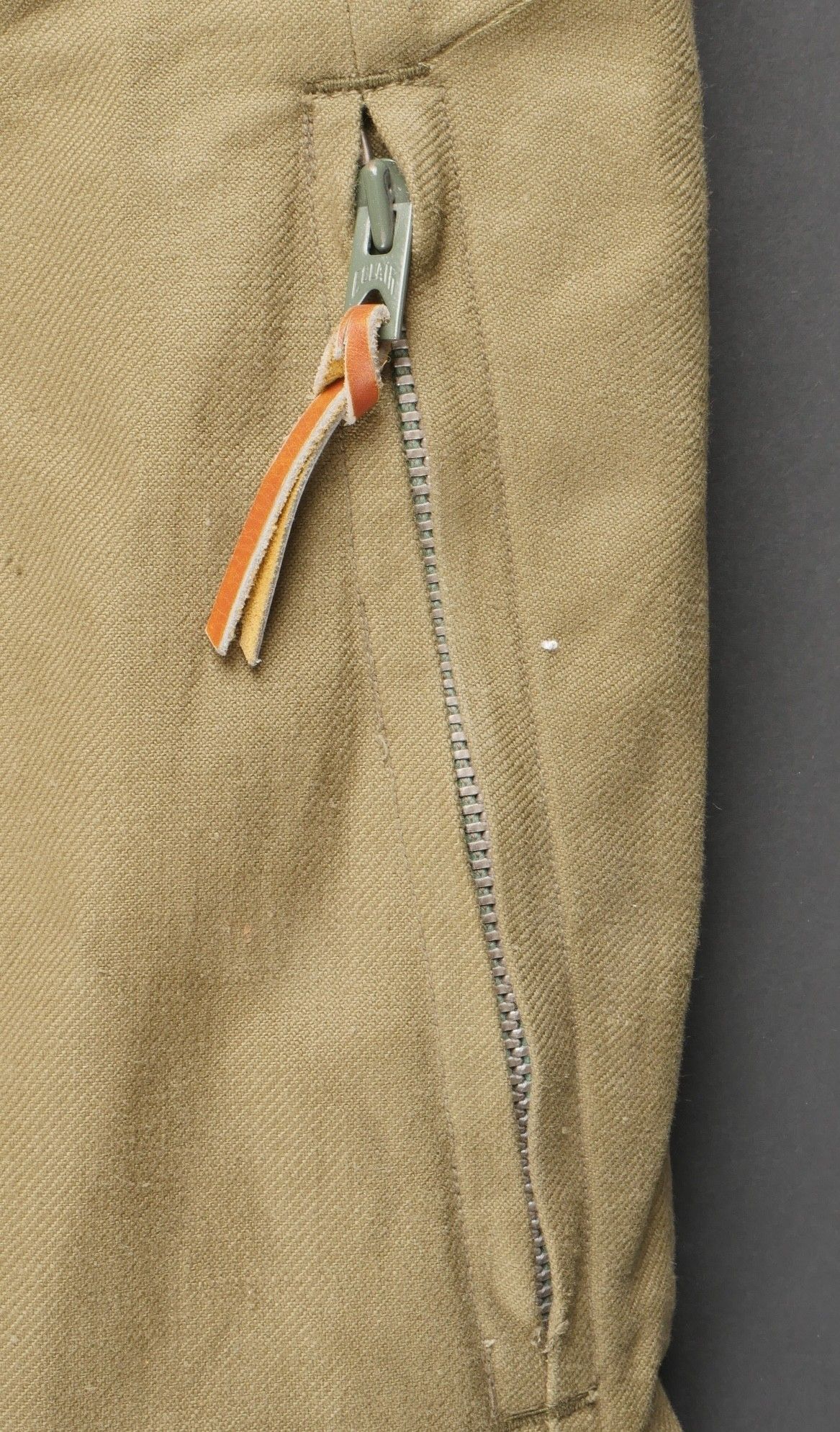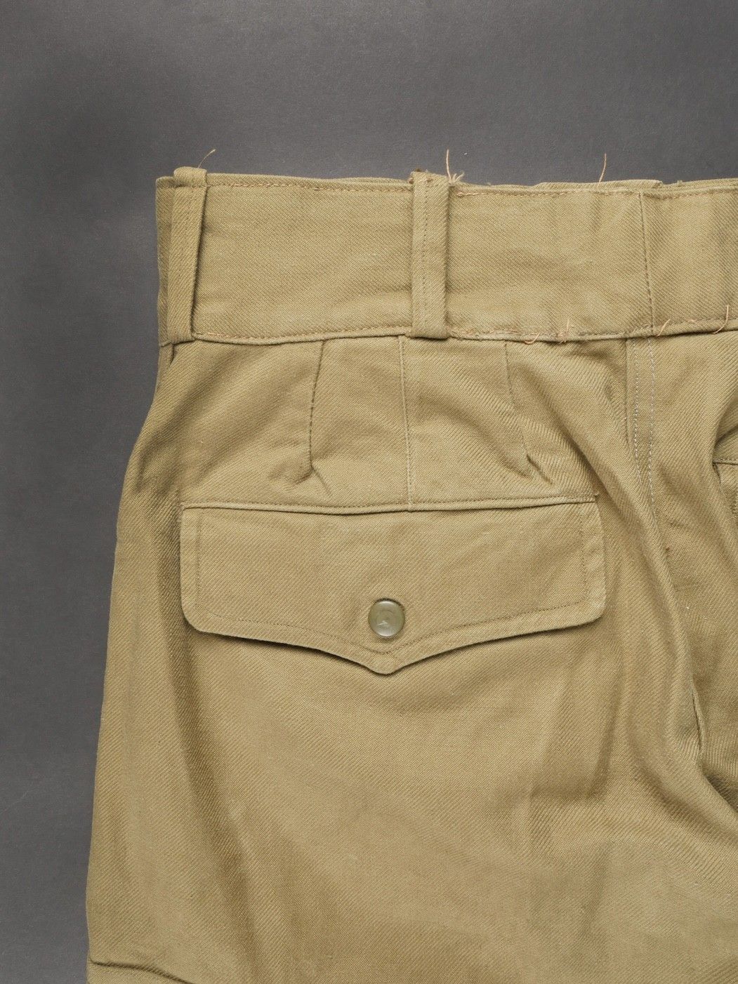 Nice pair of TAP 47 trousers in khaki canvas, small model press studs in original paint and functional, Eclair brand zipper in original khaki paint. Manufacturer's stamps and Army stamps present and indicating the year 1953. Size stamp indicating 15. All original buttons and drawstrings are present. Like new, never worn with some signs of storage. Fine TAP 47 trousers made of khaki canvas with functional small model snaps retaining original paint Eclair zipper with original khaki paint. Maker and army stamps present dated 1953. Size stamp 15. All original buttons and drawstrings present. Unworn example with minor storage marks.