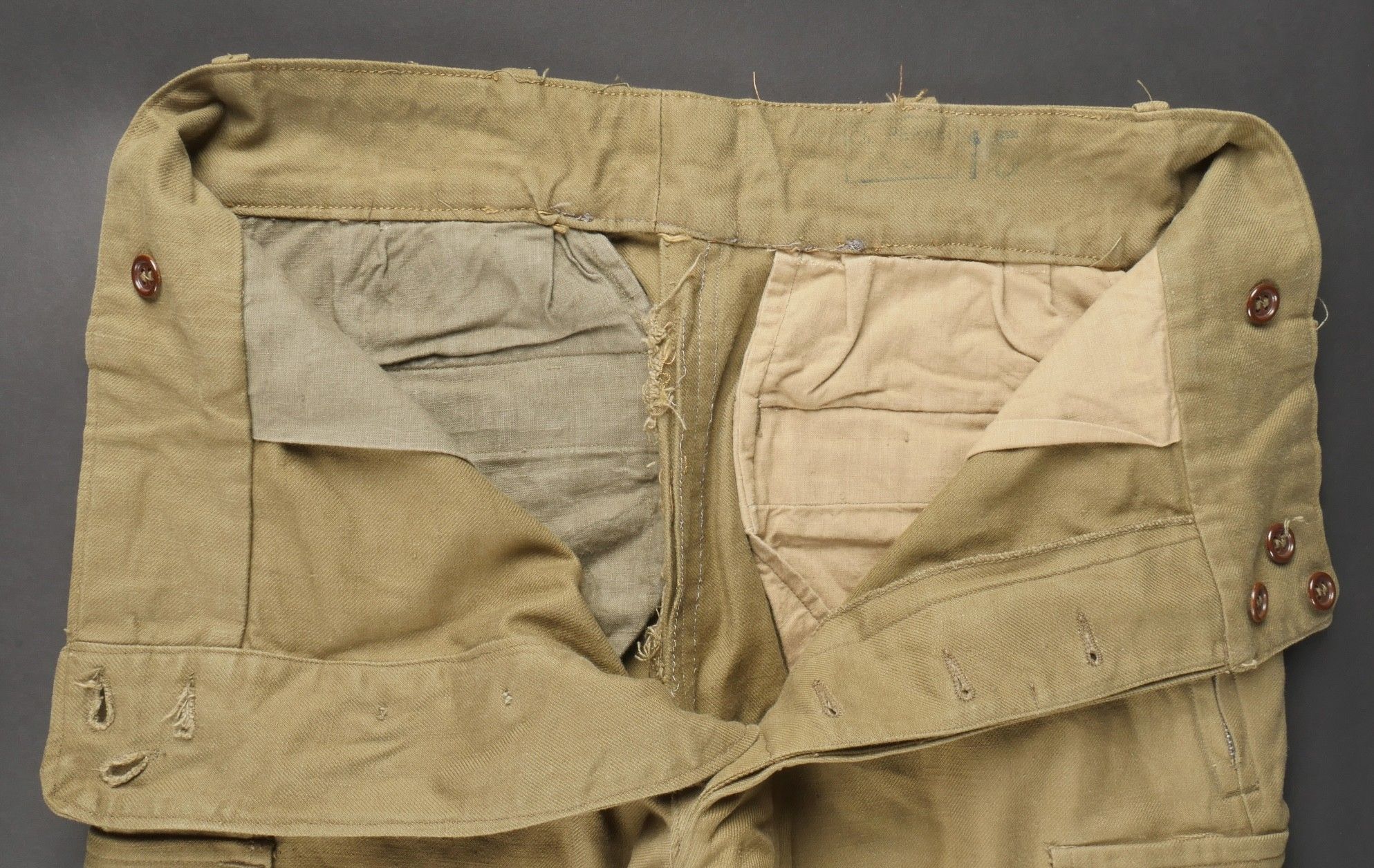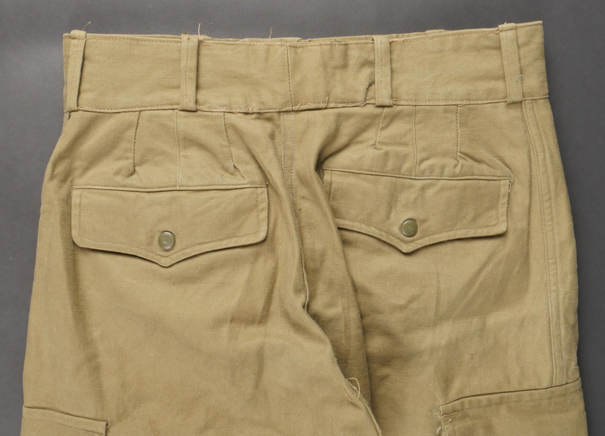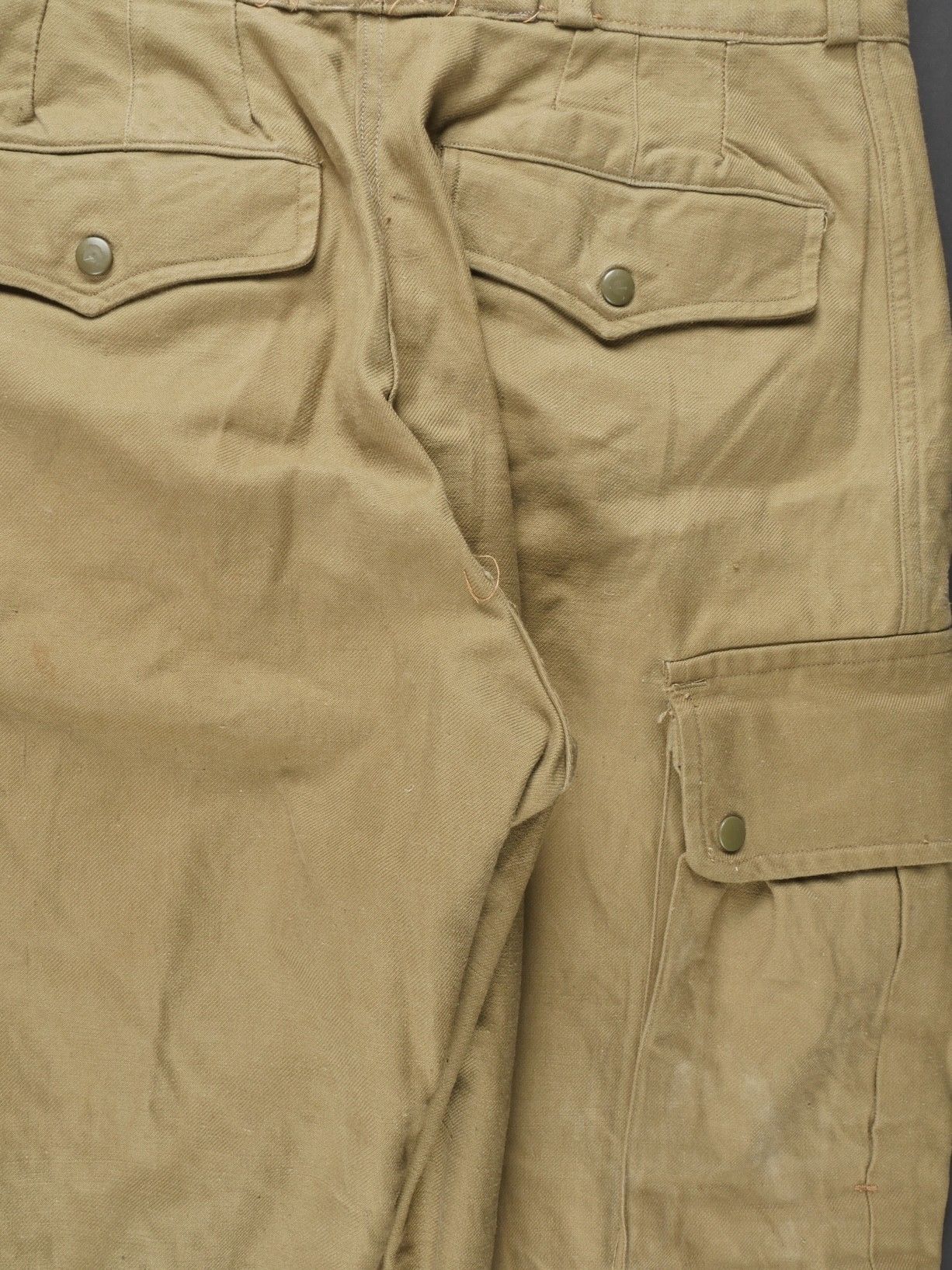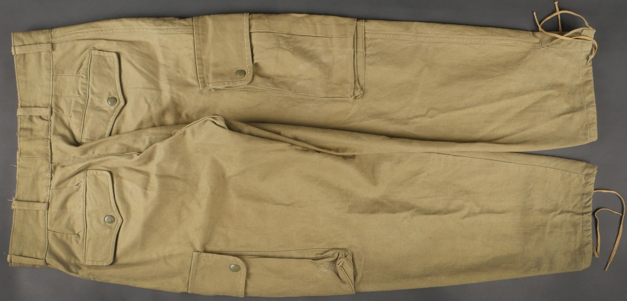 Nice pair of TAP 47 trousers in khaki canvas, small model press studs in original paint and functional, Eclair brand zipper in original khaki paint. Manufacturer's stamps and Army stamps present and indicating the year 1953. Size stamp indicating 15. All original buttons and drawstrings are present. Like new, never worn with some signs of storage. Fine TAP 47 trousers made of khaki canvas with functional small model snaps retaining original paint Eclair zipper with original khaki paint. Maker and army stamps present dated 1953. Size stamp 15. All original buttons and drawstrings present. Unworn example with minor storage marks.