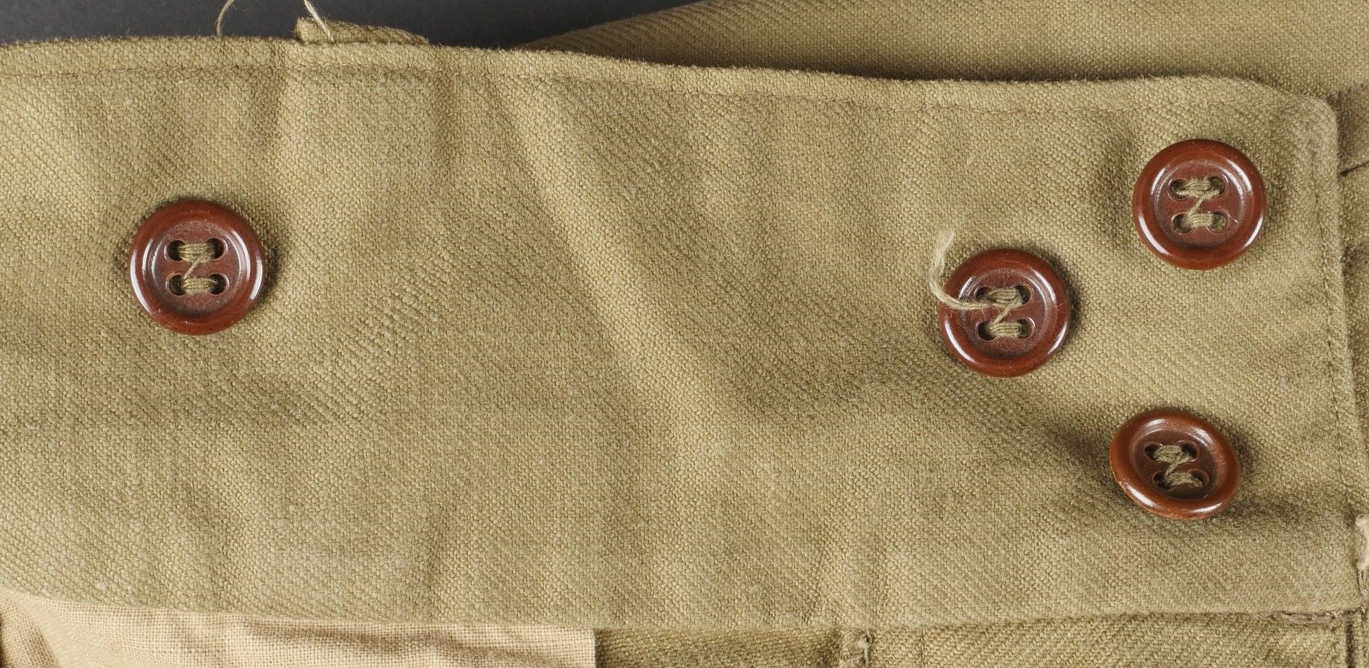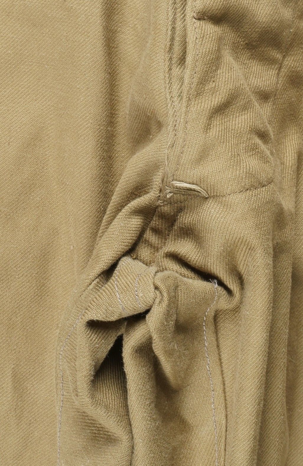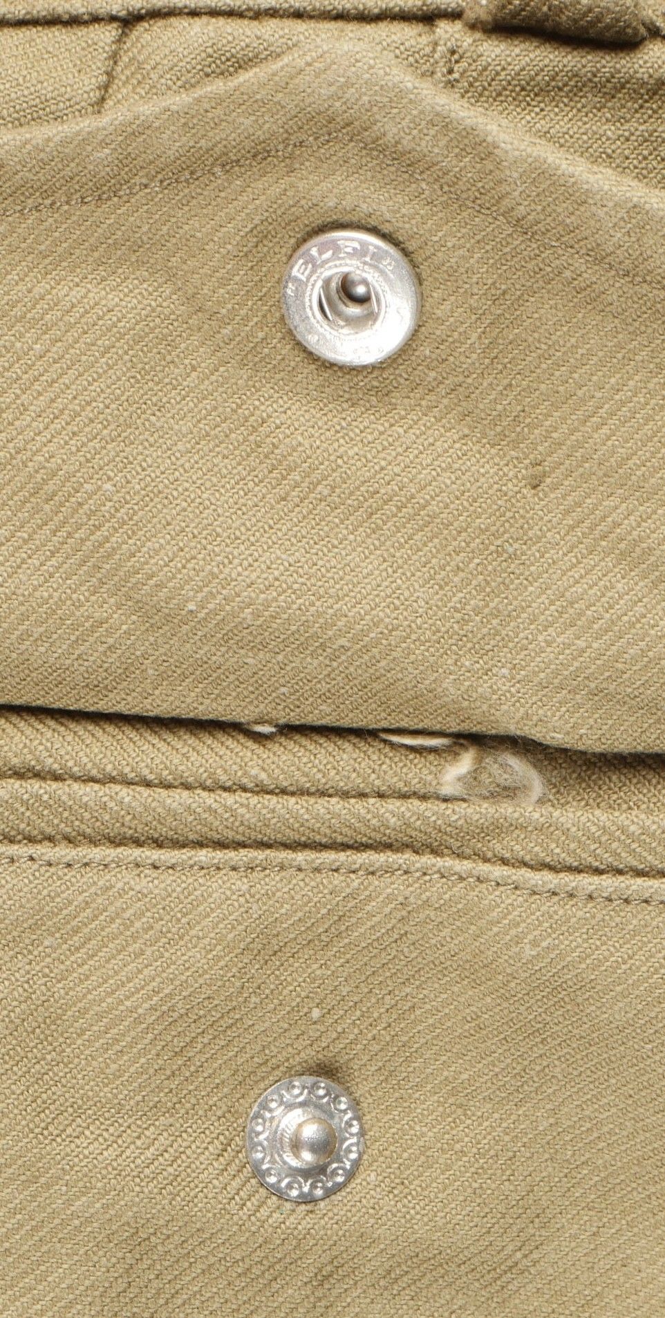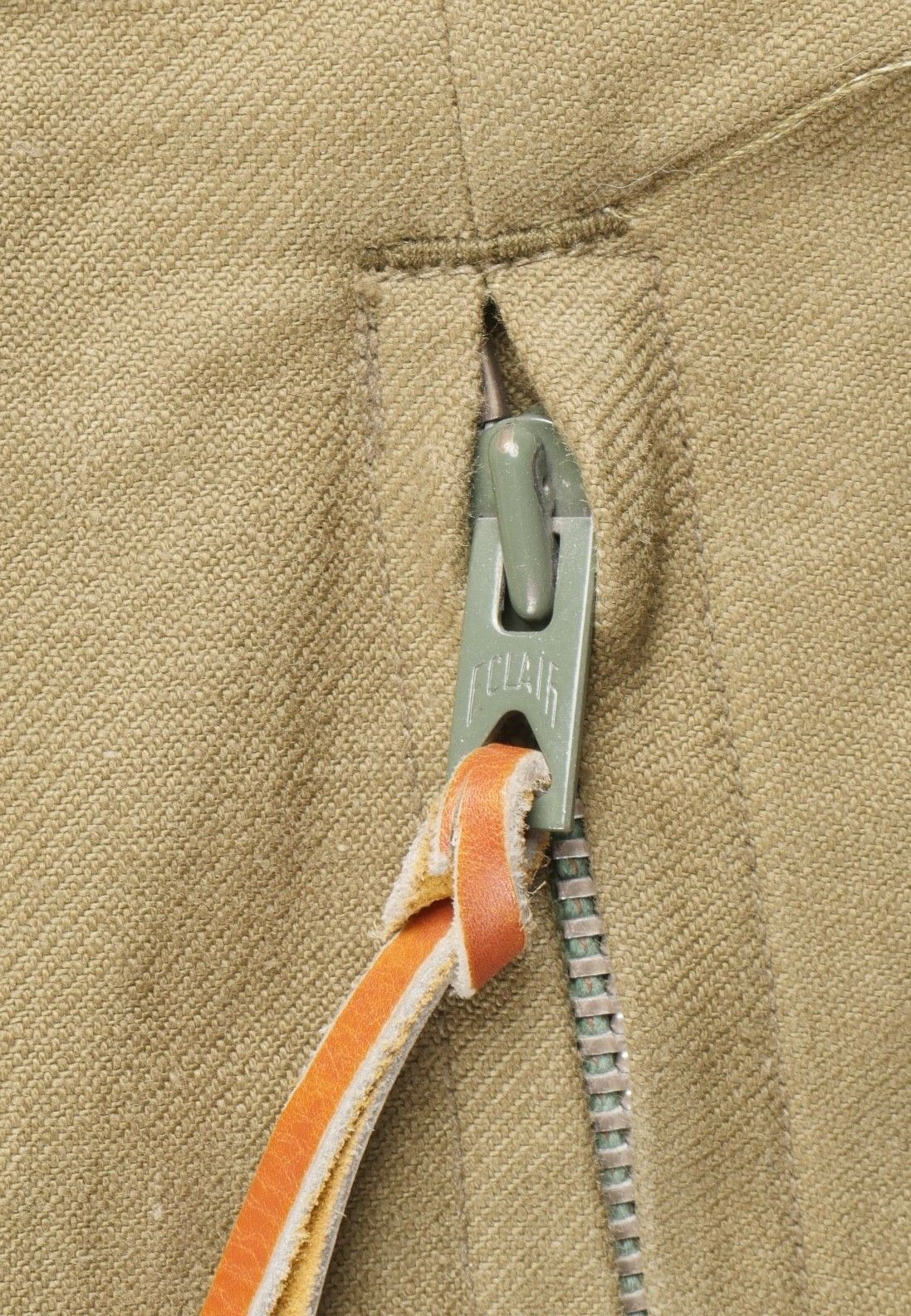 Nice pair of TAP 47 trousers in khaki canvas, small model press studs in original paint and functional, Eclair brand zipper in original khaki paint. Manufacturer's stamps and Army stamps present and indicating the year 1953. Size stamp indicating 15. All original buttons and drawstrings are present. Like new, never worn with some signs of storage. Fine TAP 47 trousers made of khaki canvas with functional small model snaps retaining original paint Eclair zipper with original khaki paint. Maker and army stamps present dated 1953. Size stamp 15. All original buttons and drawstrings present. Unworn example with minor storage marks.
