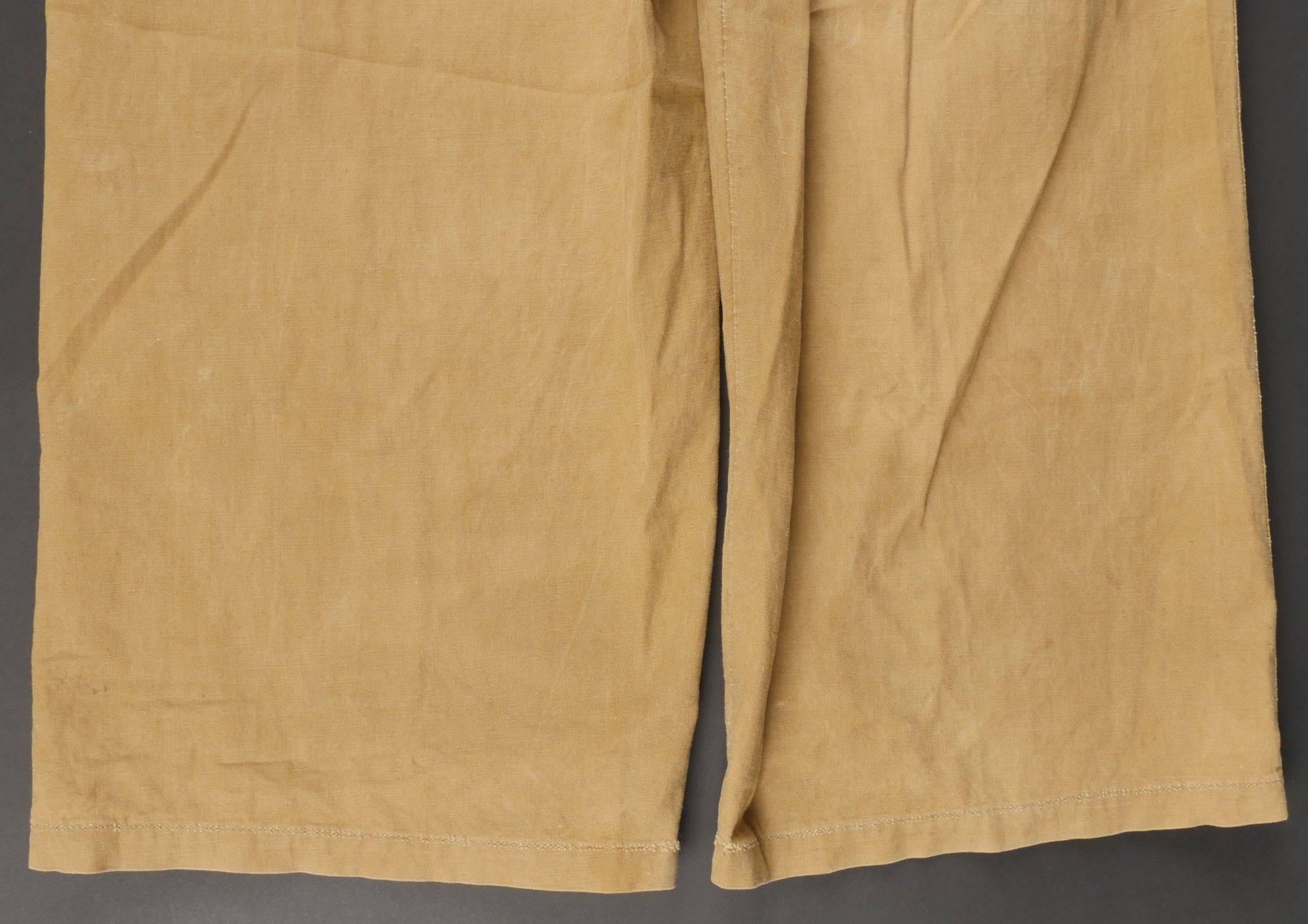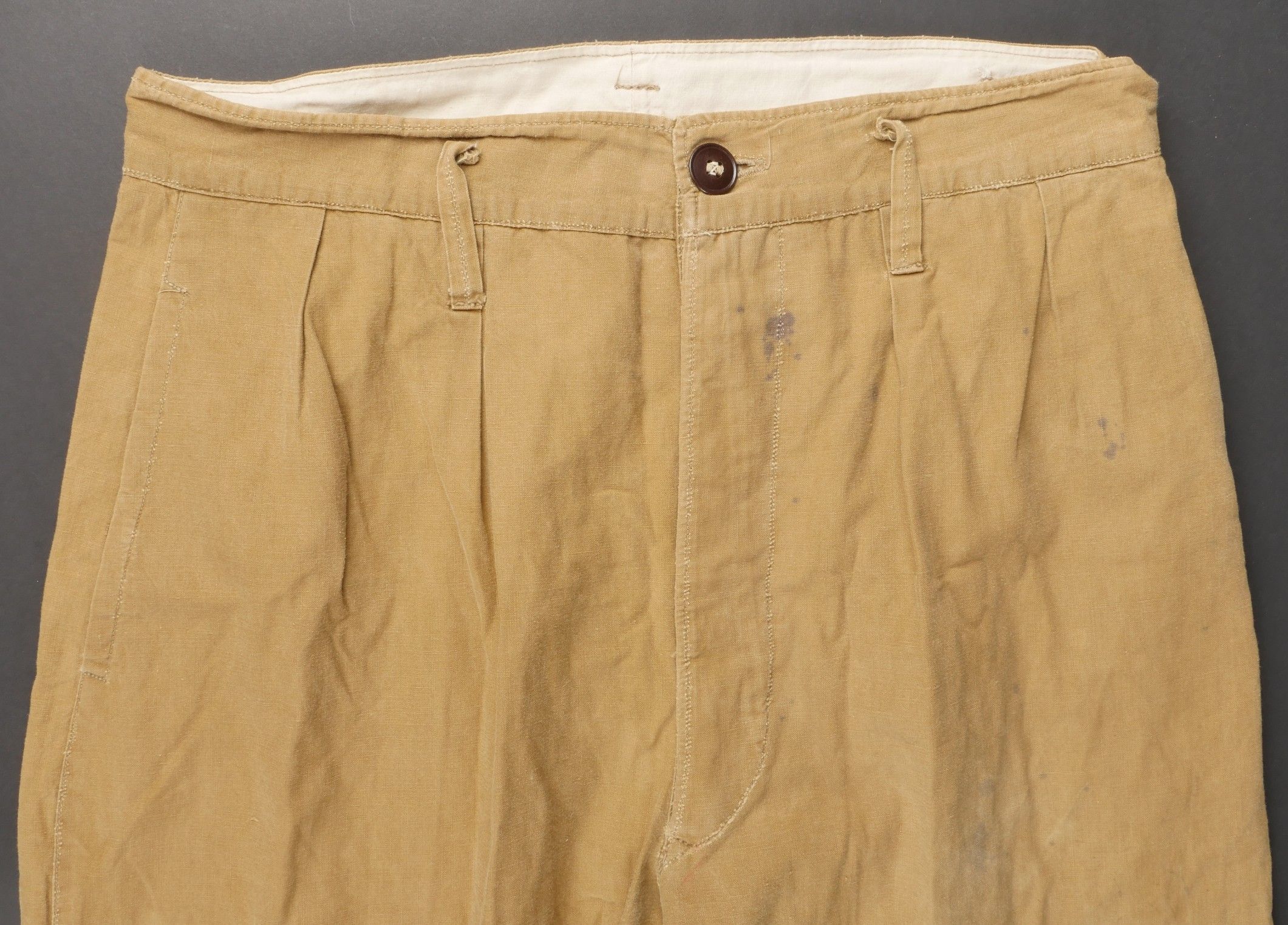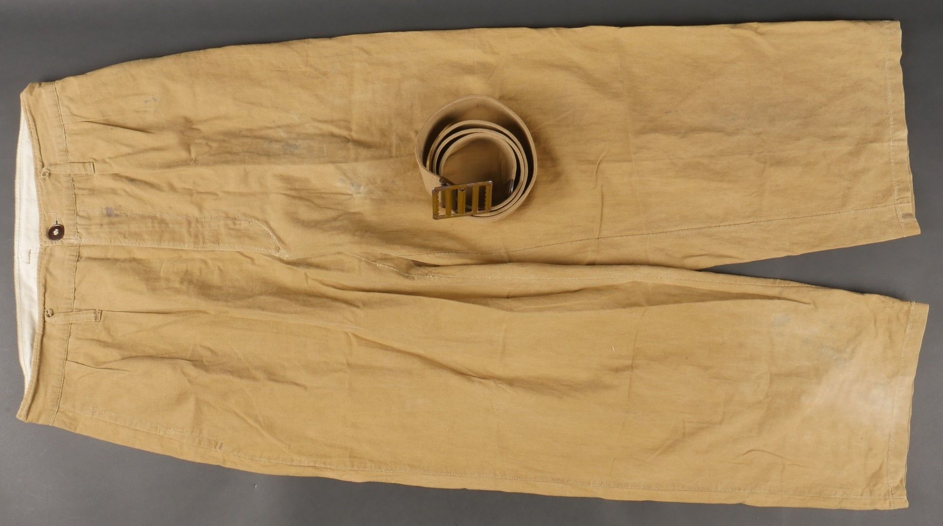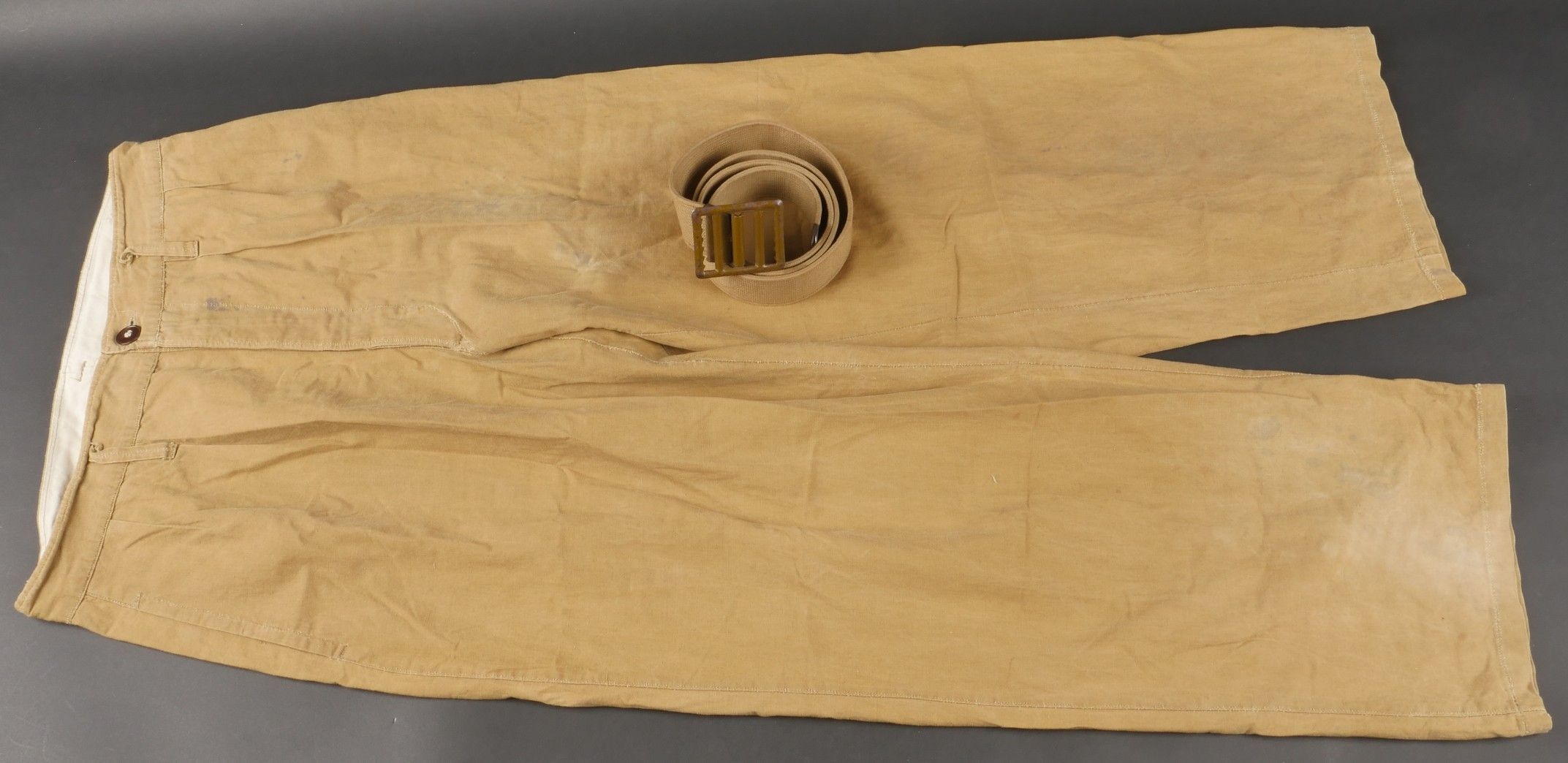 French prisoner trousers and belt. Rare pair of trousers distributed to prisoners released in August and September 1954. Made in China, the trousers are made of fine beige canvas with a fine ecru lining. The belt bears Chinese markings, a large buckle in olive paint copied from the American model. This belt belonged to Captain Liabeuf, who returned from the camps after being taken prisoner at Dien Bien Fhu. French prisoner trousers and belt. Rare issue for prisoners released in August and September 1954. Chinese made fine beige cotton with light lining. Belt with Chinese marking large olivepainted buckle copied from US model. Belonged to Captain Liabeuf returned from captivity after Dien Bien Phu.