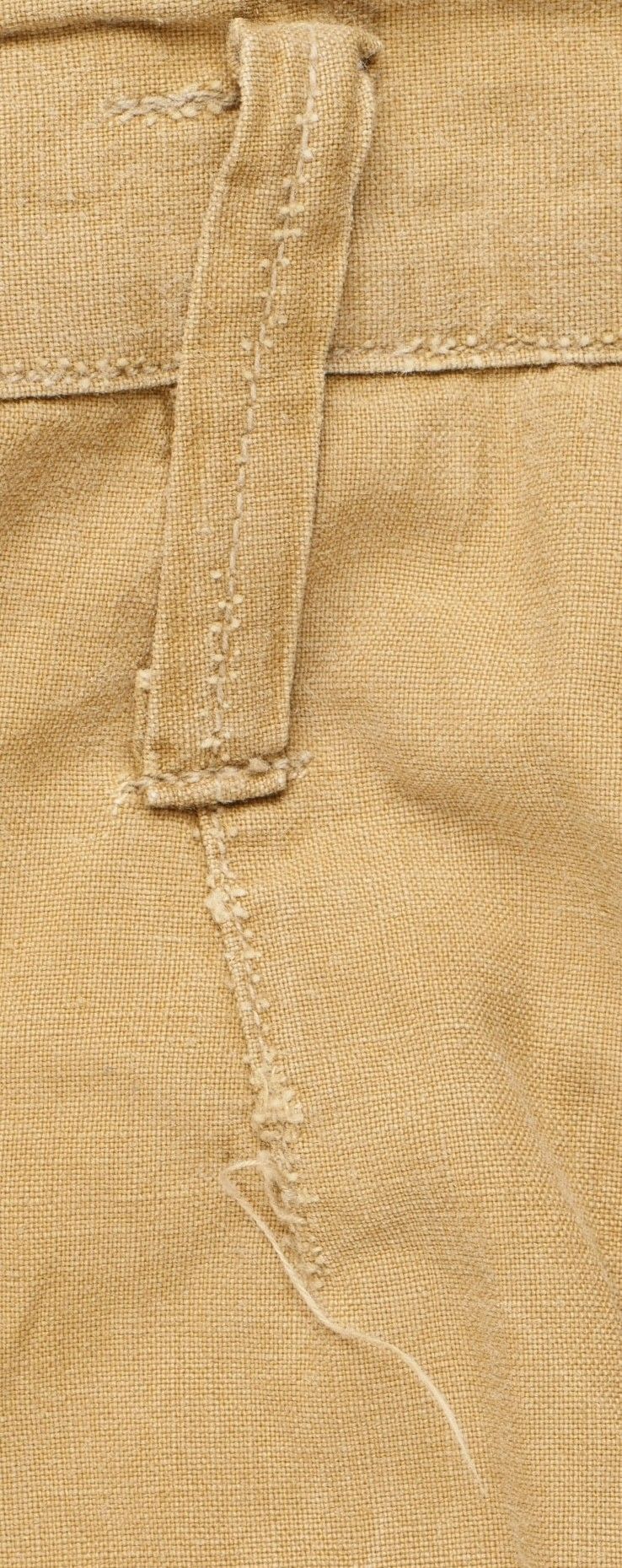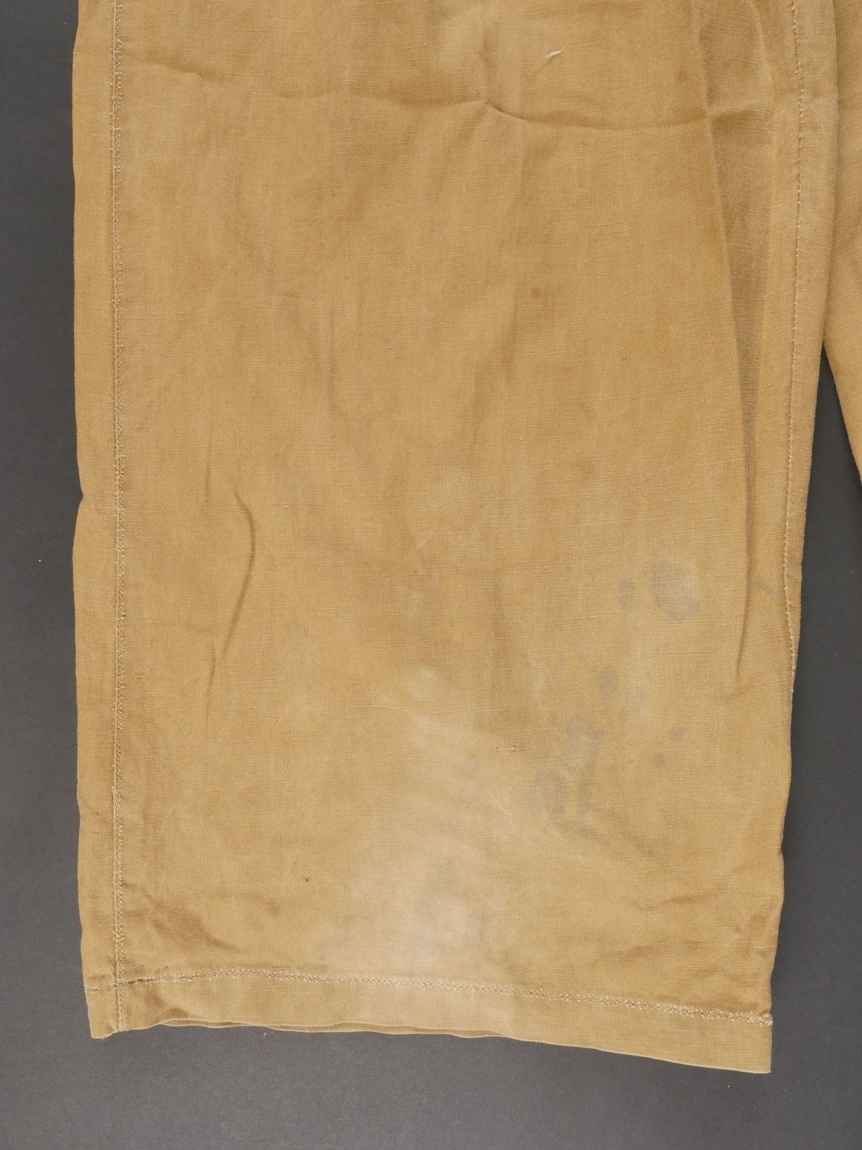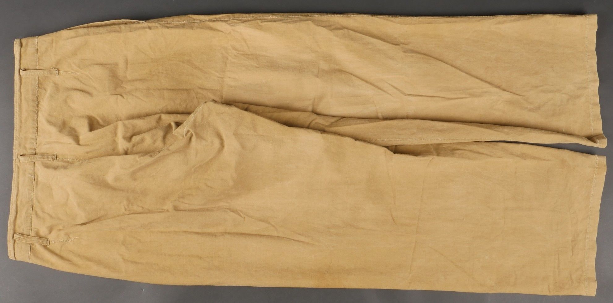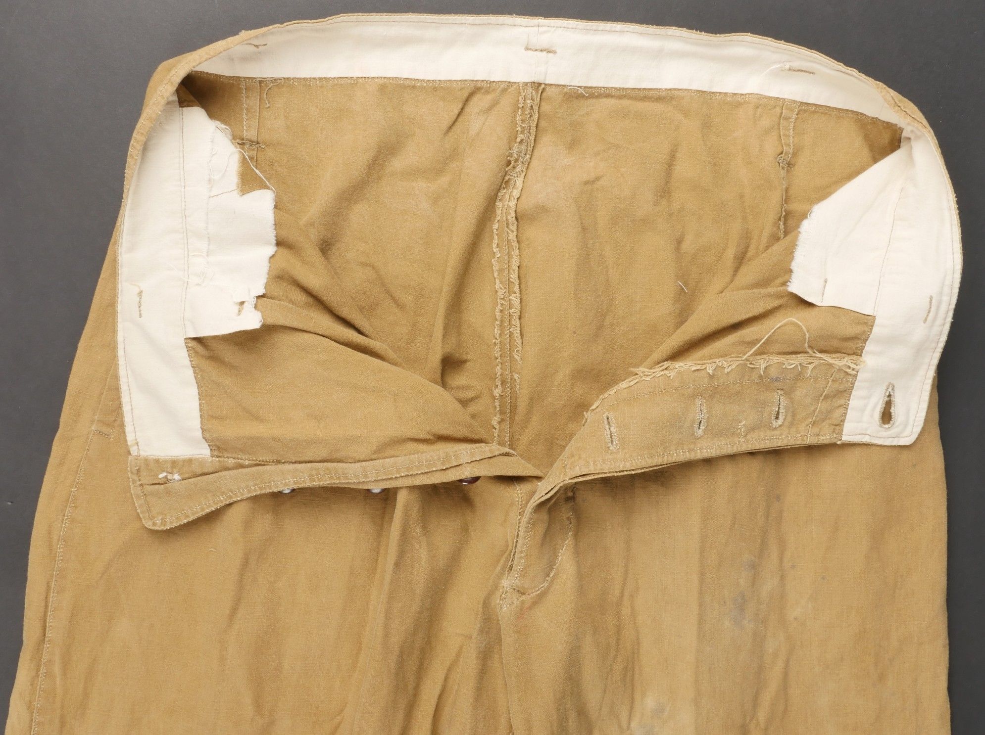 French prisoner trousers and belt. Rare pair of trousers distributed to prisoners released in August and September 1954. Made in China, the trousers are made of fine beige canvas with a fine ecru lining. The belt bears Chinese markings, a large buckle in olive paint copied from the American model. This belt belonged to Captain Liabeuf, who returned from the camps after being taken prisoner at Dien Bien Fhu. French prisoner trousers and belt. Rare issue for prisoners released in August and September 1954. Chinese made fine beige cotton with light lining. Belt with Chinese marking large olivepainted buckle copied from US model. Belonged to Captain Liabeuf returned from captivity after Dien Bien Phu.