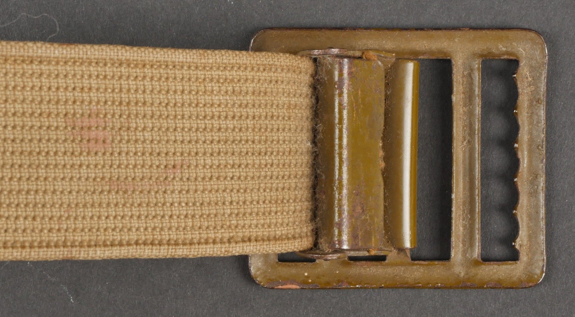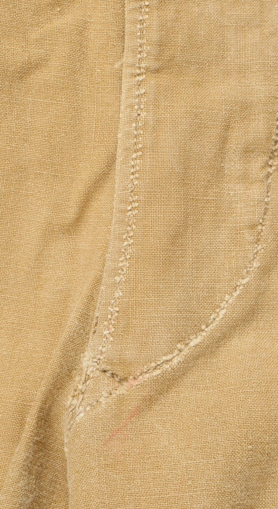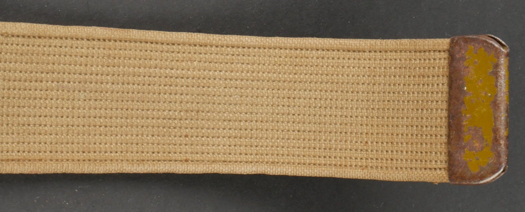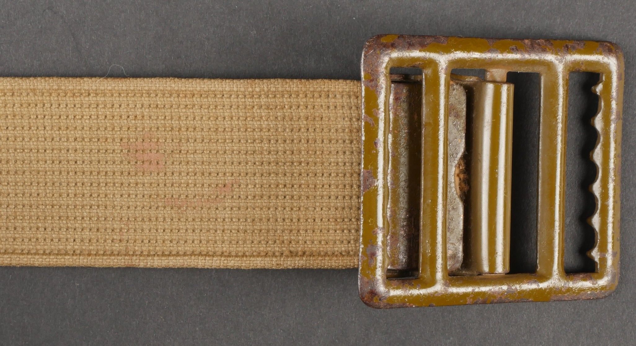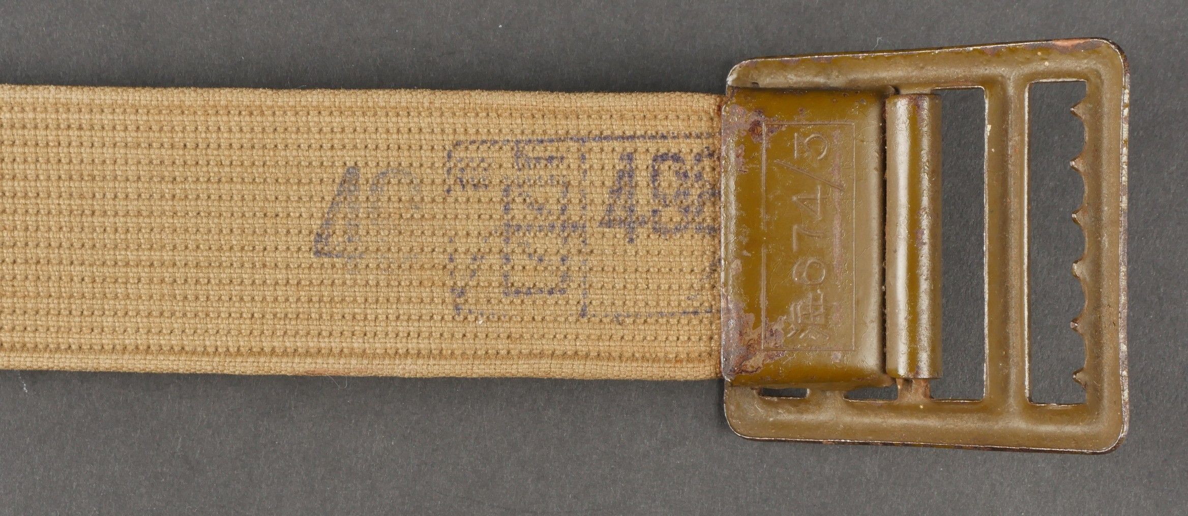 French prisoner trousers and belt. Rare pair of trousers distributed to prisoners released in August and September 1954. Made in China, the trousers are made of fine beige canvas with a fine ecru lining. The belt bears Chinese markings, a large buckle in olive paint copied from the American model. This belt belonged to Captain Liabeuf, who returned from the camps after being taken prisoner at Dien Bien Fhu. French prisoner trousers and belt. Rare issue for prisoners released in August and September 1954. Chinese made fine beige cotton with light lining. Belt with Chinese marking large olivepainted buckle copied from US model. Belonged to Captain Liabeuf returned from captivity after Dien Bien Phu.