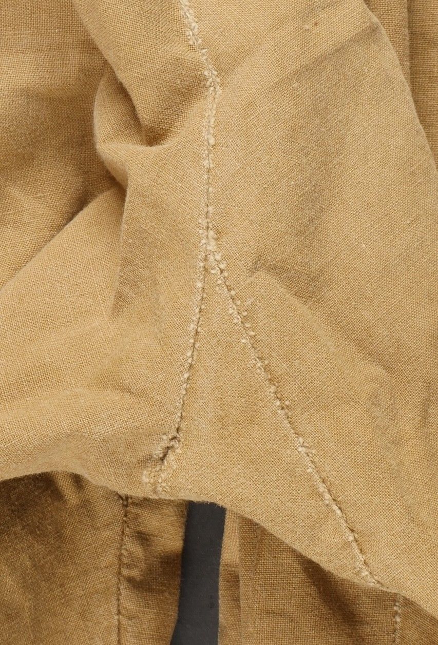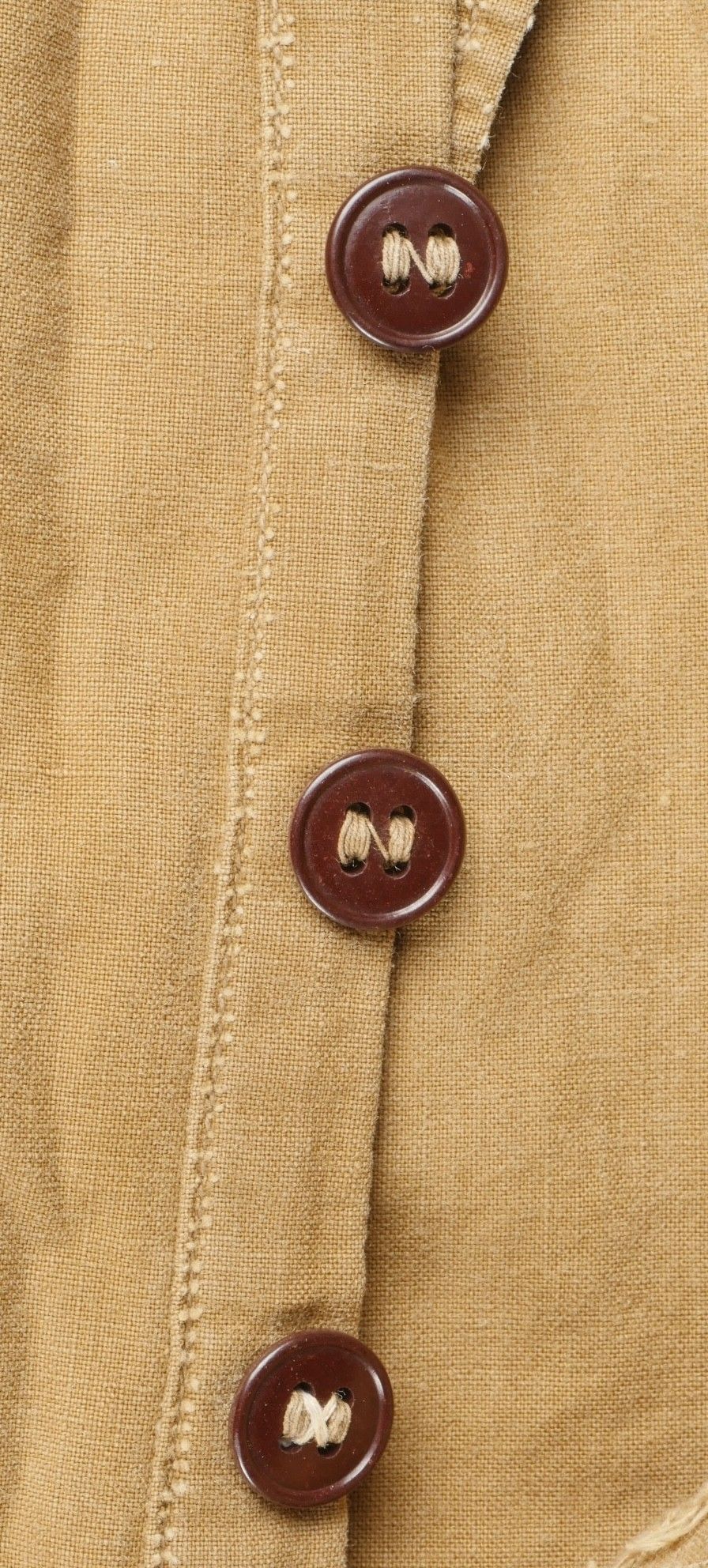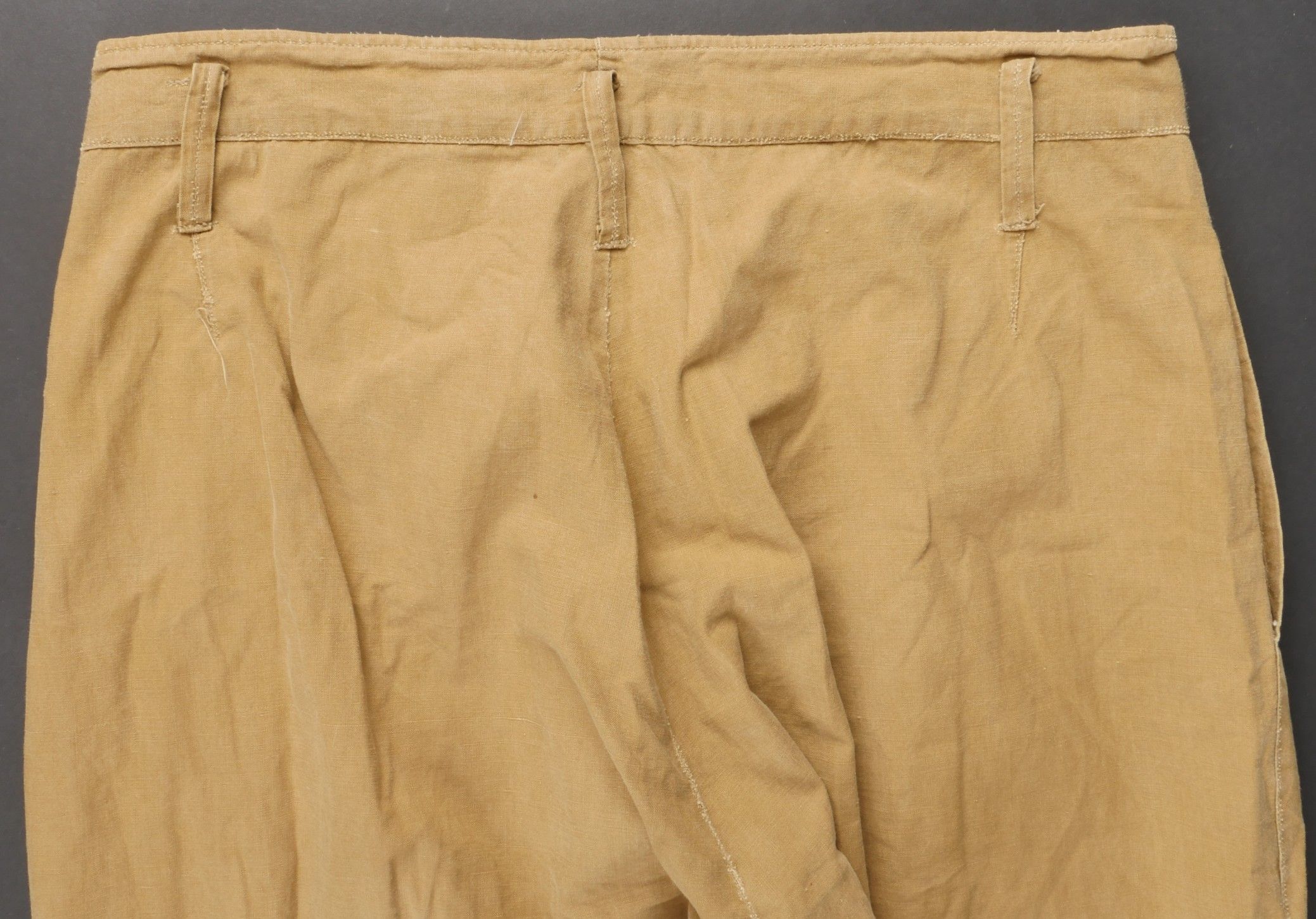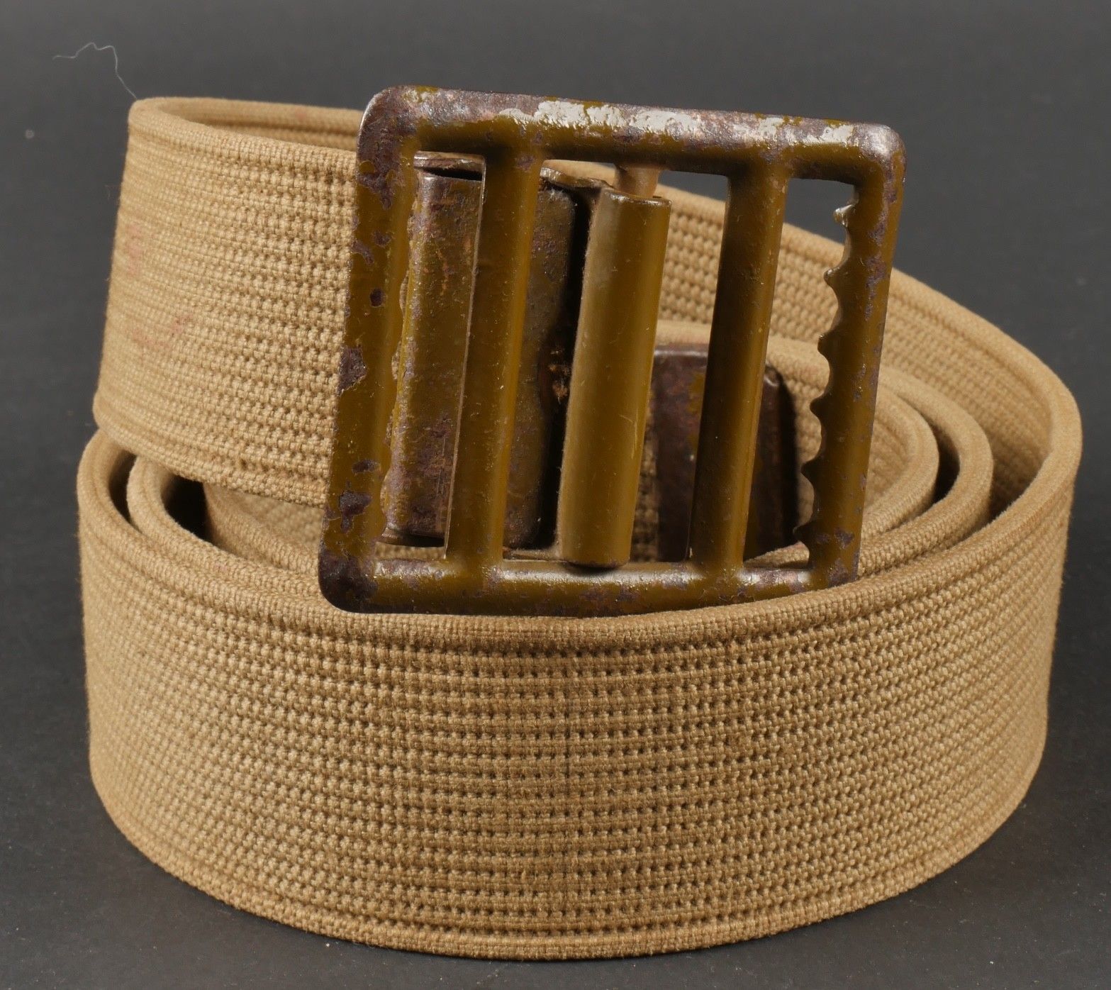 French prisoner trousers and belt. Rare pair of trousers distributed to prisoners released in August and September 1954. Made in China, the trousers are made of fine beige canvas with a fine ecru lining. The belt bears Chinese markings, a large buckle in olive paint copied from the American model. This belt belonged to Captain Liabeuf, who returned from the camps after being taken prisoner at Dien Bien Fhu. French prisoner trousers and belt. Rare issue for prisoners released in August and September 1954. Chinese made fine beige cotton with light lining. Belt with Chinese marking large olivepainted buckle copied from US model. Belonged to Captain Liabeuf returned from captivity after Dien Bien Phu.