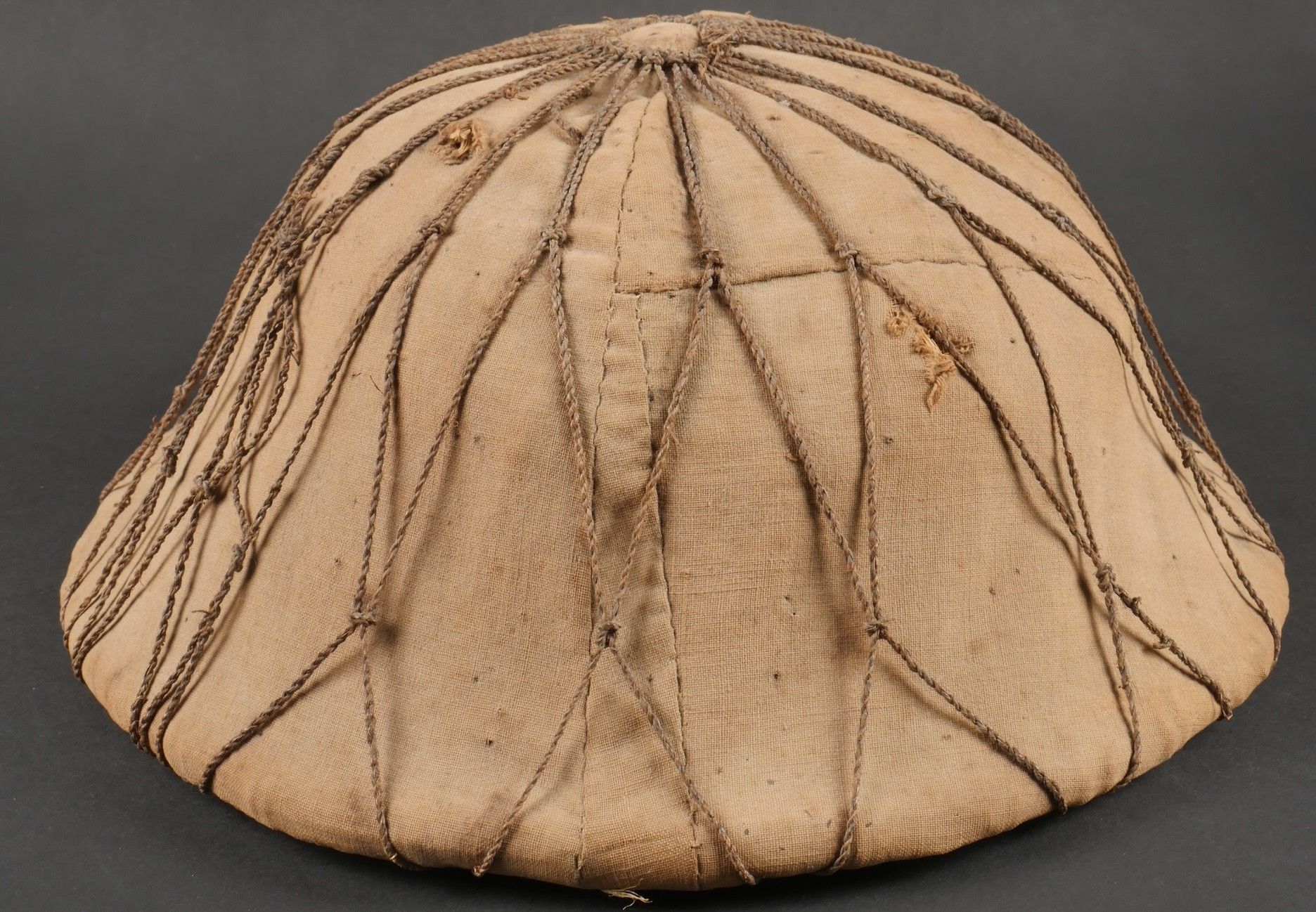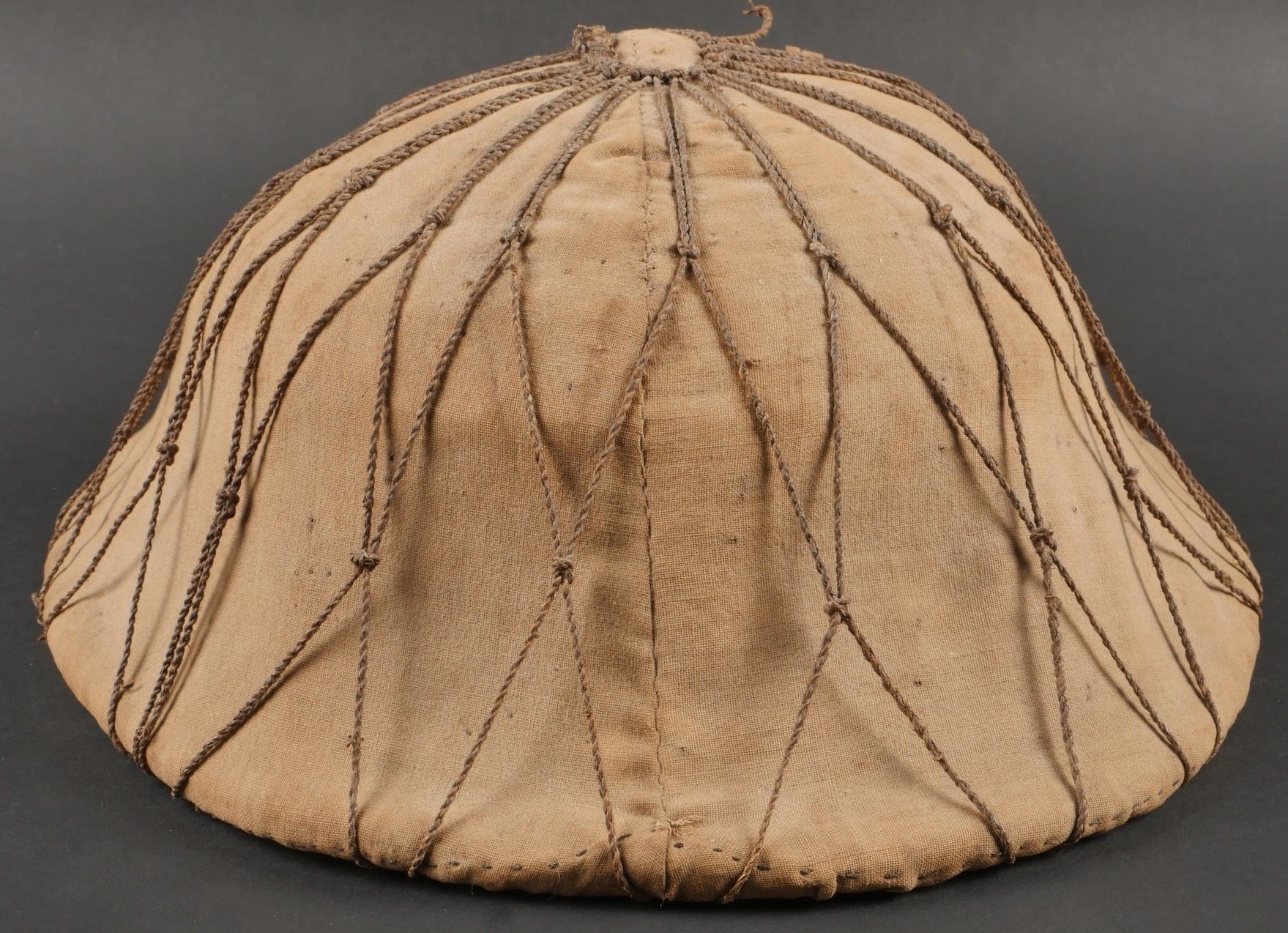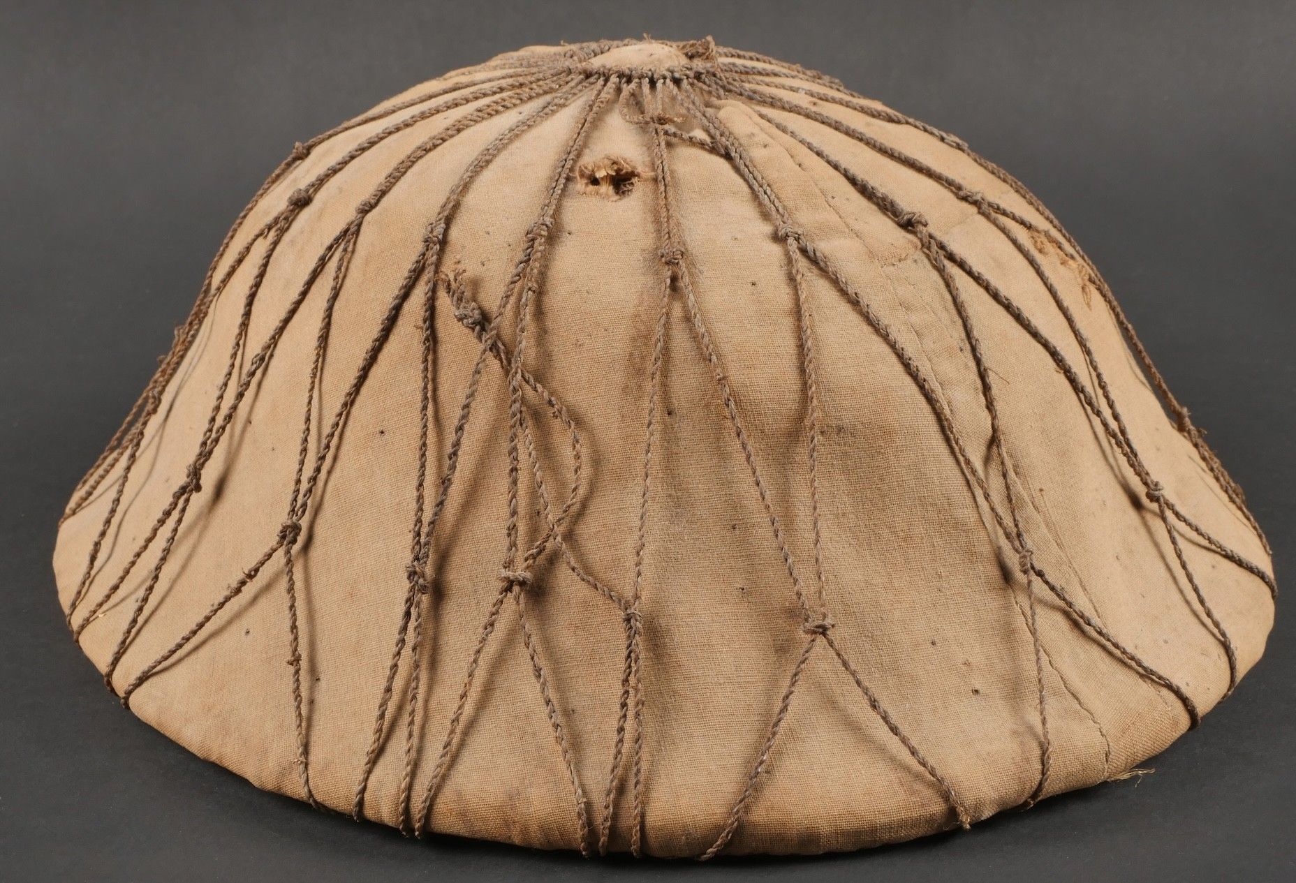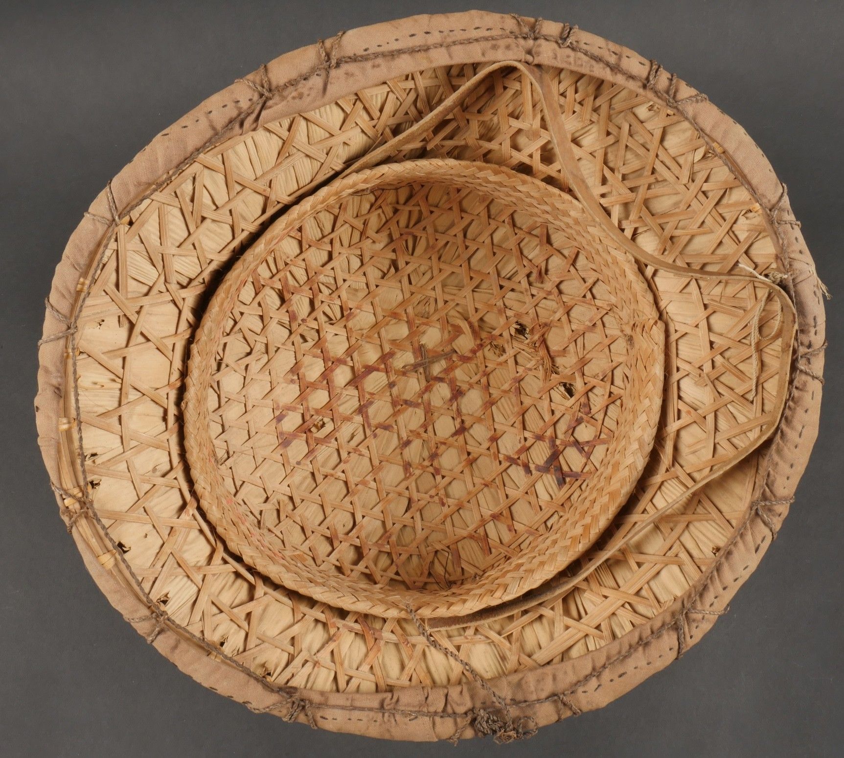 Vietminh impact helmet. Helmet made of woven rice straw covered with khaki canvas and Japanese netting. Small leather chinstrap, the whole has been pierced by a bullet and still has traces of blood inside. It bears the inscription Côloâ 2 1953. This helmet was brought back by nurse Denise Chanut, who served in Indochina. Viet Minh helmet with impact. Helmet made of woven rice straw covered with khaki cloth and Japanese netting. Small leather chinstrap. Pierced by a projectile with blood traces inside. Inscription reads Côloâ 2 1953. Brought back by nurse Denise Chanut who served in Indochina.