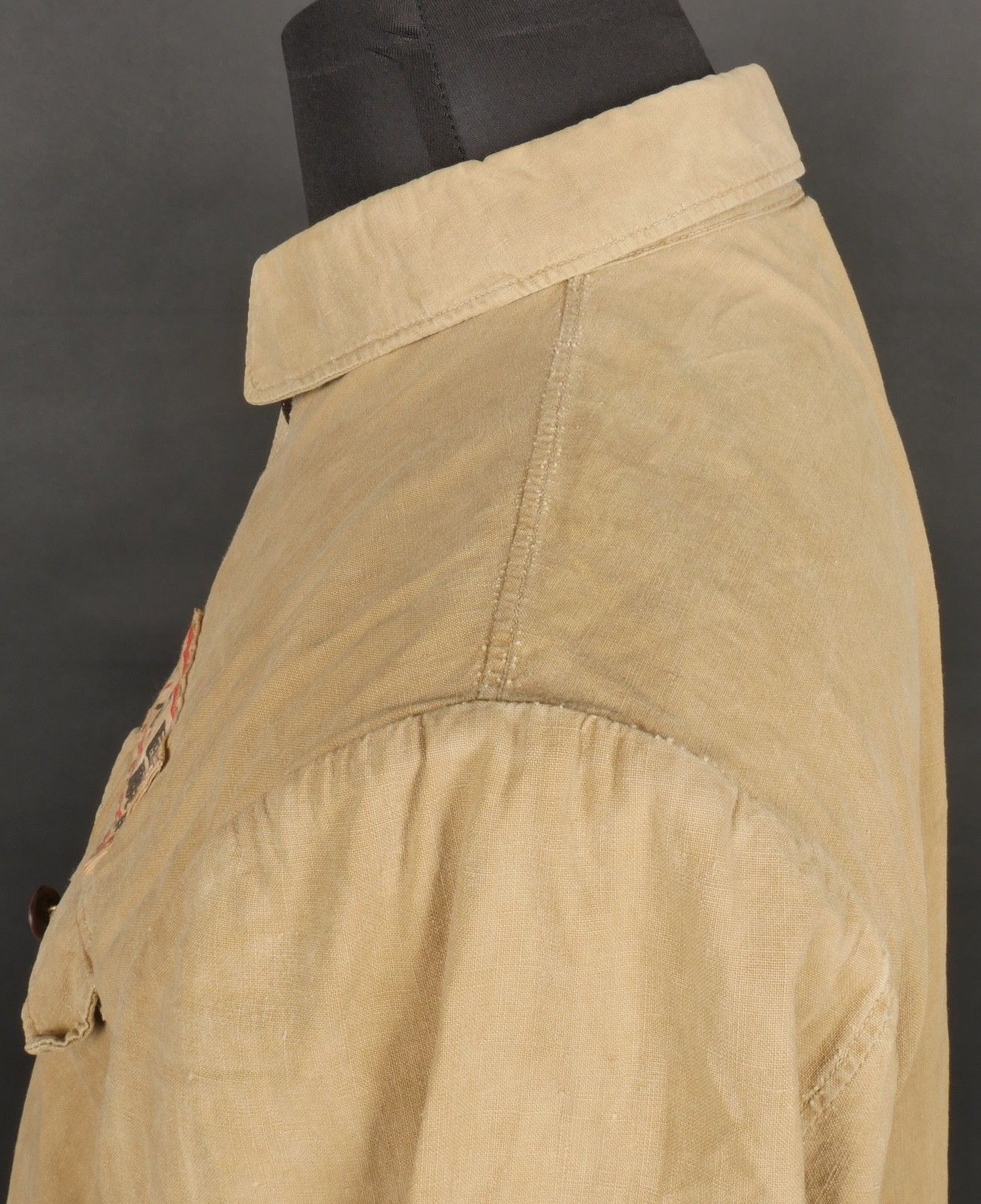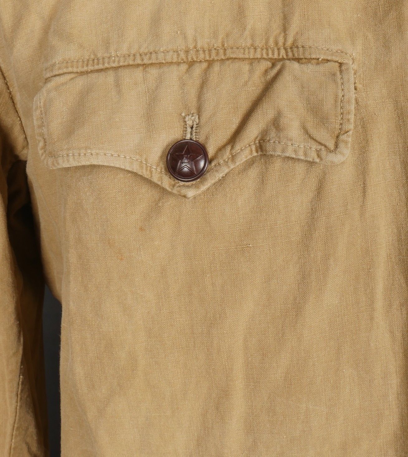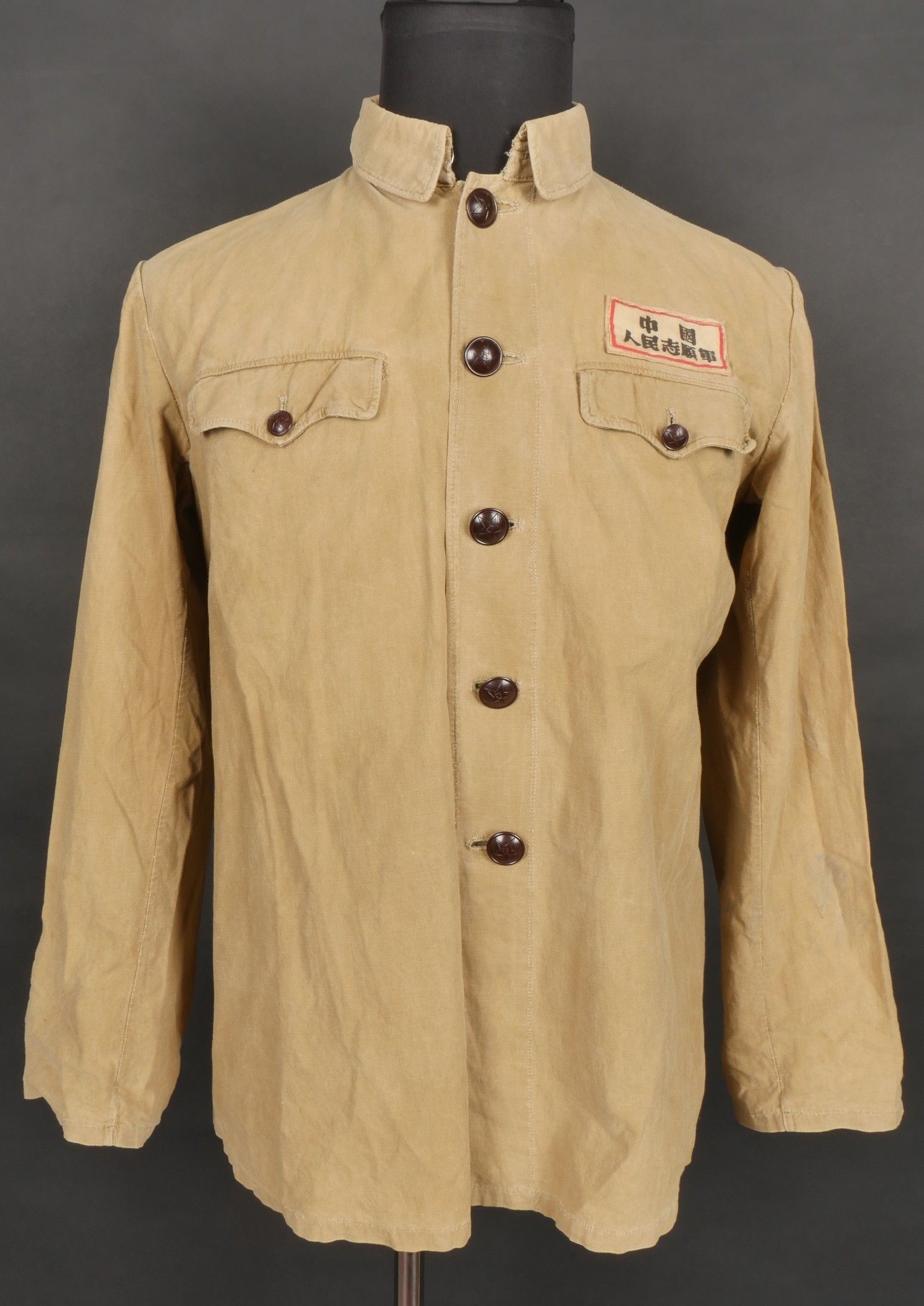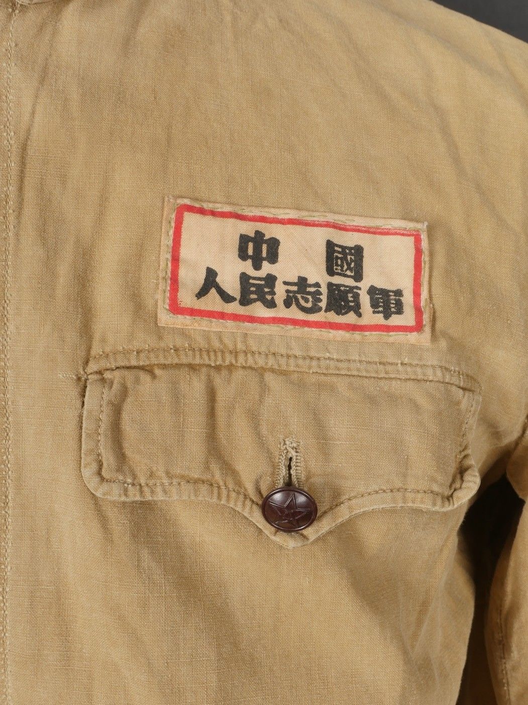 Chinese people's volunteer shirt. Troop shirt with two pockets and five Chinese army buttons. Original sewn-on canvas patch above left breast pocket. Chinese People's Volunteer shirt. Soldier's shirt with two pockets closing with five Chinese Army buttons. Original cloth insignia sewn above the left breast pocket.