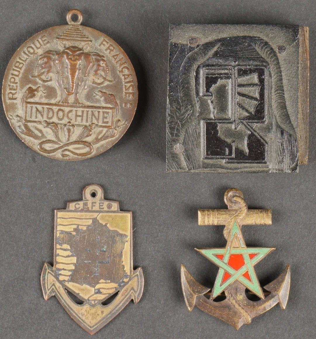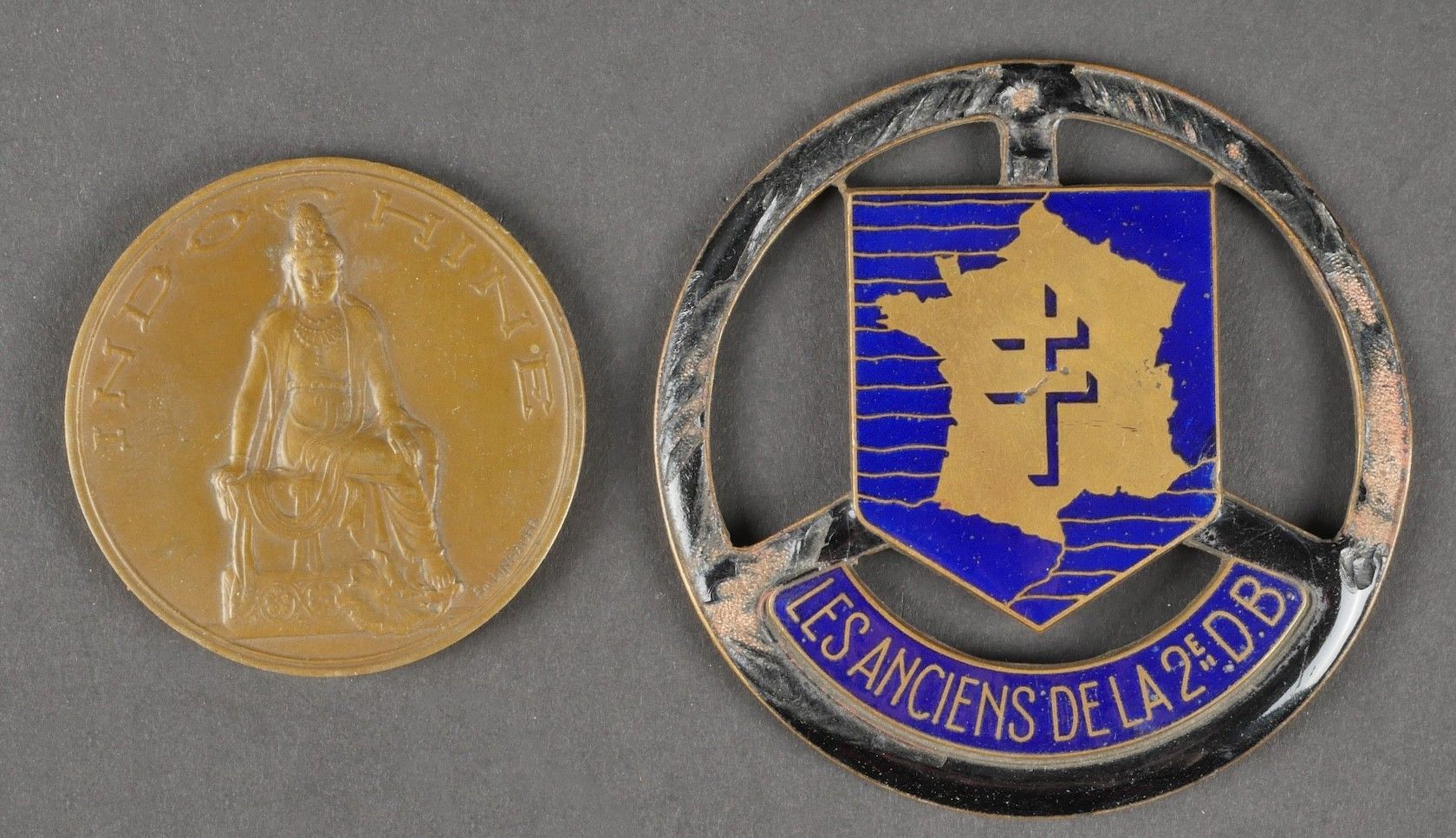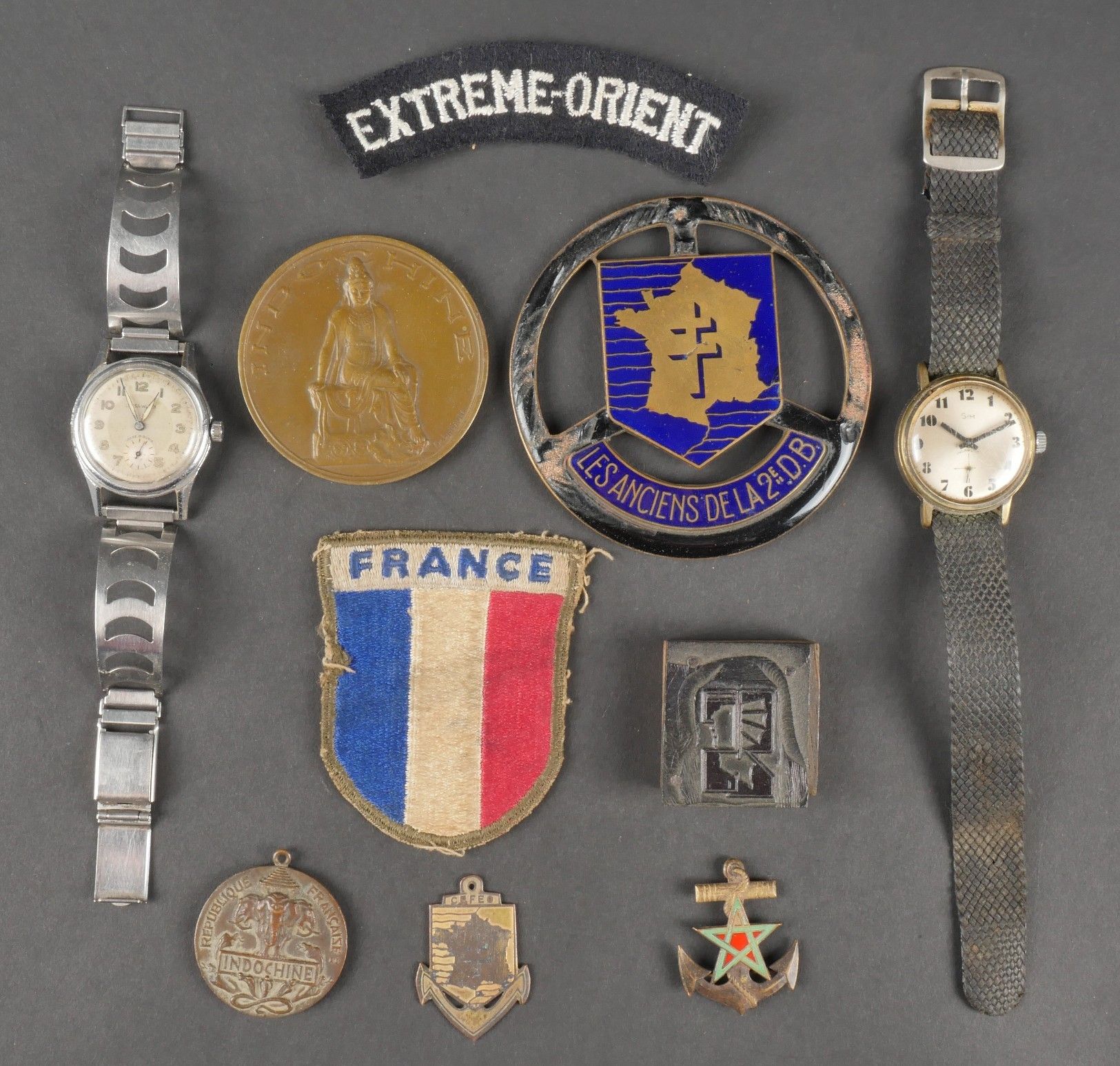 Lot of various badges. Comprising a 2nd DB veterans' car badge, a Far East shoulder title, an Indochina medal by Lindauer in bronze, an Indochina commemorative medal without ribbon, a France fabric patch, a CEFEO badge without attachment, badge matrix stamp. Two watches are included, one a Sim watch. Assorted insignia lot. Includes a 2nd Armored Division veteran car badge a Far East shoulder title an Indochina medal by Lindauer in bronze an Indochina commemorative medal without ribbon a France cloth patch a CEFEO badge without pin and a die stamp of an insignia. Also includes two watches one marked Sim.