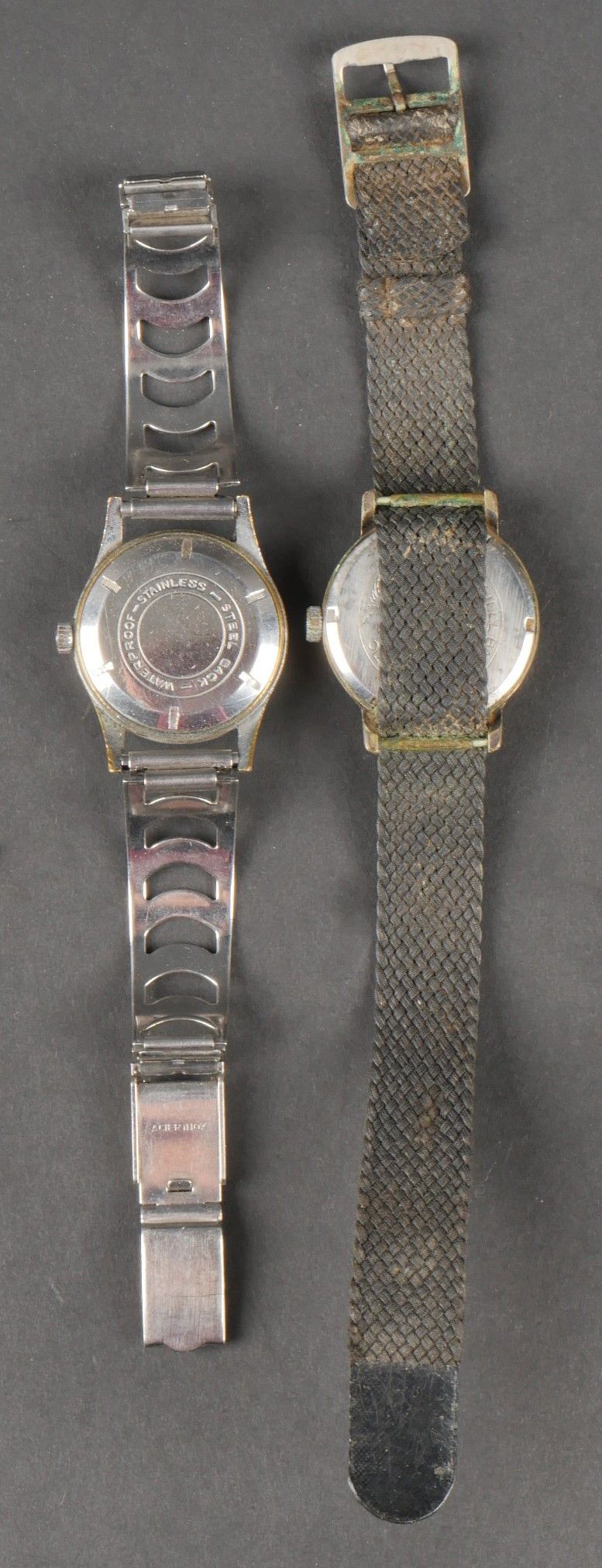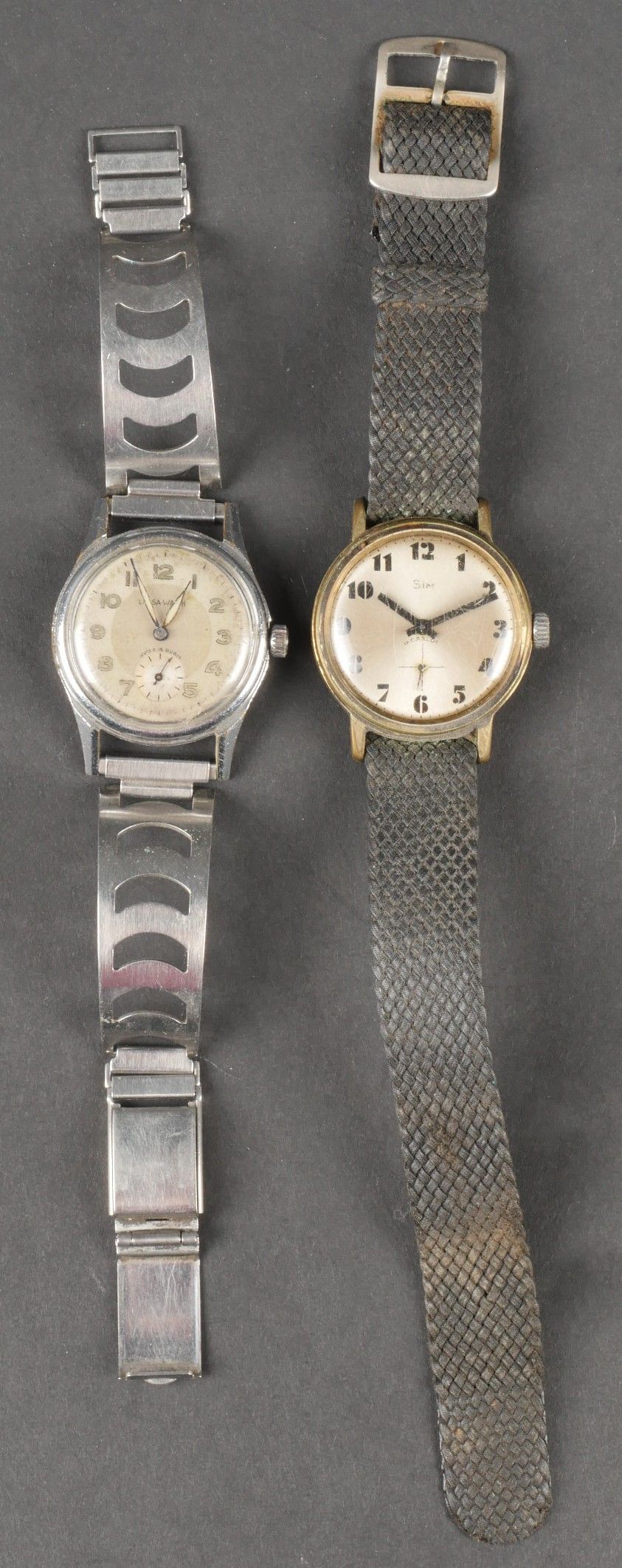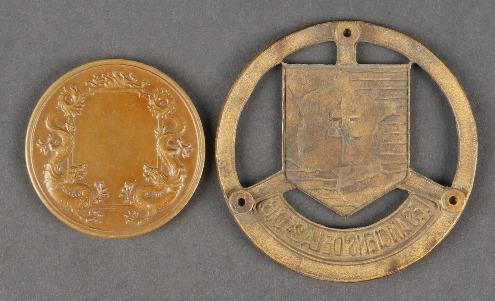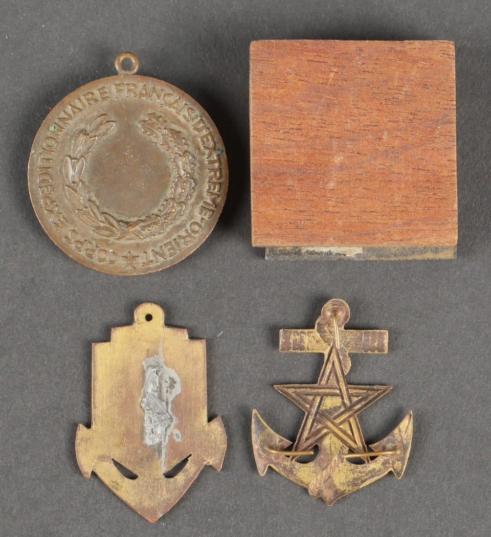 Lot of various badges. Comprising a 2nd DB veterans' car badge, a Far East shoulder title, an Indochina medal by Lindauer in bronze, an Indochina commemorative medal without ribbon, a France fabric patch, a CEFEO badge without attachment, badge matrix stamp. Two watches are included, one a Sim watch. Assorted insignia lot. Includes a 2nd Armored Division veteran car badge a Far East shoulder title an Indochina medal by Lindauer in bronze an Indochina commemorative medal without ribbon a France cloth patch a CEFEO badge without pin and a die stamp of an insignia. Also includes two watches one marked Sim.