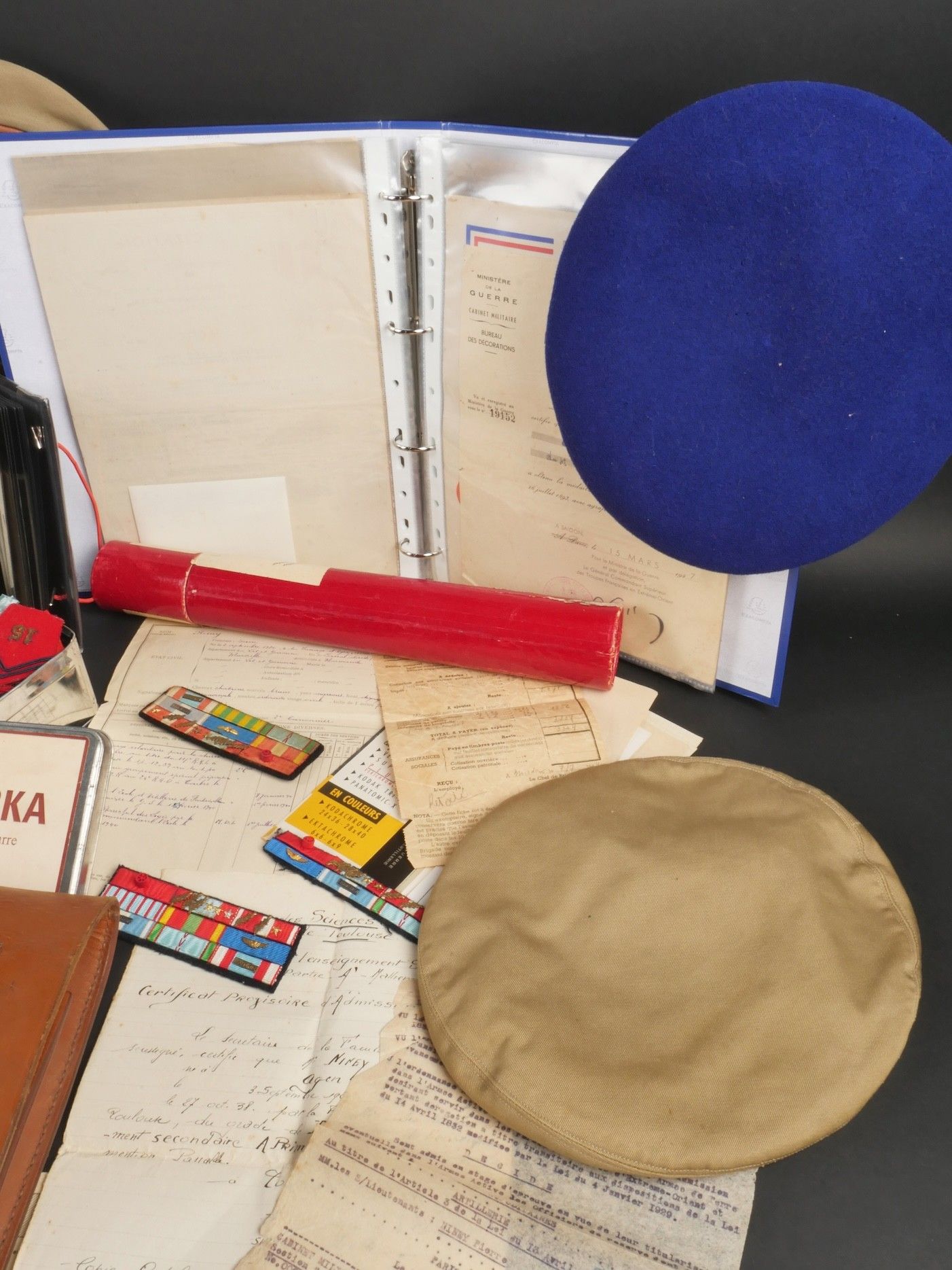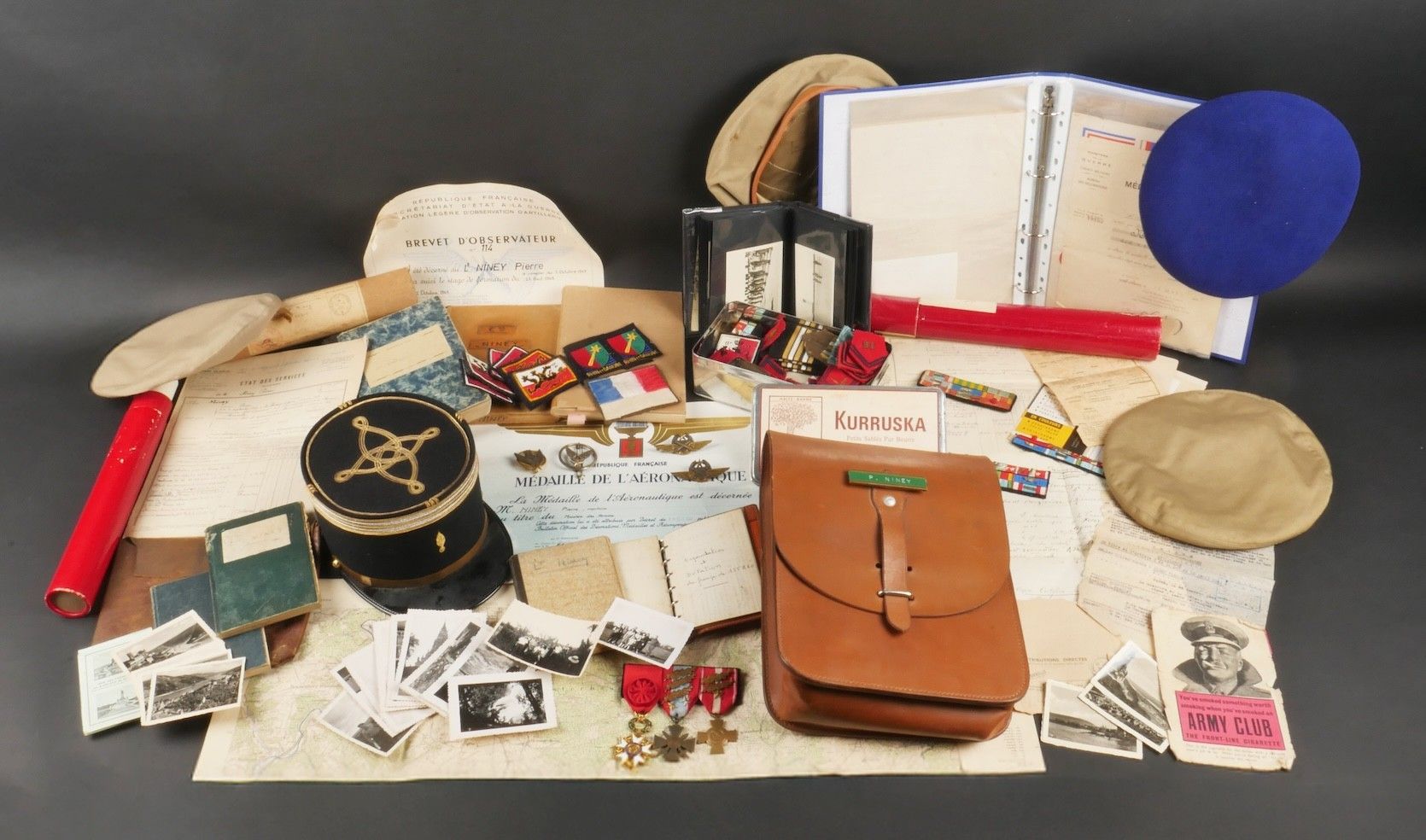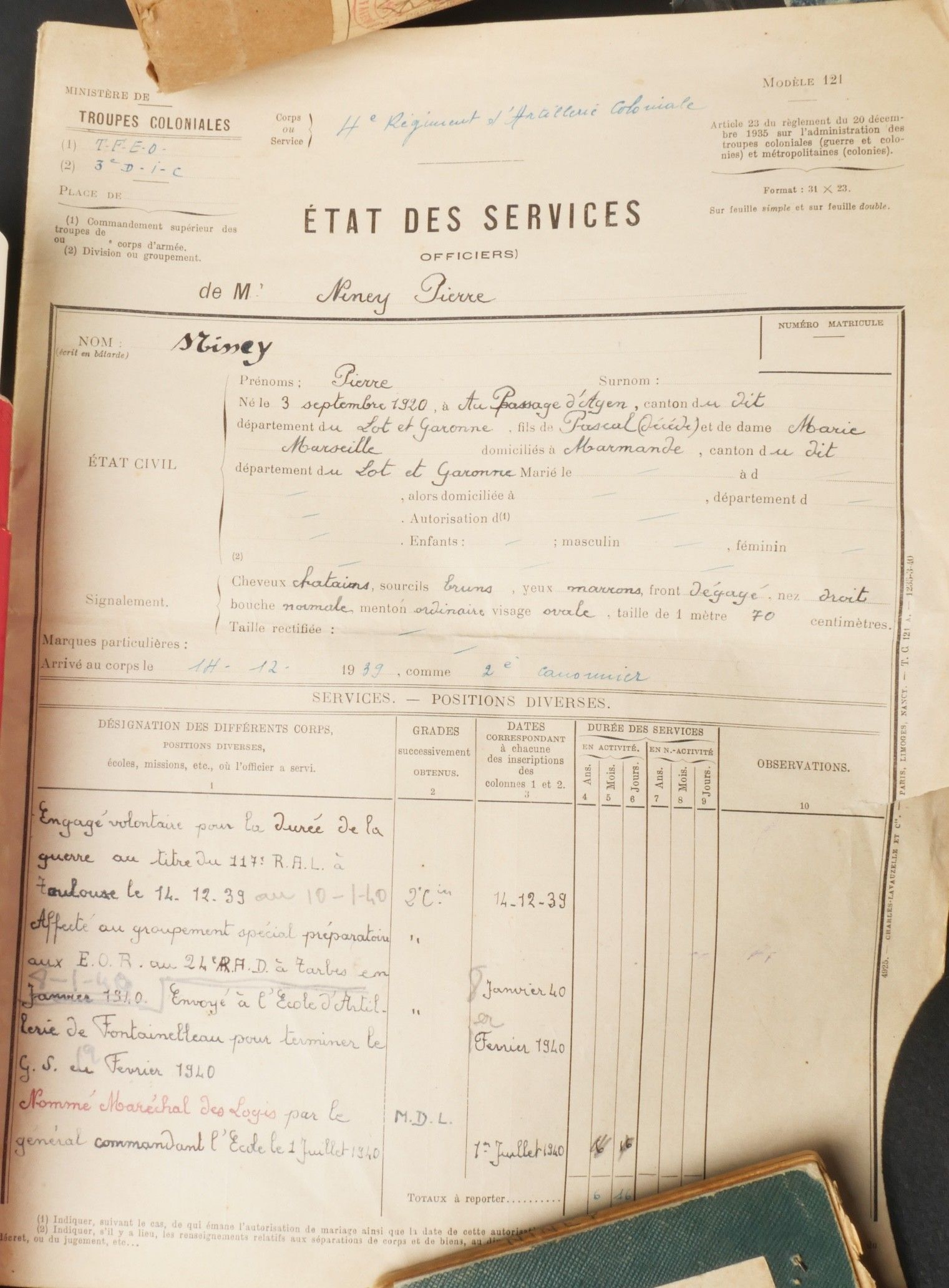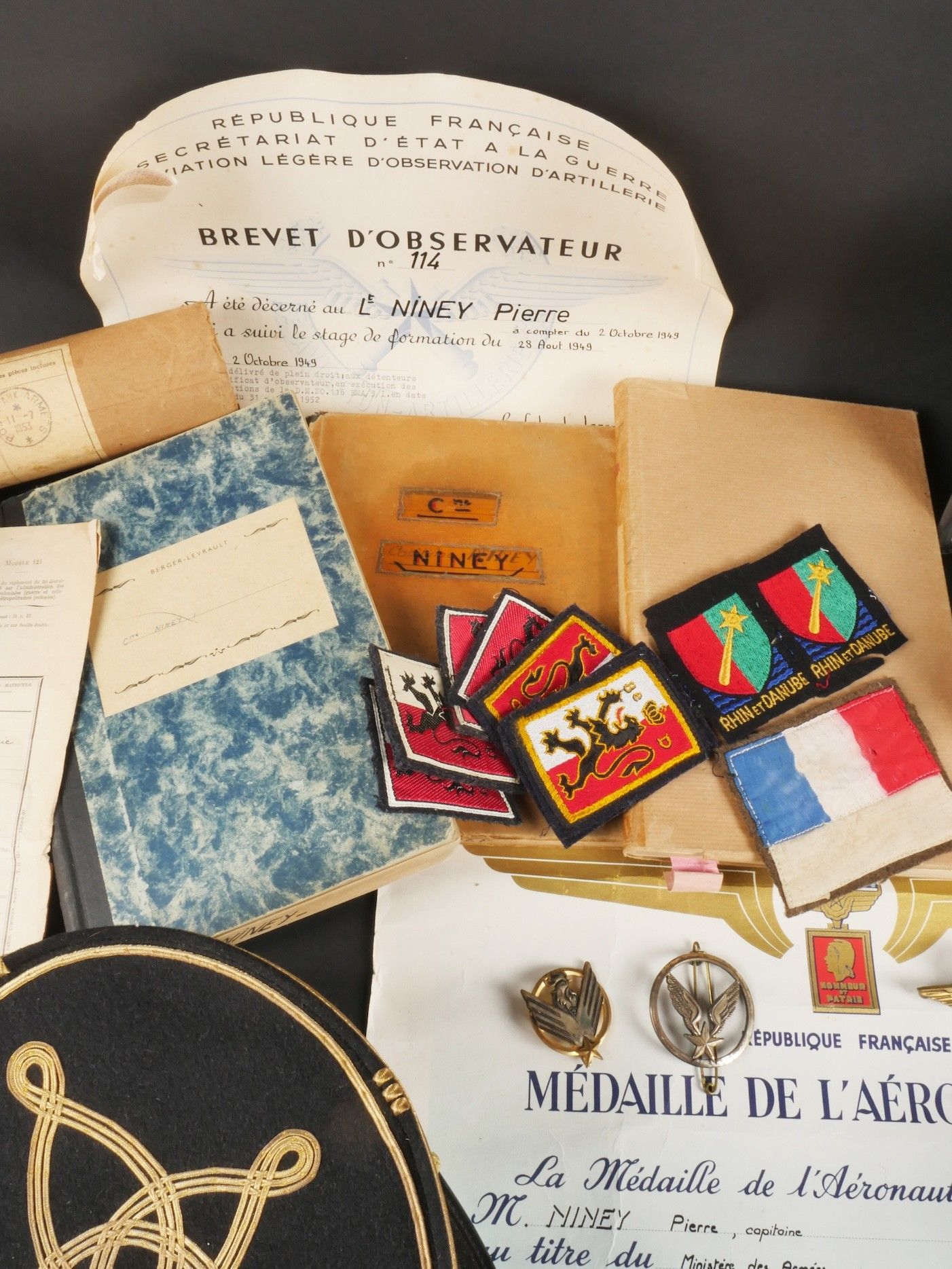 Indochina artillery observation group set. This exceptional set belonged to Pierre Niney and includes a number of documents, including six relating to the Naval Medical Corps School where he began his military career in 1936, as well as ten documents relating to his time as an assistant in Group 4 of the Chantiers de Jeunesse and his blank individual record book for the class of 1940. After a spell in the Resistance with the Corps Franc Pommiès, he was drafted into the 10th RAC in 1945 and left for Indochina in 1946. His certificate of membership of the FFI, dated June 1949, and various documents confirming his presence in the Far East during his time in the Vaicos sector are on display. His commendation in the army order awarded to the divisional artillery of the 3rd DIC as well as a commendation in the army order when he was a lieutenant in the 22nd GAOA and took part in missions in 1950 in Ap La Bang, a second commendation for missions carried out from 1950 to 1951 in Tonkin, a normal army corps commendation for operations carried out in 1952, his diploma of the colonial medal awarded in 1947 within the 4th RAC as a second lieutenant. Pierre Niney continued his career in Algeria and received a citation for his military valour cross when he was with the 2nd PMAH. His Algerian War commemorative diploma completes the set. His fabric insignia, including ten artillery observation group arm lozenges, four pairs of collar tabs, eight eighth division insignia, two embroidered Rhine and Danube insignia, the tricolour insignia he wore in the Pommiès free corps, two pairs of Lieutenant Colonel epaulettes and a breast rank, and four decoration reminders. His metal badges, including his Drago Metra artillery observer's licence numbered 105, a second Drago Metra licence numbered 12, various beret badges, his aeronautics medal in its case, a badge from the first aircraft platoon of the 12th Infantry Division, a cabinet of decorations including his Légion d'Honneur, his TOE war cross with three palms and two stars, his military valour with two palms and one star. An album containing around thirty photos, including seven taken during youth work camps and twelve taken during the Indochina War. His paper diploma of observer's licence number 114 awarded in 1949 in his tube. His Légion d'Honneur officer's diploma dated 1963 in an incomplete tube. His diploma of the Légion d'Honneur in the grade of chevalier dated 1958 in its tube and his diploma of the medal of aeronautics awarded in 1964. His brown leather card holder containing six flight logs, the first of which was opened in August 1949 until August 1951, the second from August 1951 until May 1955, the third from May 1955 to January 1956, the fourth from 1956 to 1961, the fifth an individual air service log opened in October 1961 until 1970 and the last from 1971 to 1972. A leather pouch containing some fifteen photo cards and photographs as well as various pay slips and civilian documents, a Baumholder camp sector flight card and two service record cards. Sn képi d lieutenant colonel d'artillerie de fabrication années 1970, ses bérets en toile beige en trois parties des années 19501960 et son béret de l'Alat de fabrication tailleur. Indochina Artillery Observation Group set. Exceptional grouping belonging to Pierre Niney including numerous documents related to his service at the Naval Medical School where he began his career in 1936 and ten documents referring to his time with Youth Work Group No 4 as assistant plus his unused 1940 draft booklet. After serving in the Resistance with Corps Franc Pommiès he joined the 10th RAC in 1945 and went to Indochina in 1946. Includes FFI membership certificate June 1949 various papers from his Far East service in the Vaicos sector citation to the Army Order for the 3rd DIC divisional artillery and another Army citation as lieutenant with the 226th GAOA for missions in 1950 at Ap La Bang a second citation for missions from 1950 to 1951 in Tonkin and a corps citation for 1952 operations. Colonial Medal diploma awarded in 1947 as second lieutenant 4th RAC. Continued career in Algeria with War Cross for Military Valor citation. Also includes commemorative Algerian War diploma numerous cloth insignia including ten artillery observation group diamonds four collar tabs eight 8th Division patches two Rhin et Danube badges his tricolor Corps Franc Pommiès badge two pairs of lieutenant colonel shoulder boards chest rank badge and four ribbon bars. Metal insignia include Drago Metra artillery observer badge no 105 another Drago Metra no 12 various beret badges Air Medal in case first pilot badge 12th DI badge and a decoration bar with Légion d'Honneur Croix de Guerre TOE three palms and two stars Military Valor Cross two palms and one star. Album of about thirty photographs twelve from Indochina. Paper certificate for observer's brevet no 114 dated 1949 in tube. Légion d'Honneur officer diploma 1963 chevalier diploma 1958 Air Medal diploma 1964. Brown leather map case containing six flight logs covering 1949-1972 leather pouch with about fifteen photo cards service and pay documents flight map of Baumholder camp and two service record sheets. His lieutenant colonel artillery kepi 1970s manufacture three beige cloth berets 1950s-60s and tailormade ALAT beret.