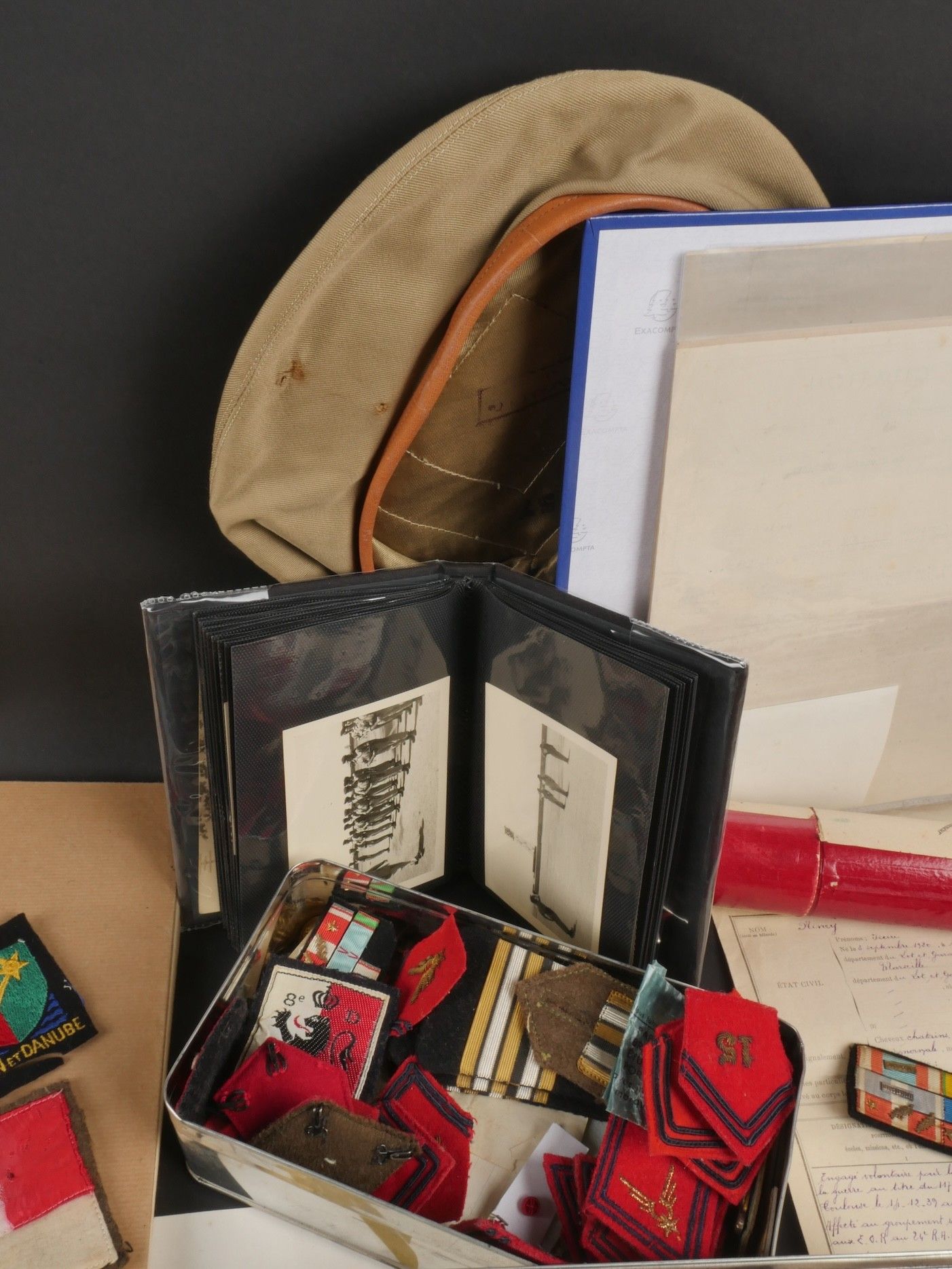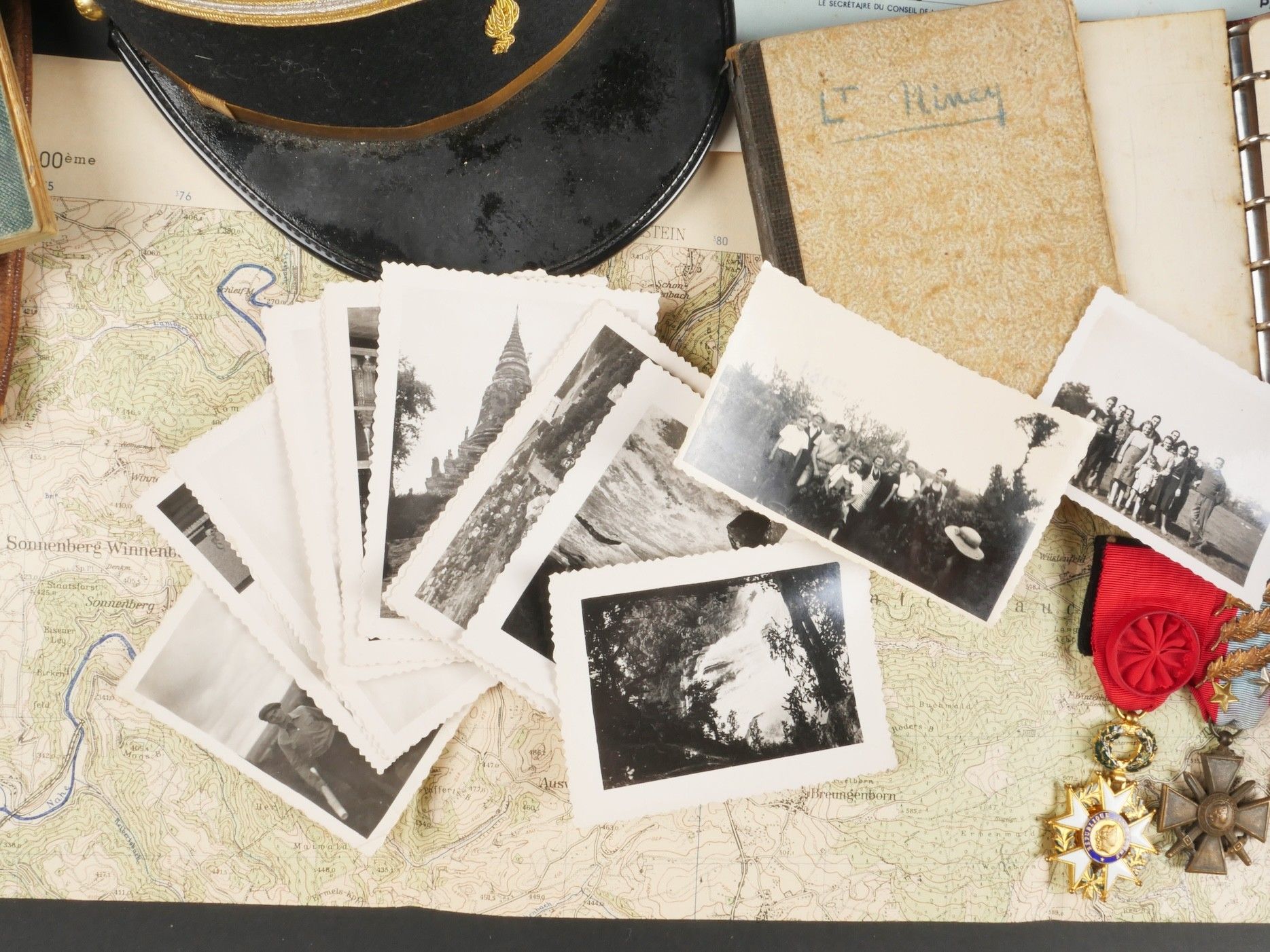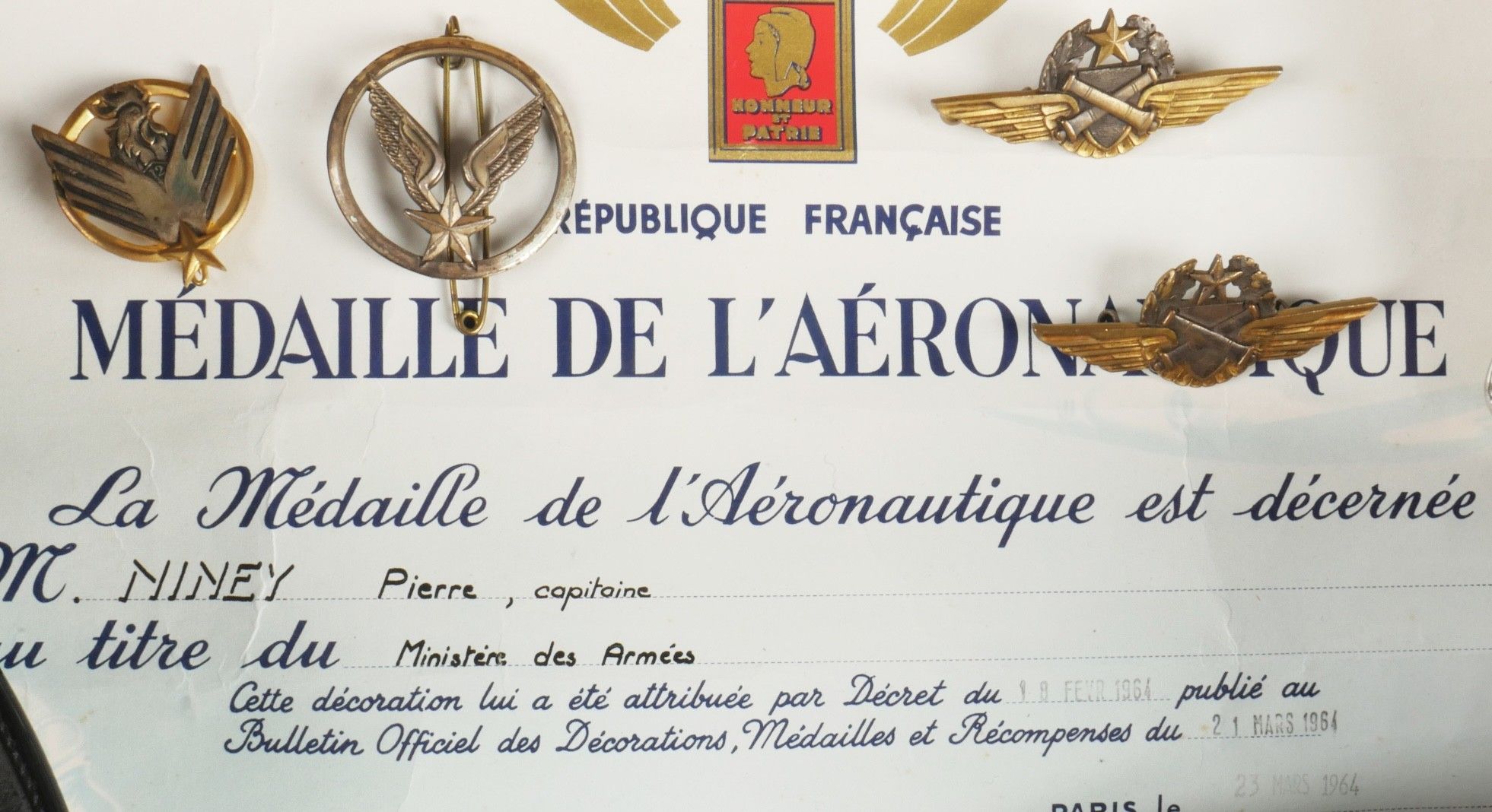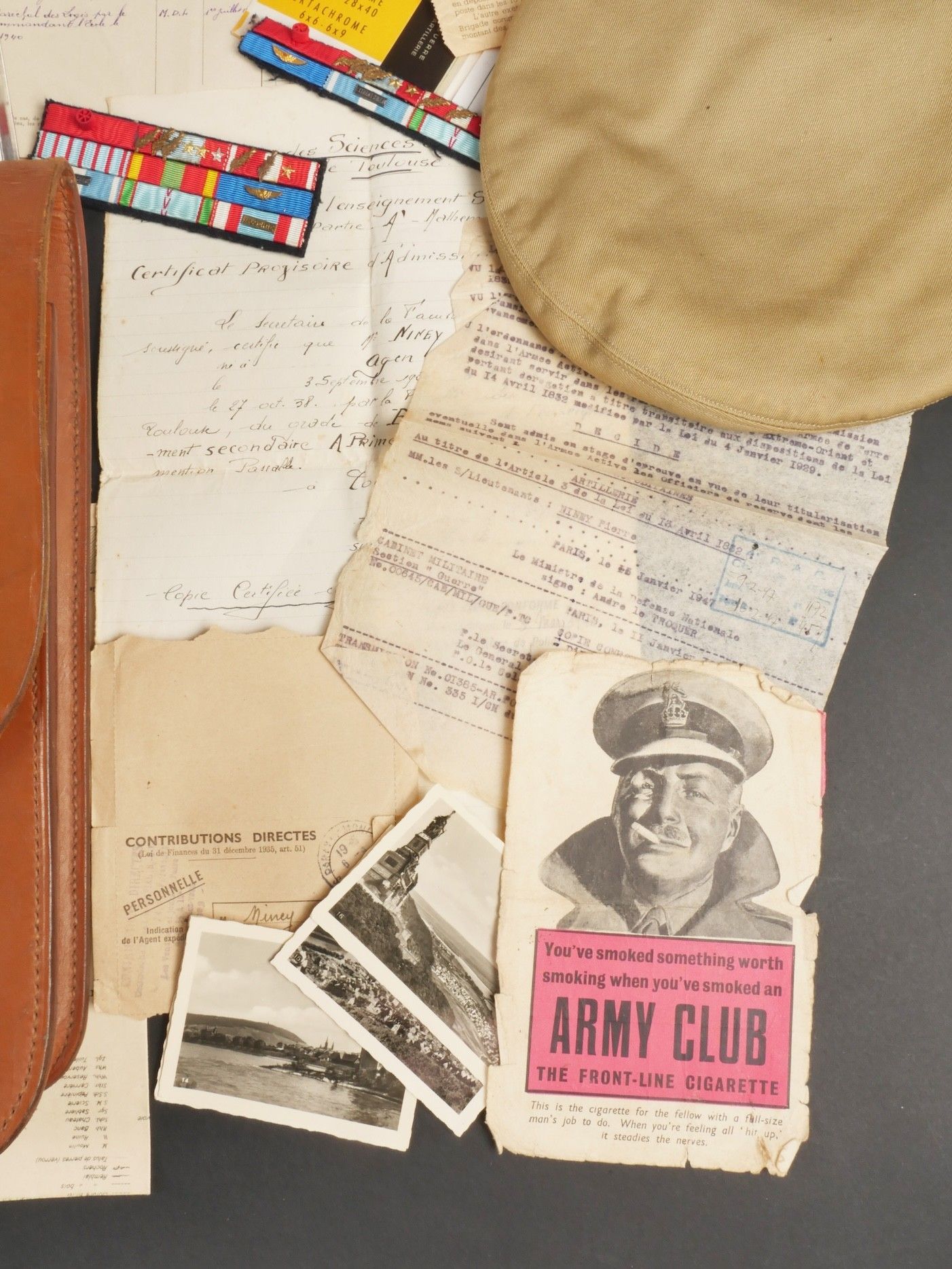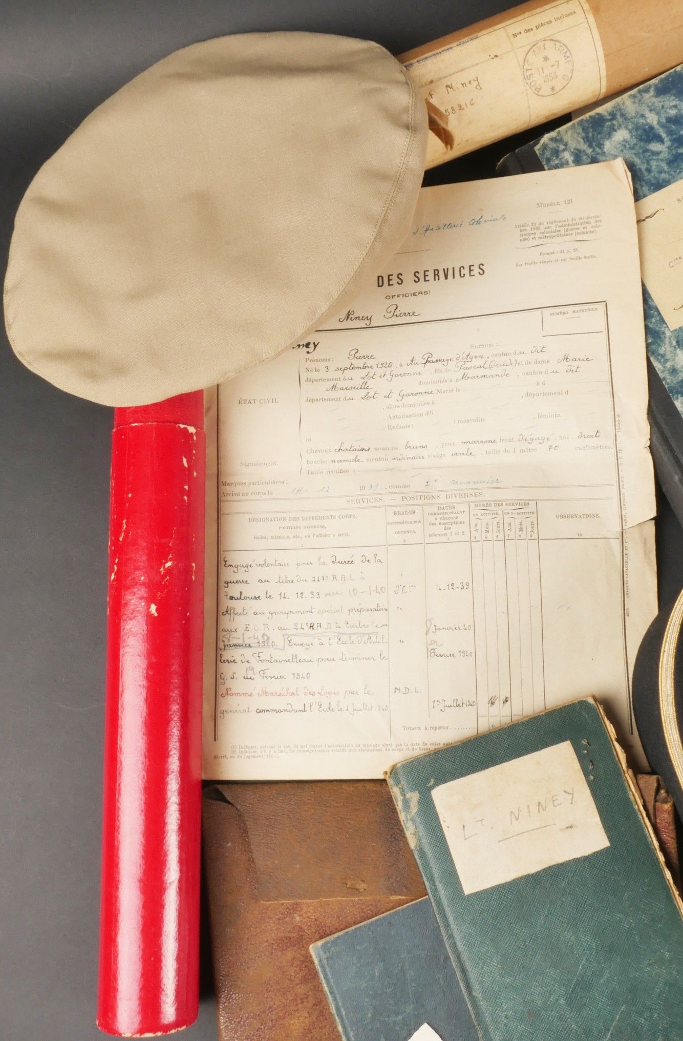 Indochina artillery observation group set. This exceptional set belonged to Pierre Niney and includes a number of documents, including six relating to the Naval Medical Corps School where he began his military career in 1936, as well as ten documents relating to his time as an assistant in Group 4 of the Chantiers de Jeunesse and his blank individual record book for the class of 1940. After a spell in the Resistance with the Corps Franc Pommiès, he was drafted into the 10th RAC in 1945 and left for Indochina in 1946. His certificate of membership of the FFI, dated June 1949, and various documents confirming his presence in the Far East during his time in the Vaicos sector are on display. His commendation in the army order awarded to the divisional artillery of the 3rd DIC as well as a commendation in the army order when he was a lieutenant in the 22nd GAOA and took part in missions in 1950 in Ap La Bang, a second commendation for missions carried out from 1950 to 1951 in Tonkin, a normal army corps commendation for operations carried out in 1952, his diploma of the colonial medal awarded in 1947 within the 4th RAC as a second lieutenant. Pierre Niney continued his career in Algeria and received a citation for his military valour cross when he was with the 2nd PMAH. His Algerian War commemorative diploma completes the set. His fabric insignia, including ten artillery observation group arm lozenges, four pairs of collar tabs, eight eighth division insignia, two embroidered Rhine and Danube insignia, the tricolour insignia he wore in the Pommiès free corps, two pairs of Lieutenant Colonel epaulettes and a breast rank, and four decoration reminders. His metal badges, including his Drago Metra artillery observer's licence numbered 105, a second Drago Metra licence numbered 12, various beret badges, his aeronautics medal in its case, a badge from the first aircraft platoon of the 12th Infantry Division, a cabinet of decorations including his Légion d'Honneur, his TOE war cross with three palms and two stars, his military valour with two palms and one star. An album containing around thirty photos, including seven taken during youth work camps and twelve taken during the Indochina War. His paper diploma of observer's licence number 114 awarded in 1949 in his tube. His Légion d'Honneur officer's diploma dated 1963 in an incomplete tube. His diploma of the Légion d'Honneur in the grade of chevalier dated 1958 in its tube and his diploma of the medal of aeronautics awarded in 1964. His brown leather card holder containing six flight logs, the first of which was opened in August 1949 until August 1951, the second from August 1951 until May 1955, the third from May 1955 to January 1956, the fourth from 1956 to 1961, the fifth an individual air service log opened in October 1961 until 1970 and the last from 1971 to 1972. A leather pouch containing some fifteen photo cards and photographs as well as various pay slips and civilian documents, a Baumholder camp sector flight card and two service record cards. Sn képi d lieutenant colonel d'artillerie de fabrication années 1970, ses bérets en toile beige en trois parties des années 19501960 et son béret de l'Alat de fabrication tailleur. Indochina Artillery Observation Group set. Exceptional grouping belonging to Pierre Niney including numerous documents related to his service at the Naval Medical School where he began his career in 1936 and ten documents referring to his time with Youth Work Group No 4 as assistant plus his unused 1940 draft booklet. After serving in the Resistance with Corps Franc Pommiès he joined the 10th RAC in 1945 and went to Indochina in 1946. Includes FFI membership certificate June 1949 various papers from his Far East service in the Vaicos sector citation to the Army Order for the 3rd DIC divisional artillery and another Army citation as lieutenant with the 226th GAOA for missions in 1950 at Ap La Bang a second citation for missions from 1950 to 1951 in Tonkin and a corps citation for 1952 operations. Colonial Medal diploma awarded in 1947 as second lieutenant 4th RAC. Continued career in Algeria with War Cross for Military Valor citation. Also includes commemorative Algerian War diploma numerous cloth insignia including ten artillery observation group diamonds four collar tabs eight 8th Division patches two Rhin et Danube badges his tricolor Corps Franc Pommiès badge two pairs of lieutenant colonel shoulder boards chest rank badge and four ribbon bars. Metal insignia include Drago Metra artillery observer badge no 105 another Drago Metra no 12 various beret badges Air Medal in case first pilot badge 12th DI badge and a decoration bar with Légion d'Honneur Croix de Guerre TOE three palms and two stars Military Valor Cross two palms and one star. Album of about thirty photographs twelve from Indochina. Paper certificate for observer's brevet no 114 dated 1949 in tube. Légion d'Honneur officer diploma 1963 chevalier diploma 1958 Air Medal diploma 1964. Brown leather map case containing six flight logs covering 1949-1972 leather pouch with about fifteen photo cards service and pay documents flight map of Baumholder camp and two service record sheets. His lieutenant colonel artillery kepi 1970s manufacture three beige cloth berets 1950s-60s and tailormade ALAT beret.