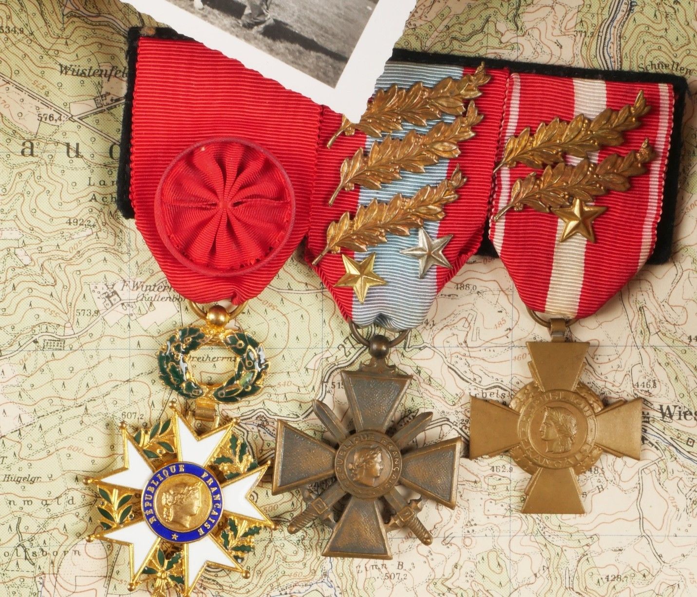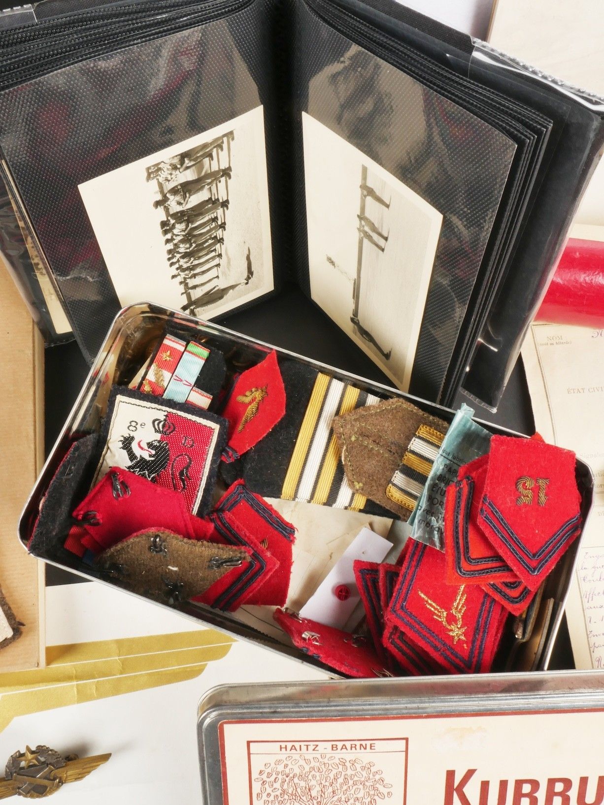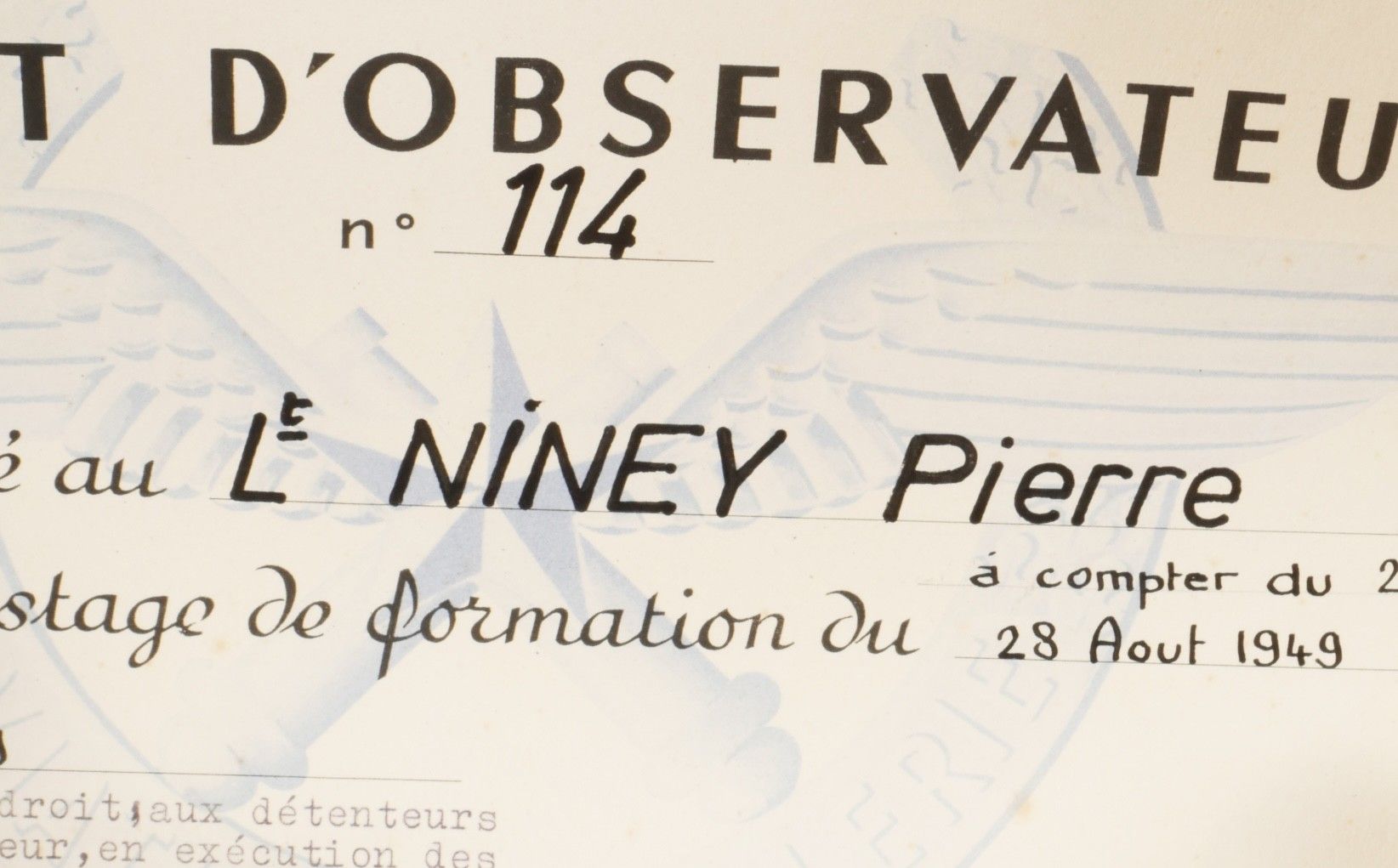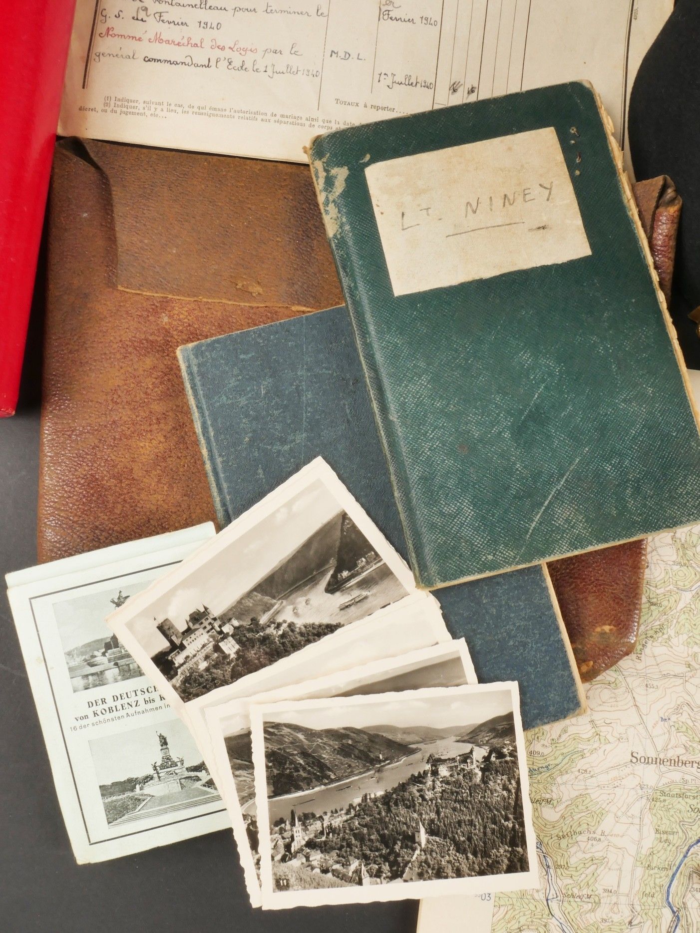 Indochina artillery observation group set. This exceptional set belonged to Pierre Niney and includes a number of documents, including six relating to the Naval Medical Corps School where he began his military career in 1936, as well as ten documents relating to his time as an assistant in Group 4 of the Chantiers de Jeunesse and his blank individual record book for the class of 1940. After a spell in the Resistance with the Corps Franc Pommiès, he was drafted into the 10th RAC in 1945 and left for Indochina in 1946. His certificate of membership of the FFI, dated June 1949, and various documents confirming his presence in the Far East during his time in the Vaicos sector are on display. His commendation in the army order awarded to the divisional artillery of the 3rd DIC as well as a commendation in the army order when he was a lieutenant in the 22nd GAOA and took part in missions in 1950 in Ap La Bang, a second commendation for missions carried out from 1950 to 1951 in Tonkin, a normal army corps commendation for operations carried out in 1952, his diploma of the colonial medal awarded in 1947 within the 4th RAC as a second lieutenant. Pierre Niney continued his career in Algeria and received a citation for his military valour cross when he was with the 2nd PMAH. His Algerian War commemorative diploma completes the set. His fabric insignia, including ten artillery observation group arm lozenges, four pairs of collar tabs, eight eighth division insignia, two embroidered Rhine and Danube insignia, the tricolour insignia he wore in the Pommiès free corps, two pairs of Lieutenant Colonel epaulettes and a breast rank, and four decoration reminders. His metal badges, including his Drago Metra artillery observer's licence numbered 105, a second Drago Metra licence numbered 12, various beret badges, his aeronautics medal in its case, a badge from the first aircraft platoon of the 12th Infantry Division, a cabinet of decorations including his Légion d'Honneur, his TOE war cross with three palms and two stars, his military valour with two palms and one star. An album containing around thirty photos, including seven taken during youth work camps and twelve taken during the Indochina War. His paper diploma of observer's licence number 114 awarded in 1949 in his tube. His Légion d'Honneur officer's diploma dated 1963 in an incomplete tube. His diploma of the Légion d'Honneur in the grade of chevalier dated 1958 in its tube and his diploma of the medal of aeronautics awarded in 1964. His brown leather card holder containing six flight logs, the first of which was opened in August 1949 until August 1951, the second from August 1951 until May 1955, the third from May 1955 to January 1956, the fourth from 1956 to 1961, the fifth an individual air service log opened in October 1961 until 1970 and the last from 1971 to 1972. A leather pouch containing some fifteen photo cards and photographs as well as various pay slips and civilian documents, a Baumholder camp sector flight card and two service record cards. Sn képi d lieutenant colonel d'artillerie de fabrication années 1970, ses bérets en toile beige en trois parties des années 19501960 et son béret de l'Alat de fabrication tailleur. Indochina Artillery Observation Group set. Exceptional grouping belonging to Pierre Niney including numerous documents related to his service at the Naval Medical School where he began his career in 1936 and ten documents referring to his time with Youth Work Group No 4 as assistant plus his unused 1940 draft booklet. After serving in the Resistance with Corps Franc Pommiès he joined the 10th RAC in 1945 and went to Indochina in 1946. Includes FFI membership certificate June 1949 various papers from his Far East service in the Vaicos sector citation to the Army Order for the 3rd DIC divisional artillery and another Army citation as lieutenant with the 226th GAOA for missions in 1950 at Ap La Bang a second citation for missions from 1950 to 1951 in Tonkin and a corps citation for 1952 operations. Colonial Medal diploma awarded in 1947 as second lieutenant 4th RAC. Continued career in Algeria with War Cross for Military Valor citation. Also includes commemorative Algerian War diploma numerous cloth insignia including ten artillery observation group diamonds four collar tabs eight 8th Division patches two Rhin et Danube badges his tricolor Corps Franc Pommiès badge two pairs of lieutenant colonel shoulder boards chest rank badge and four ribbon bars. Metal insignia include Drago Metra artillery observer badge no 105 another Drago Metra no 12 various beret badges Air Medal in case first pilot badge 12th DI badge and a decoration bar with Légion d'Honneur Croix de Guerre TOE three palms and two stars Military Valor Cross two palms and one star. Album of about thirty photographs twelve from Indochina. Paper certificate for observer's brevet no 114 dated 1949 in tube. Légion d'Honneur officer diploma 1963 chevalier diploma 1958 Air Medal diploma 1964. Brown leather map case containing six flight logs covering 1949-1972 leather pouch with about fifteen photo cards service and pay documents flight map of Baumholder camp and two service record sheets. His lieutenant colonel artillery kepi 1970s manufacture three beige cloth berets 1950s-60s and tailormade ALAT beret.
