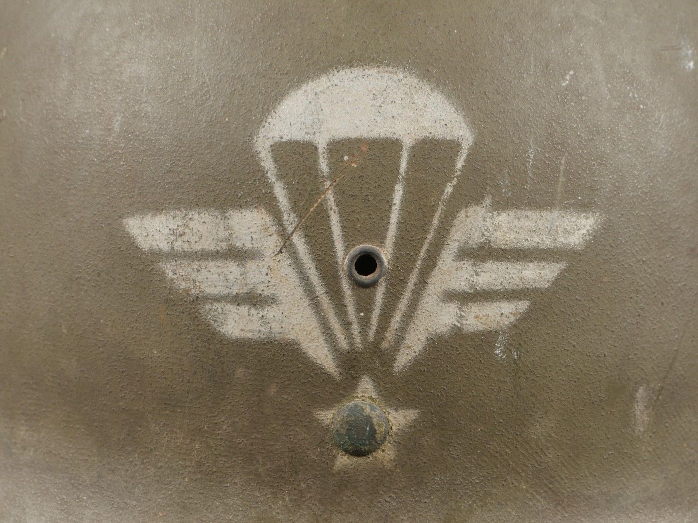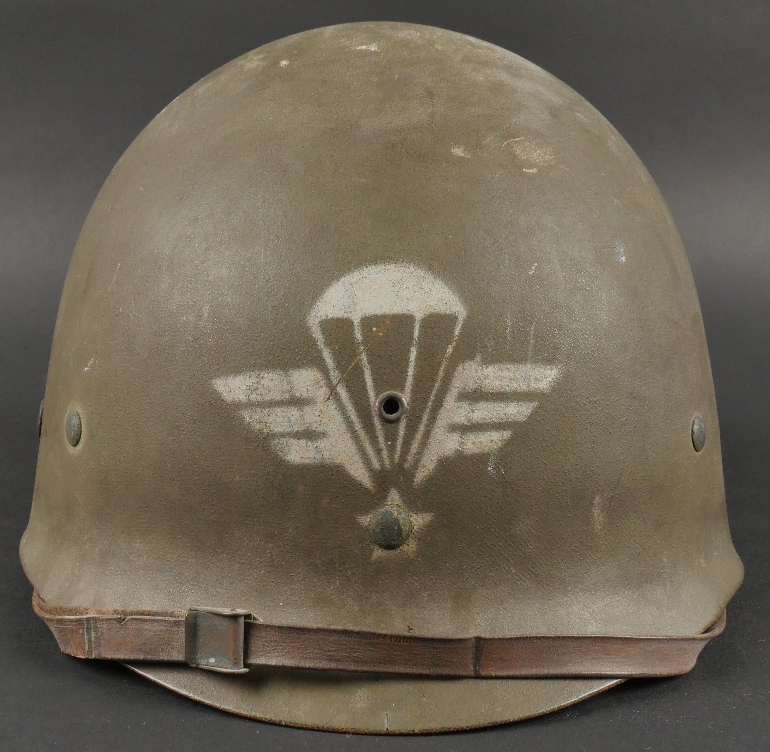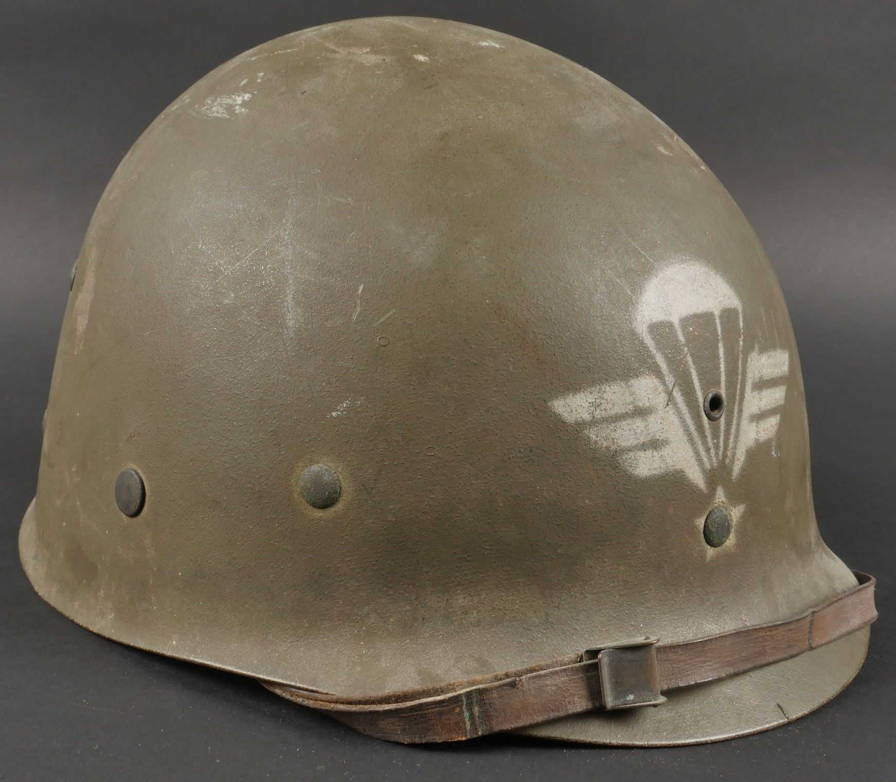 American M1 under-helmet, manufactured by Firestone, with the general insignia of the Parachute Units stenciled in white paint on the front. The under-helmet still has its factory paintwork. Leather headband present with a missing clip, small chinstrap present, neck band missing, period headband tightening lace replaced. This helmet belonged to Captain Constantini, a former French commando who served with the 2nd Shock Battalion and then the 5 REI. US M1 liner by Firestone bearing at front the general airborne insignia stencil in white paint retaining original factory finish. Leather band present with one missing clip small chinstrap intact neckband missing drawcord replaced period correct. Belonged to Captain Constantini former Commando de France later 2nd Shock Battalion and 5th REI.