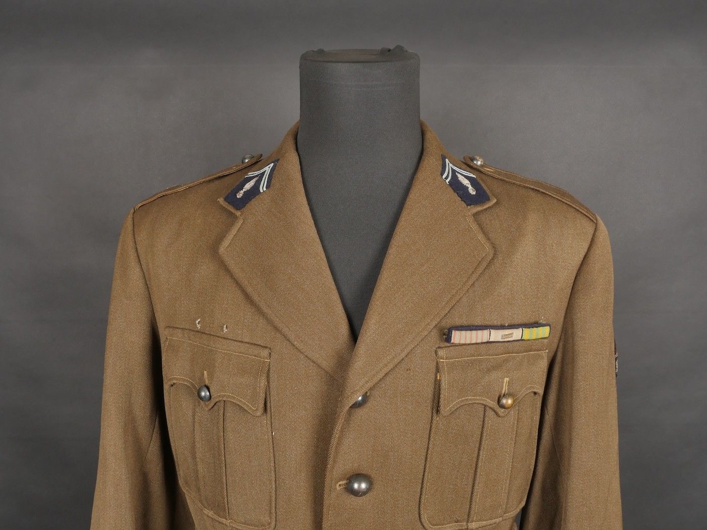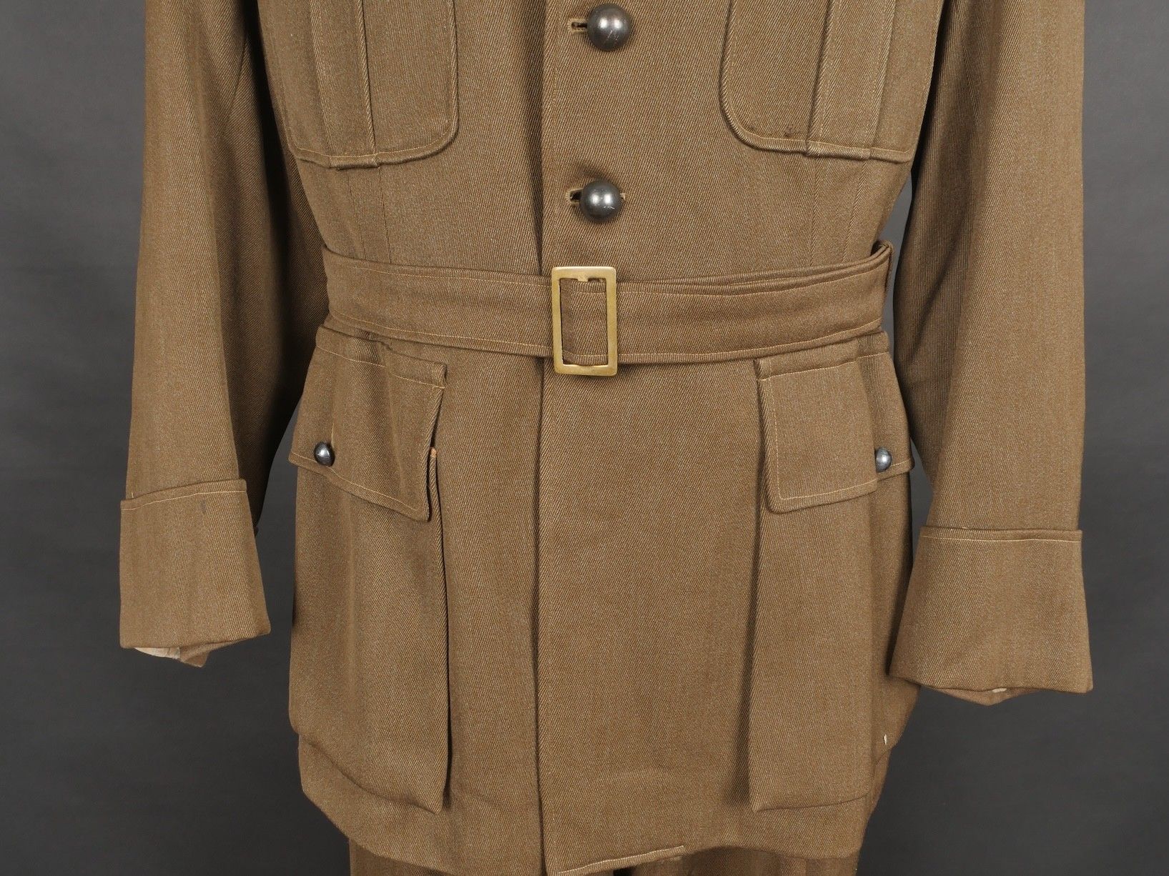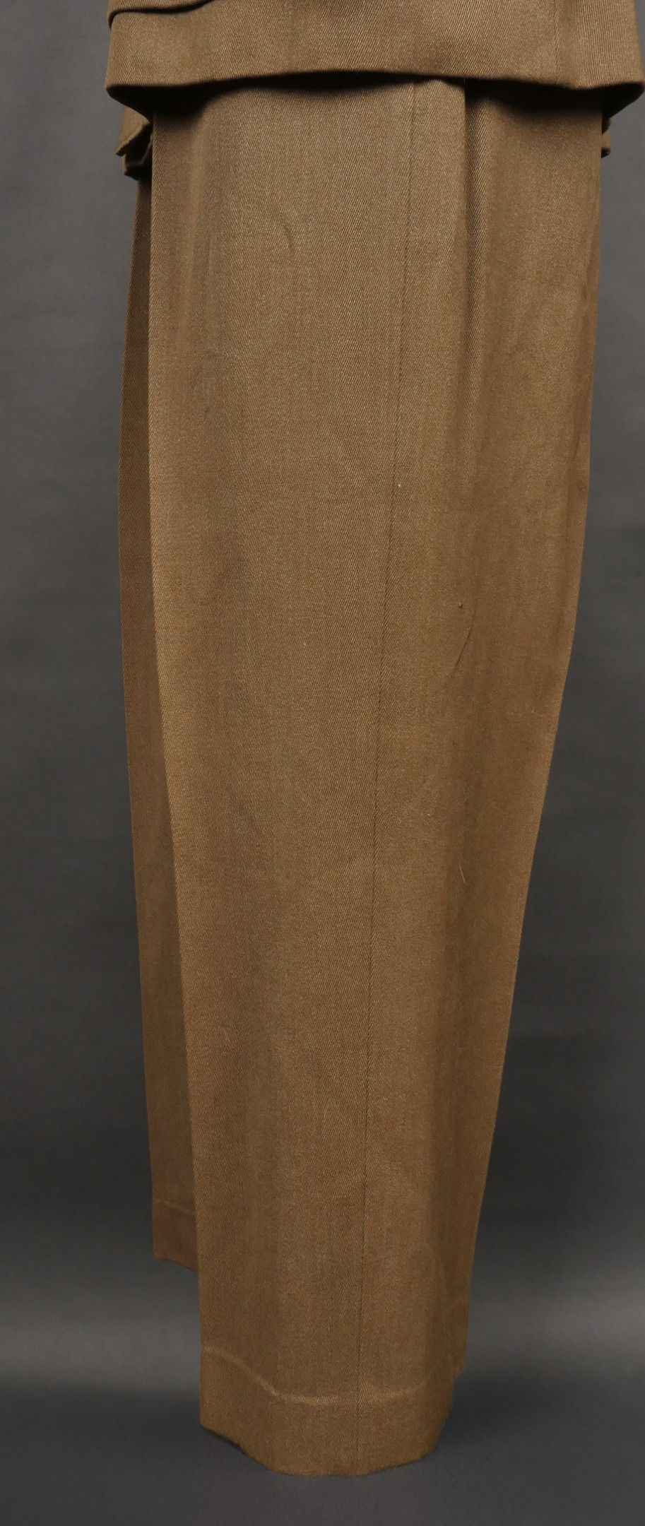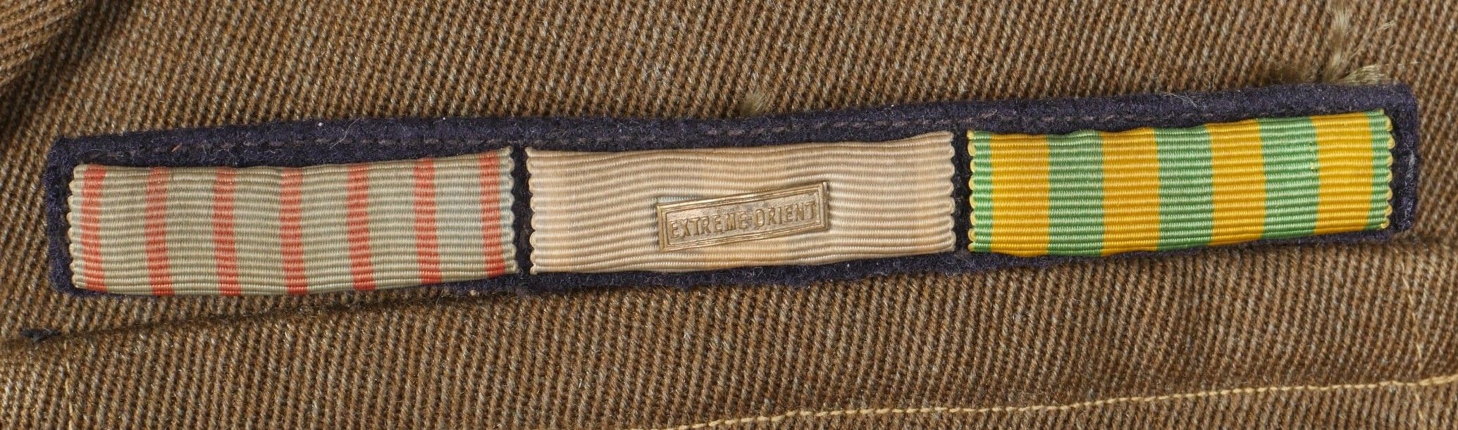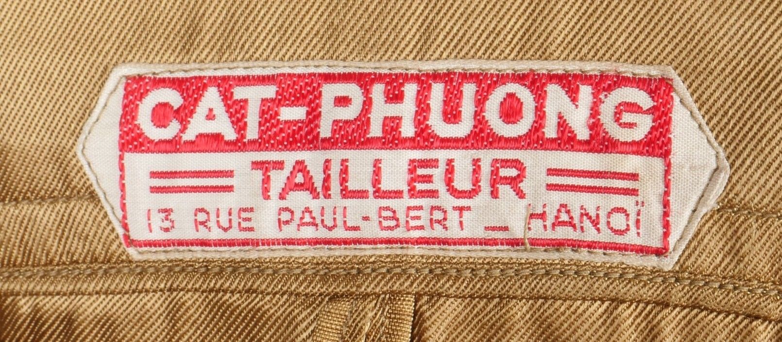 A fine uniform for a paratrooper made locally in Indochina. The 4-pocket exit jacket is made of khaki worsted cloth and closes with 4 smooth silver buttons. There is a reminder of decorations above the left breast pocket, as well as two straps for the parachutist brevet above the right breast pocket. Collar tab corresponding to a paratrooper of the 1st Parachute Hussars Regiment attached to a staff. Original belt still present. Interior in light khaki rayon, bearing the label of CAT PHUONG Tailleur 13 Rue Paul Bert Hanoi. Straight-leg exit trousers, made from the same cloth as the jacket, unbleached cotton lining, band around the waist indicating that they were made by CAT PHUONG Tailleur 13 Rue Paul Bert Hanoi. Note the missing fly button and buttock pocket. Fine paratrooper uniform locally tailored in Indochina. Fourpocket dress jacket made of fine khaki wool closing with four smooth silver buttons ribbon bar above left breast pocket two loops for parachutist wings above right pocket. Collar tabs identifying a paratrooper of the 1st Hussars Parachute Regiment attached to headquarters. Original belt present. Light khaki rayon lining labeled Cat Phuong Tailleur 13 Rue Paul Bert Hanoi. Matching straightleg trousers same cloth cotton lining waistband labeled Cat Phuong Tailleur 13 Rue Paul Bert Hanoi. One fly button and one rear pocket button missing.