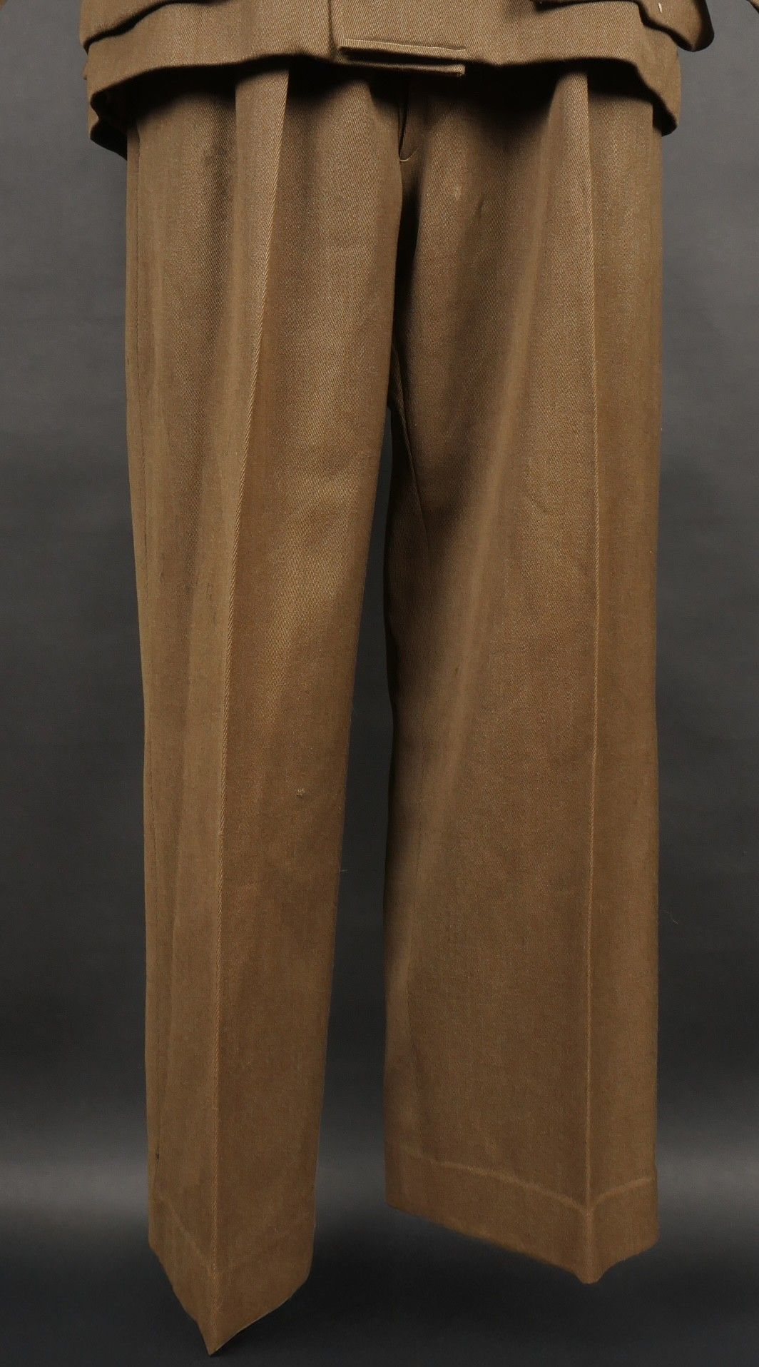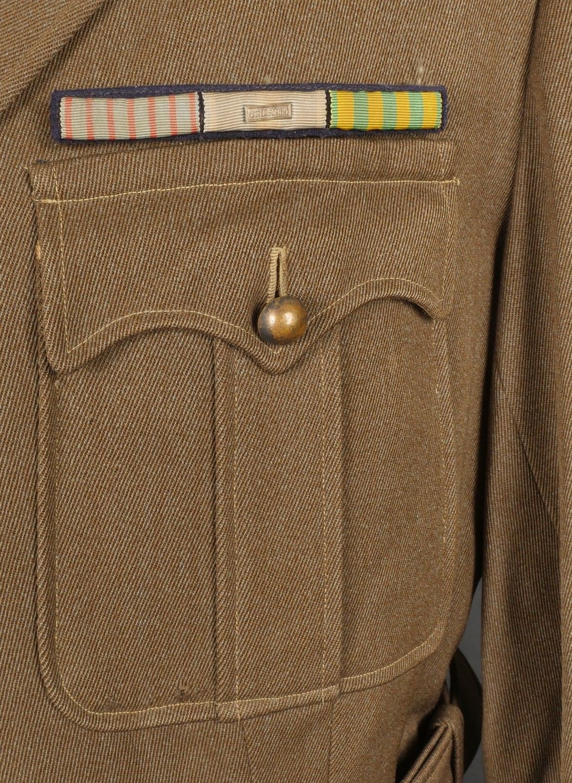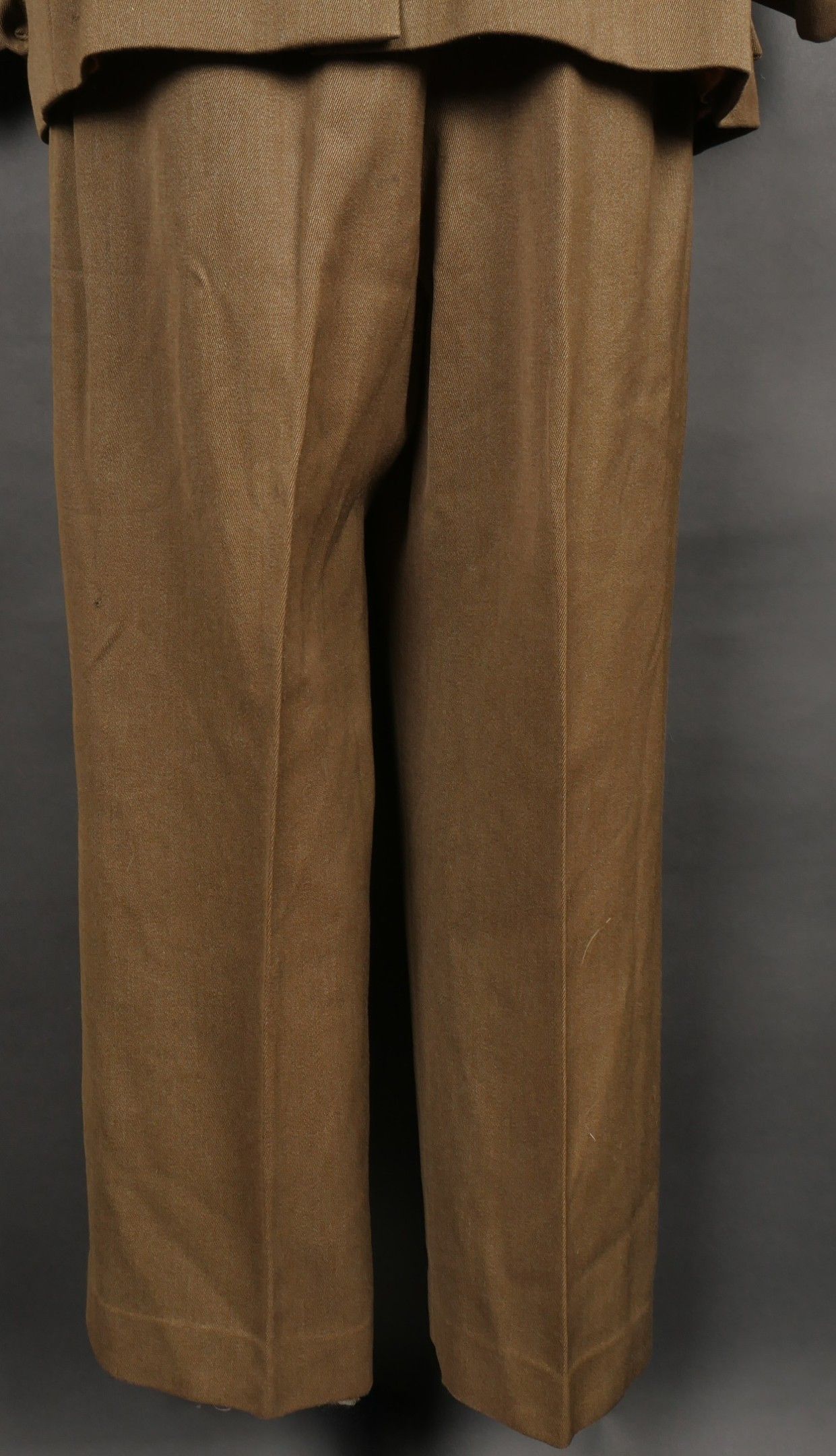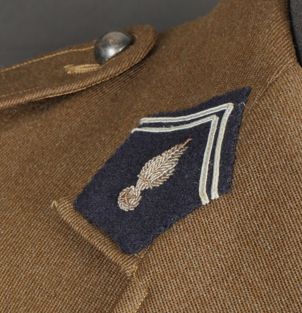 A fine uniform for a paratrooper made locally in Indochina. The 4-pocket exit jacket is made of khaki worsted cloth and closes with 4 smooth silver buttons. There is a reminder of decorations above the left breast pocket, as well as two straps for the parachutist brevet above the right breast pocket. Collar tab corresponding to a paratrooper of the 1st Parachute Hussars Regiment attached to a staff. Original belt still present. Interior in light khaki rayon, bearing the label of CAT PHUONG Tailleur 13 Rue Paul Bert Hanoi. Straight-leg exit trousers, made from the same cloth as the jacket, unbleached cotton lining, band around the waist indicating that they were made by CAT PHUONG Tailleur 13 Rue Paul Bert Hanoi. Note the missing fly button and buttock pocket. Fine paratrooper uniform locally tailored in Indochina. Fourpocket dress jacket made of fine khaki wool closing with four smooth silver buttons ribbon bar above left breast pocket two loops for parachutist wings above right pocket. Collar tabs identifying a paratrooper of the 1st Hussars Parachute Regiment attached to headquarters. Original belt present. Light khaki rayon lining labeled Cat Phuong Tailleur 13 Rue Paul Bert Hanoi. Matching straightleg trousers same cloth cotton lining waistband labeled Cat Phuong Tailleur 13 Rue Paul Bert Hanoi. One fly button and one rear pocket button missing.
