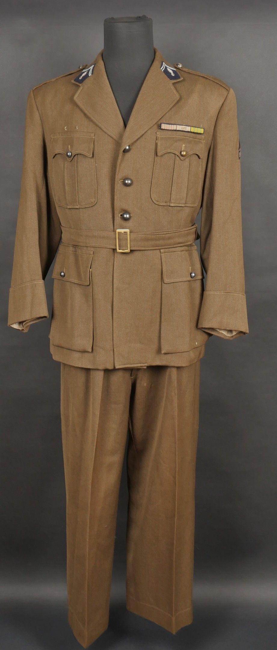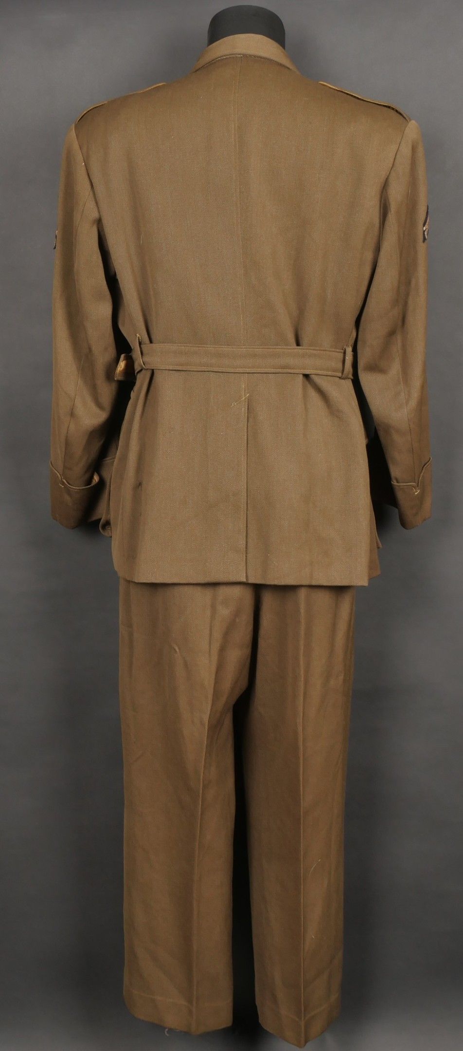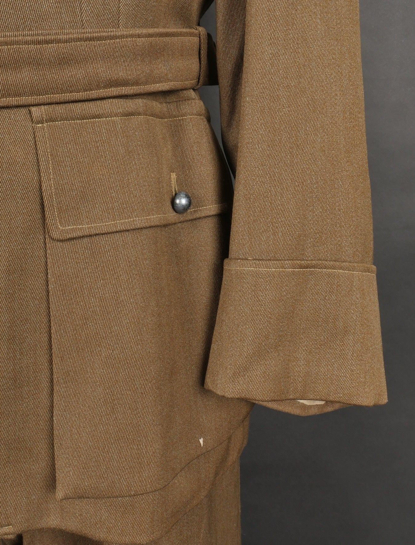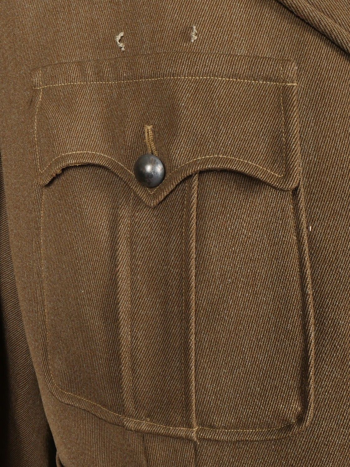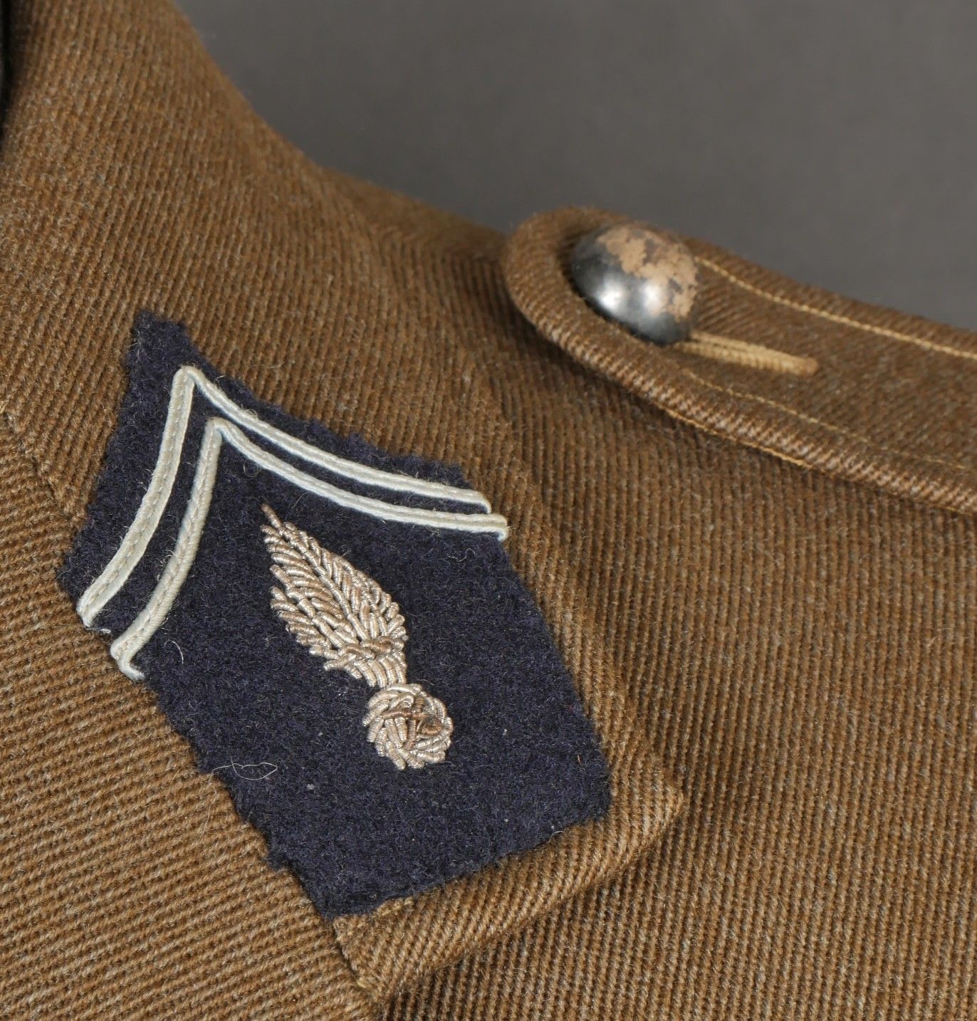 A fine uniform for a paratrooper made locally in Indochina. The 4-pocket exit jacket is made of khaki worsted cloth and closes with 4 smooth silver buttons. There is a reminder of decorations above the left breast pocket, as well as two straps for the parachutist brevet above the right breast pocket. Collar tab corresponding to a paratrooper of the 1st Parachute Hussars Regiment attached to a staff. Original belt still present. Interior in light khaki rayon, bearing the label of CAT PHUONG Tailleur 13 Rue Paul Bert Hanoi. Straight-leg exit trousers, made from the same cloth as the jacket, unbleached cotton lining, band around the waist indicating that they were made by CAT PHUONG Tailleur 13 Rue Paul Bert Hanoi. Note the missing fly button and buttock pocket. Fine paratrooper uniform locally tailored in Indochina. Fourpocket dress jacket made of fine khaki wool closing with four smooth silver buttons ribbon bar above left breast pocket two loops for parachutist wings above right pocket. Collar tabs identifying a paratrooper of the 1st Hussars Parachute Regiment attached to headquarters. Original belt present. Light khaki rayon lining labeled Cat Phuong Tailleur 13 Rue Paul Bert Hanoi. Matching straightleg trousers same cloth cotton lining waistband labeled Cat Phuong Tailleur 13 Rue Paul Bert Hanoi. One fly button and one rear pocket button missing.