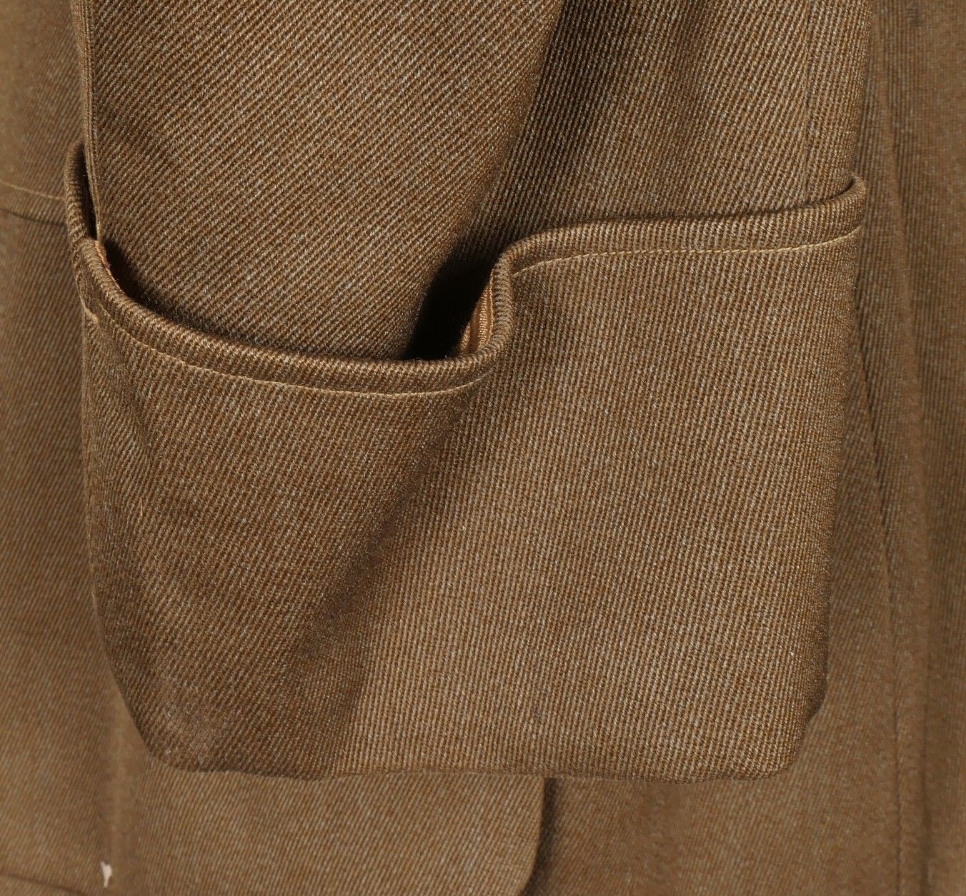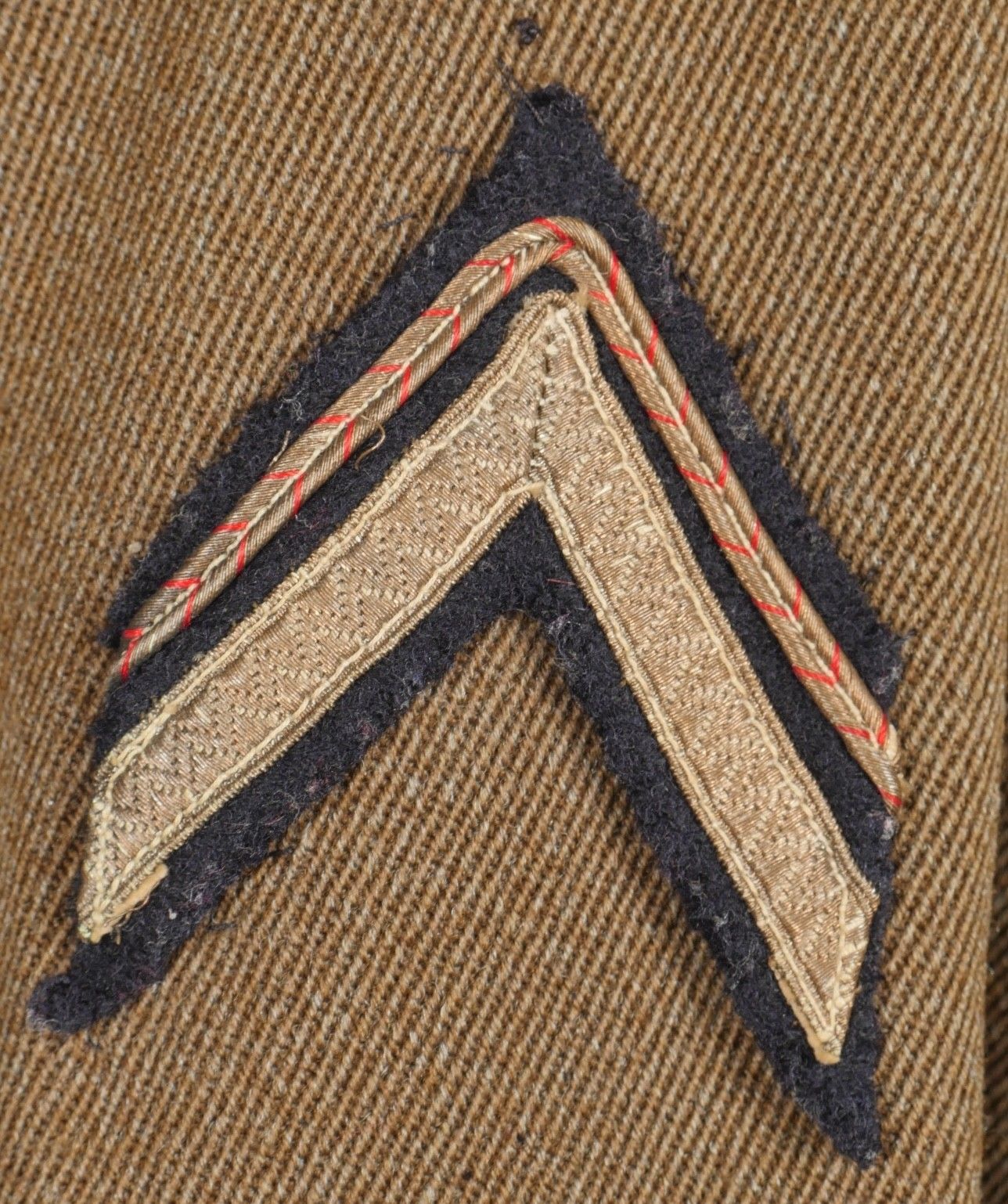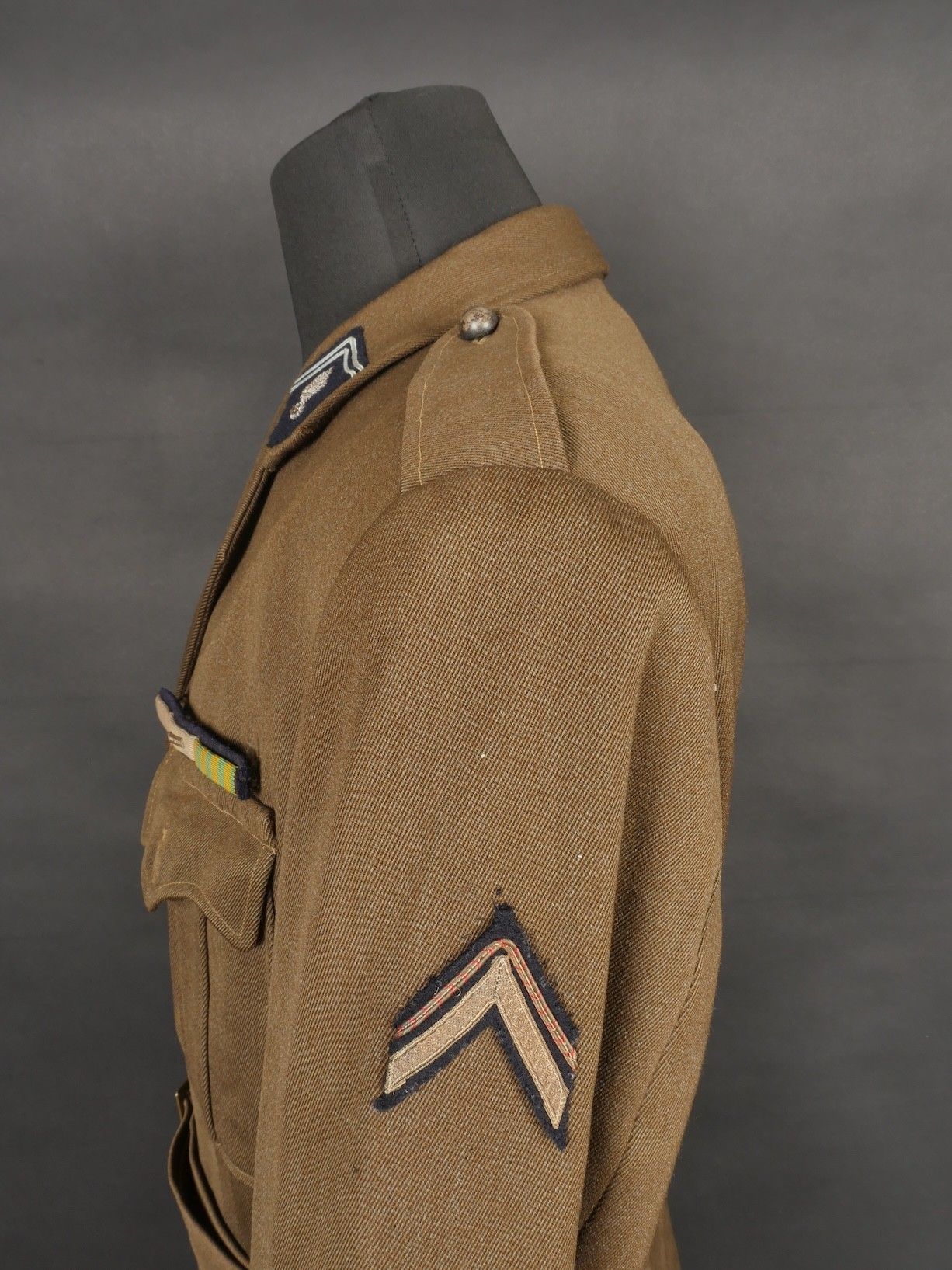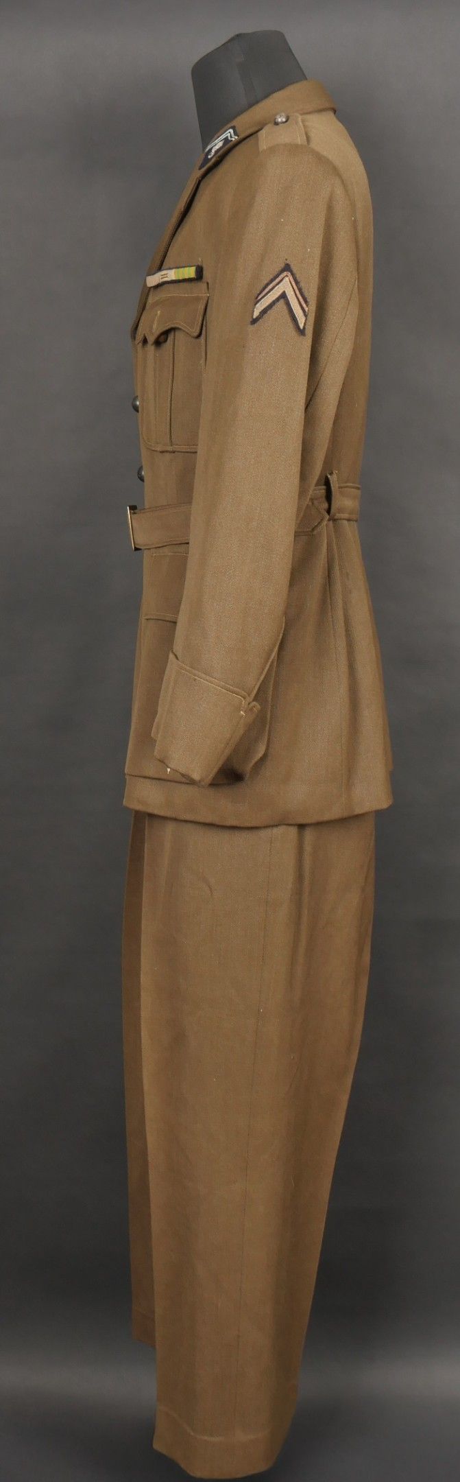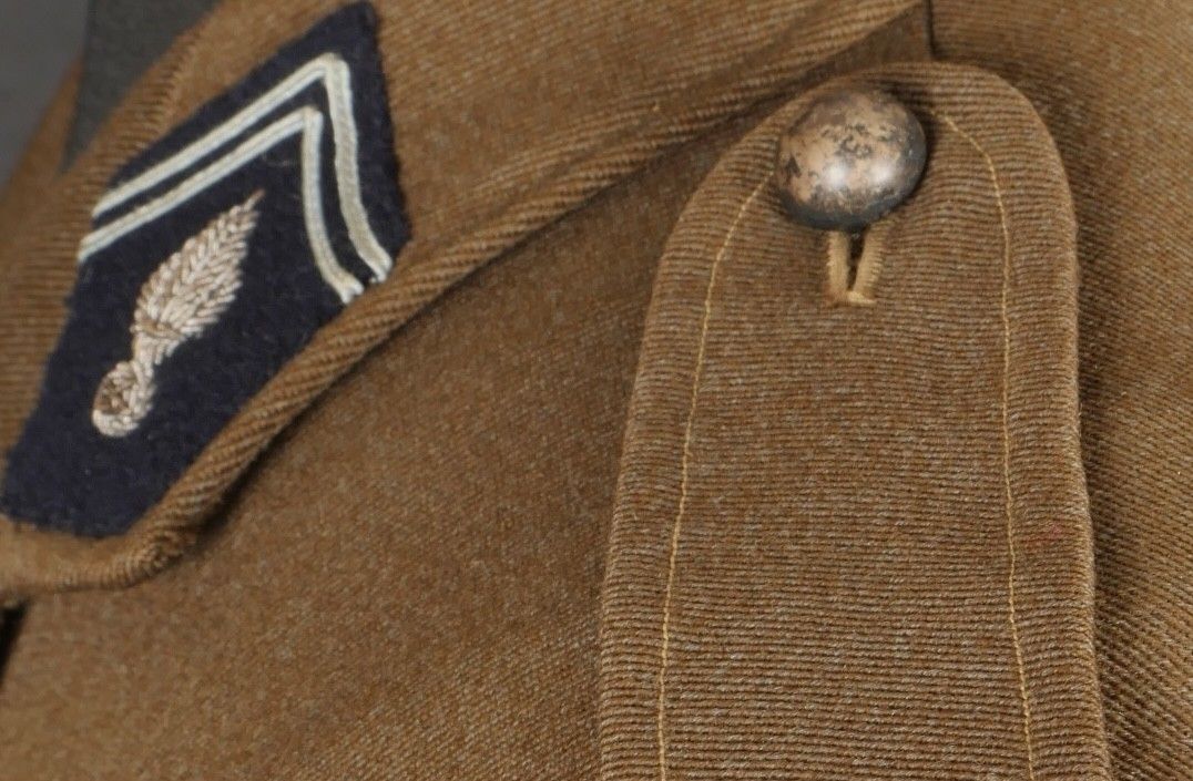 A fine uniform for a paratrooper made locally in Indochina. The 4-pocket exit jacket is made of khaki worsted cloth and closes with 4 smooth silver buttons. There is a reminder of decorations above the left breast pocket, as well as two straps for the parachutist brevet above the right breast pocket. Collar tab corresponding to a paratrooper of the 1st Parachute Hussars Regiment attached to a staff. Original belt still present. Interior in light khaki rayon, bearing the label of CAT PHUONG Tailleur 13 Rue Paul Bert Hanoi. Straight-leg exit trousers, made from the same cloth as the jacket, unbleached cotton lining, band around the waist indicating that they were made by CAT PHUONG Tailleur 13 Rue Paul Bert Hanoi. Note the missing fly button and buttock pocket. Fine paratrooper uniform locally tailored in Indochina. Fourpocket dress jacket made of fine khaki wool closing with four smooth silver buttons ribbon bar above left breast pocket two loops for parachutist wings above right pocket. Collar tabs identifying a paratrooper of the 1st Hussars Parachute Regiment attached to headquarters. Original belt present. Light khaki rayon lining labeled Cat Phuong Tailleur 13 Rue Paul Bert Hanoi. Matching straightleg trousers same cloth cotton lining waistband labeled Cat Phuong Tailleur 13 Rue Paul Bert Hanoi. One fly button and one rear pocket button missing.