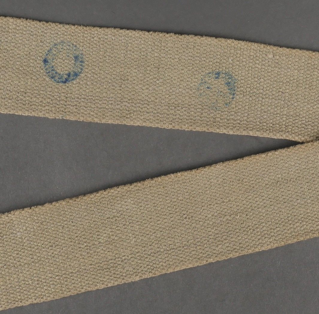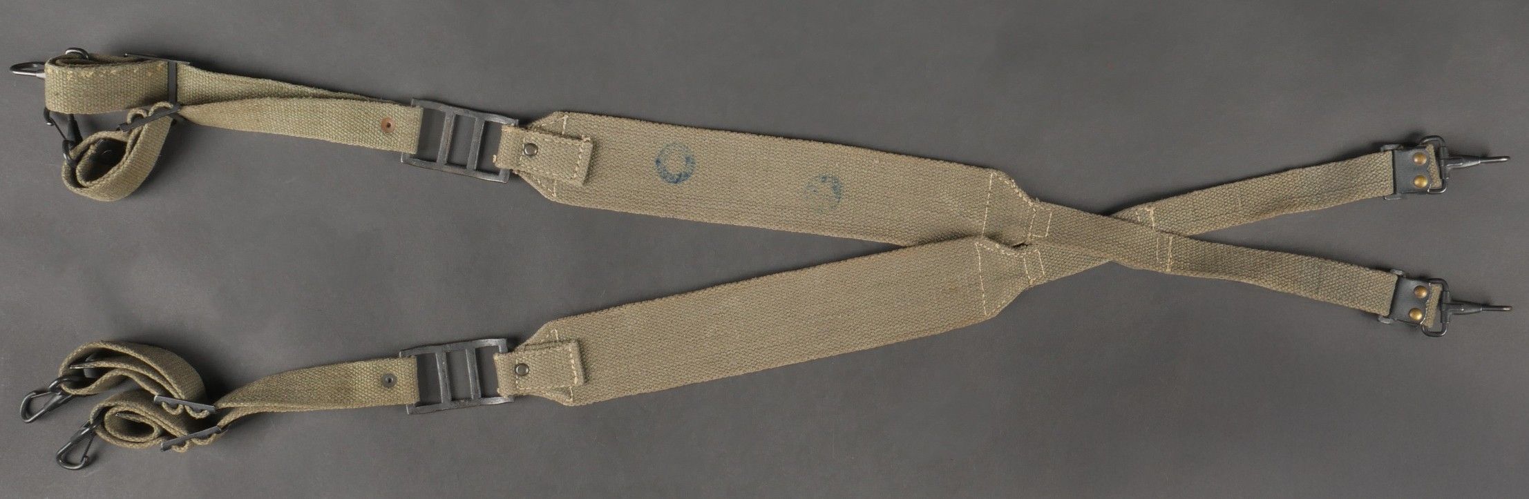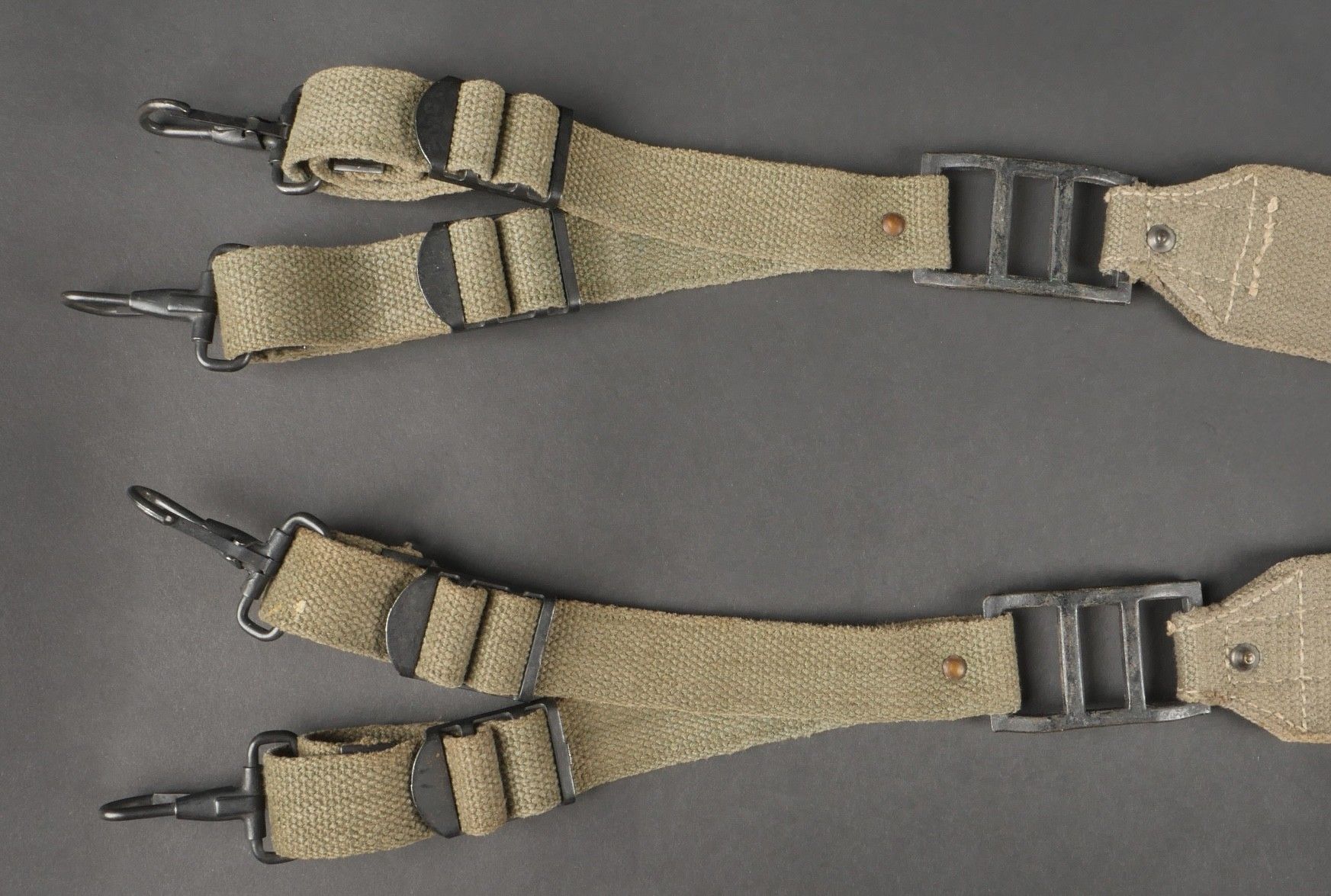 Suspension straps model TAP 1950. Model 1 with hollow rivets. In their original length. 2 stamps are present but not very legible. Metal parts in very good condition. Slightly worn effect. 1950 Pattern TAP suspenders first type with hollow rivets full original length. Two faint stamps present but hard to read. Metal fittings in excellent condition. Light wear.