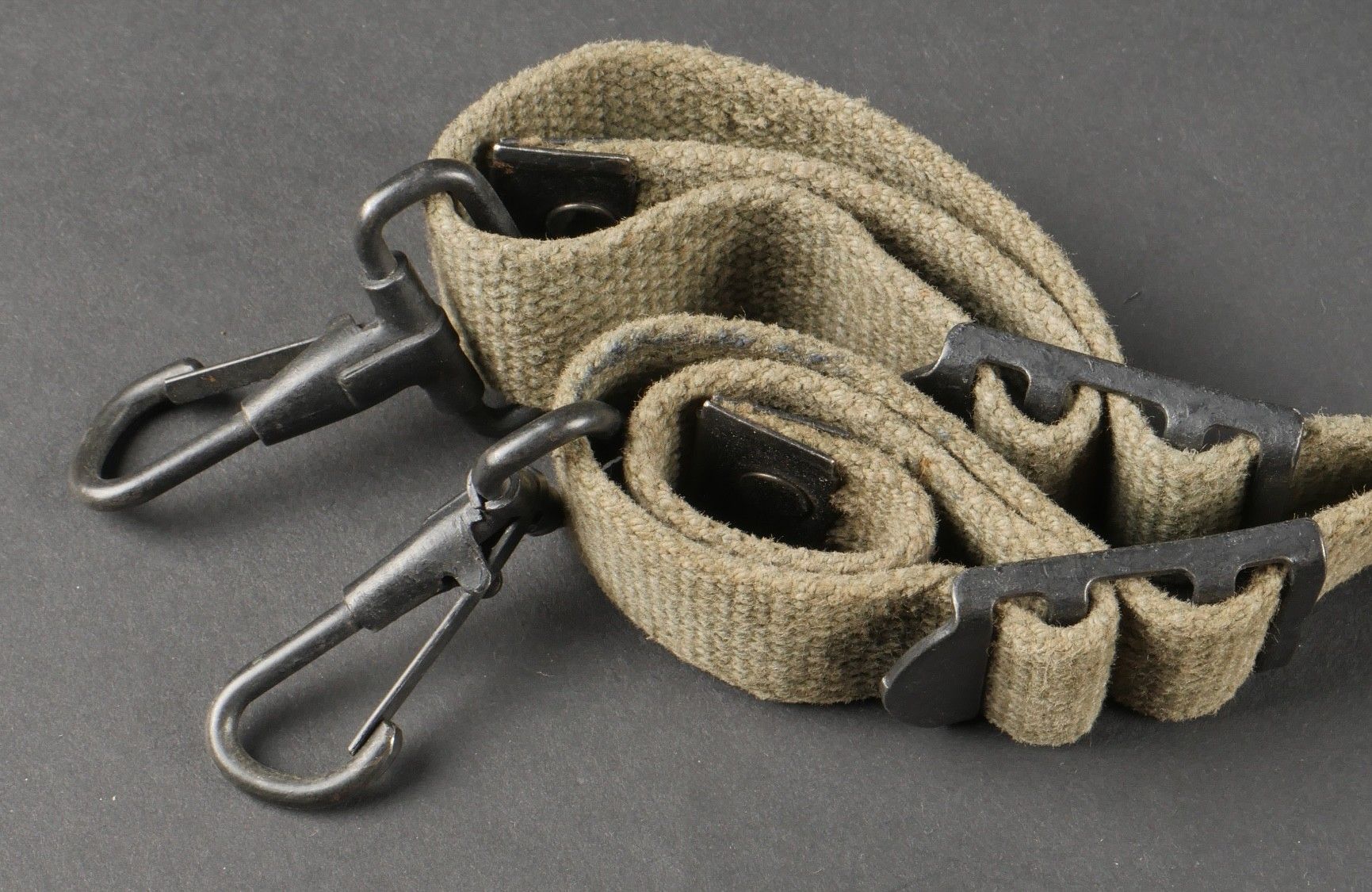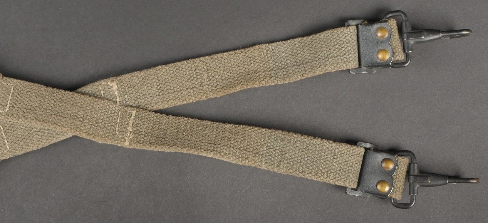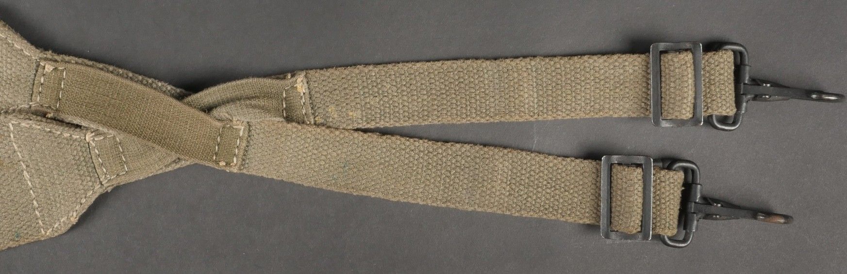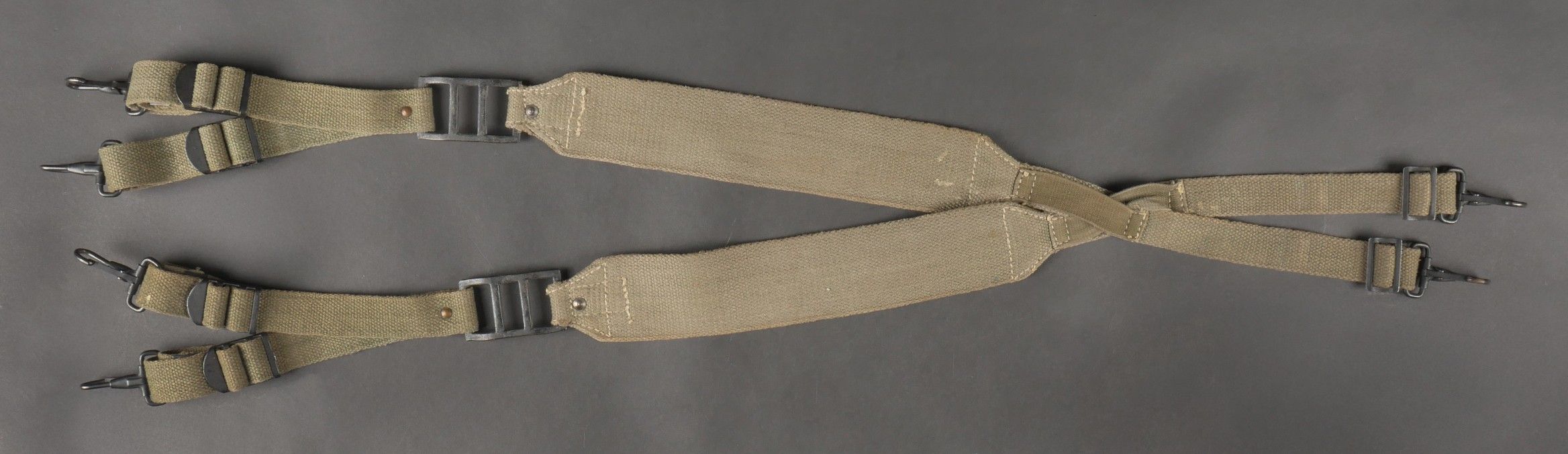 Suspension straps model TAP 1950. Model 1 with hollow rivets. In their original length. 2 stamps are present but not very legible. Metal parts in very good condition. Slightly worn effect. 1950 Pattern TAP suspenders first type with hollow rivets full original length. Two faint stamps present but hard to read. Metal fittings in excellent condition. Light wear.